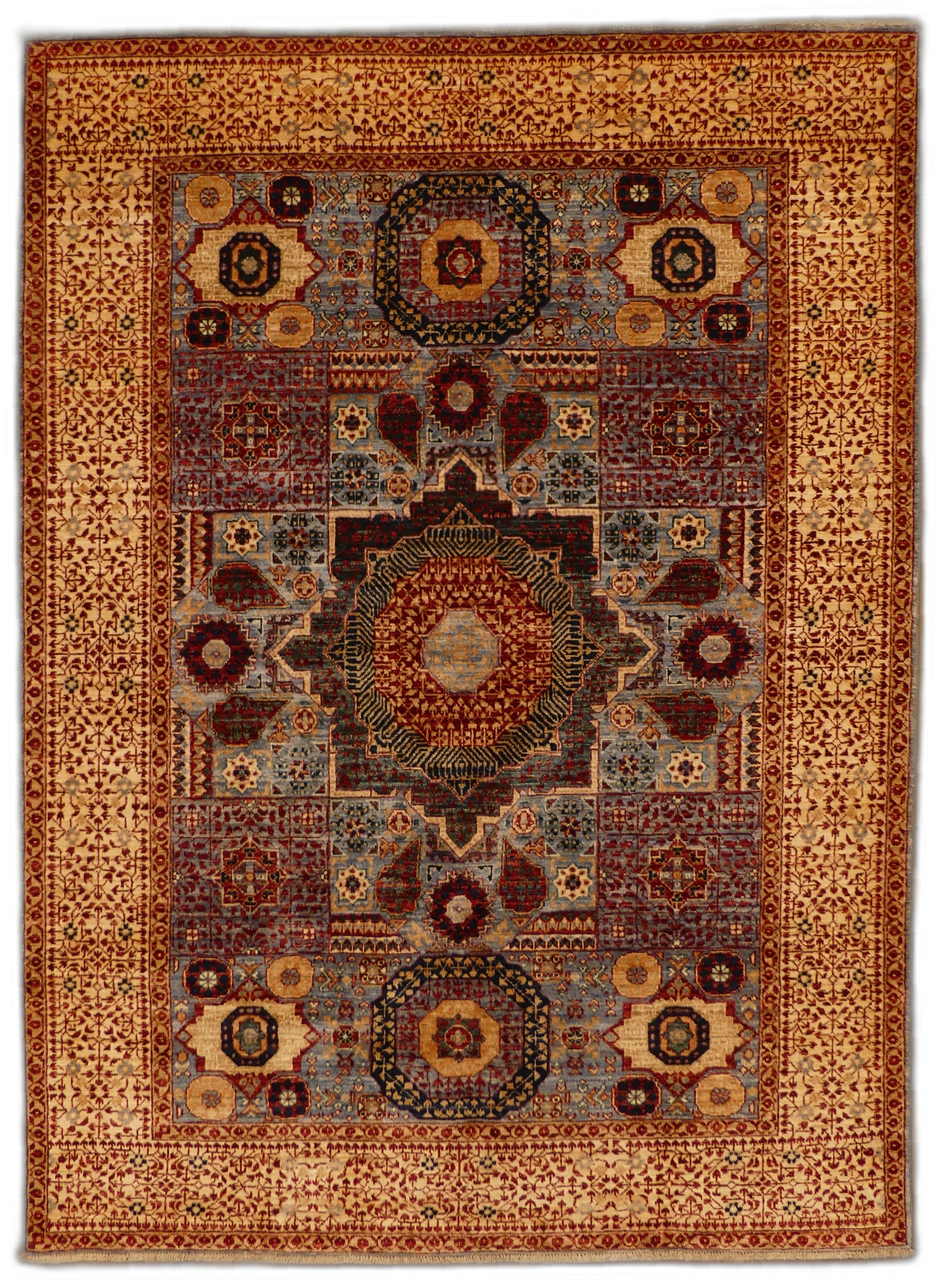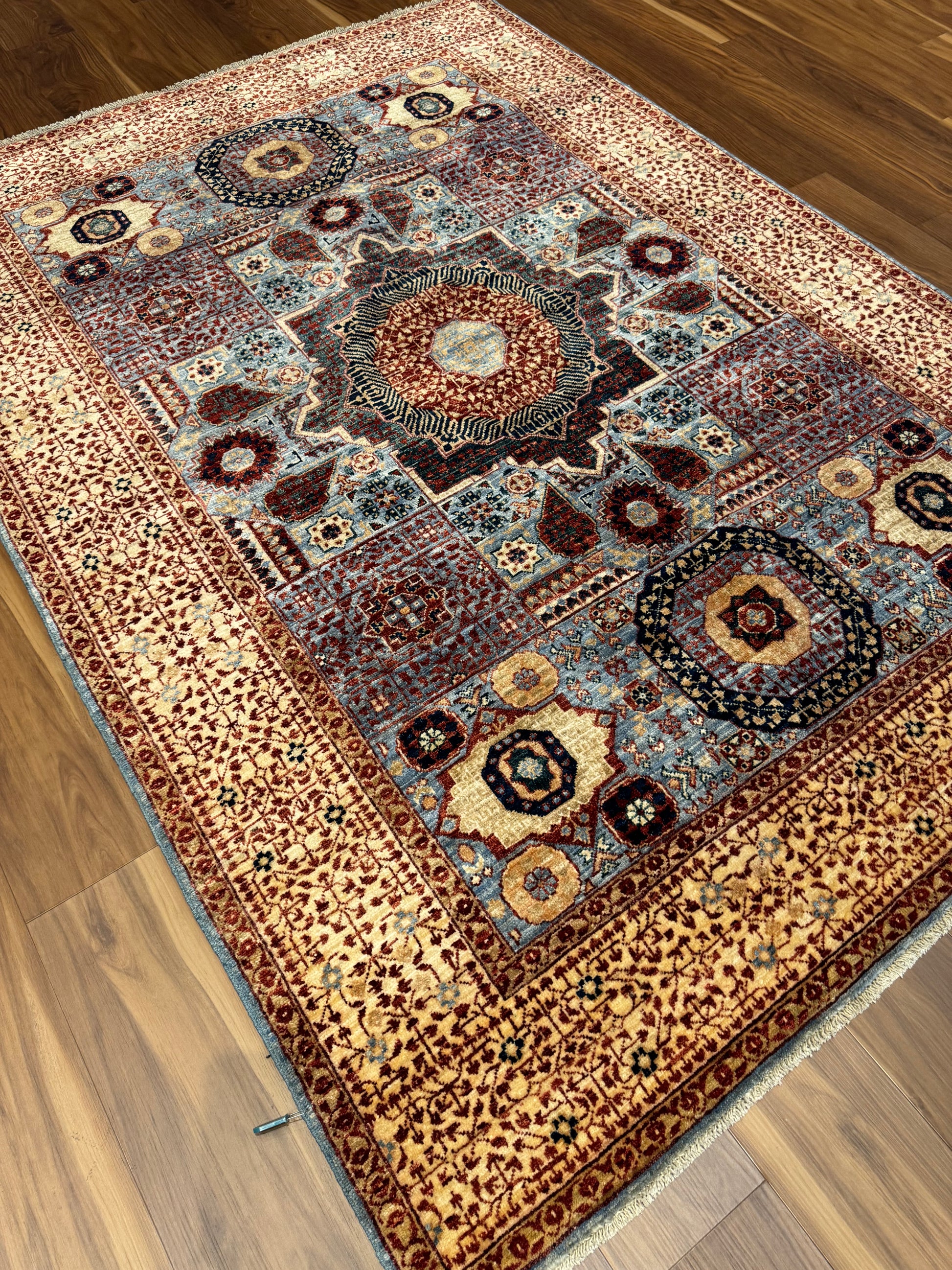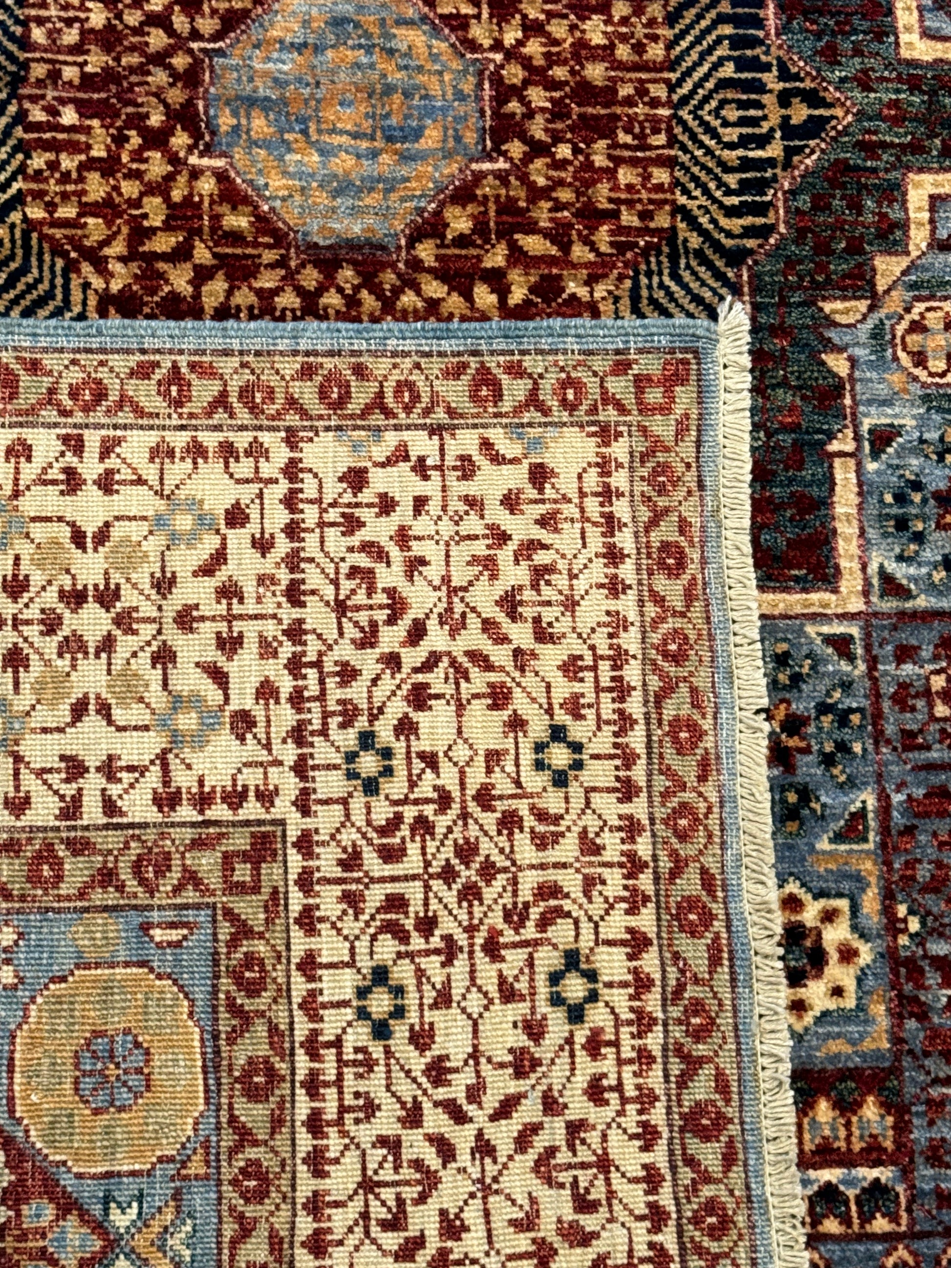 This exquisite Mamluk rug features an intricate array of traditional patterns and medallions with a rich and varied color palette. Handmade from high-quality wool, it offers both durability and comfort underfoot. The detailed geometric design is a nod to the historical Mamluk period, making it a statement piece that both honors the past and complements modern decor. Ideal for adding a touch of sophistication to any room, this rug symbolizes craftsmanship and timeless elegance in a rich display of color and texture.