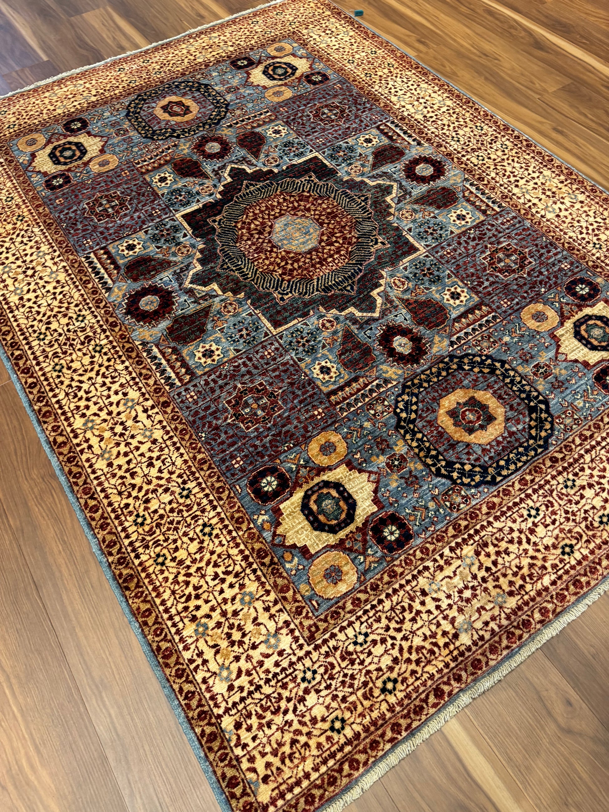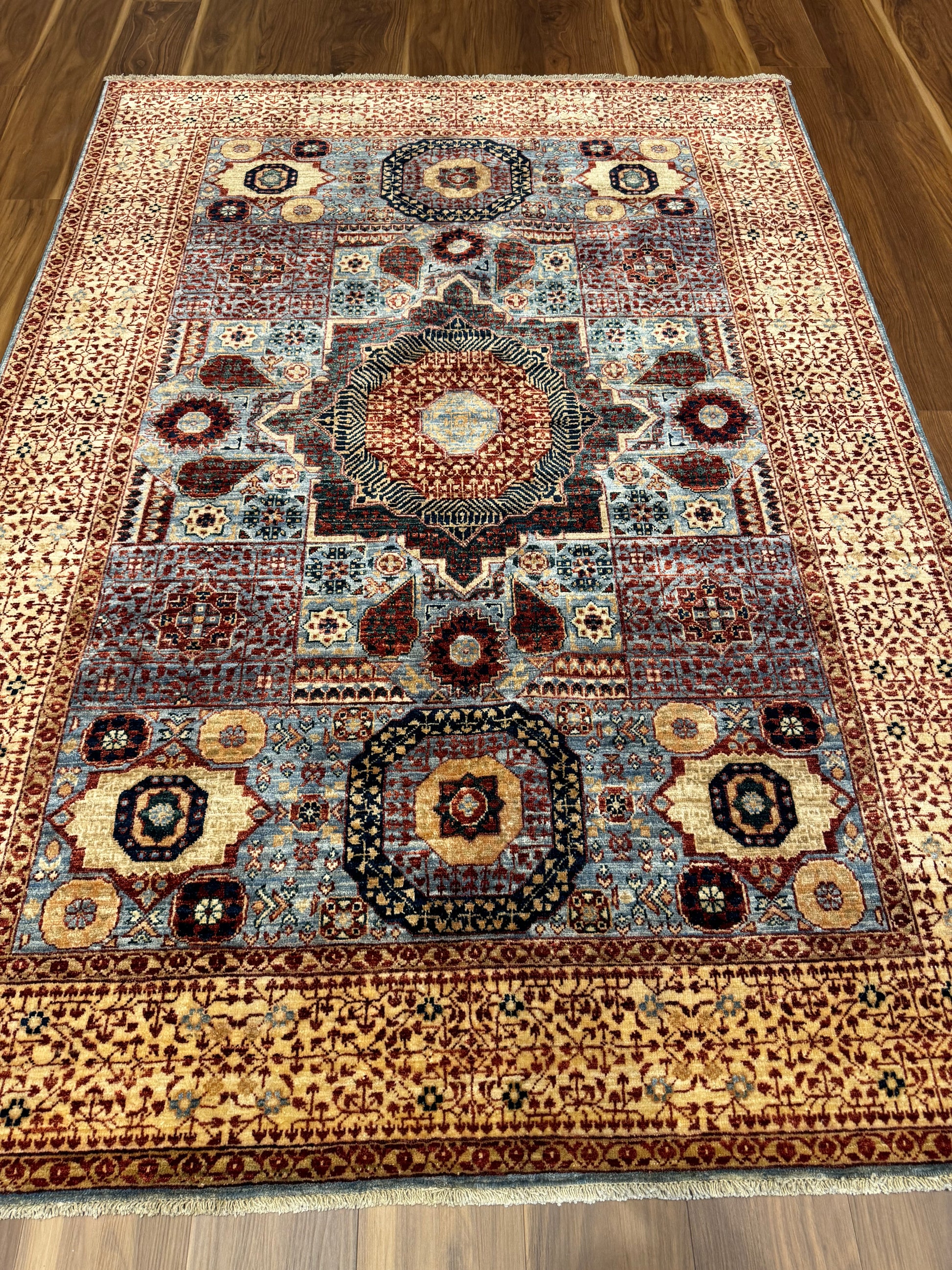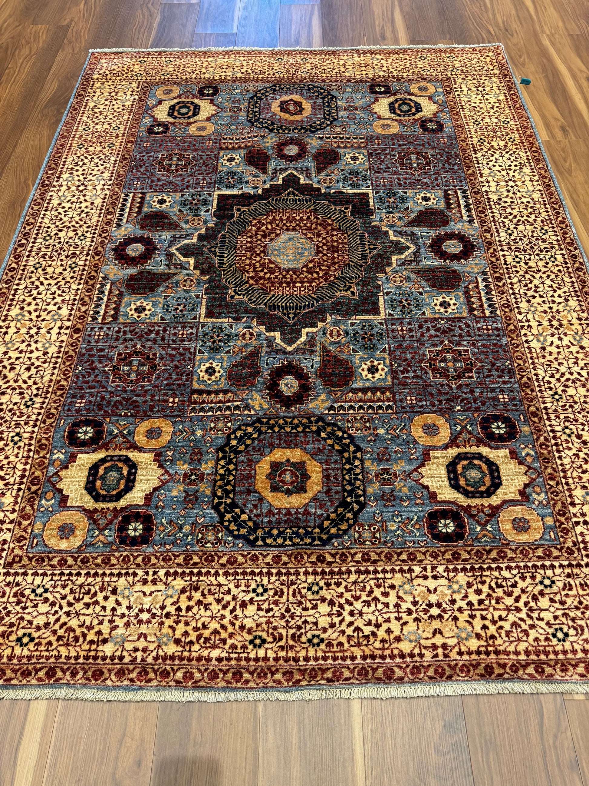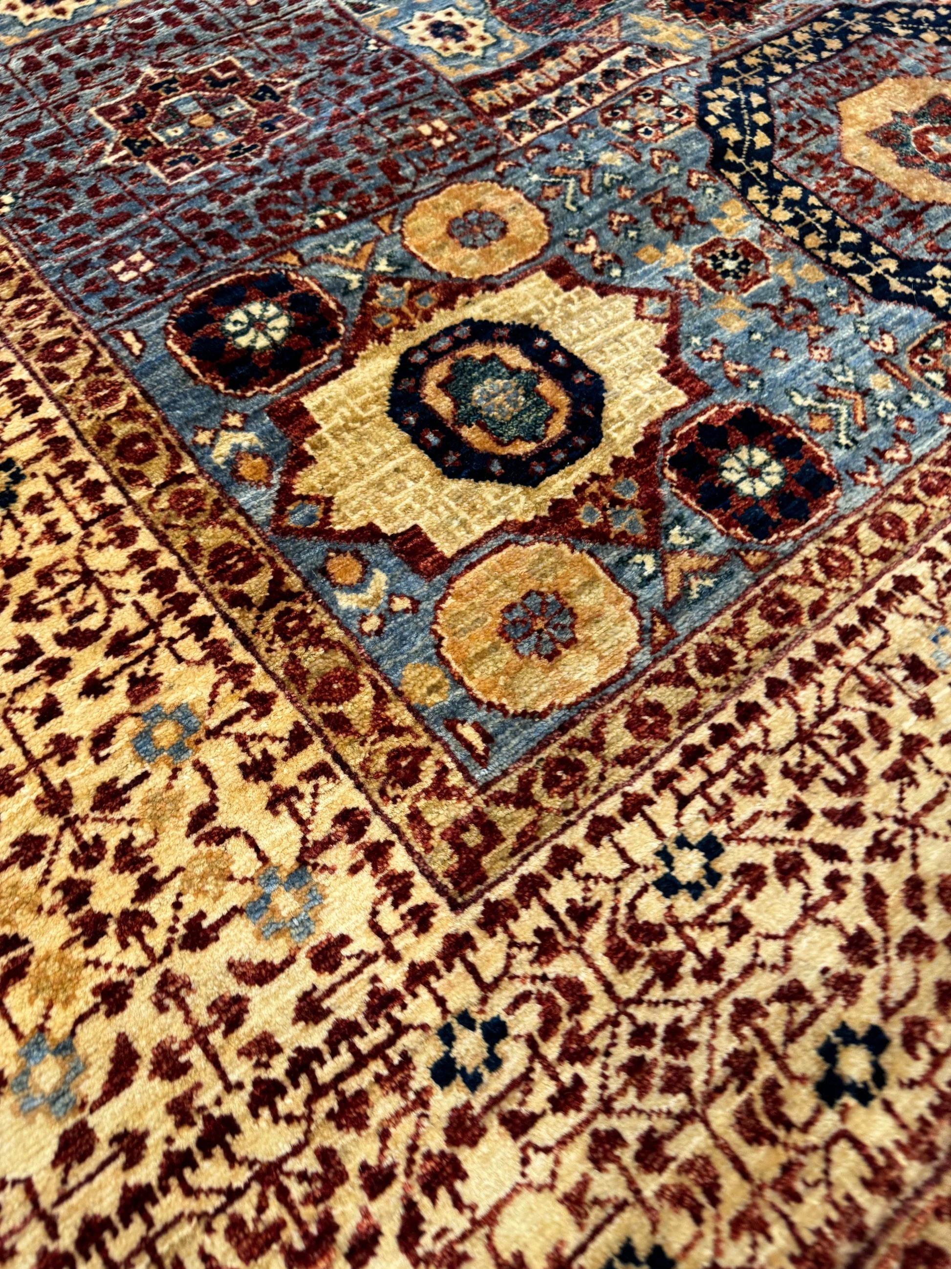 This exquisite Mamluk rug features an intricate array of traditional patterns and medallions with a rich and varied color palette. Handmade from high-quality wool, it offers both durability and comfort underfoot. The detailed geometric design is a nod to the historical Mamluk period, making it a statement piece that both honors the past and complements modern decor. Ideal for adding a touch of sophistication to any room, this rug symbolizes craftsmanship and timeless elegance in a rich display of color and texture.