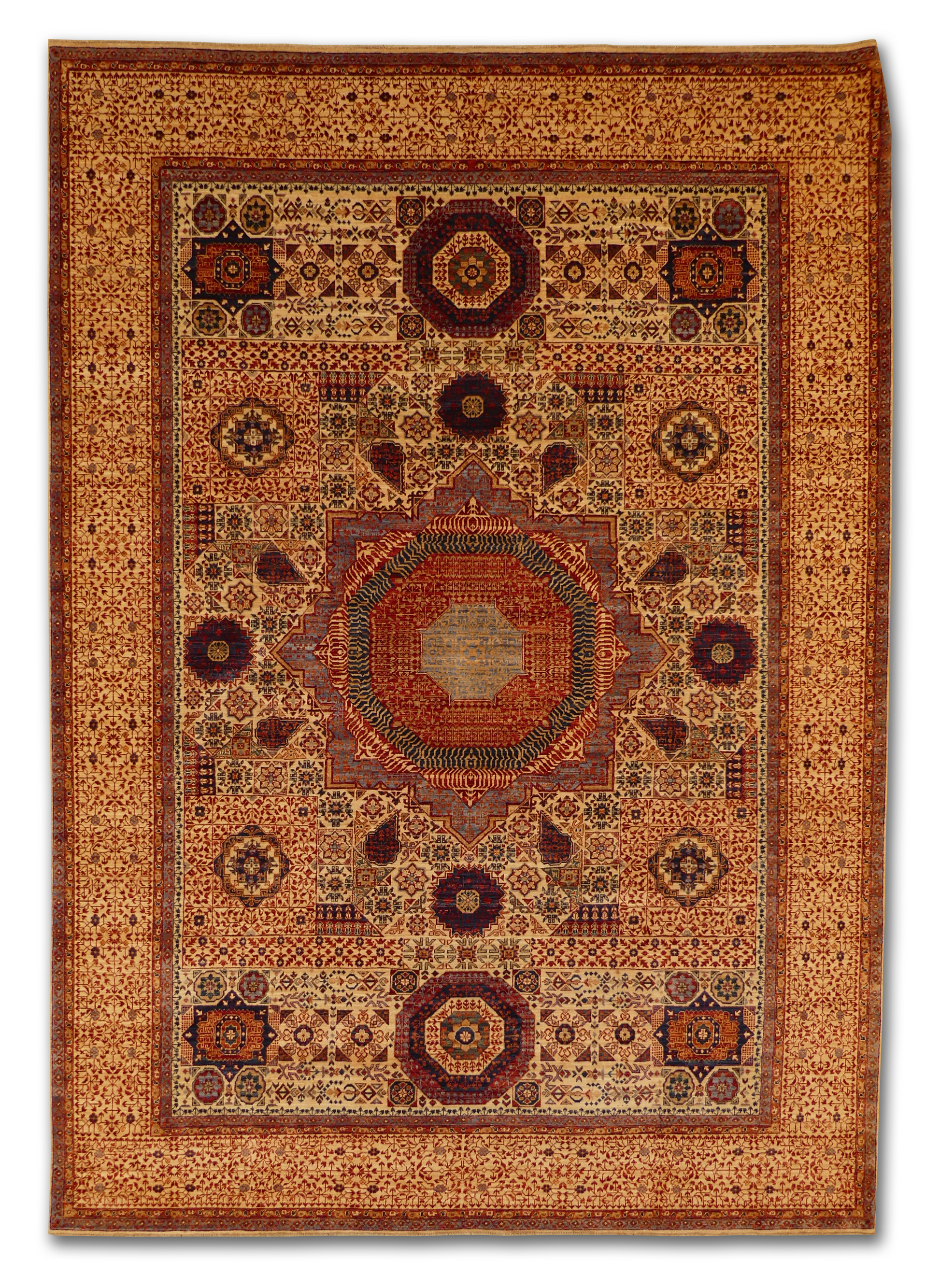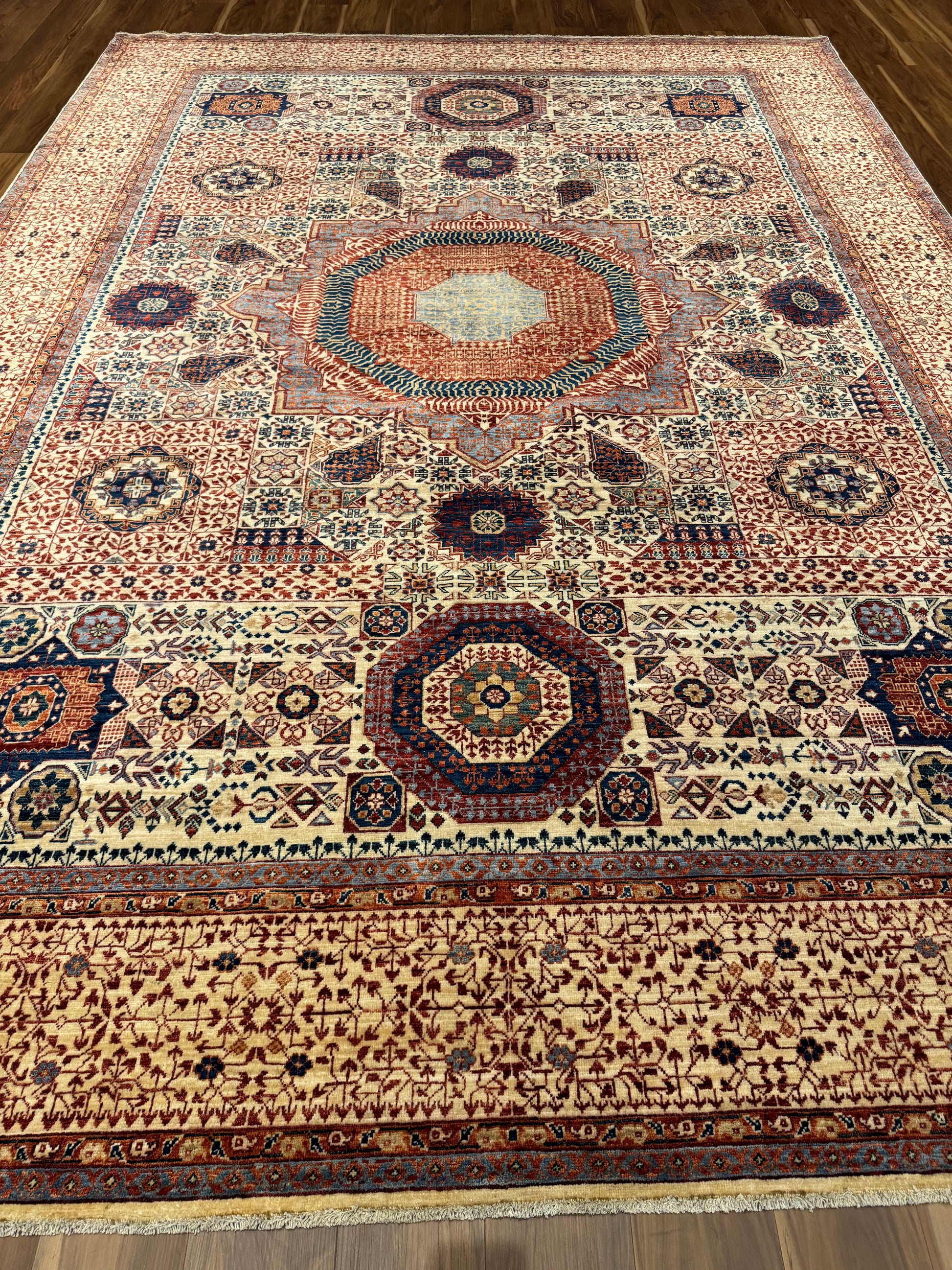 This exquisitely crafted Mamluk rug is a testament to the timeless artistry of traditional weaving. Made with the finest wool, the rug displays a symphony of warm colors, featuring intricate geometric patterns and star motifs that radiate from the central medallion. Borders adorned with detailed guardbands give structure to the ornate field, making it a captivating centerpiece for any room. The interplay of complex designs and earthy tones creates a sense of luxury and historical depth, mirroring the grandeur of bygone eras.