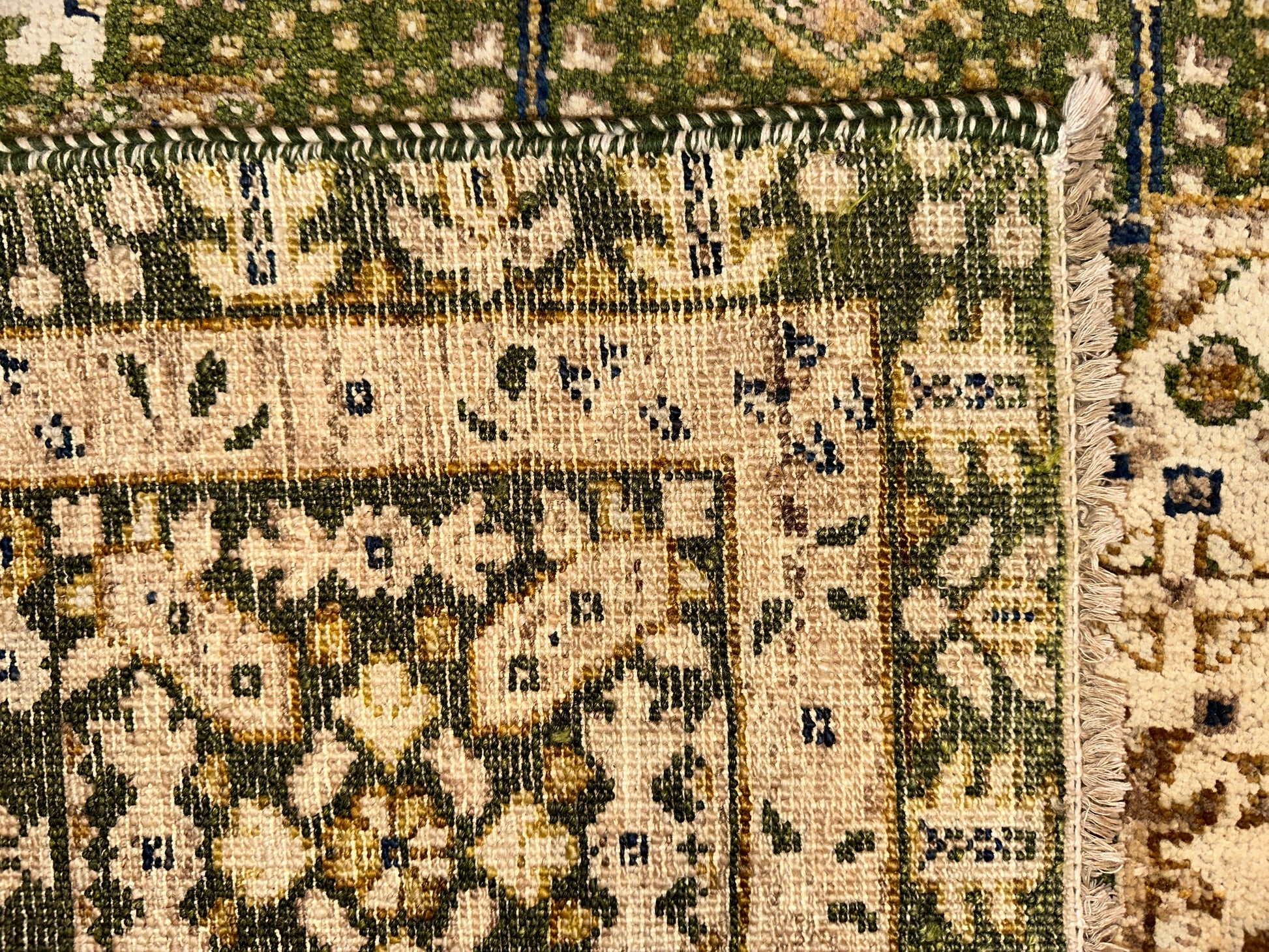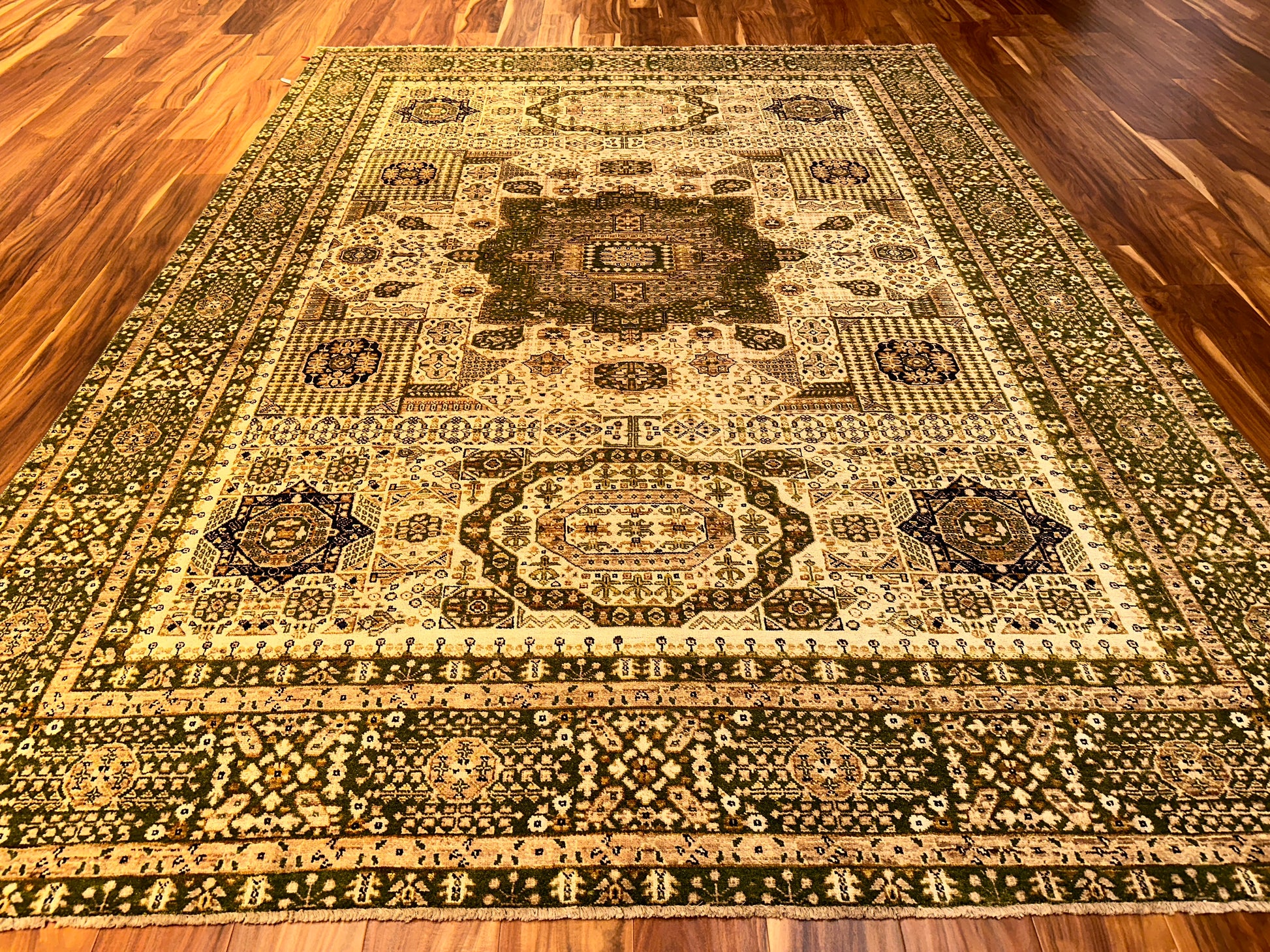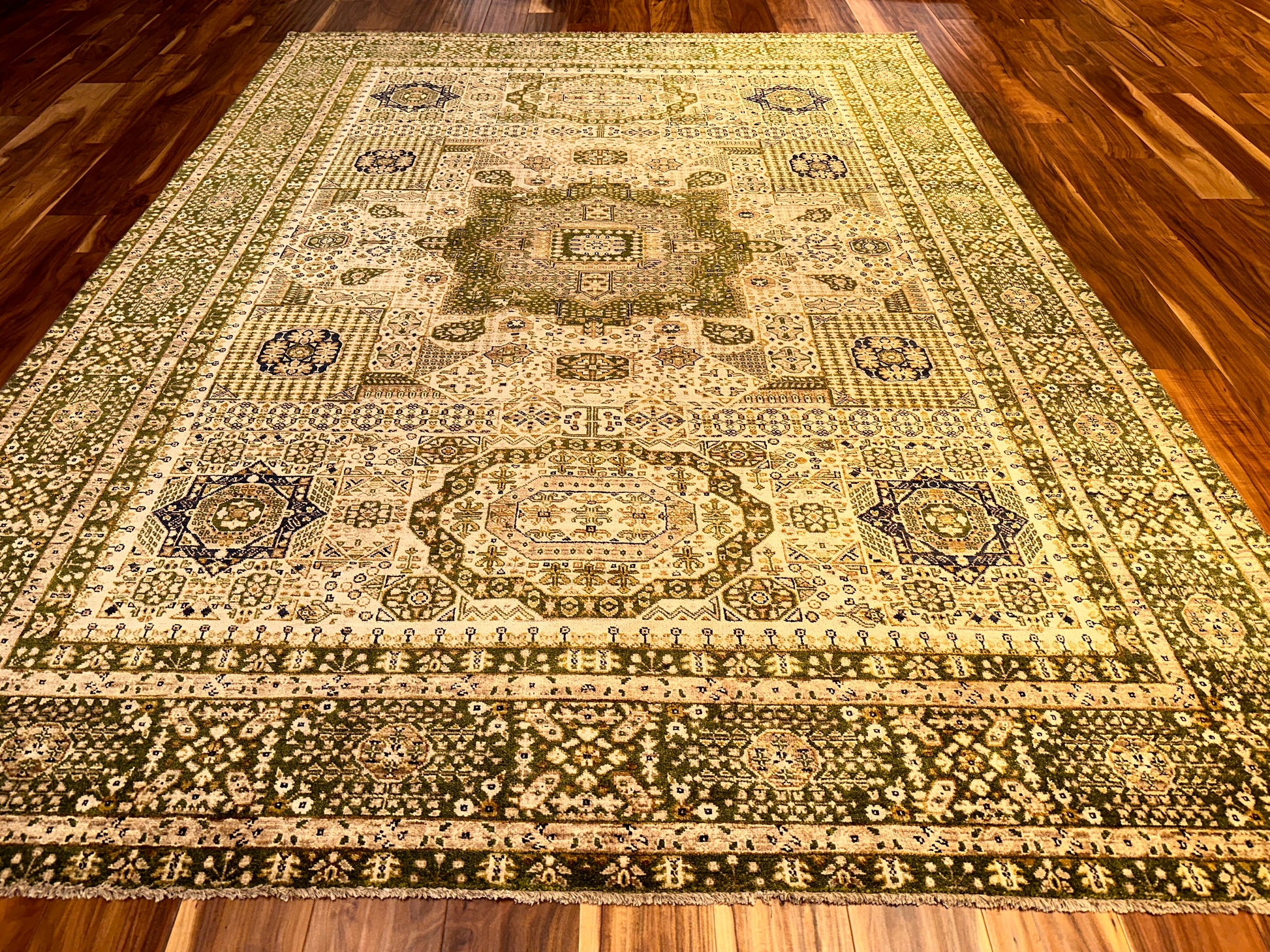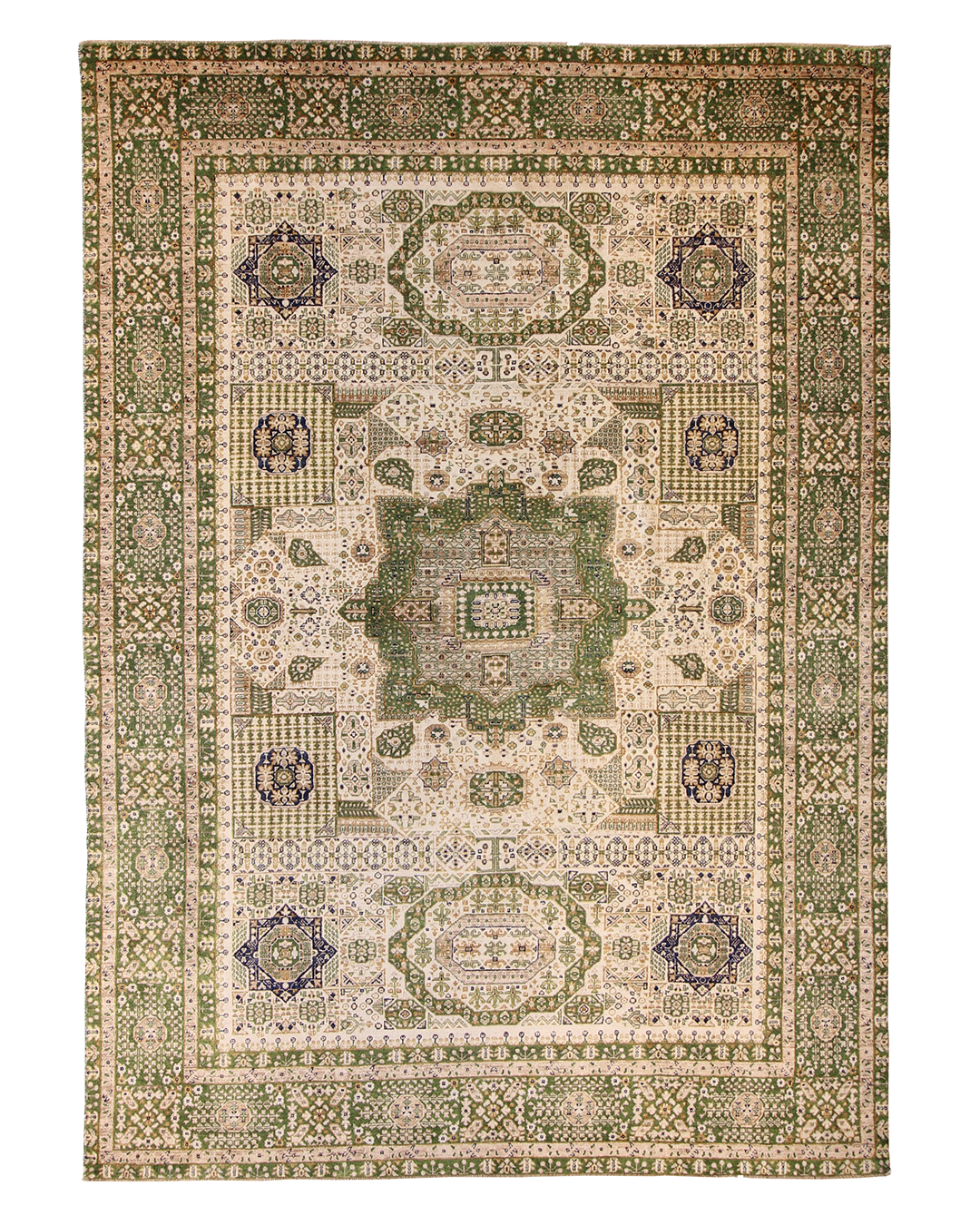 Intricate and richly detailed, this hand-knotted rug features a grand central medallion surrounded by a complex patchwork of geometric motifs, floral medallions, and latticework. Shades of green and navy accent the soft beige ground, while the wide border, filled with fine repeating patterns, adds structure and balance to the overall composition.