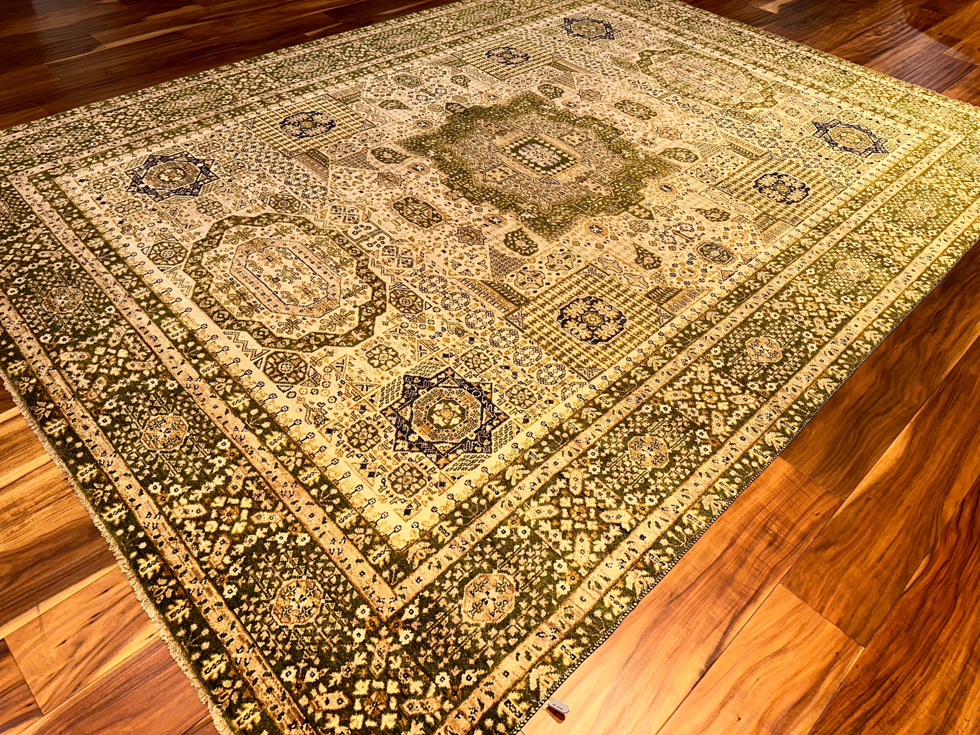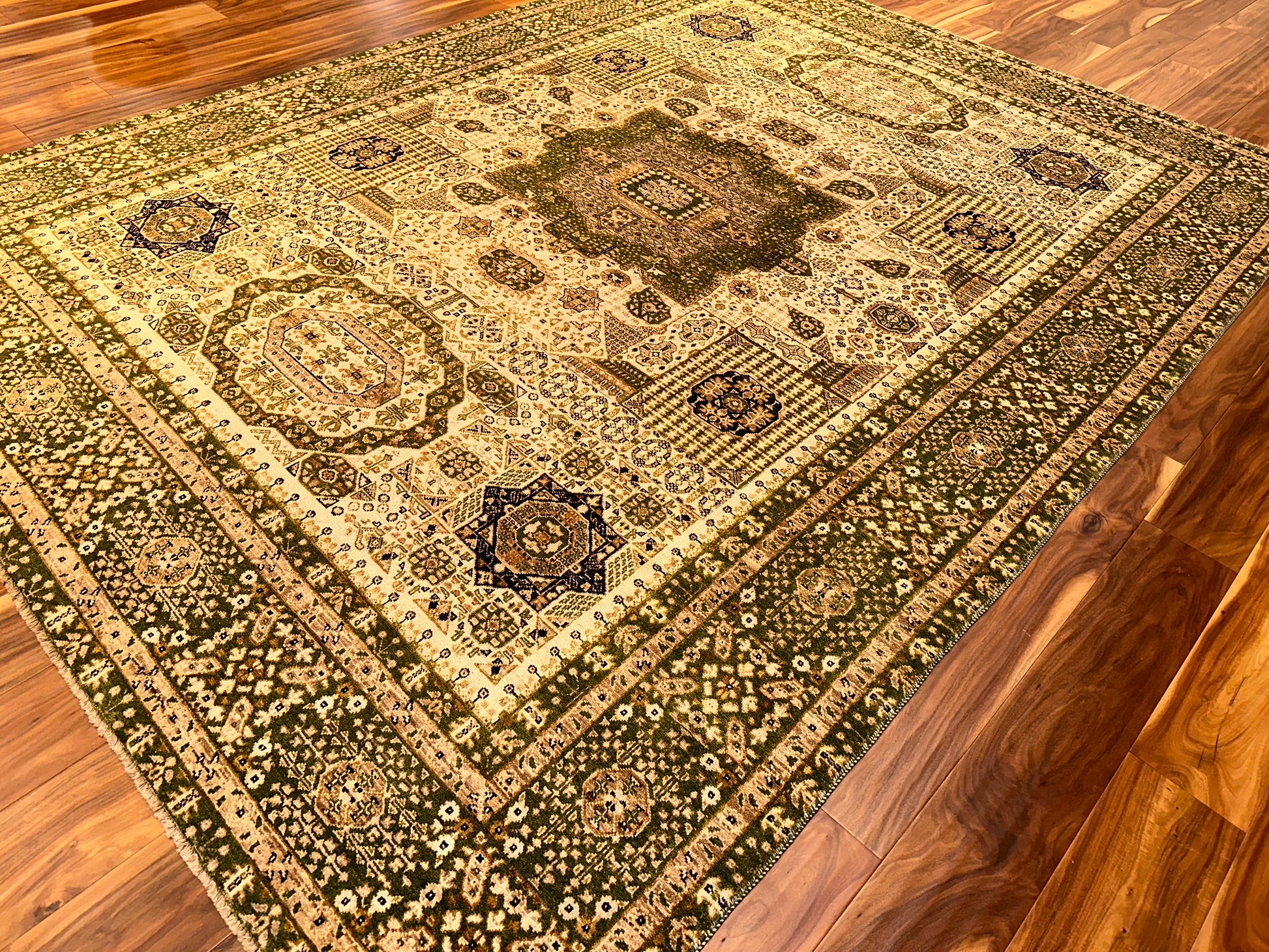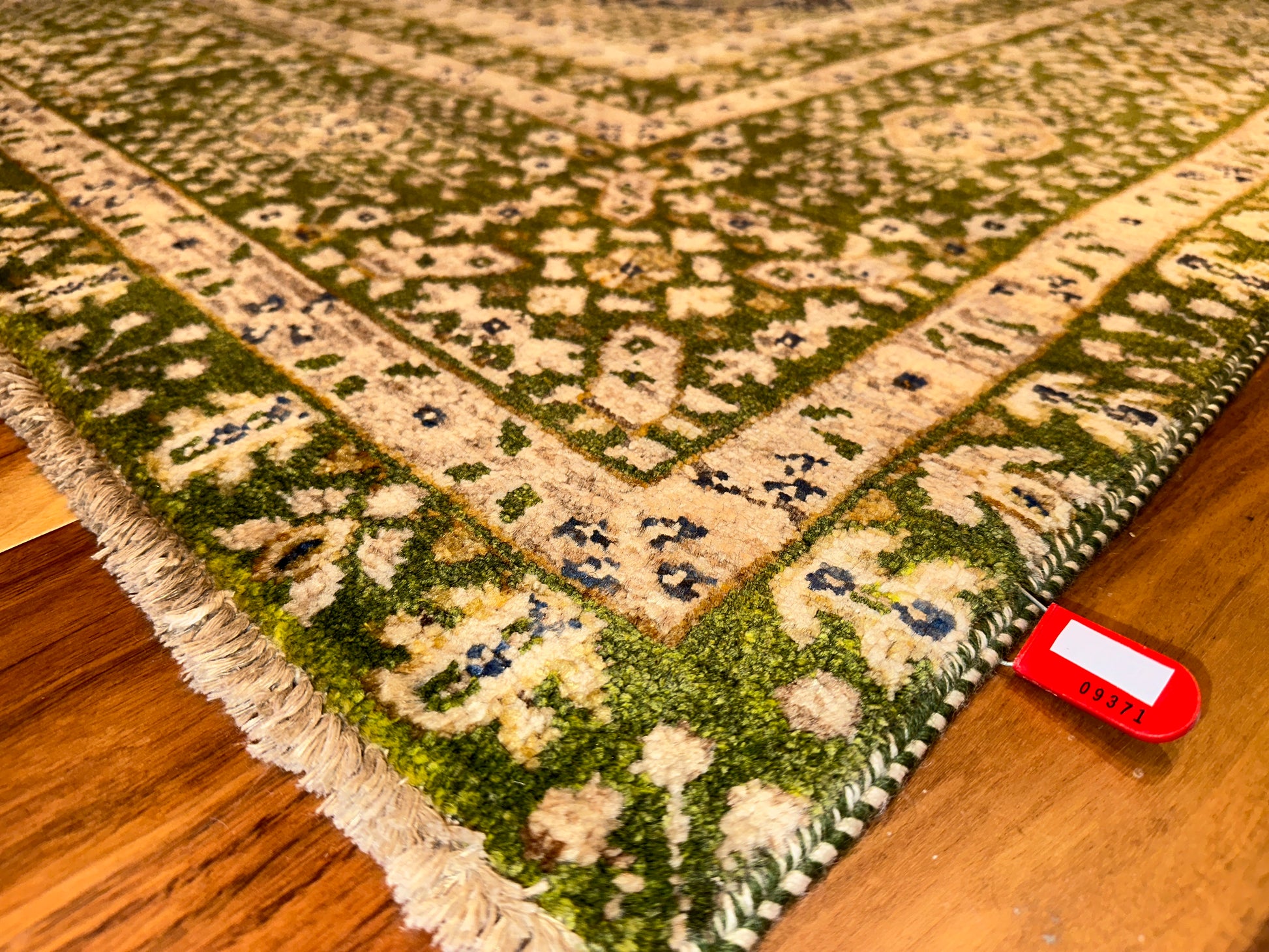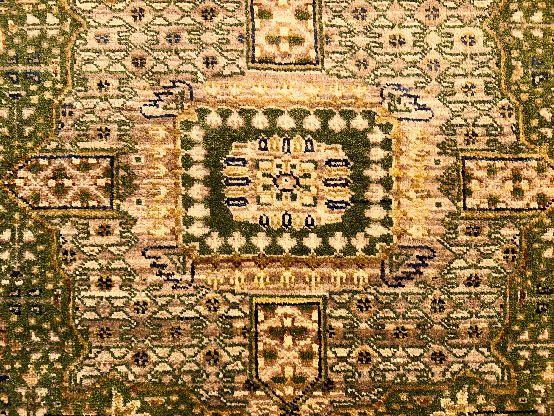 Intricate and richly detailed, this hand-knotted rug features a grand central medallion surrounded by a complex patchwork of geometric motifs, floral medallions, and latticework. Shades of green and navy accent the soft beige ground, while the wide border, filled with fine repeating patterns, adds structure and balance to the overall composition.