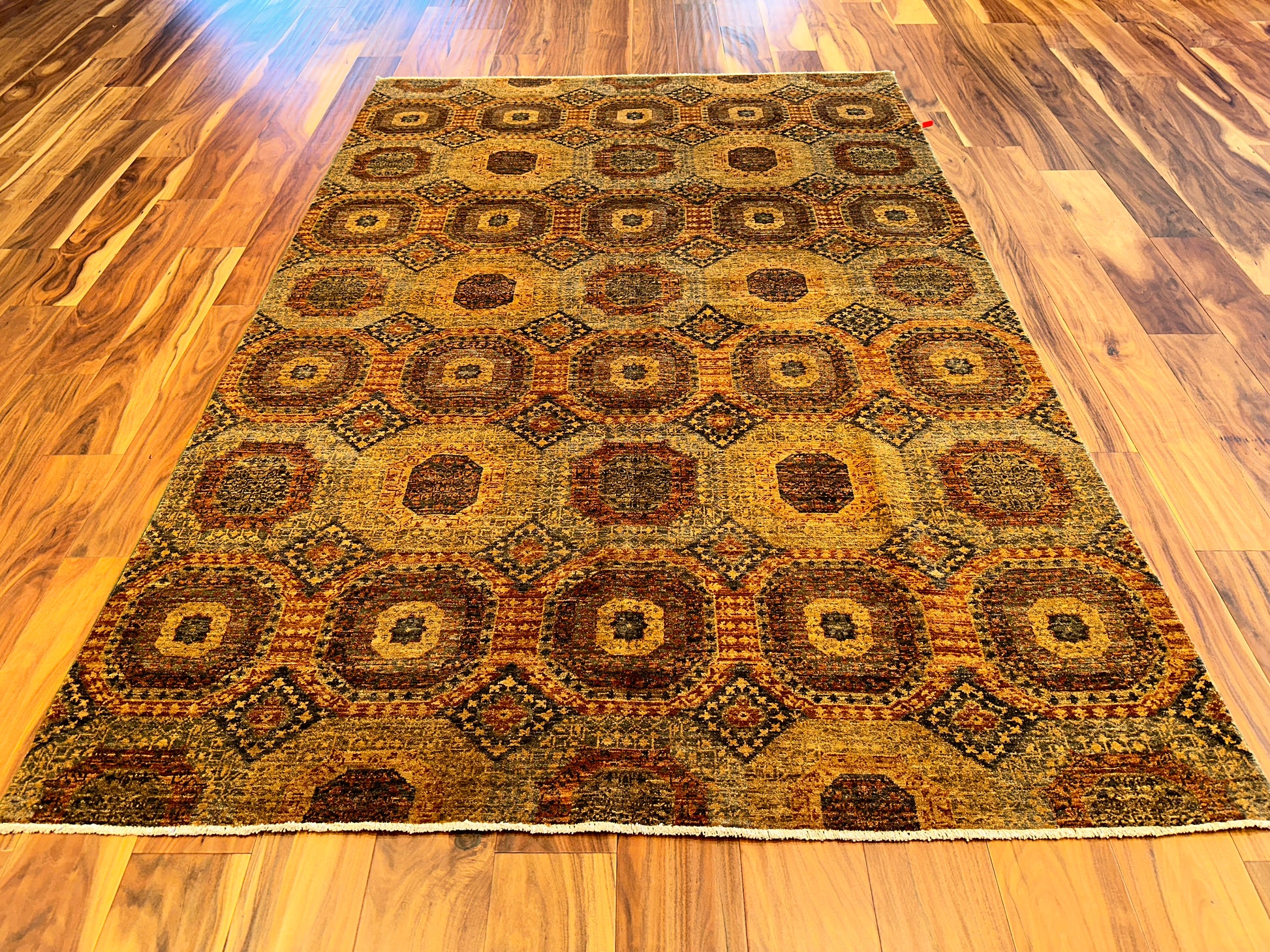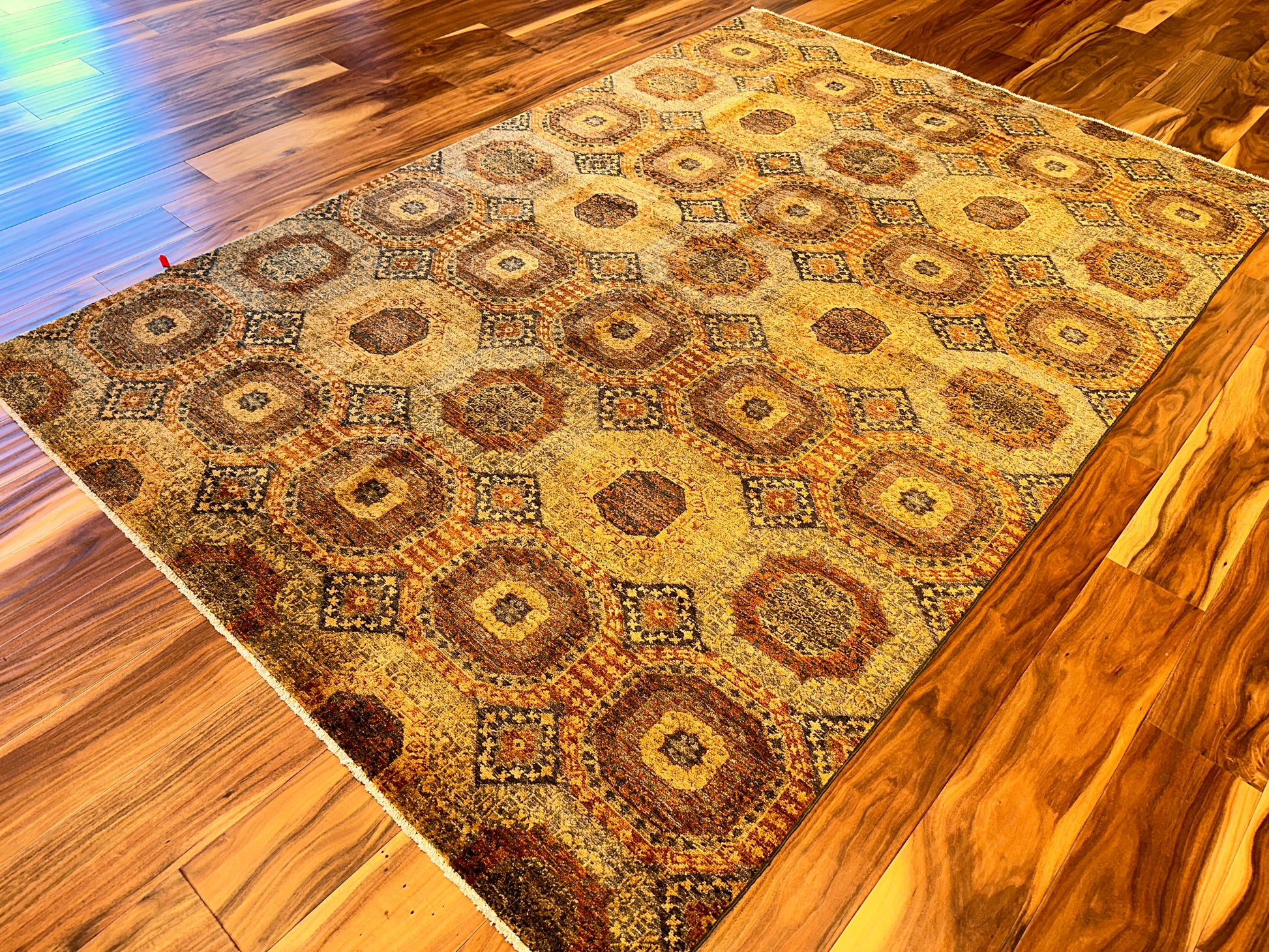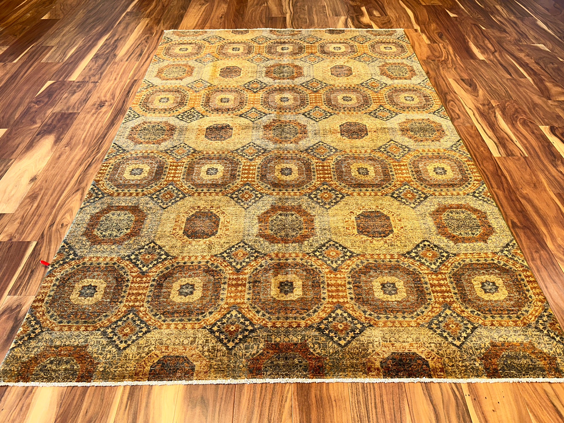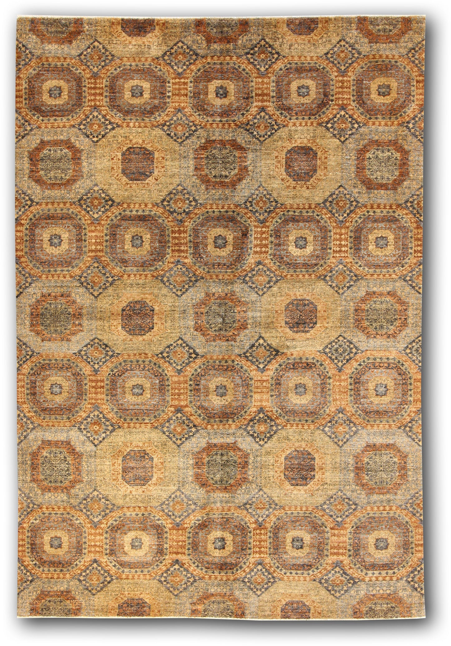 This handsome handmade rug features an allover pattern of large octagonal medallions, each framed by smaller diamond motifs that lend rhythm and intricacy to the layout. Earthy tones of ochre, rust, denim blue, and taupe are softly layered across the design, creating a mellow patina that echoes antique tribal weavings. The geometric repetition and subtle variation in texture give the piece a grounded, quietly dynamic feel.