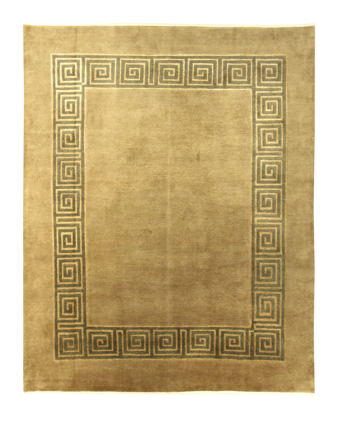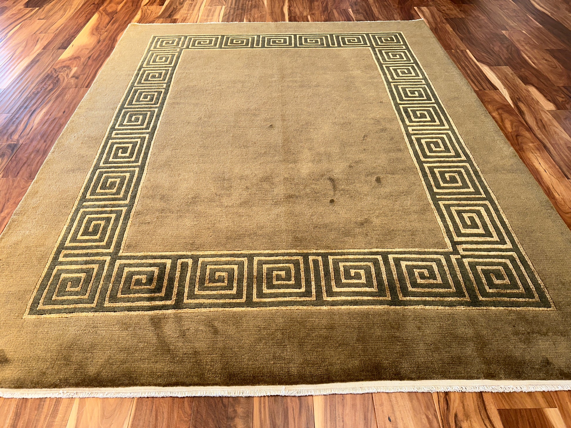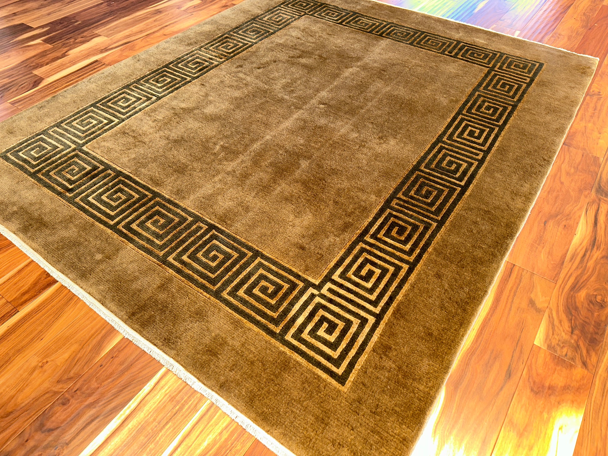 Grounded in timeless symmetry, this handwoven rug features a classic Greek key border in deep charcoal framing a warm golden field. The understated elegance of its design offers a refined touch, perfect for interiors where quiet luxury and architectural harmony are key.