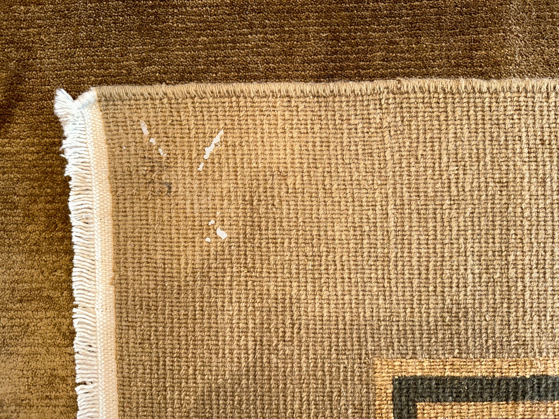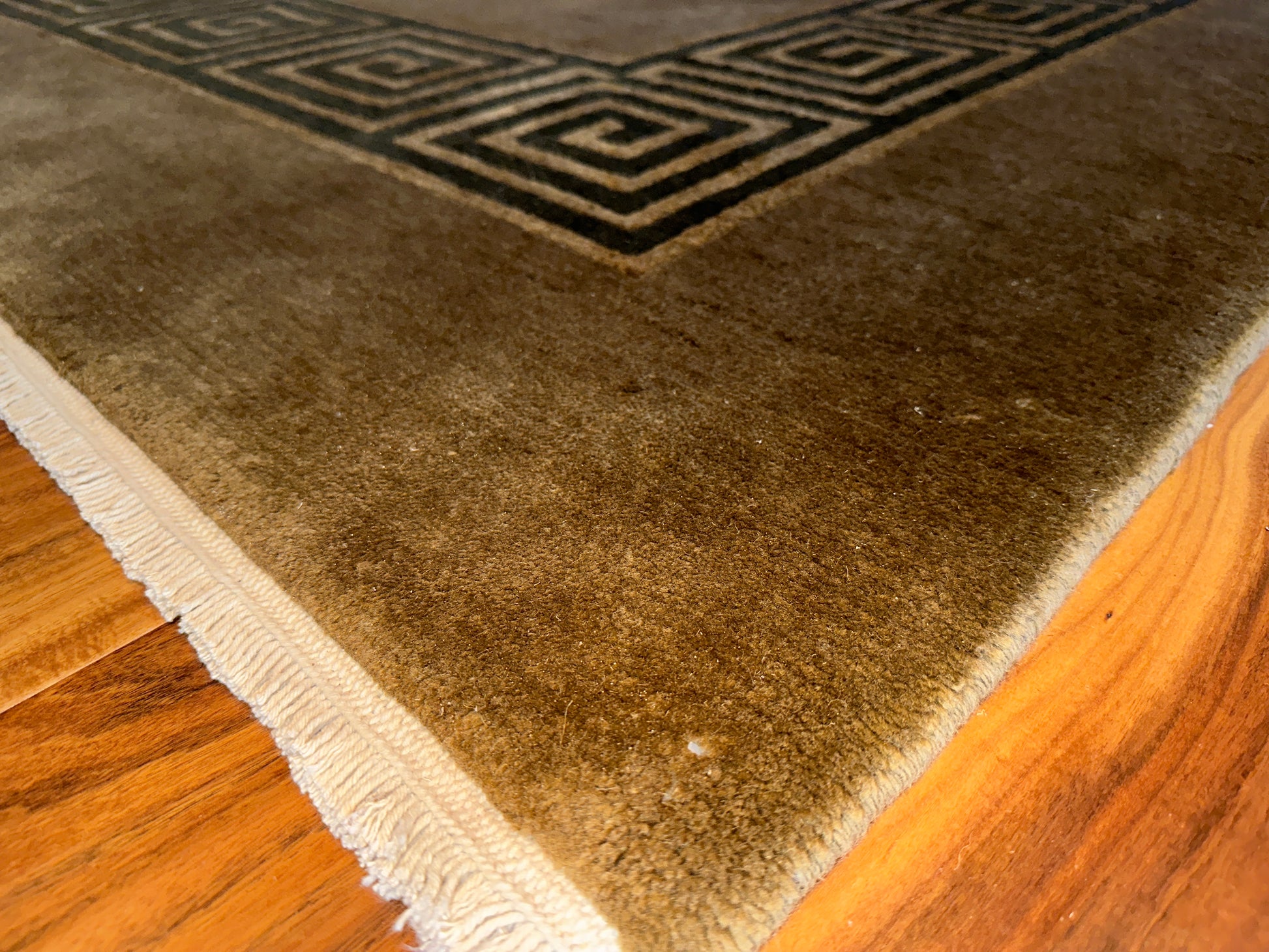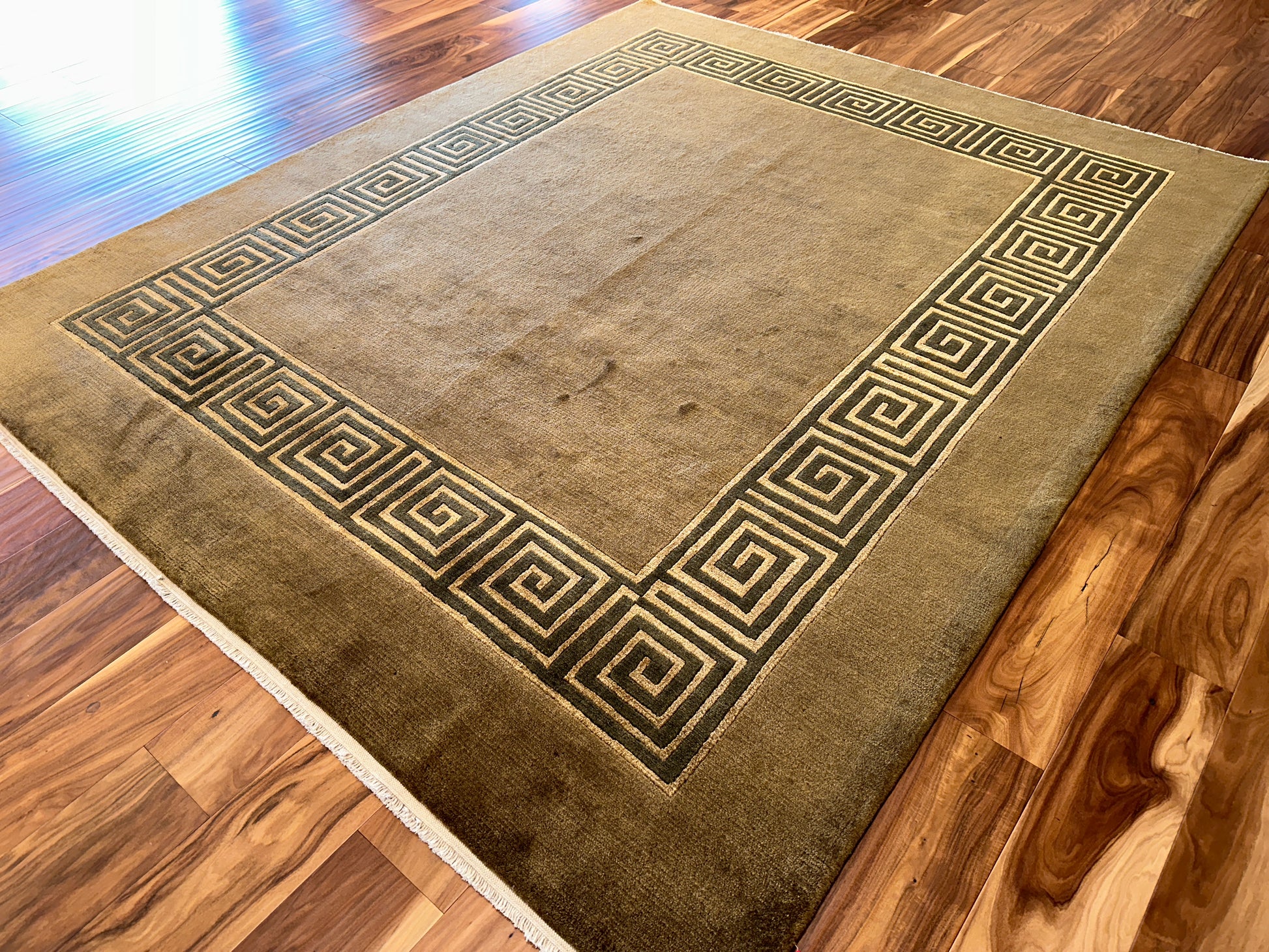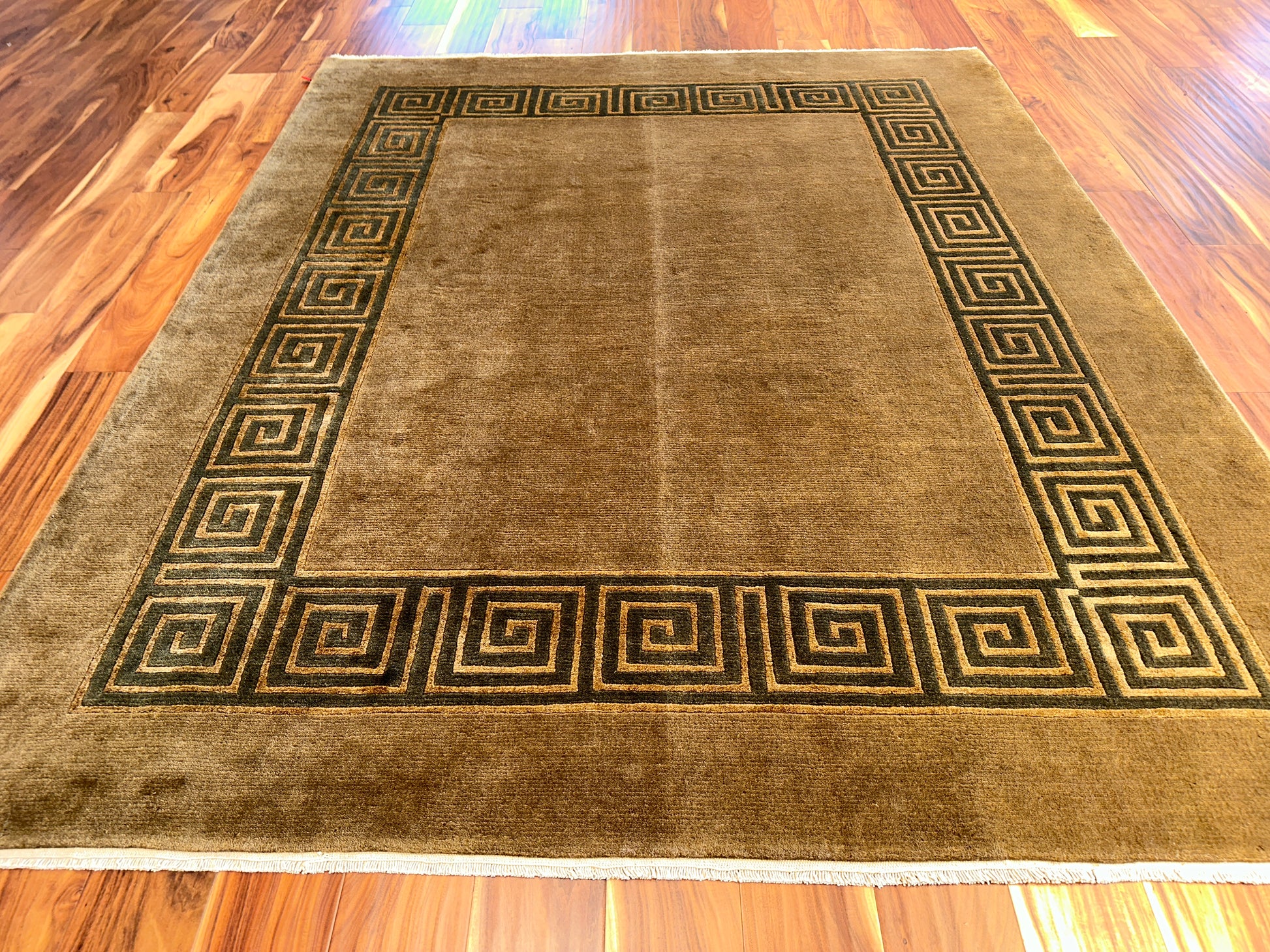 Grounded in timeless symmetry, this handwoven rug features a classic Greek key border in deep charcoal framing a warm golden field. The understated elegance of its design offers a refined touch, perfect for interiors where quiet luxury and architectural harmony are key.