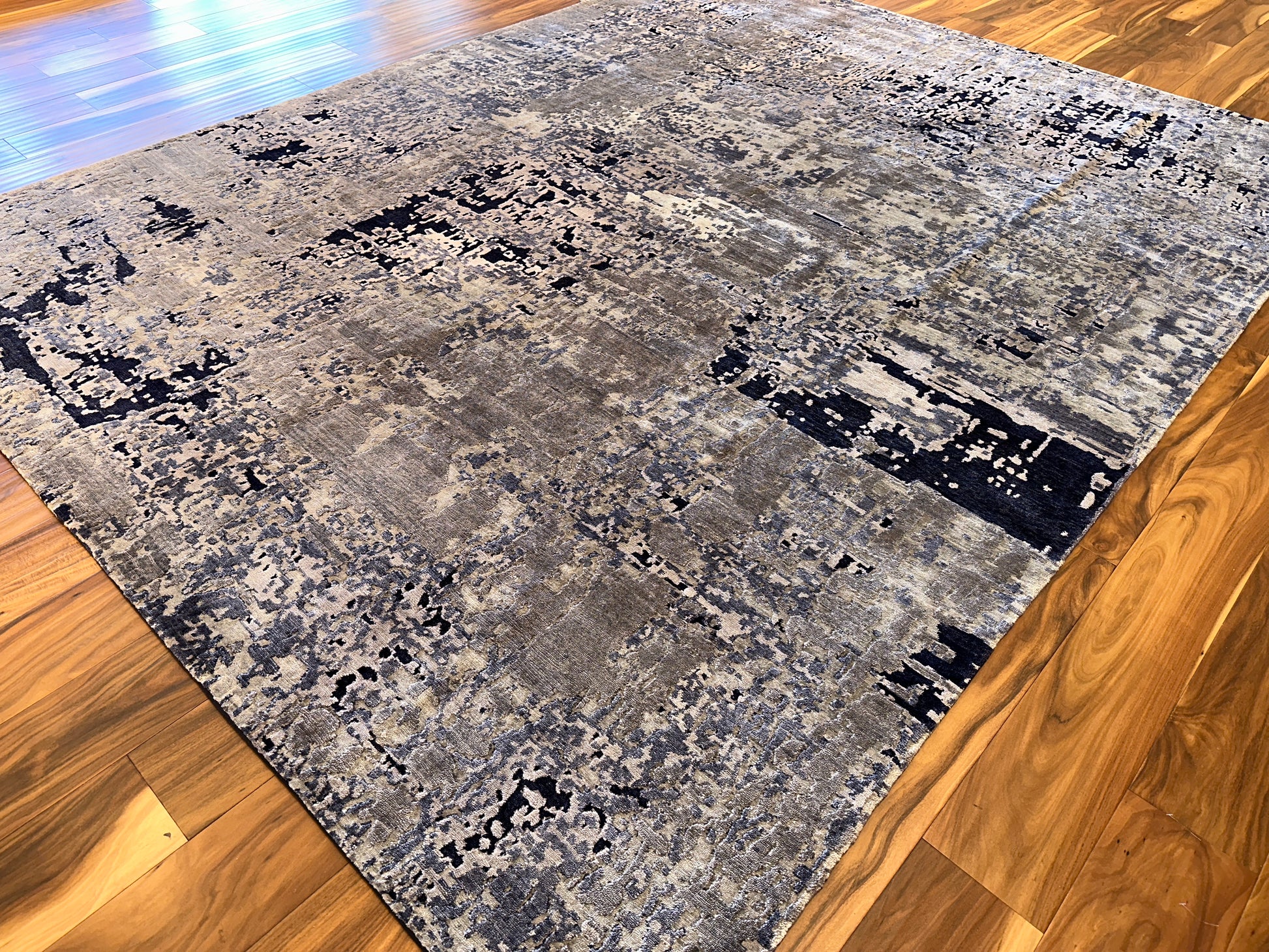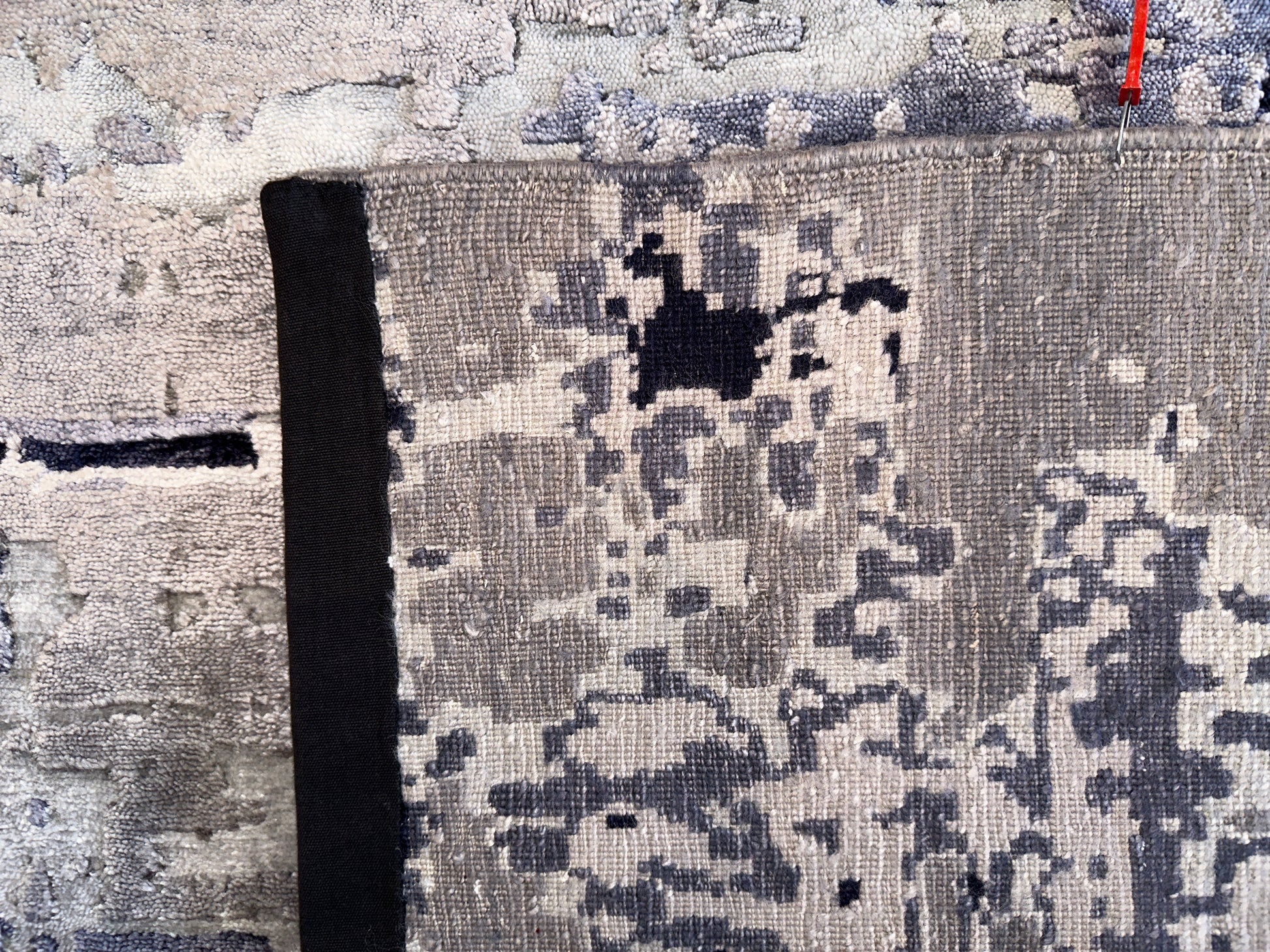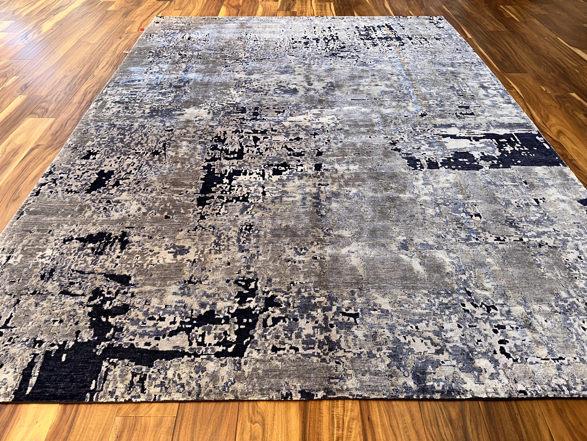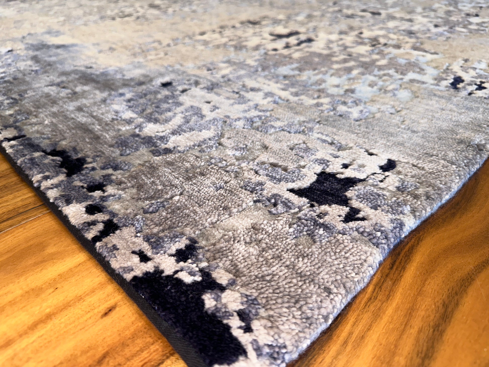 A striking interplay of texture and tone, this hand-knotted rug captures the energy of abstract art with a softened, sophisticated palette. Shades of stone gray, deep indigo, and silver dance across the surface, offering a rich yet understated backdrop that feels both modern and timeless.