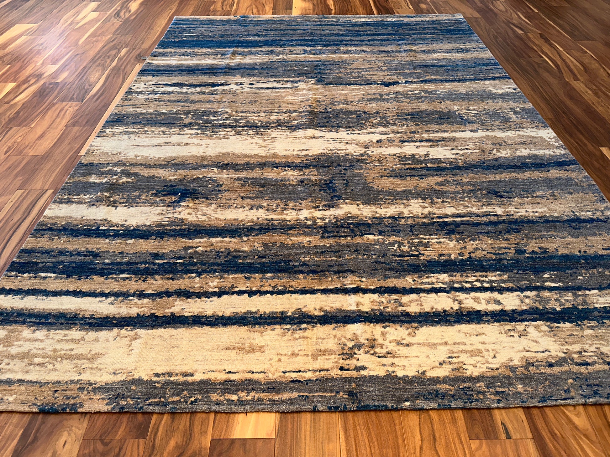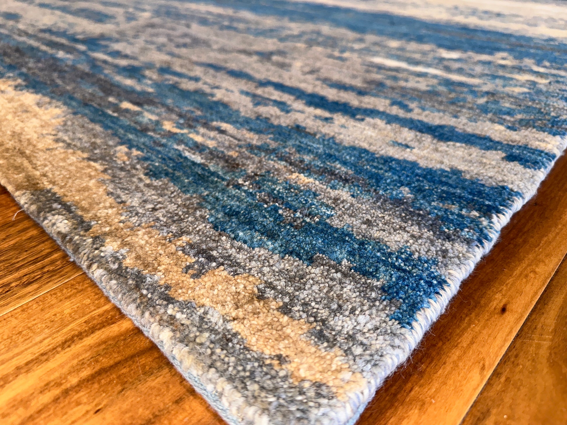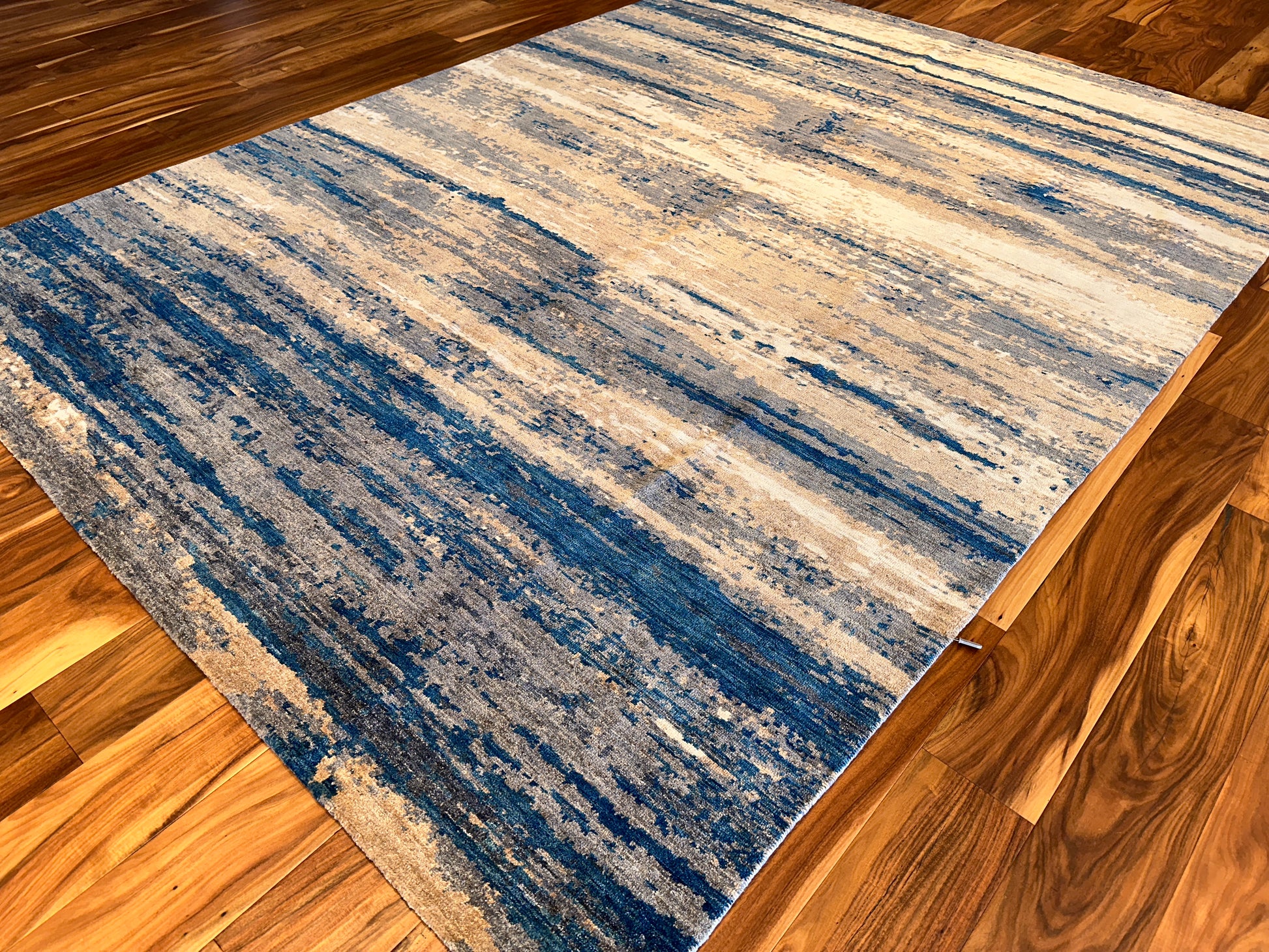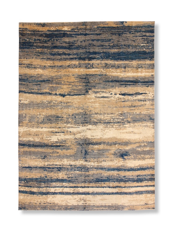 Inspired by shifting tides and windswept shores, this hand-knotted rug layers soft waves of blue across a sandy beige field. The irregular striations create a calming rhythm, like water moving across a quiet coast. Muted yet dimensional, it brings a grounded sense of movement to any space—modern, coastal, or transitional.