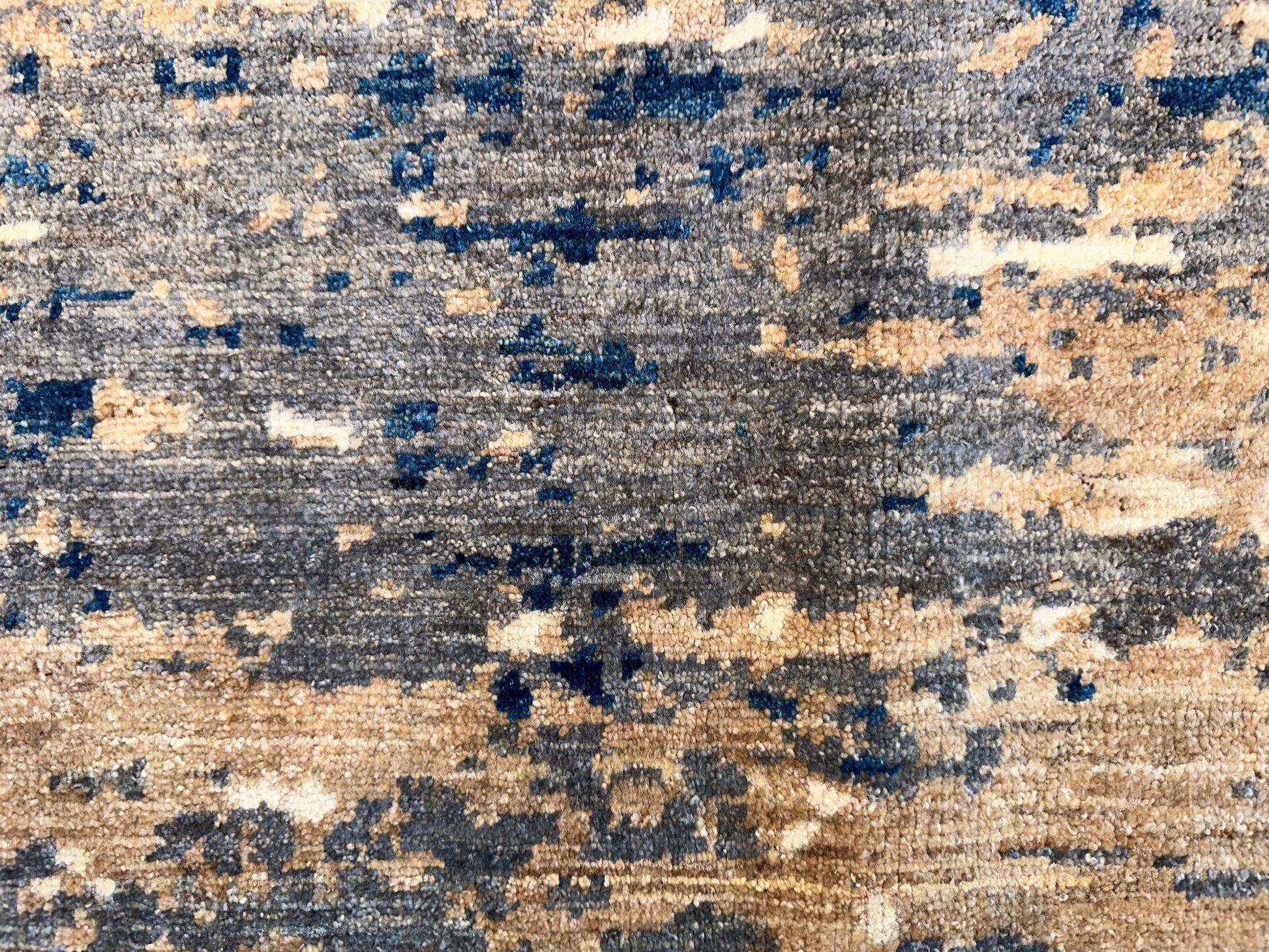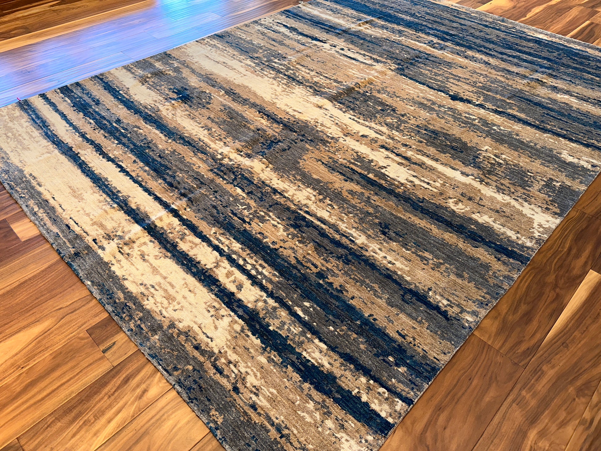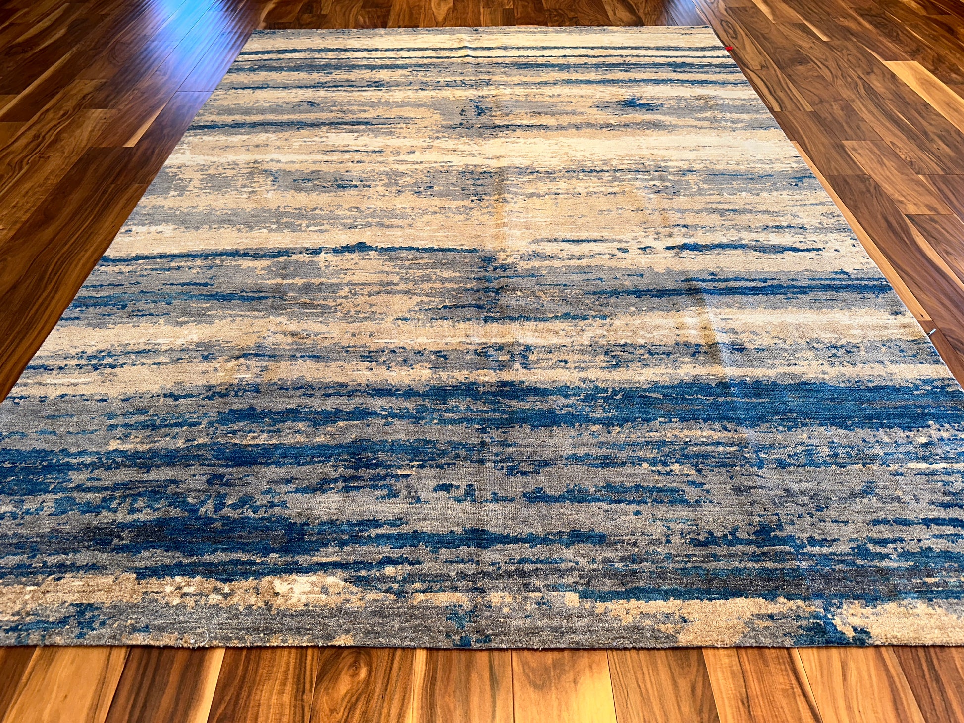 Inspired by shifting tides and windswept shores, this hand-knotted rug layers soft waves of blue across a sandy beige field. The irregular striations create a calming rhythm, like water moving across a quiet coast. Muted yet dimensional, it brings a grounded sense of movement to any space—modern, coastal, or transitional.