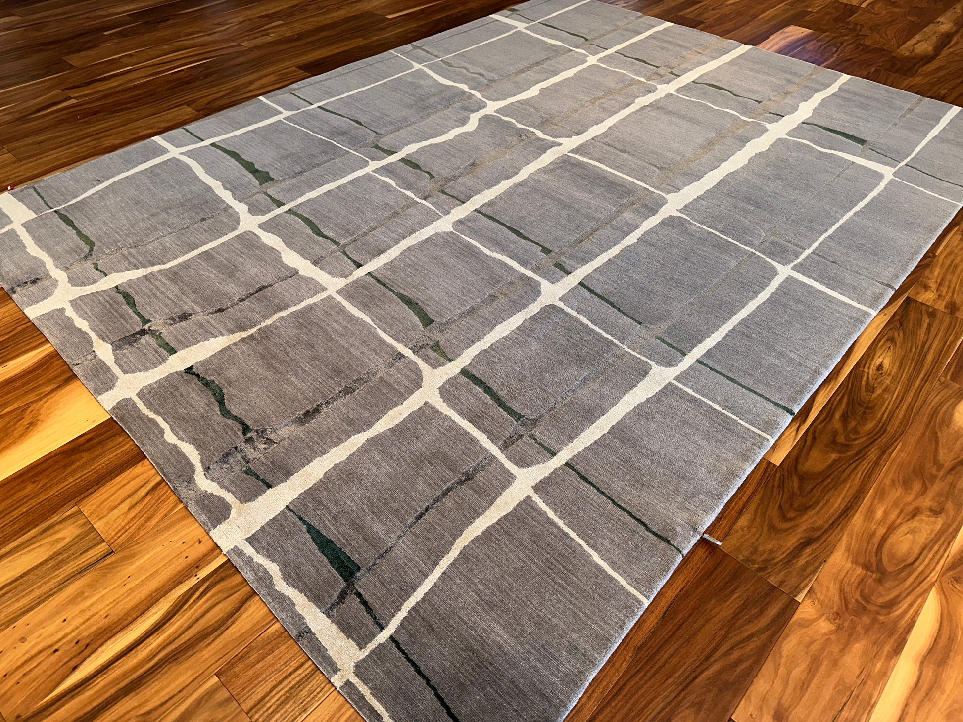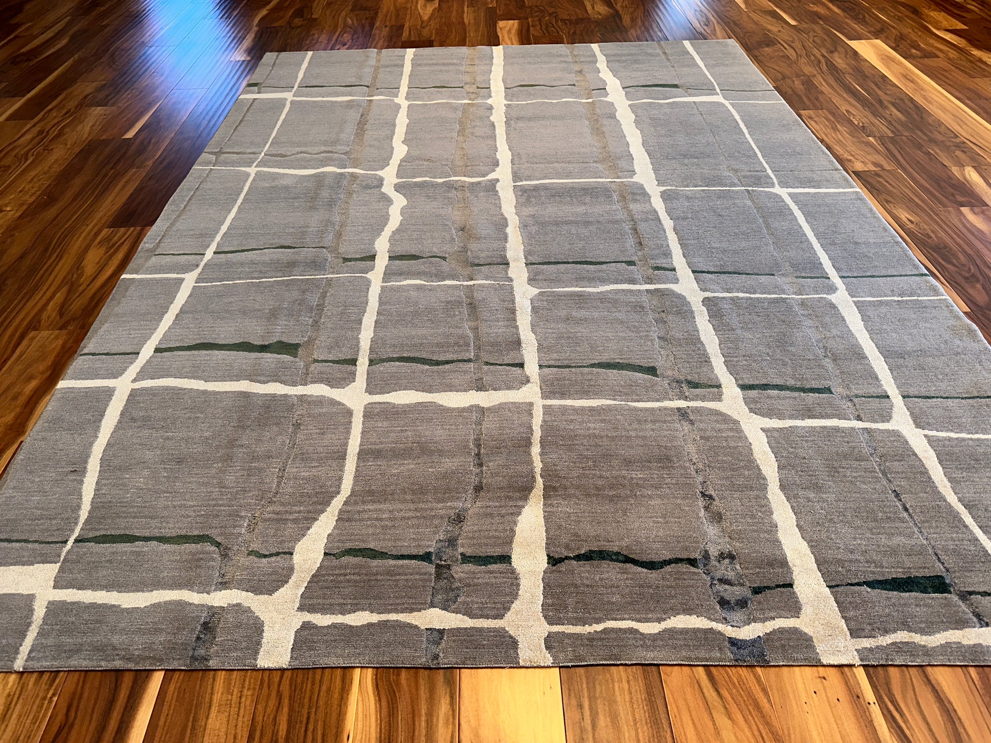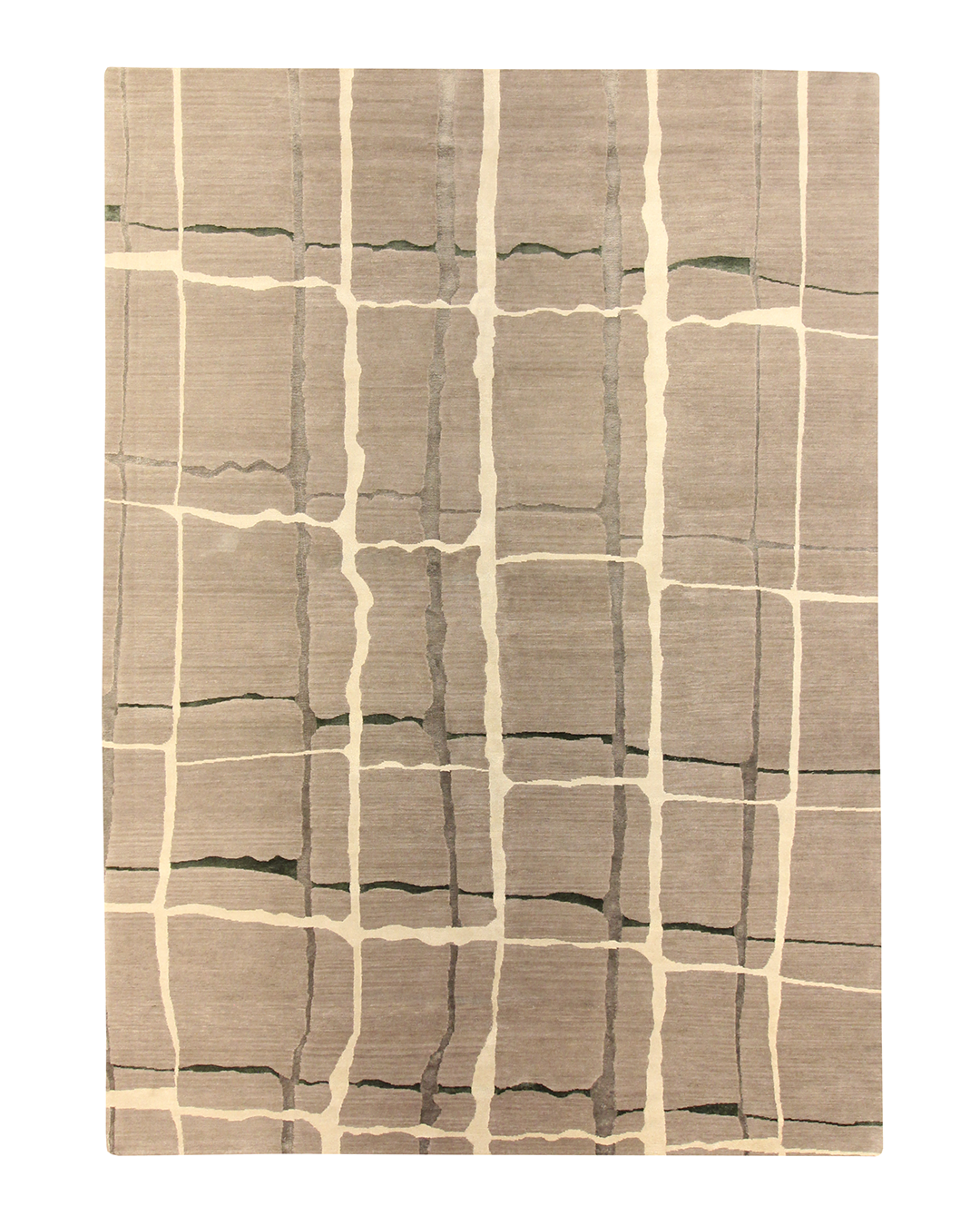 This contemporary rug features a quiet grid of irregular ivory lines gently layered over soft taupe and gray fields, touched with hints of moss green. The organic quality of the broken grid evokes natural stone or handmade tiles, lending a subtle sense of rhythm and movement. Perfect for modern interiors seeking understated elegance with an earthy edge.