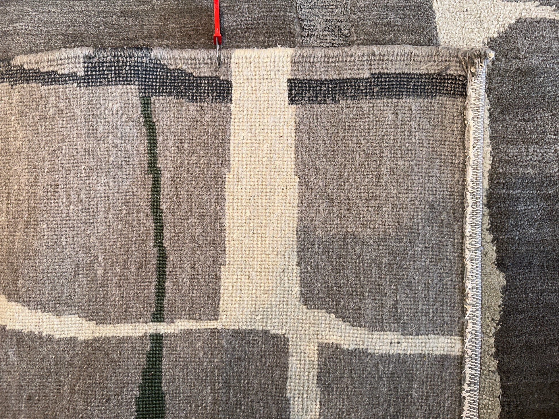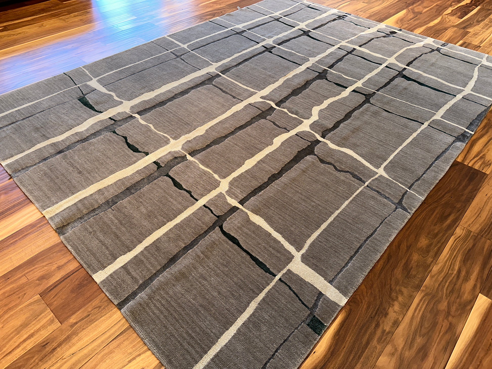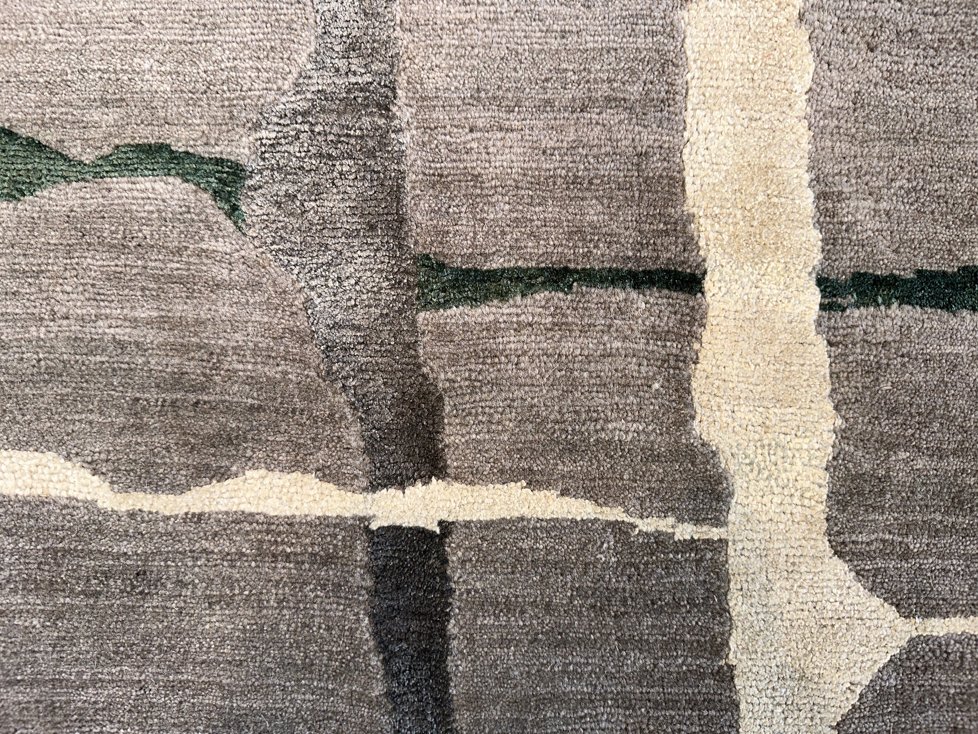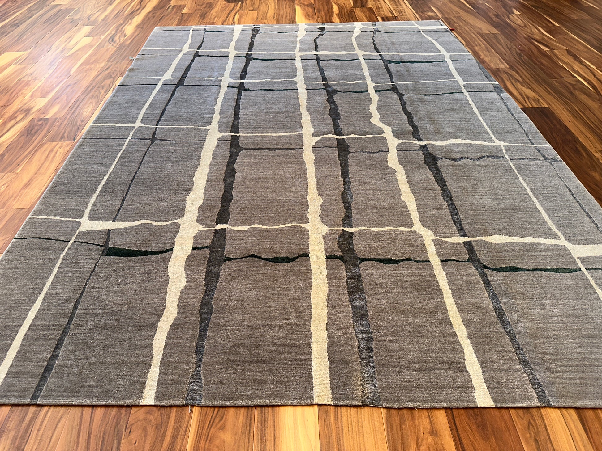 This contemporary rug features a quiet grid of irregular ivory lines gently layered over soft taupe and gray fields, touched with hints of moss green. The organic quality of the broken grid evokes natural stone or handmade tiles, lending a subtle sense of rhythm and movement. Perfect for modern interiors seeking understated elegance with an earthy edge.