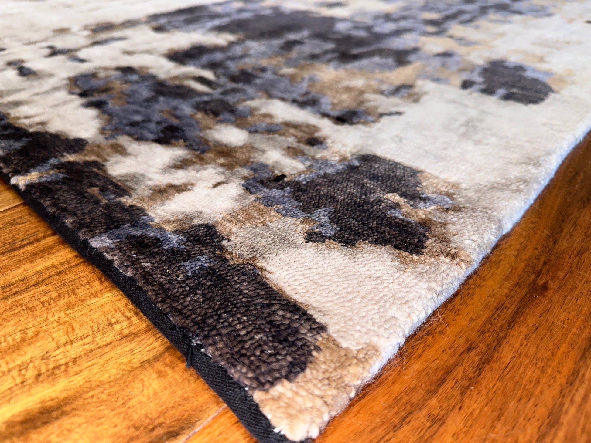 Brimming with depth and visual intrigue, this rug evokes the energy of a weathered cityscape softened by time. Painterly layers of indigo, charcoal, browns, and ivory melt into one another with a tactile richness, creating a moody yet refined backdrop. Its abstract composition brings a dynamic, expressive touch to interiors while maintaining a polished sophistication.