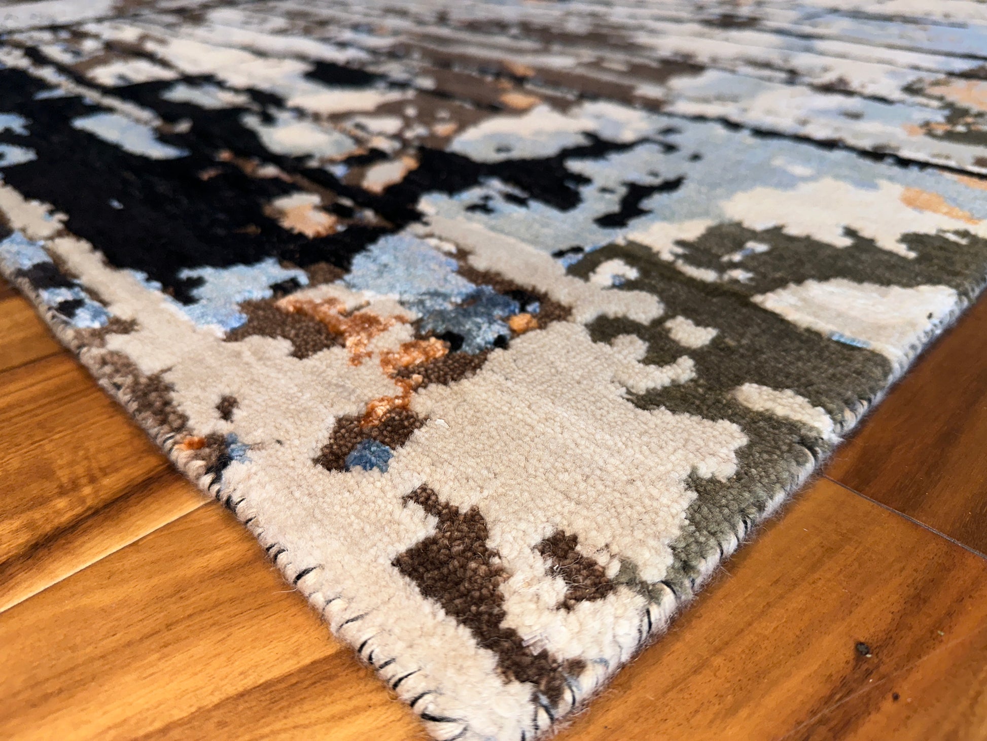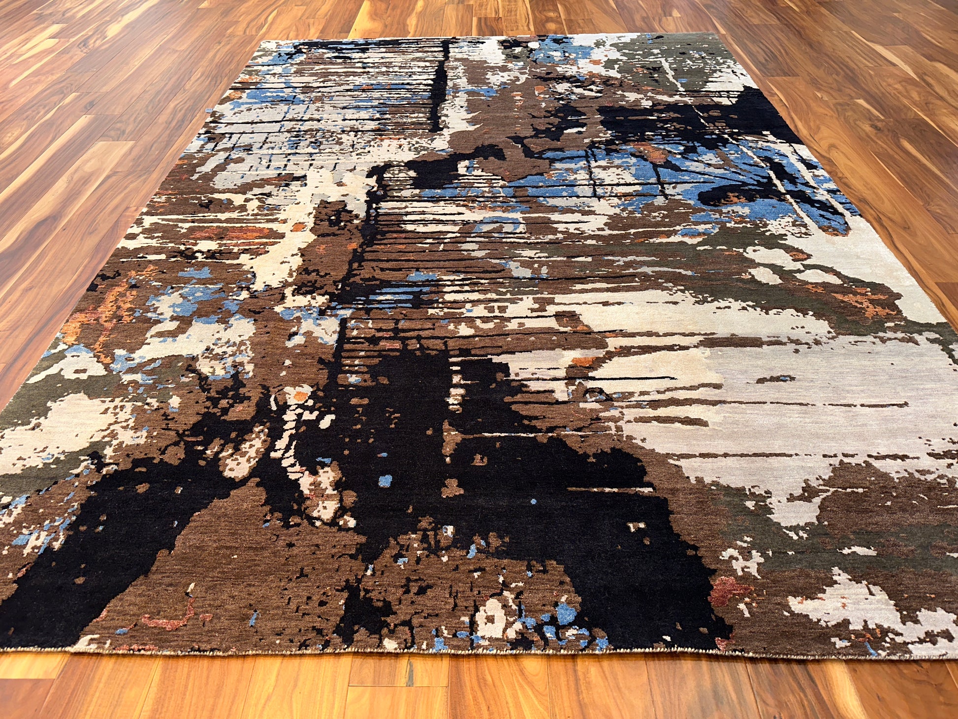 Bold and expressive, this hand-knotted rug captures the energy of abstract art with a dynamic mix of lines and organic forms. Deep chocolate brown and inky black collide with slate blue, warm rust, and cream in a painterly rhythm that feels spontaneous yet deliberate. It’s a visually striking piece that turns the floor into a canvas—perfect for interiors that thrive on contrast and creativity.