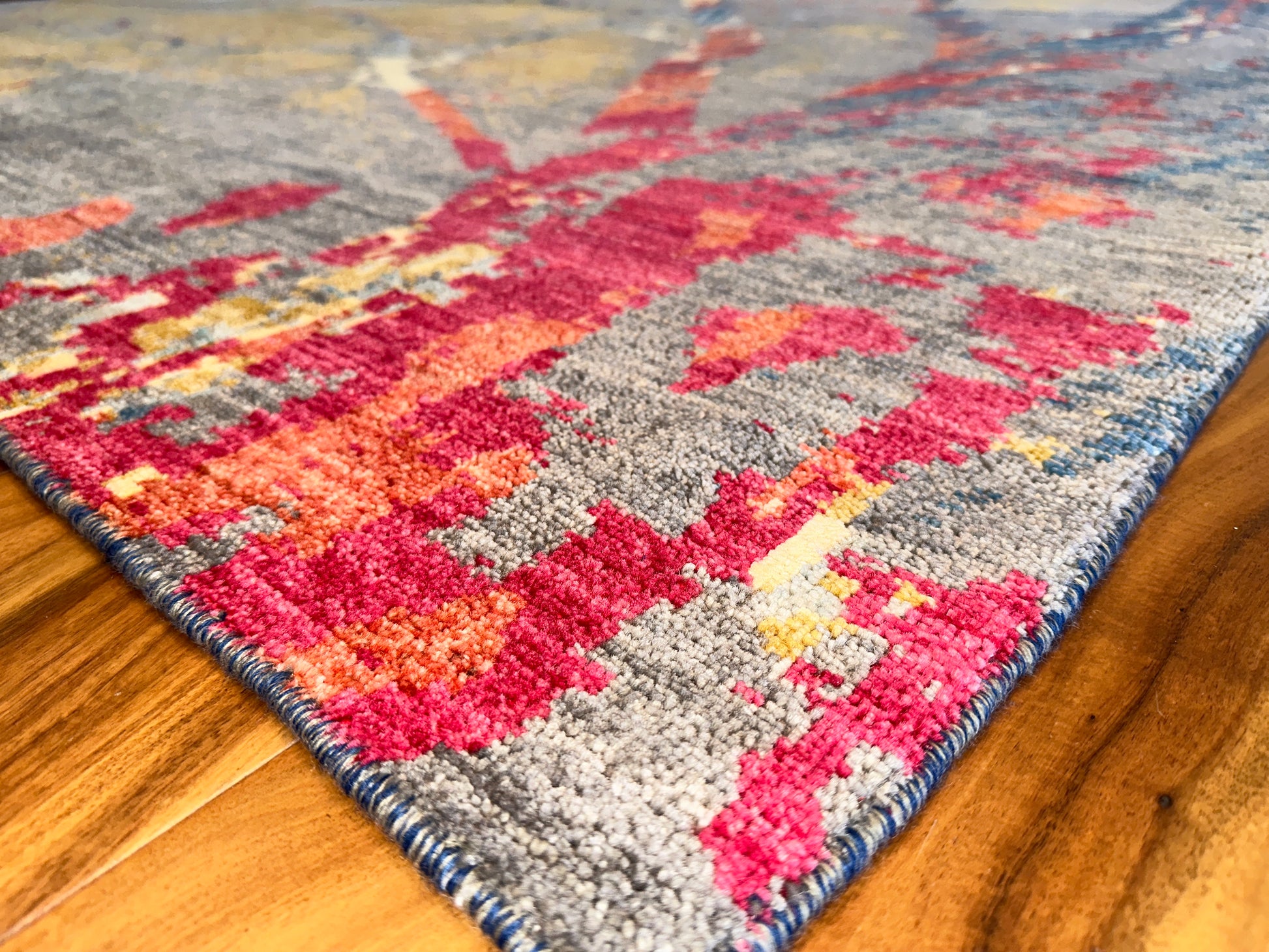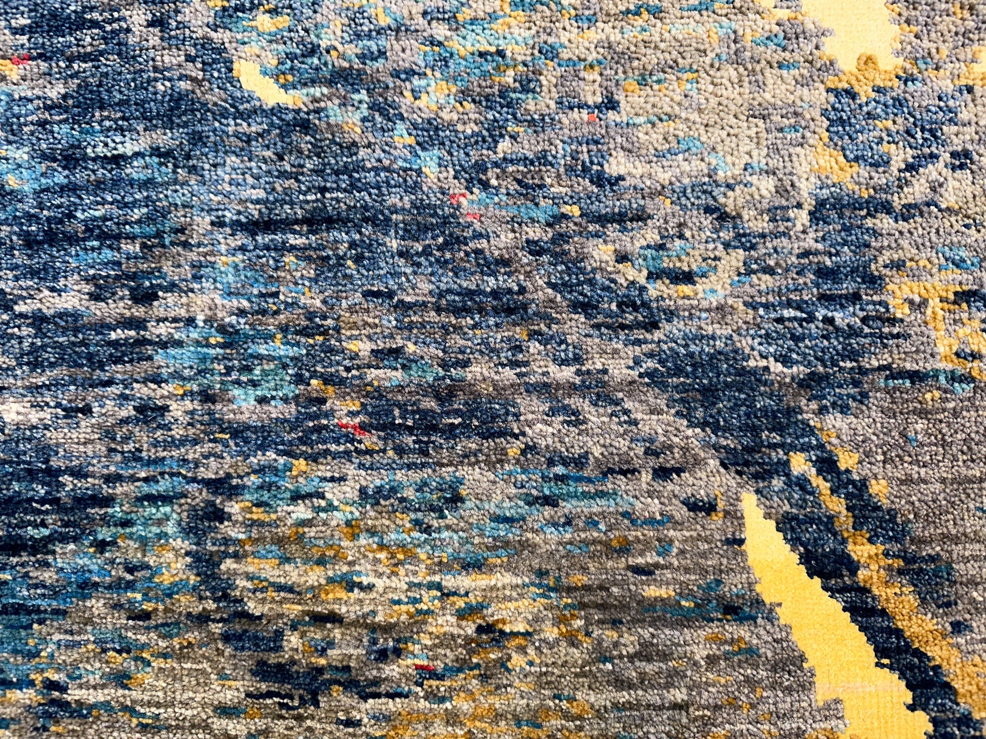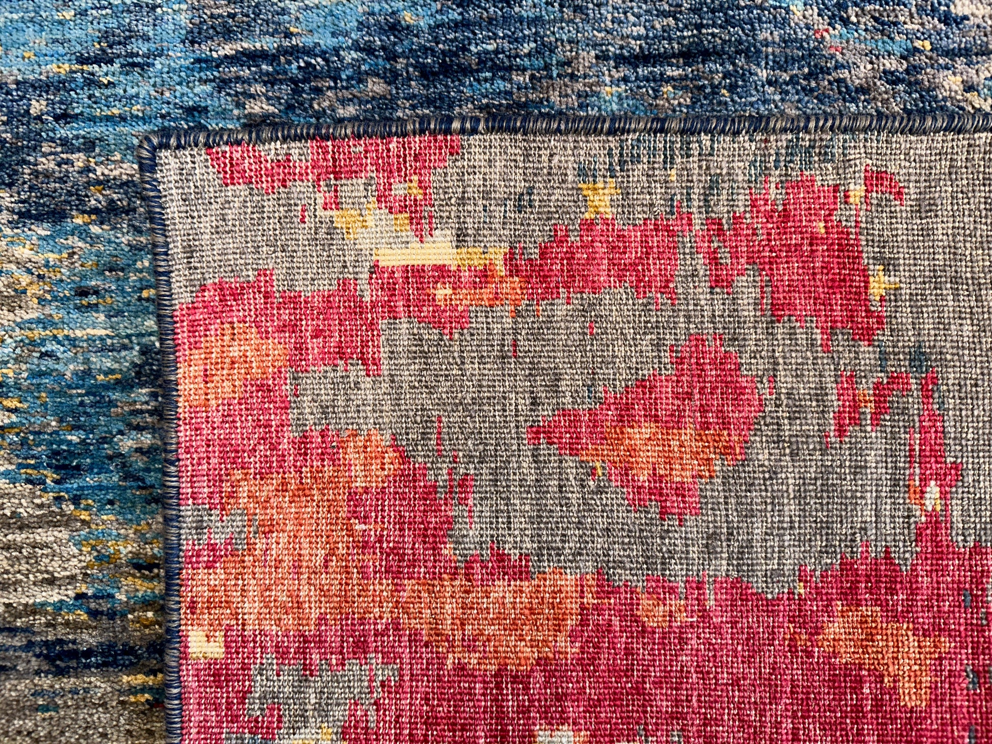Like the delicate energy of a painted landscape caught in motion, this hand-knotted rug blends boldness with grace. Hazy layers of golden ochre and soft denim blue are streaked with fiery coral, pale cream, and flickers of charcoal, creating a vivid and atmospheric composition. The movement across the rug suggests wind, light, and organic lines—ideal for spaces where creativity and warmth meet.