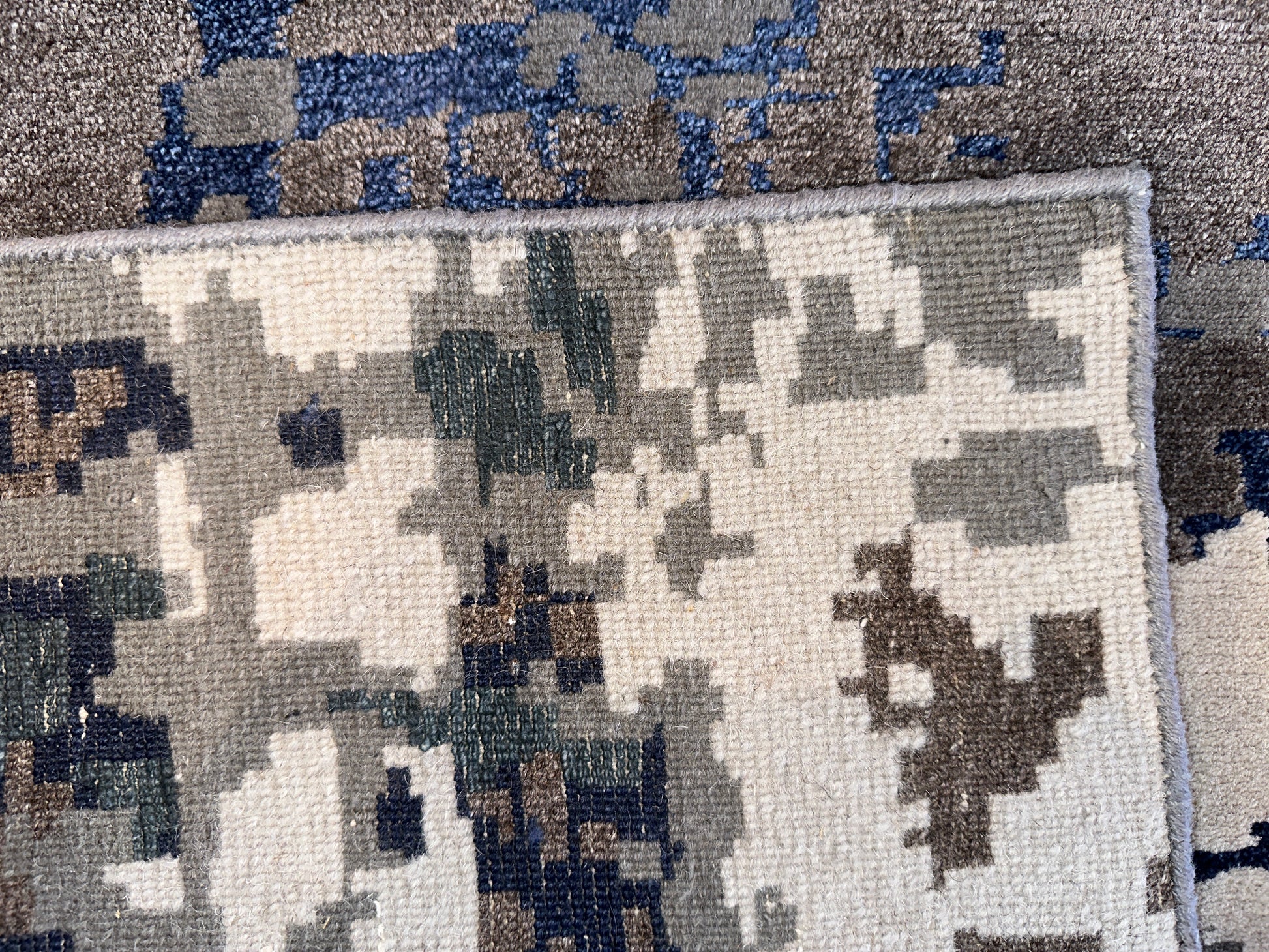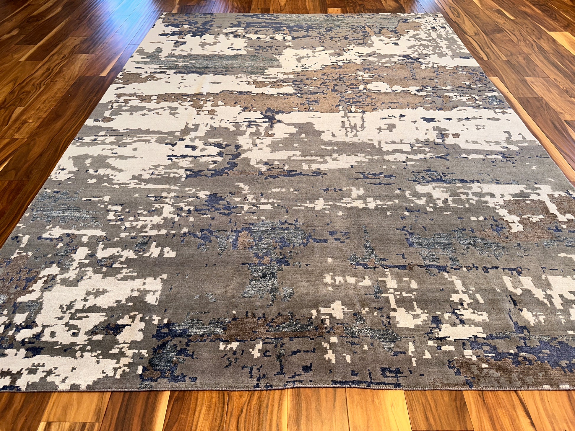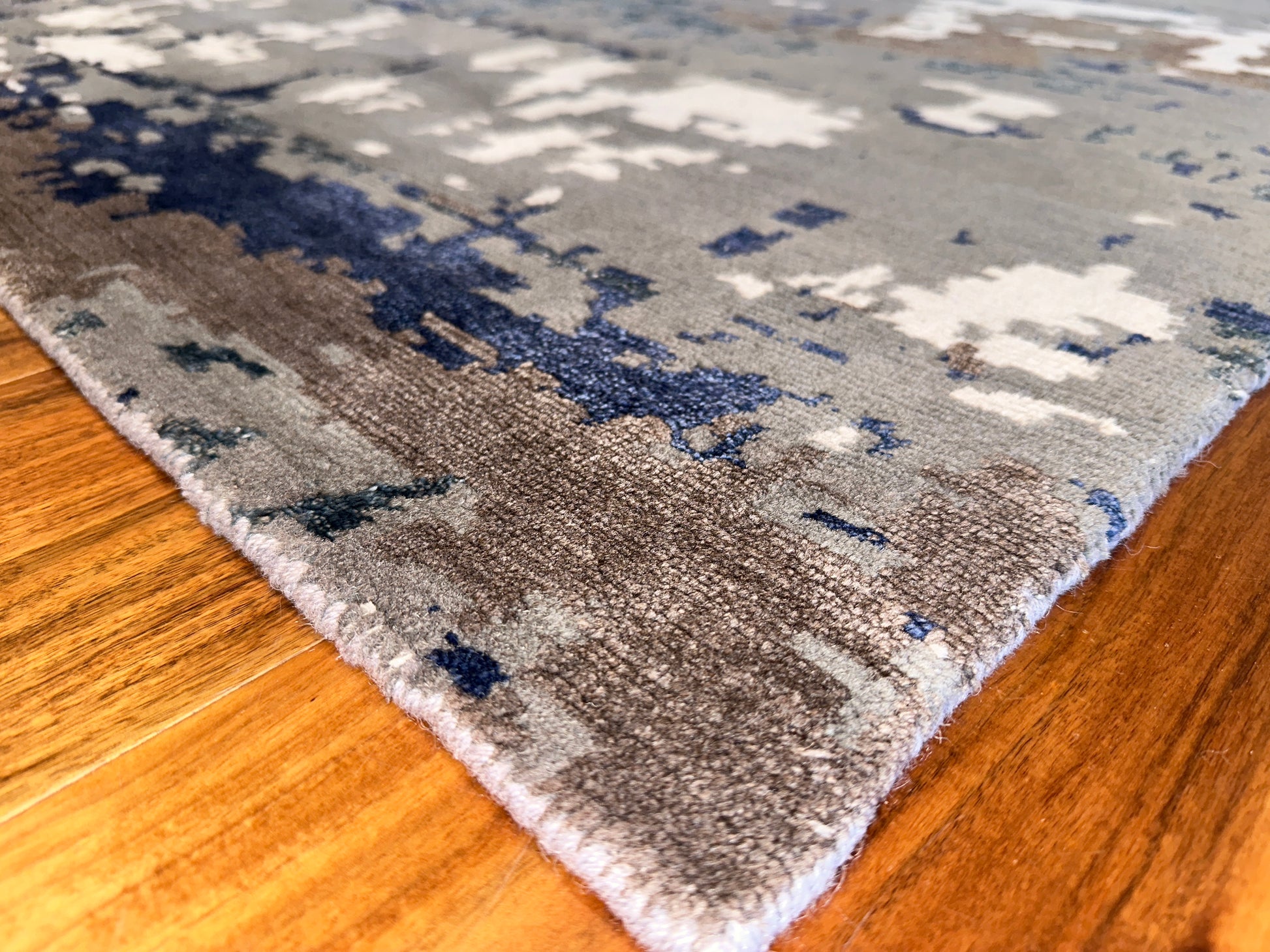 Cool and serene like reflections on water, this rug offers a beautifully broken pattern that feels both contemporary and poetic. Its abstract design layers shades of soft stone, ivory, and midnight blue with hints of denim and pewter. The fragmented composition creates a sense of rhythm and texture, making it an elegant grounding element in a minimalist or modern interior.