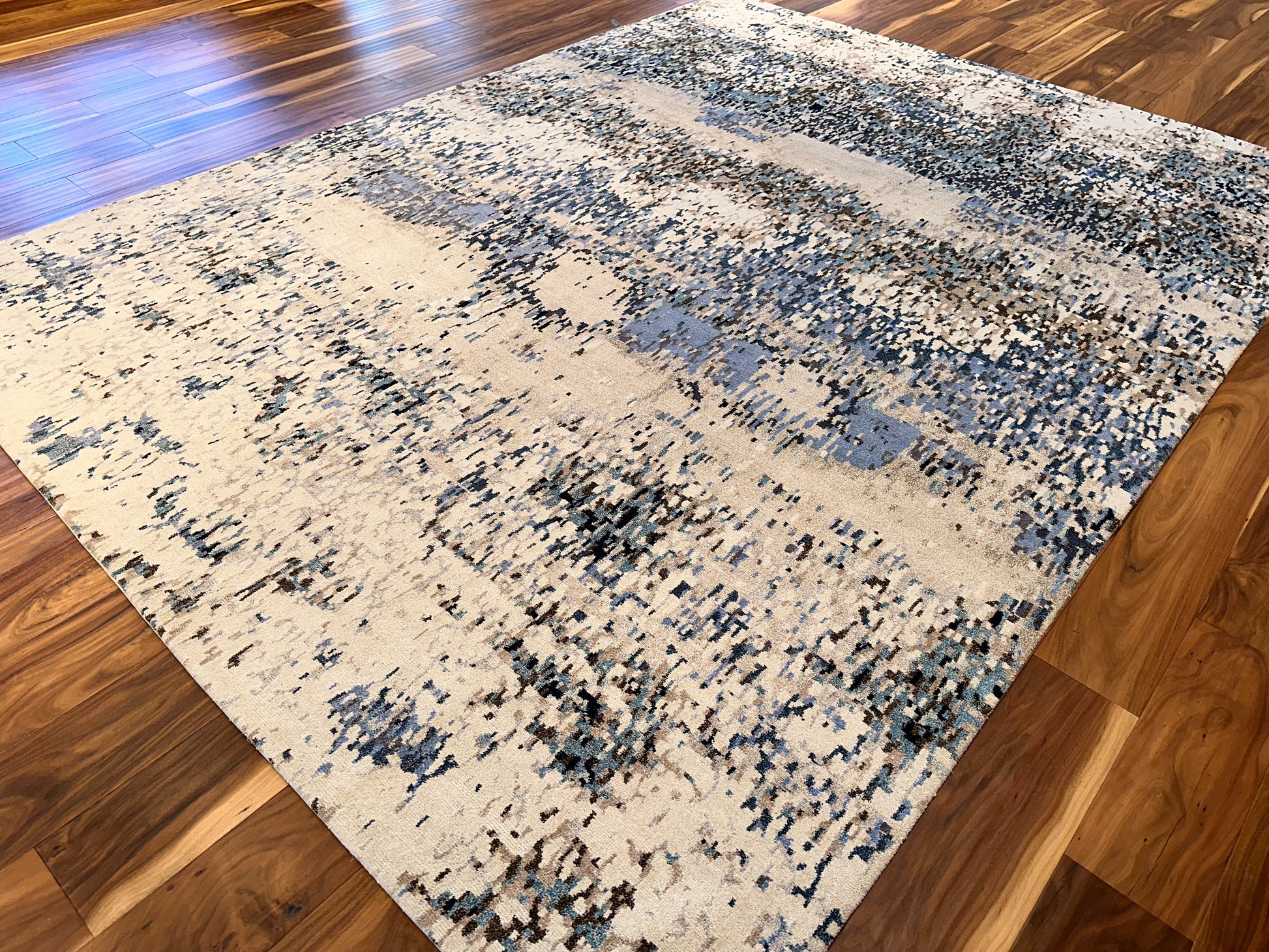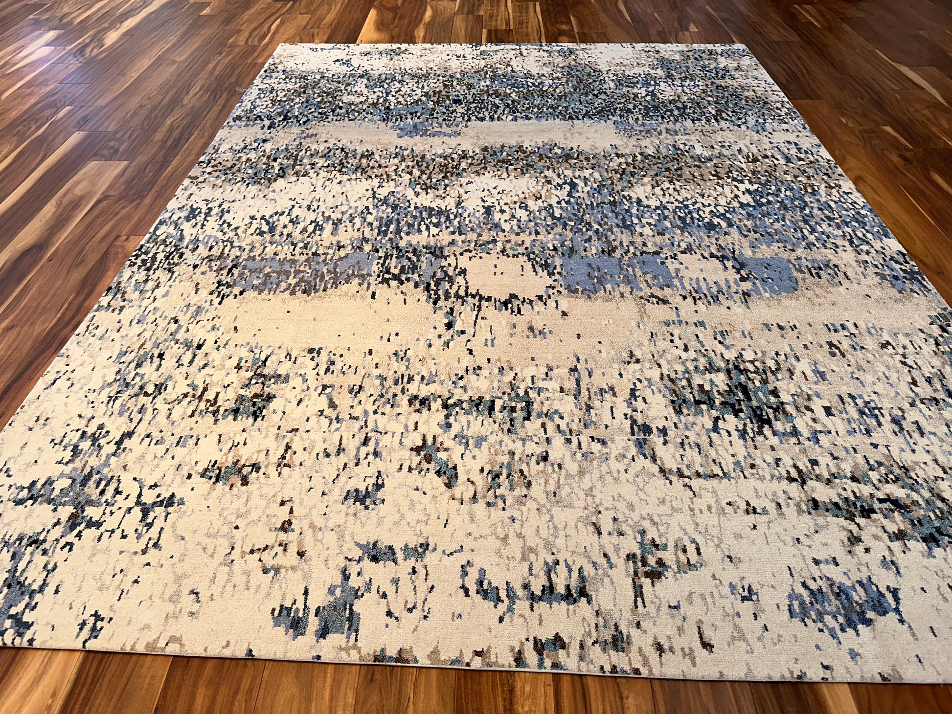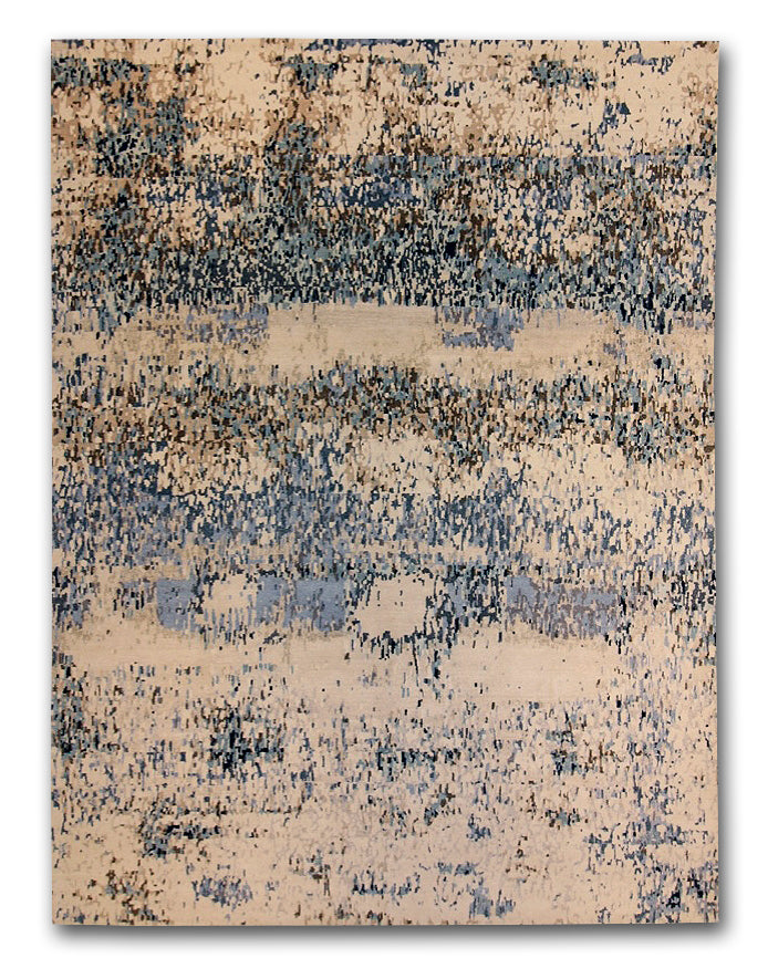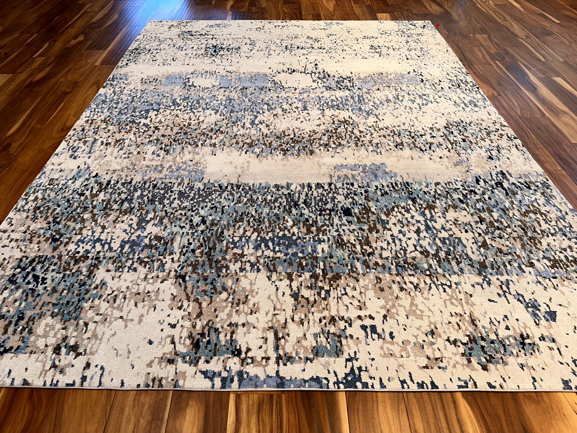 A misty composition of soft neutrals and subdued blue-gray defines this contemporary rug, reminiscent of fading rain on a stone path. Its abstract striations evoke a quiet movement, offering a serene and grounded presence in a space. Perfect for adding subtle visual texture without overpowering the room, this piece brings calm sophistication to both modern and transitional interiors.