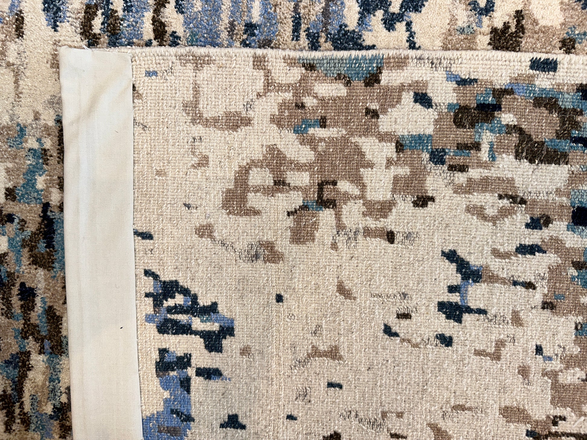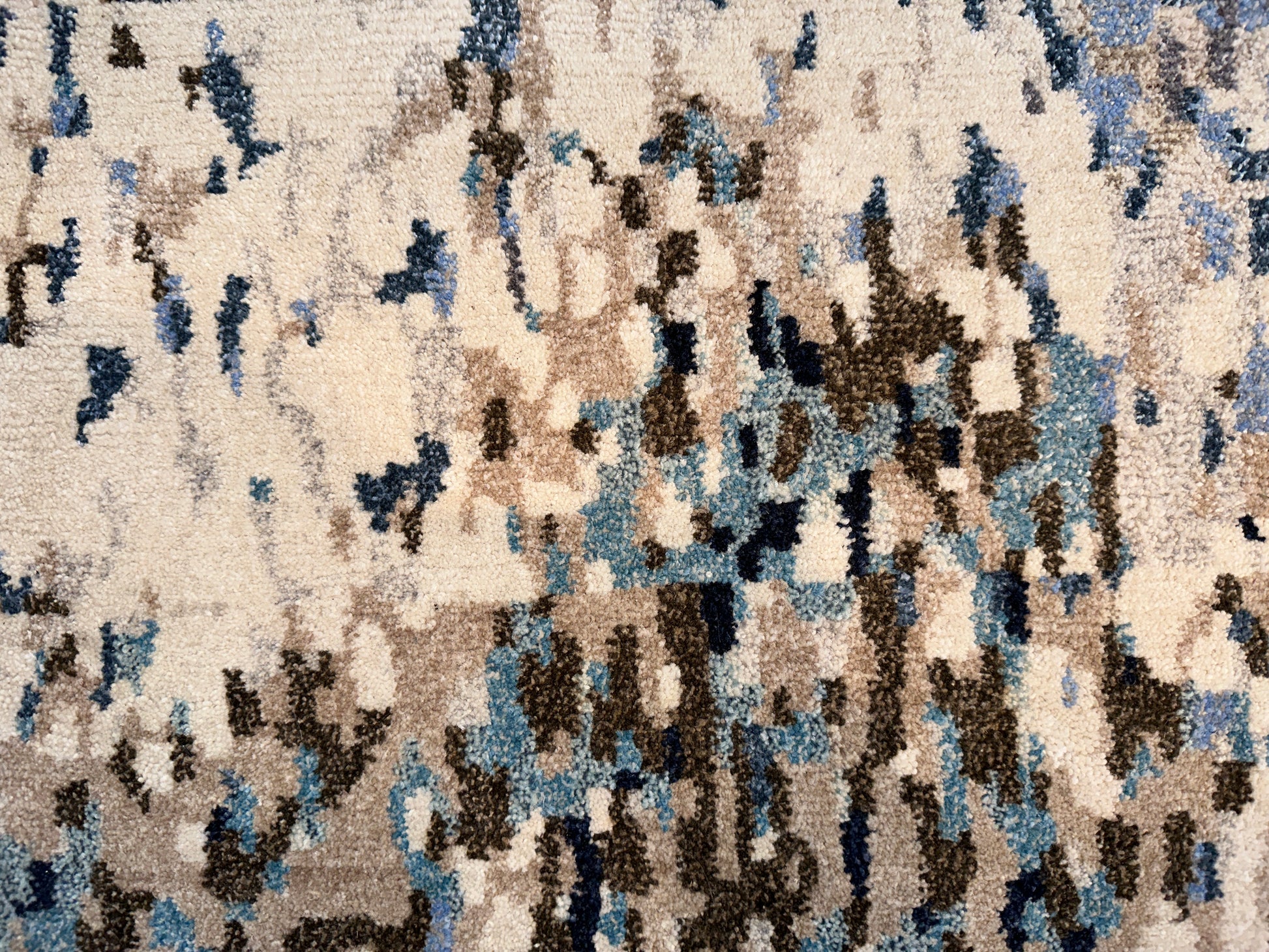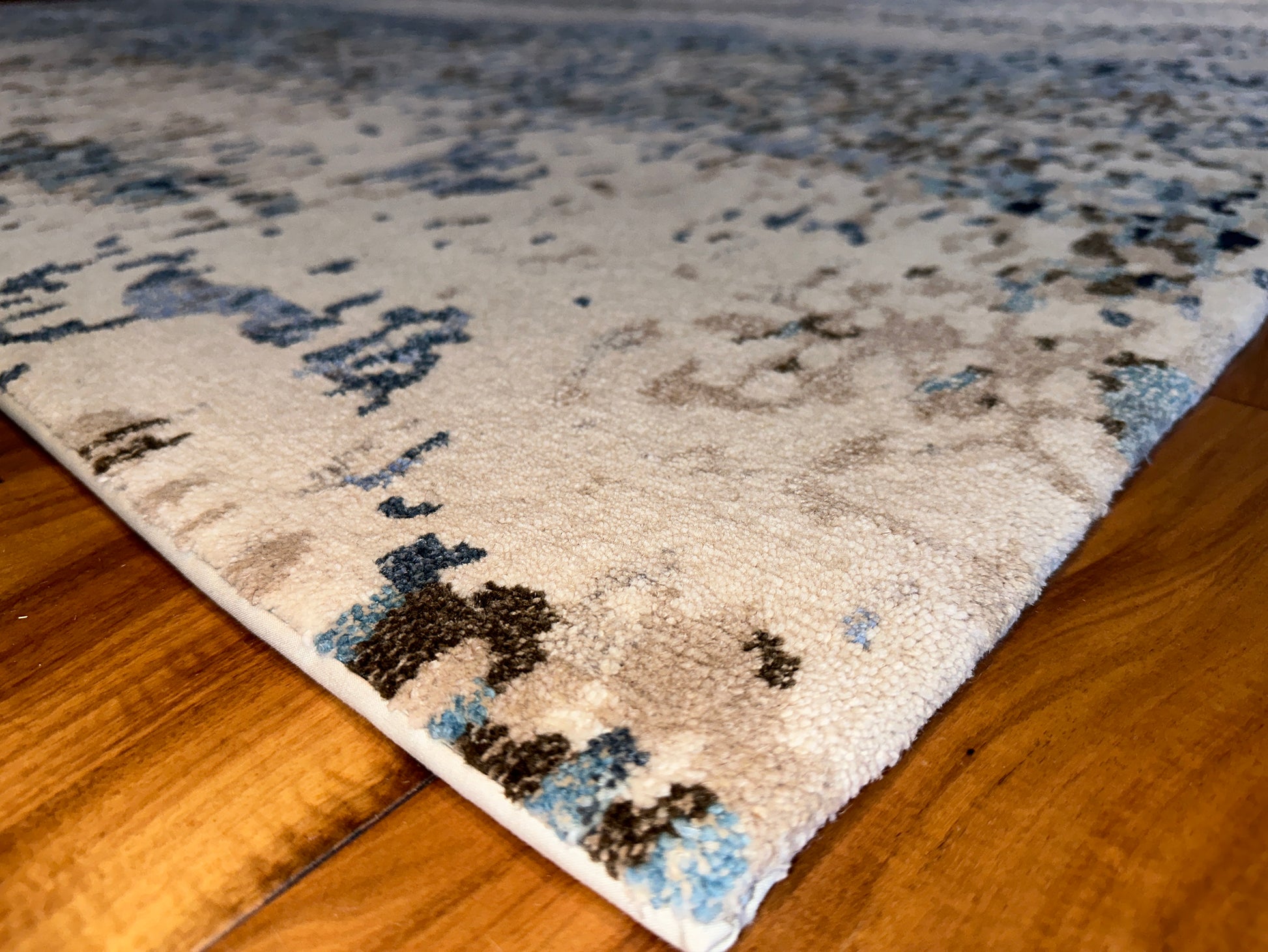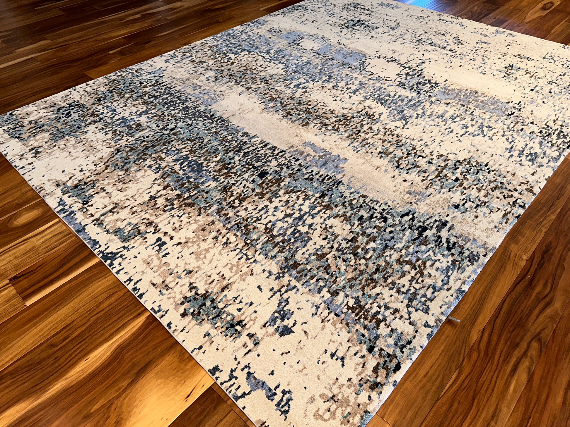A misty composition of soft neutrals and subdued blue-gray defines this contemporary rug, reminiscent of fading rain on a stone path. Its abstract striations evoke a quiet movement, offering a serene and grounded presence in a space. Perfect for adding subtle visual texture without overpowering the room, this piece brings calm sophistication to both modern and transitional interiors.