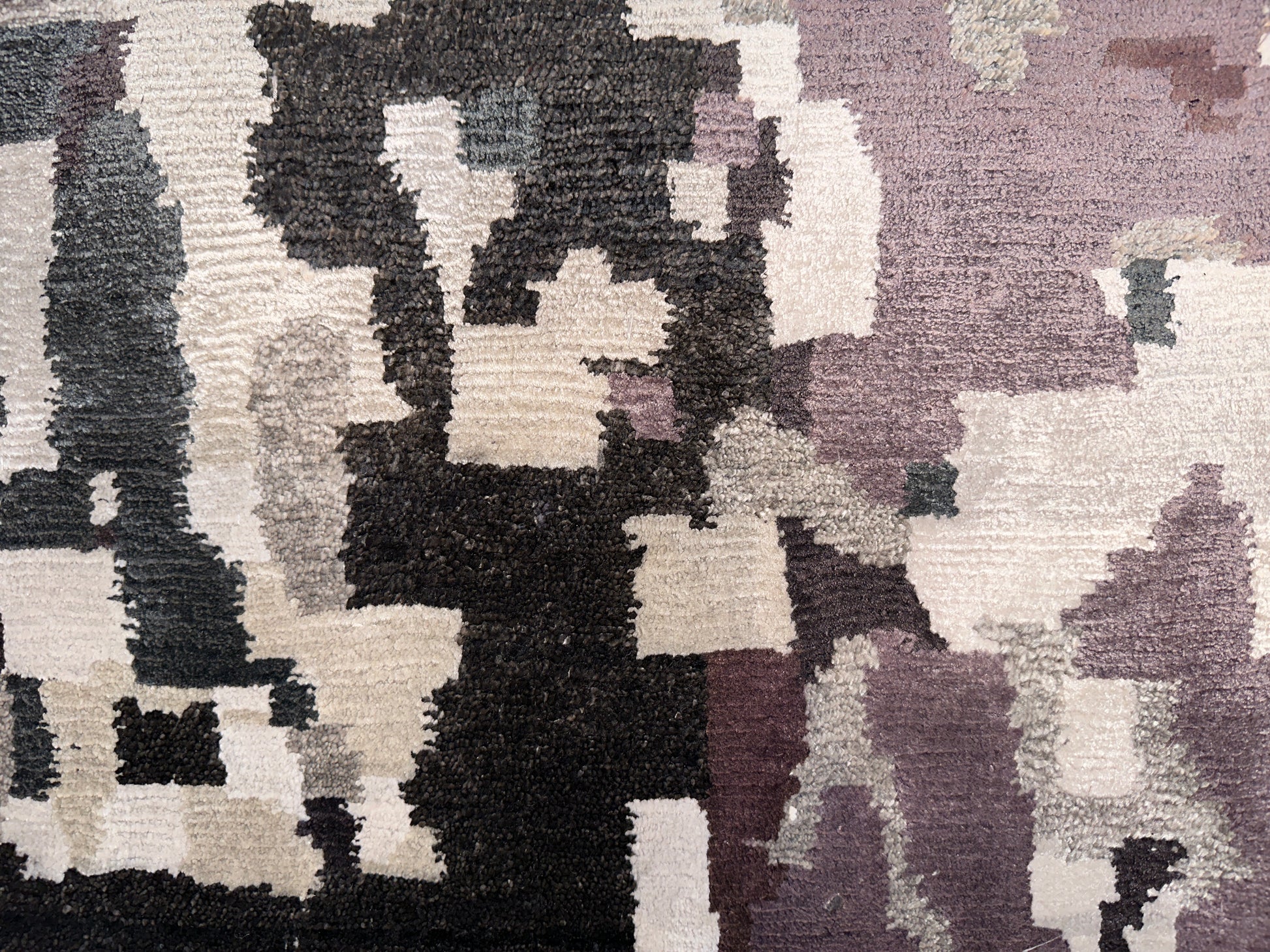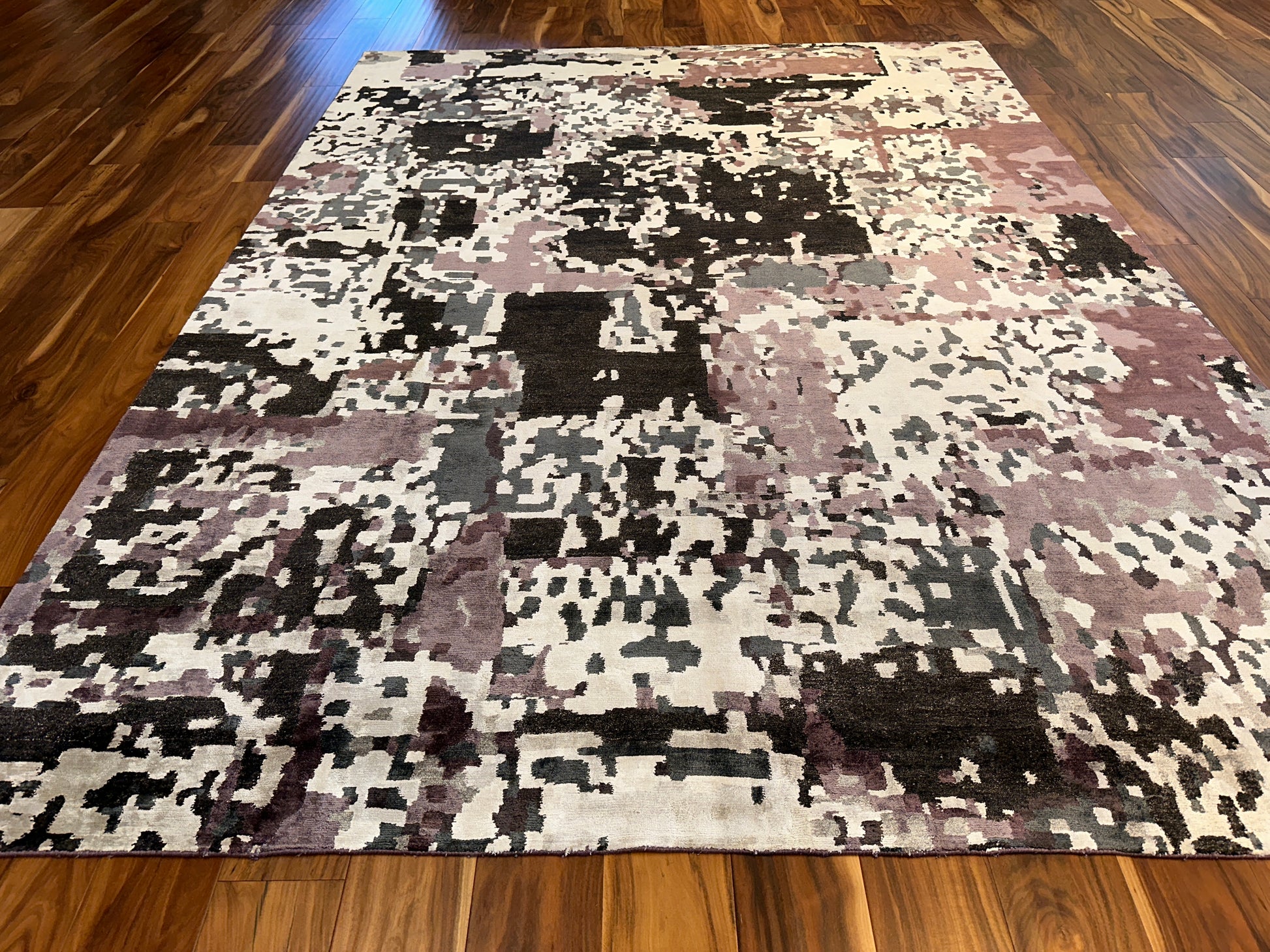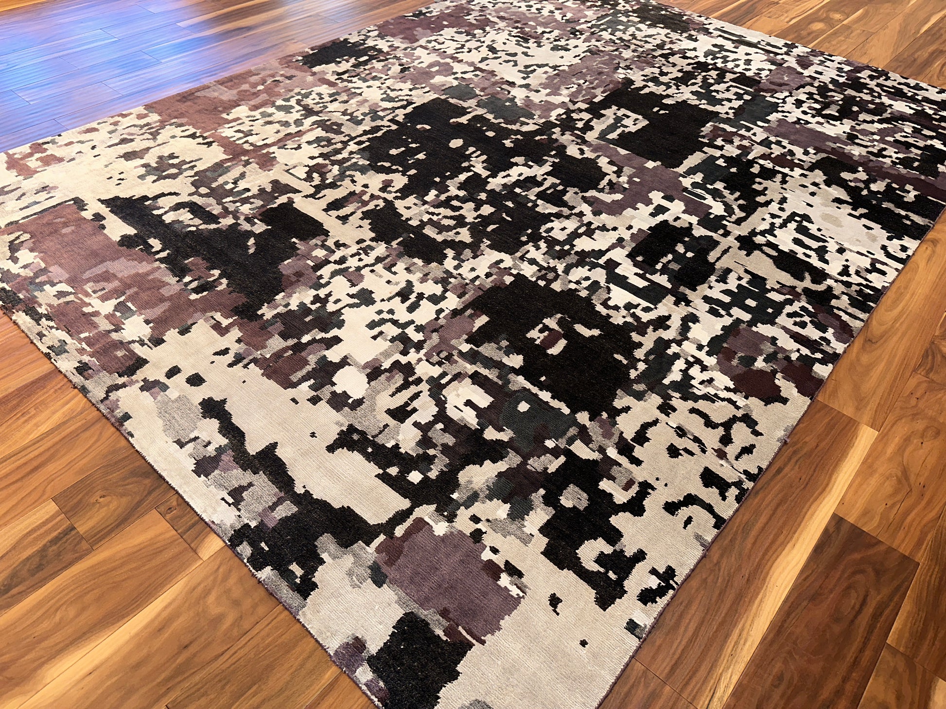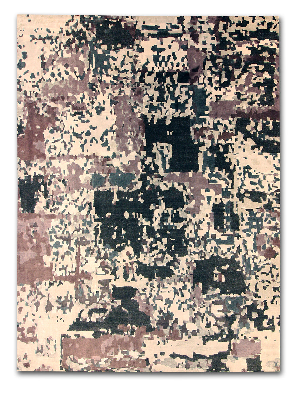 This striking rug carries an abstract, almost pixelated expression, blending warm and cool tones across a creamy base. From a distance, it evokes a softened camouflage or weathered fresco, while up close, it reveals rich layers of charcoal, muted plum, and ivory. It’s a versatile, grounded piece that brings an artistic dimension to modern interiors.