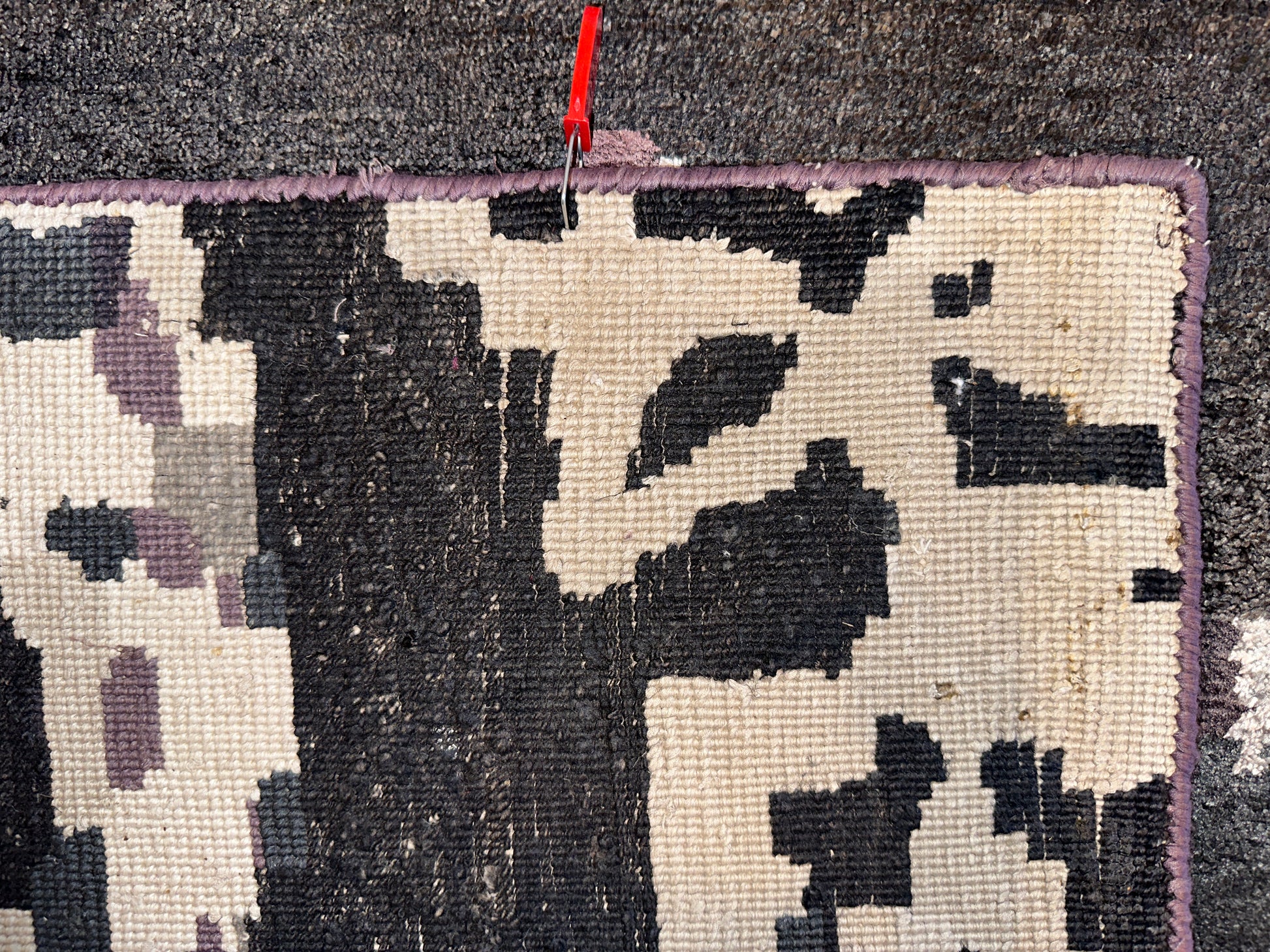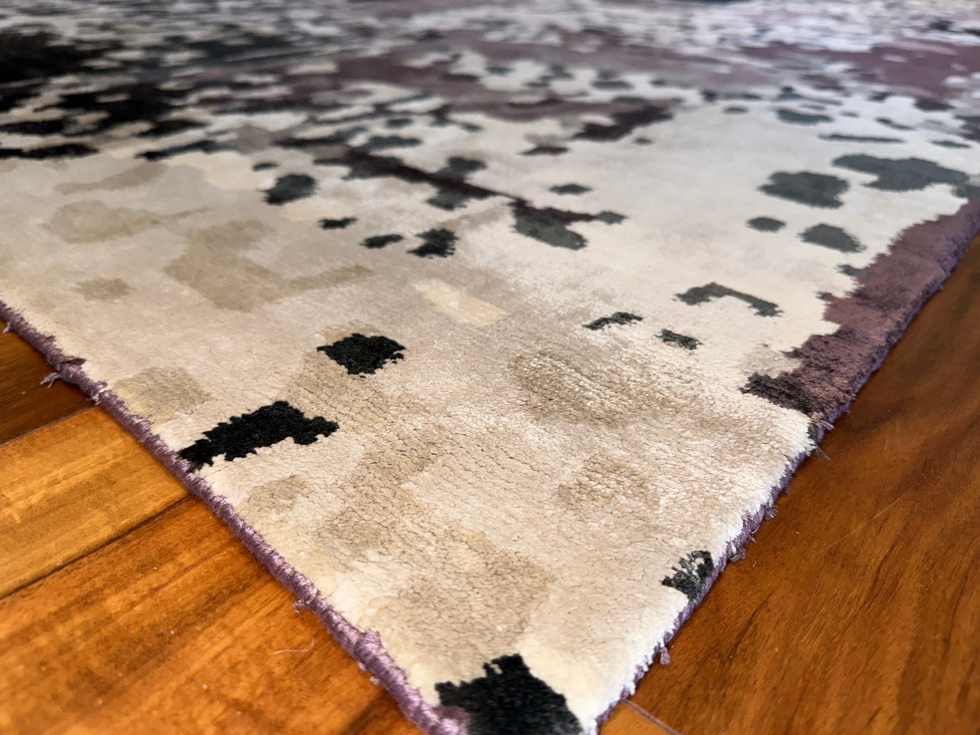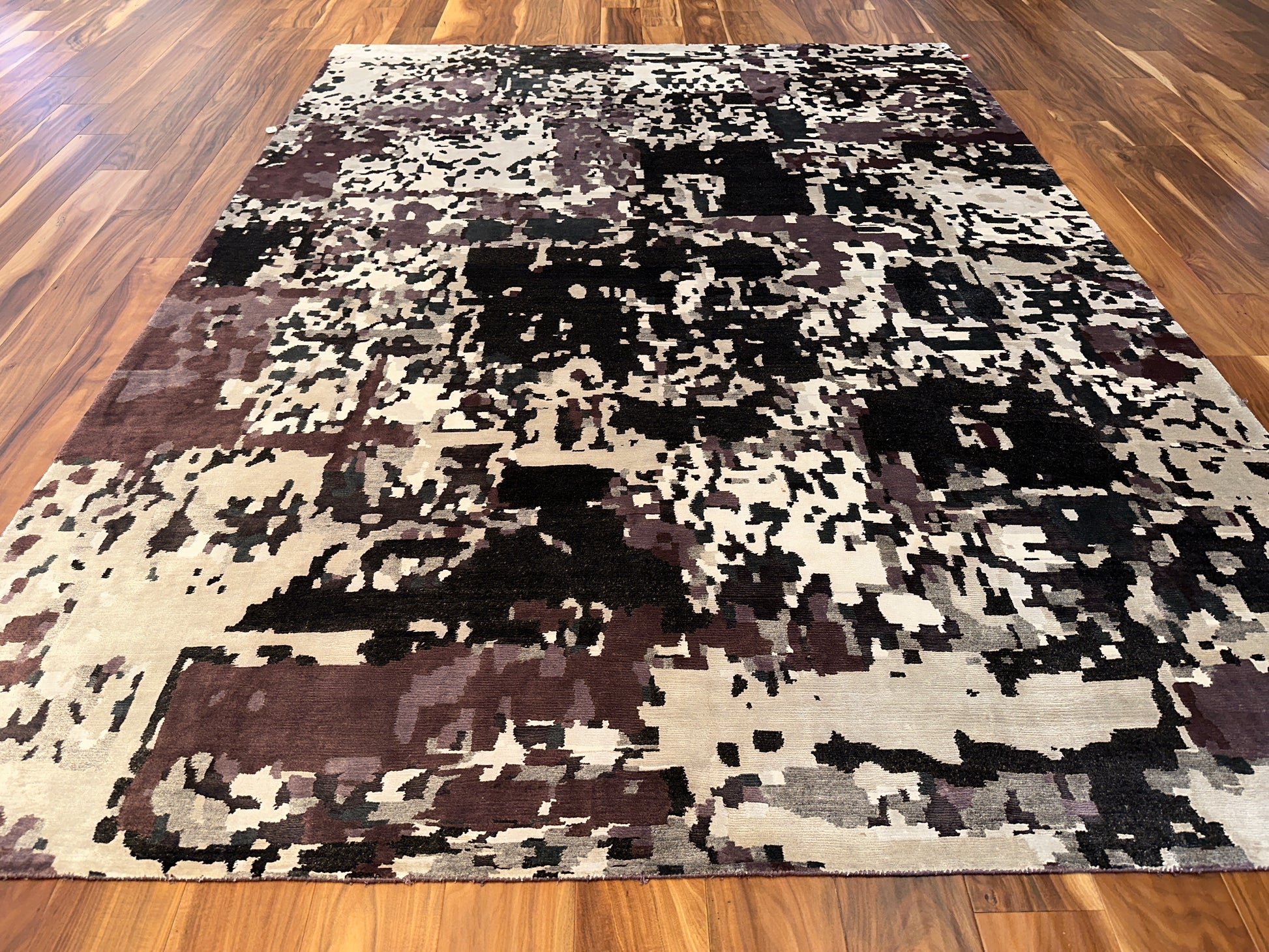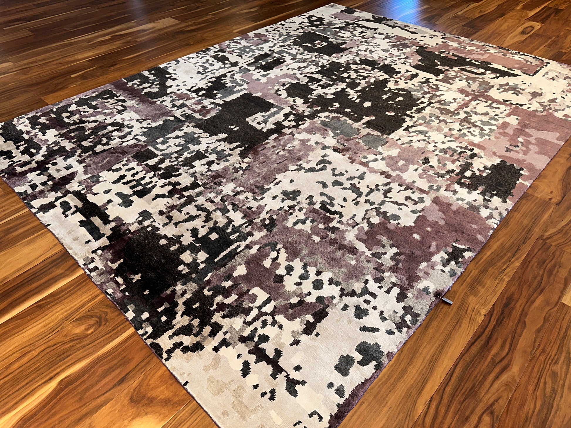 This striking rug carries an abstract, almost pixelated expression, blending warm and cool tones across a creamy base. From a distance, it evokes a softened camouflage or weathered fresco, while up close, it reveals rich layers of charcoal, muted plum, and ivory. It’s a versatile, grounded piece that brings an artistic dimension to modern interiors.