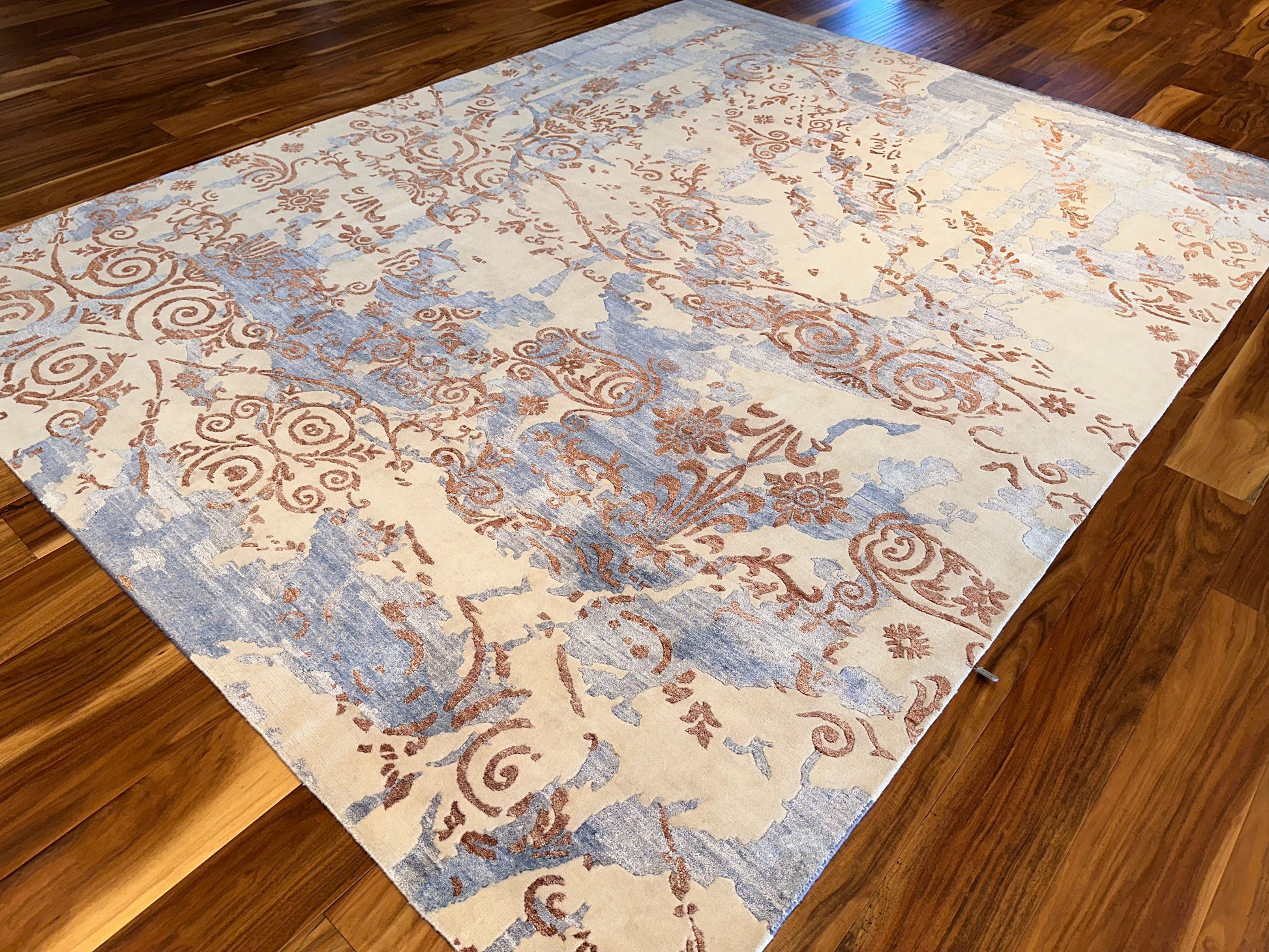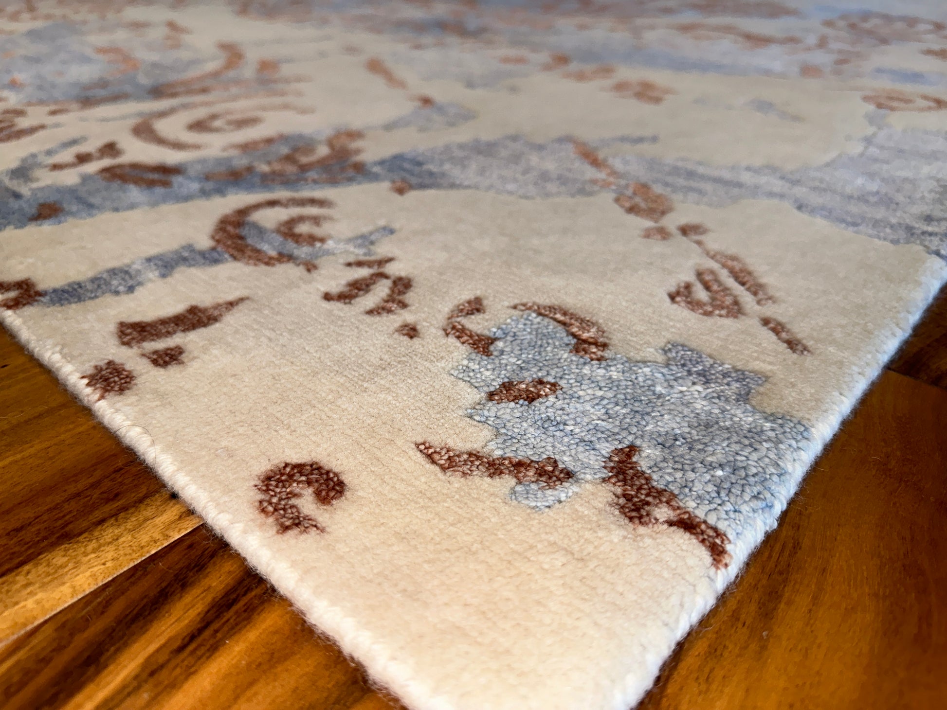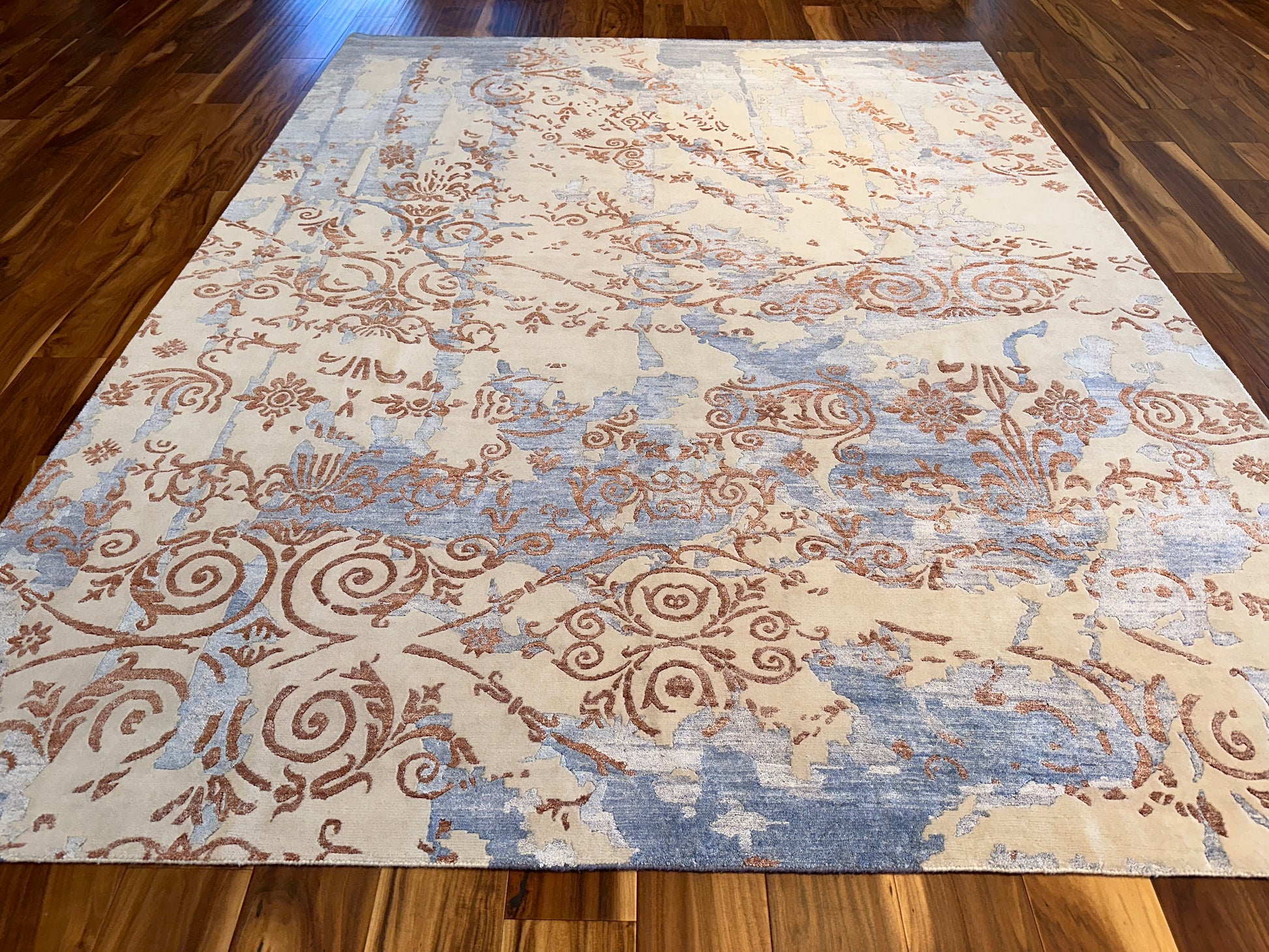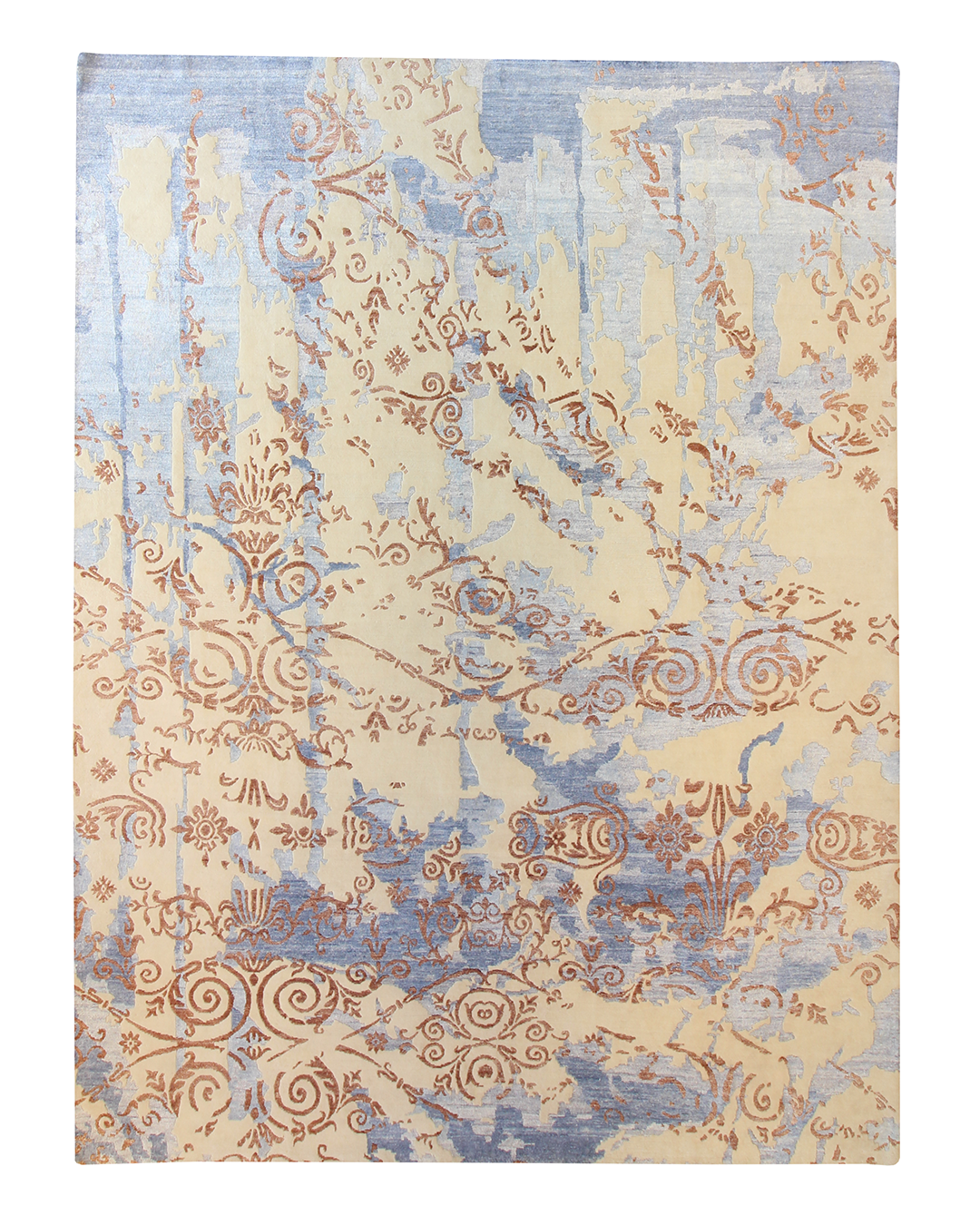 This elegant rug merges classical ornamentation with a contemporary sense of movement, as if antique scrollwork is dissolving into a wash of light. beige and dusty sky blue flow together beneath fine rust-colored motifs, creating a refined and airy composition. The balance of delicacy and depth makes this piece a soft statement in serene spaces.