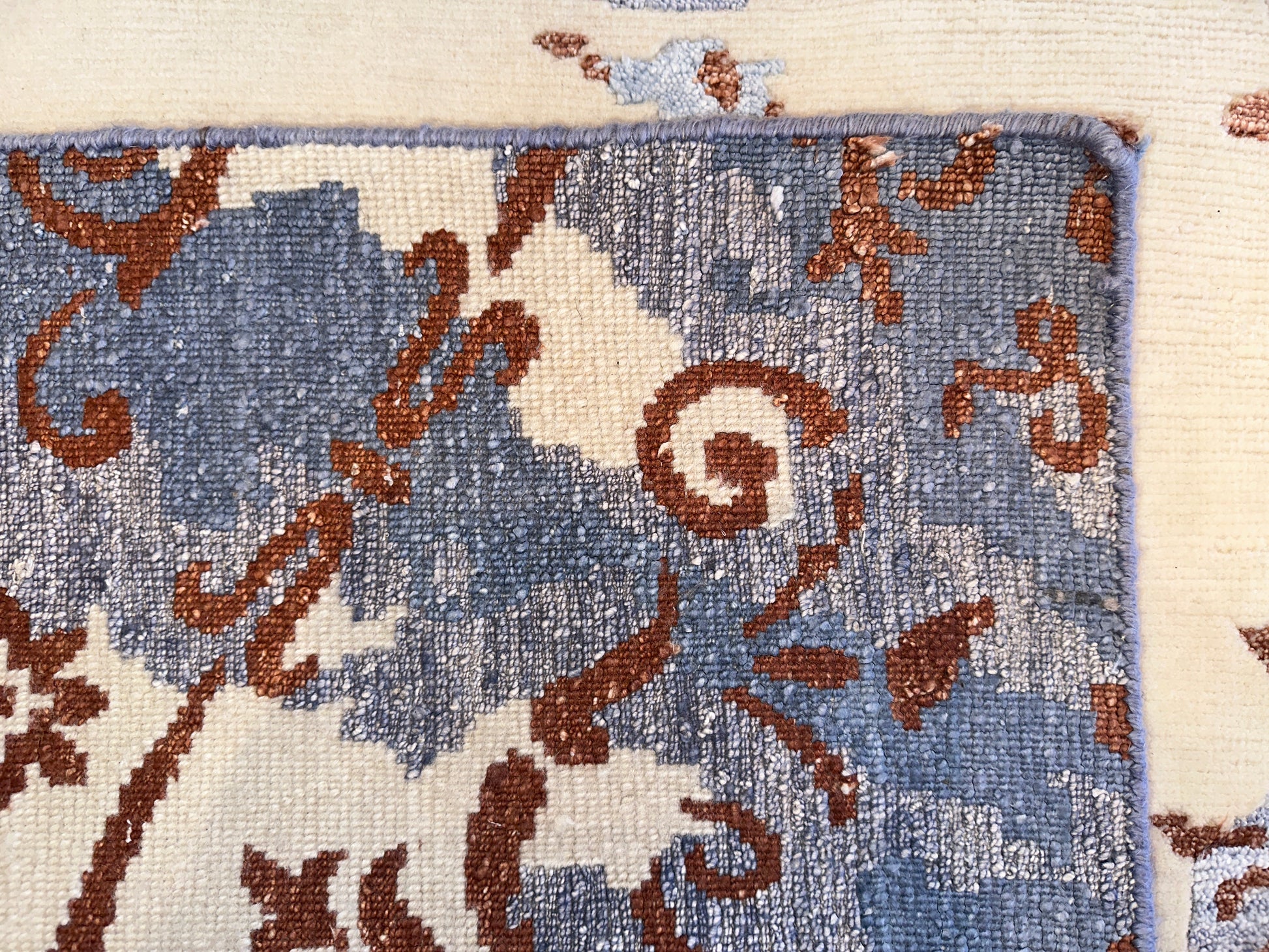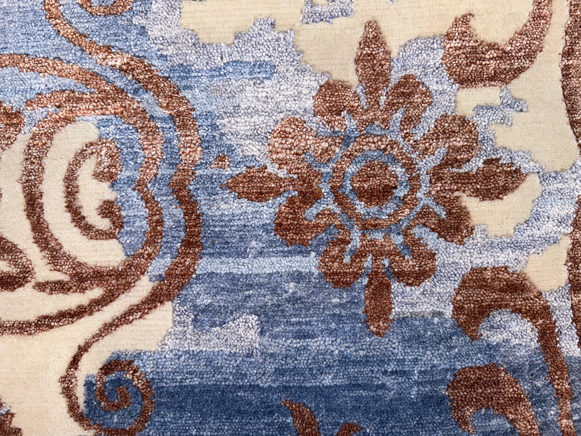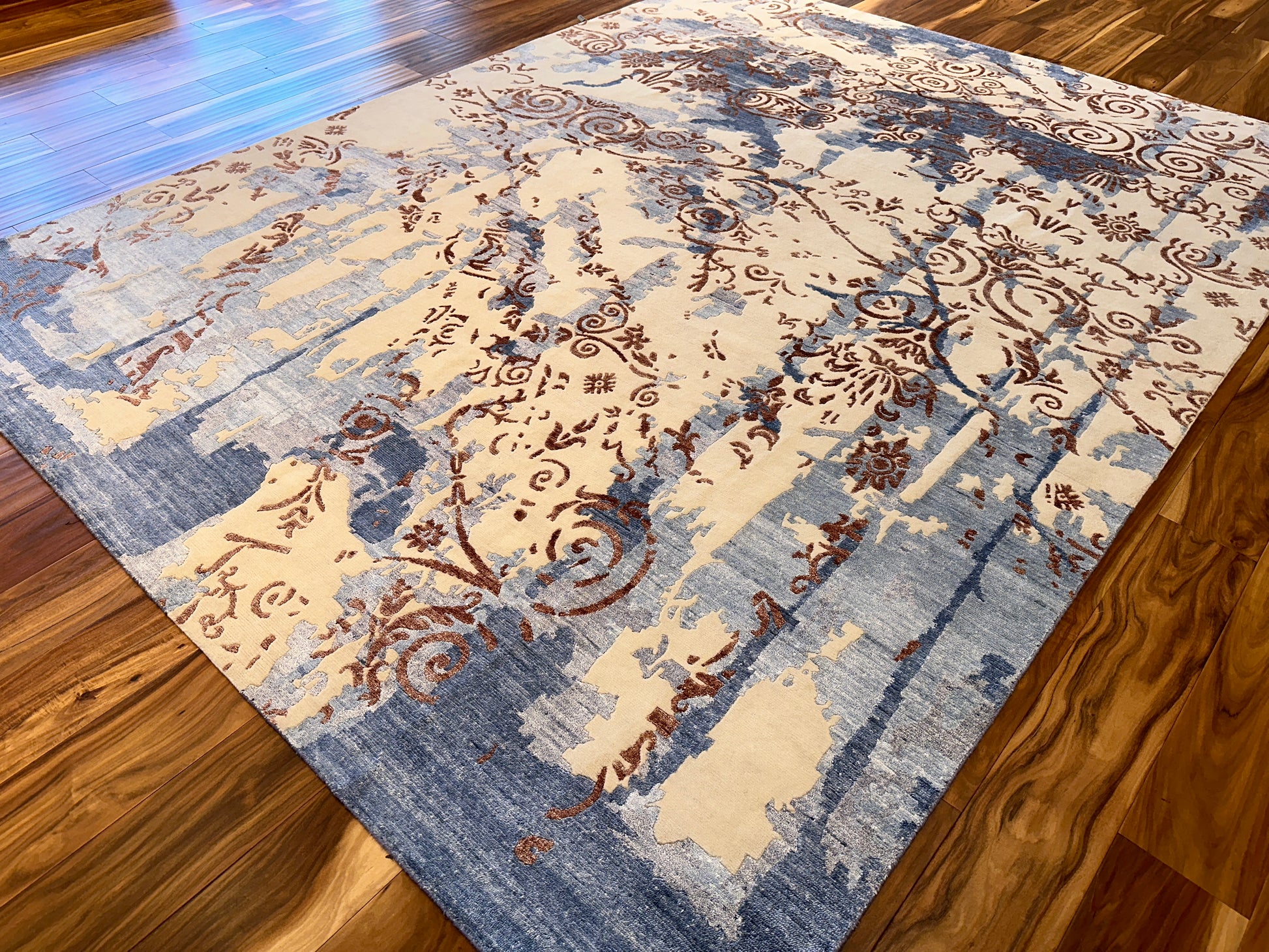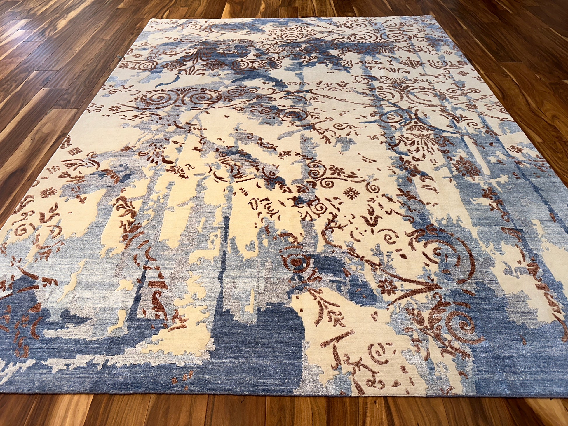 This elegant rug merges classical ornamentation with a contemporary sense of movement, as if antique scrollwork is dissolving into a wash of light. beige and dusty sky blue flow together beneath fine rust-colored motifs, creating a refined and airy composition. The balance of delicacy and depth makes this piece a soft statement in serene spaces.