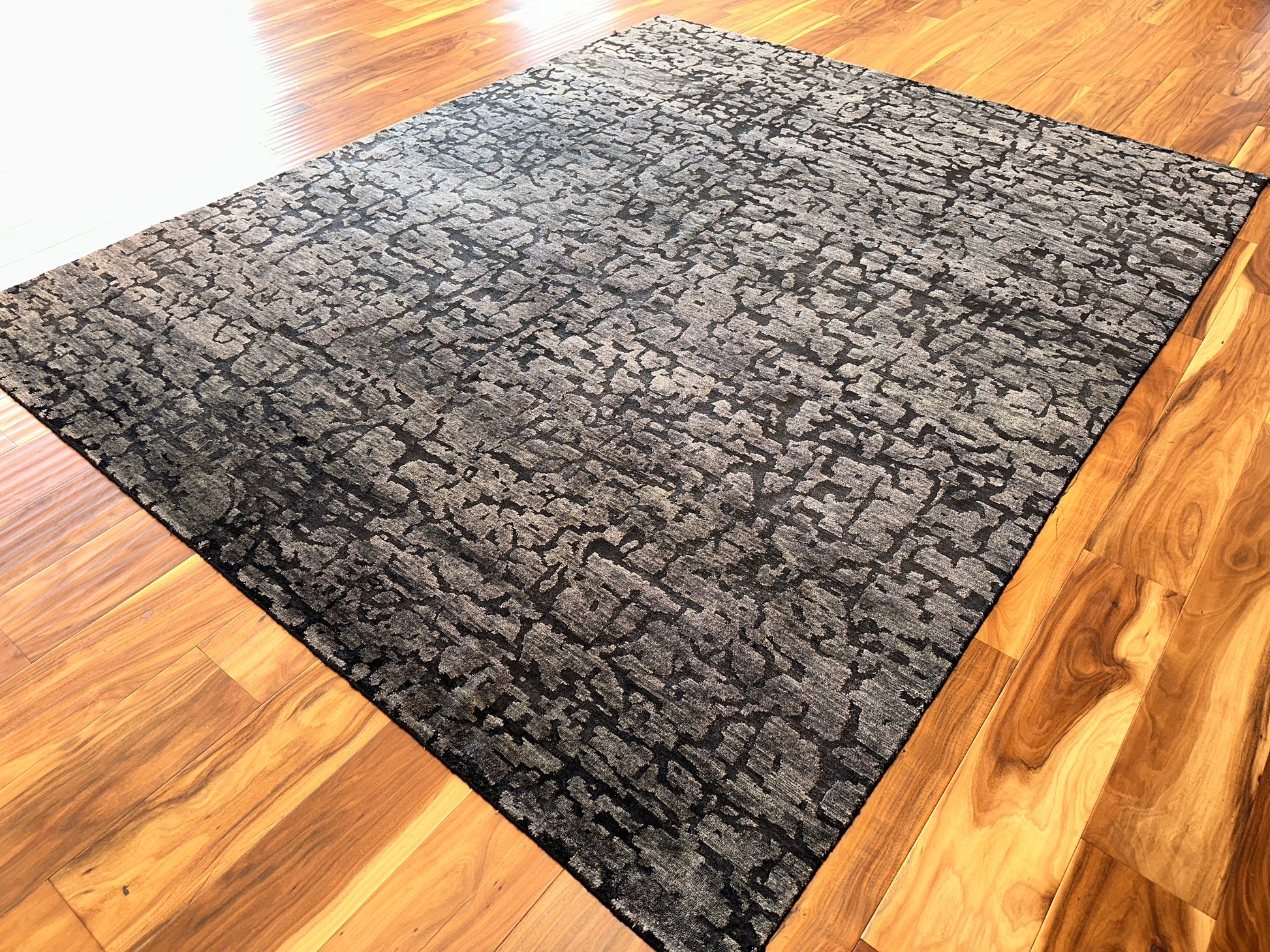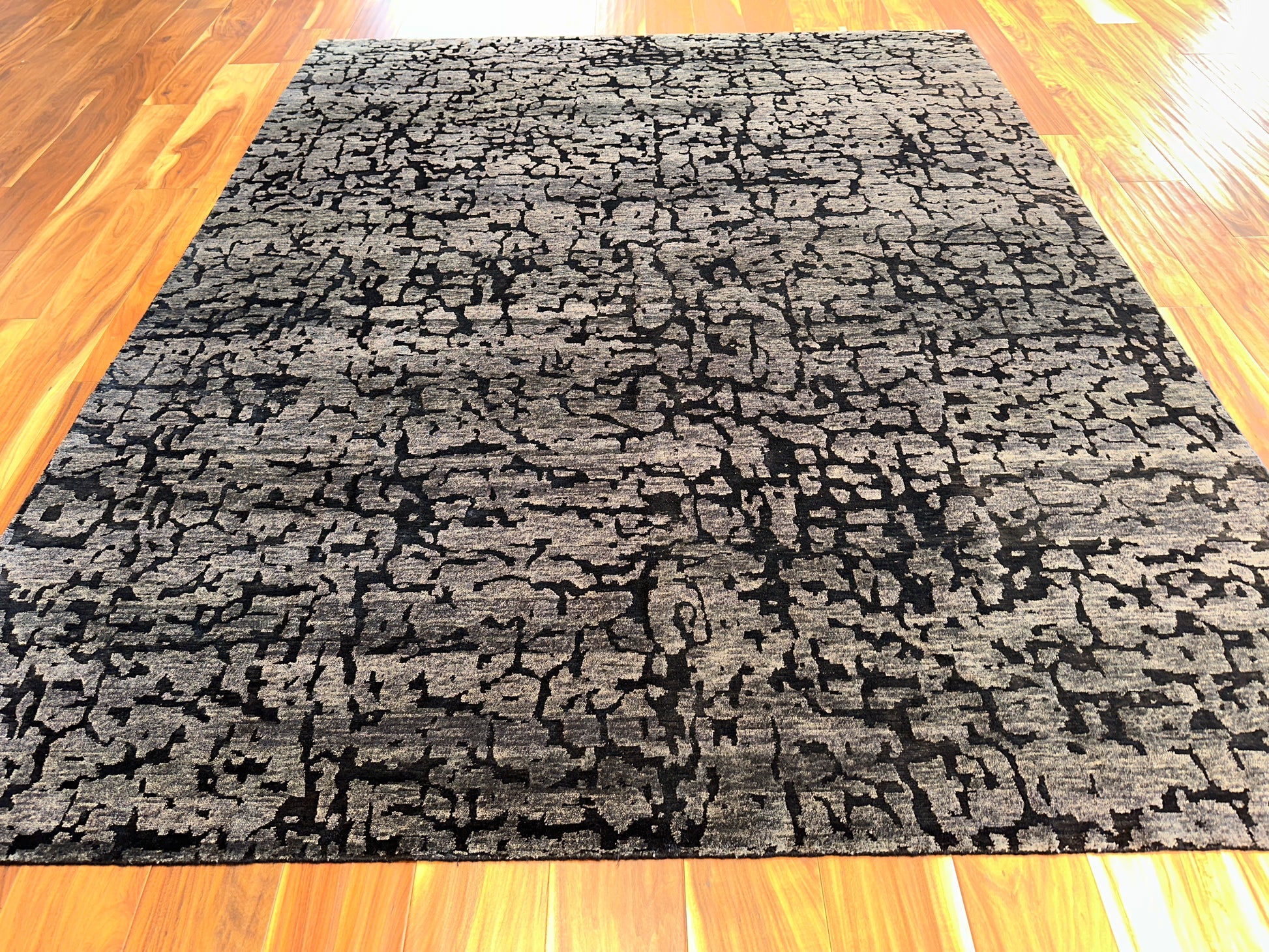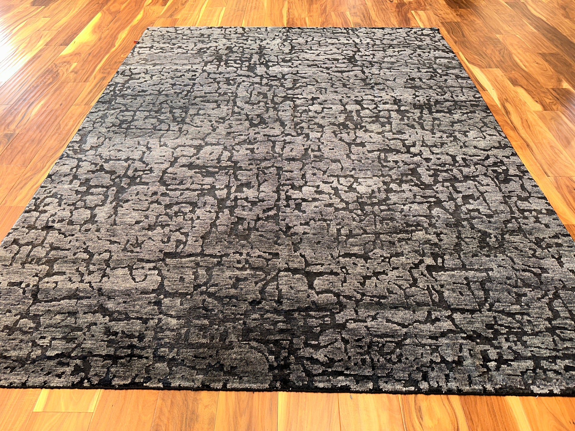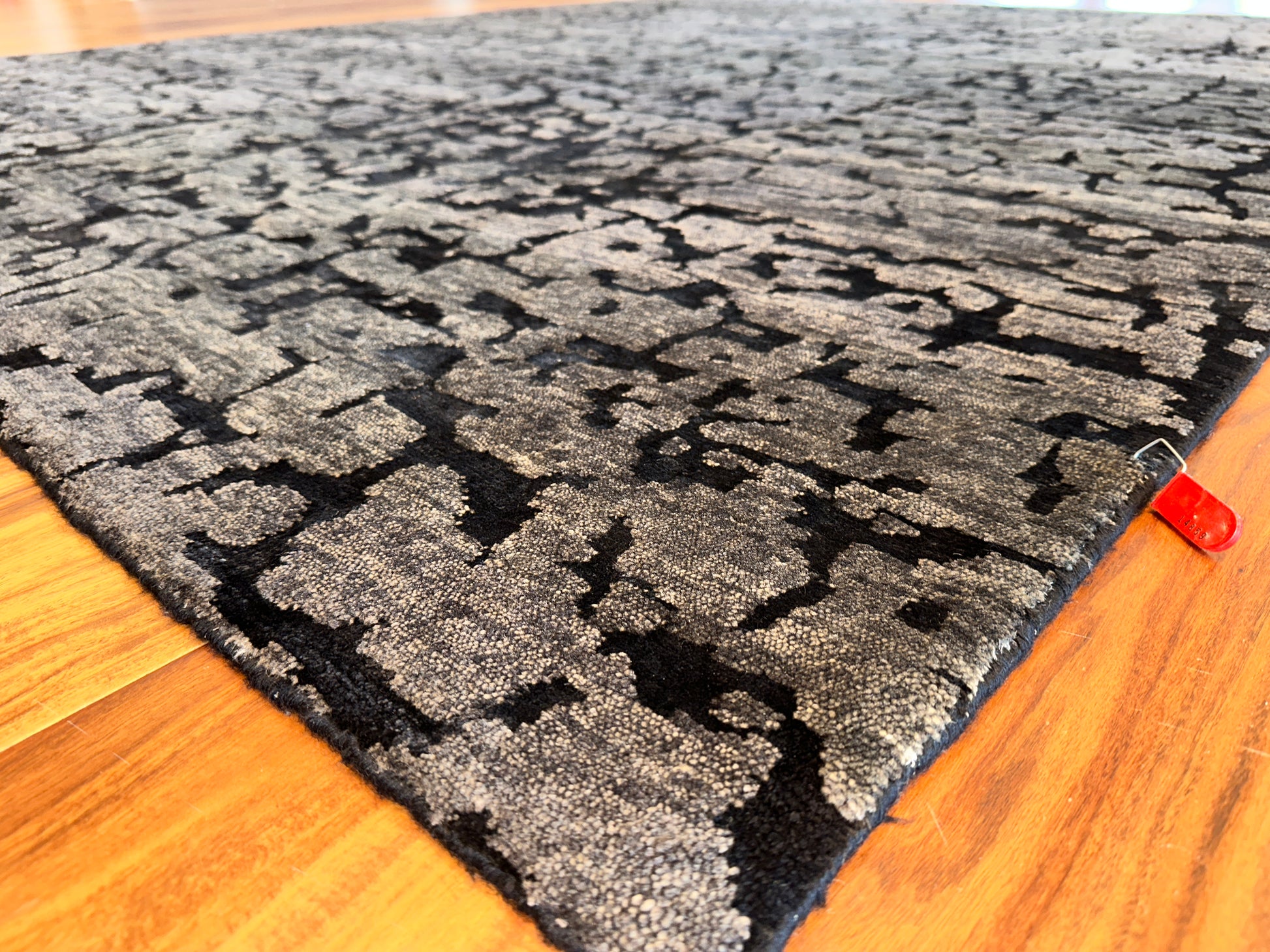 This handwoven rug offers a rich, moody contrast with its deep charcoal ground and a silvery overlay that moves like shadows across stone. The abstract pattern feels bold yet refined, grounding a space with quiet strength. It pairs beautifully with minimalist interiors or rooms that call for a dark, dramatic anchor.