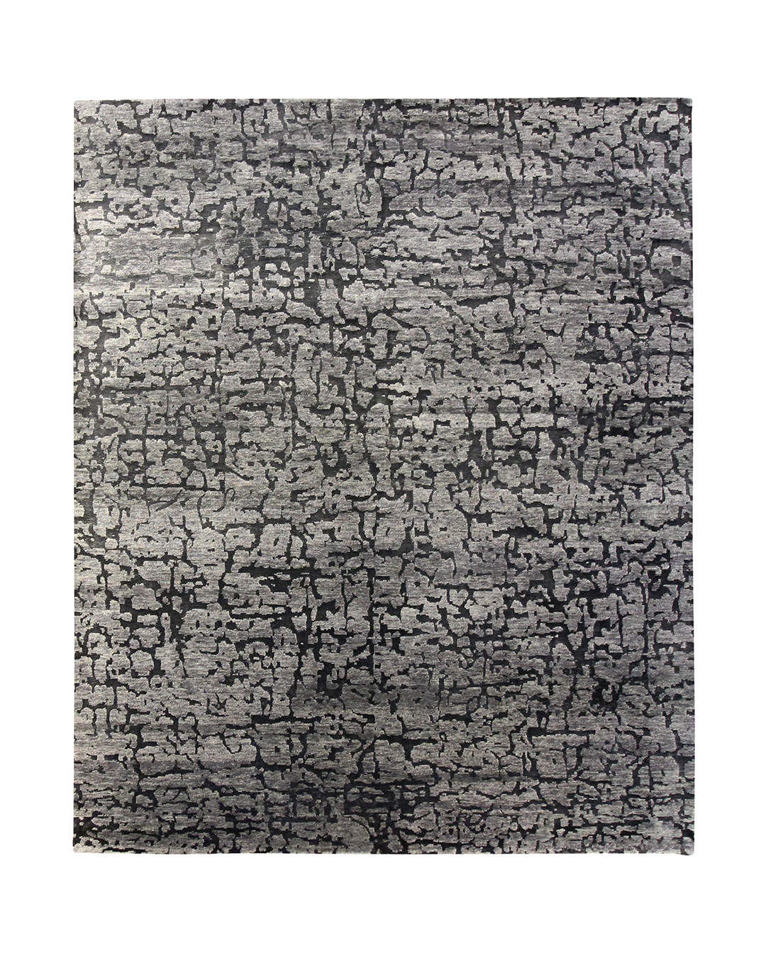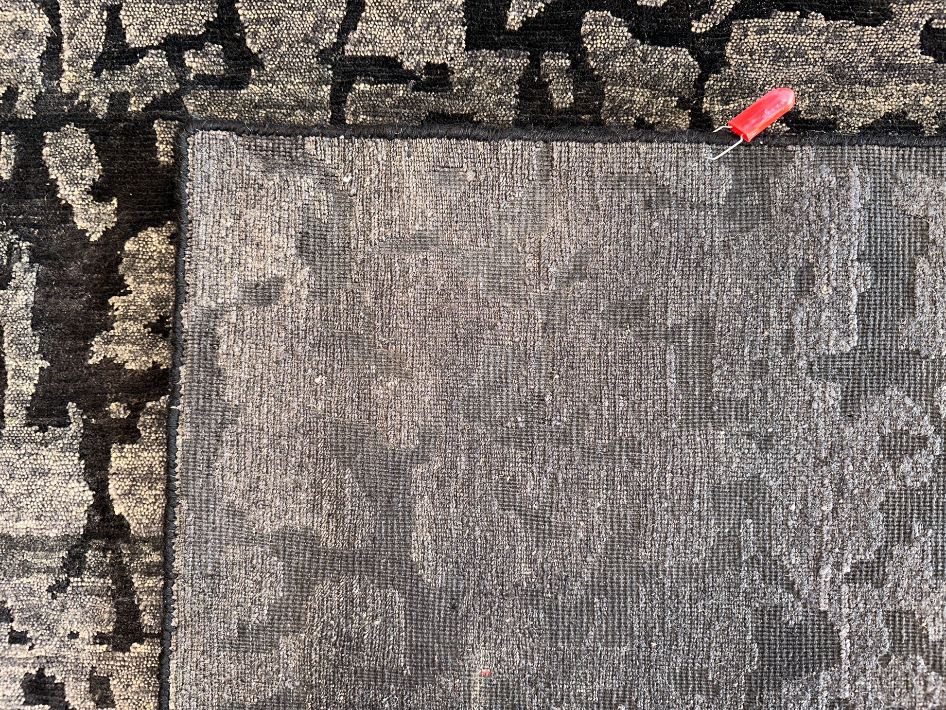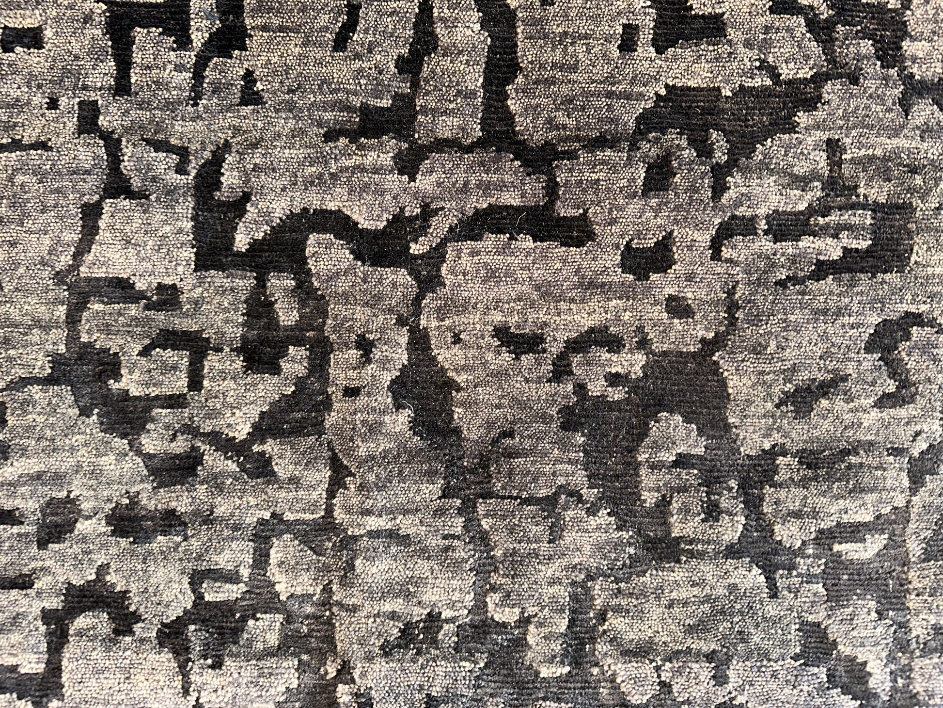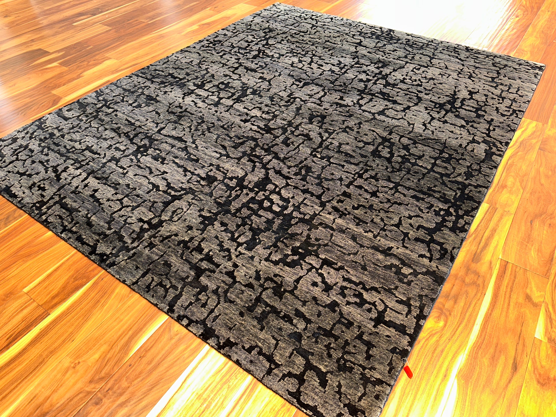 This handwoven rug offers a rich, moody contrast with its deep charcoal ground and a silvery overlay that moves like shadows across stone. The abstract pattern feels bold yet refined, grounding a space with quiet strength. It pairs beautifully with minimalist interiors or rooms that call for a dark, dramatic anchor.