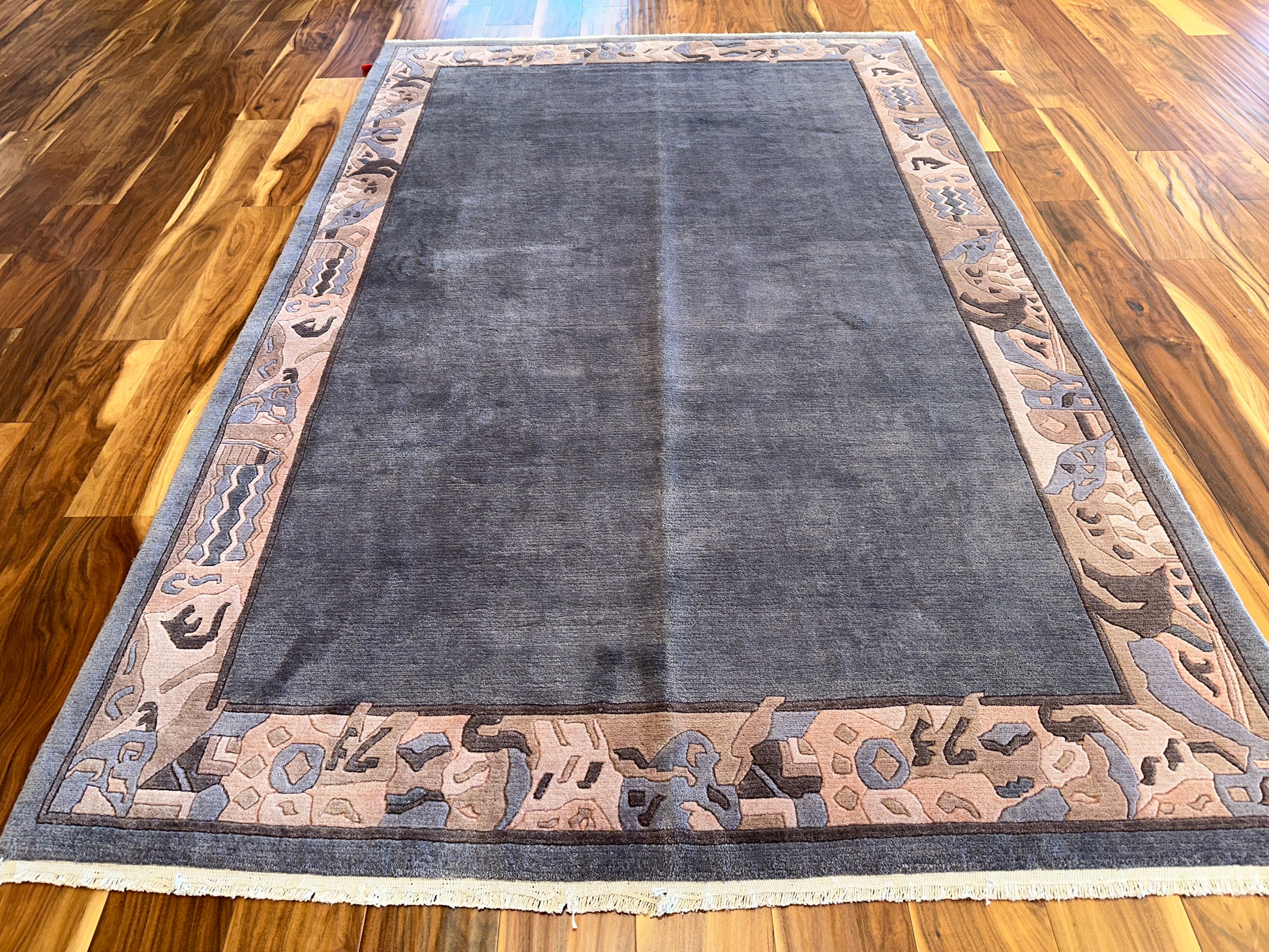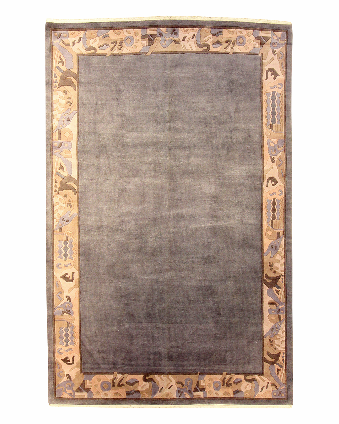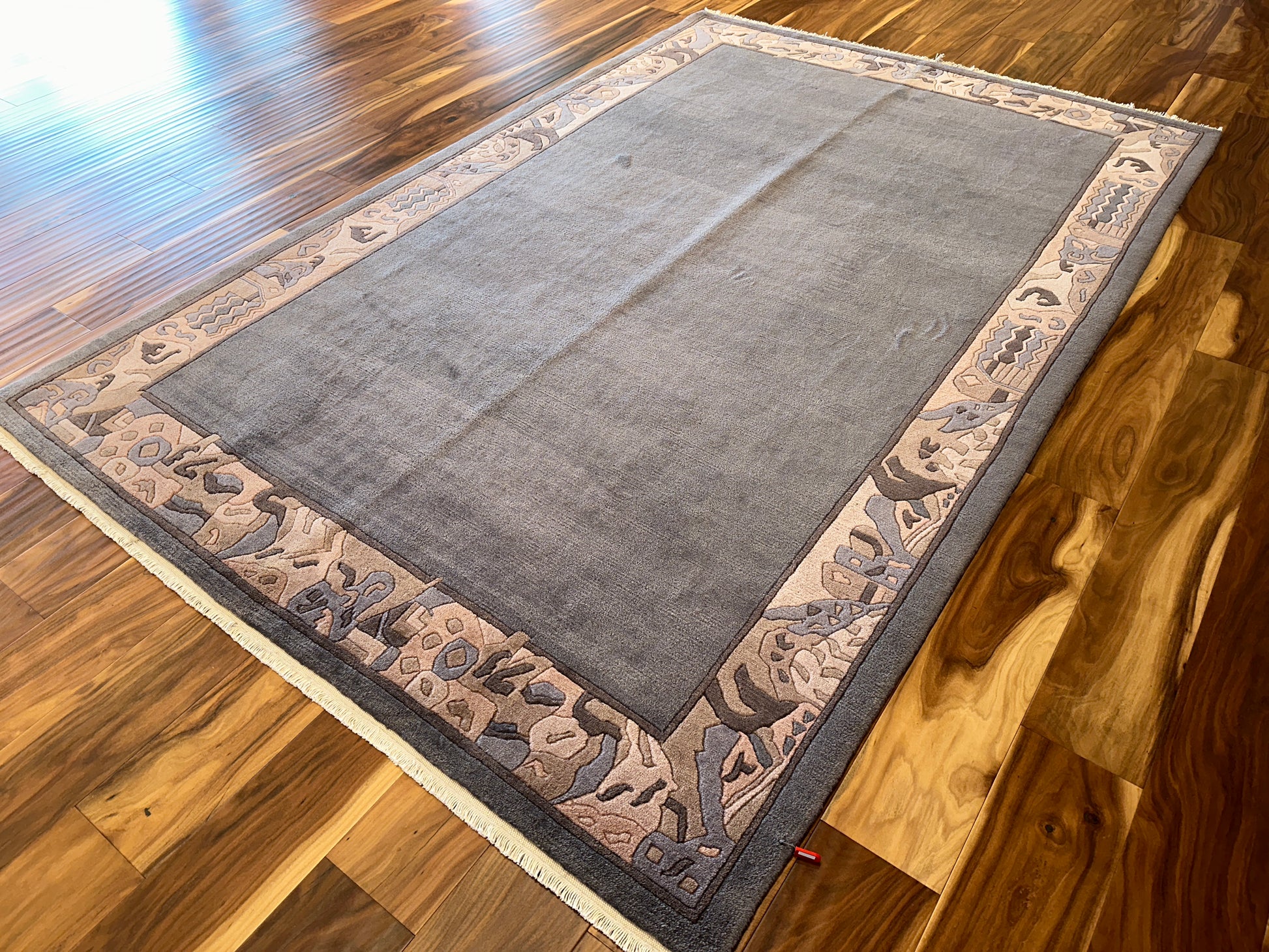 Soft and refined, this handwoven rug pairs a smoky gray field with a lively, decorative border in muted gold, mauve, and slate blue. The contrast between the understated center and the whimsical edge brings quiet sophistication, ideal for anchoring serene and stylish interiors.