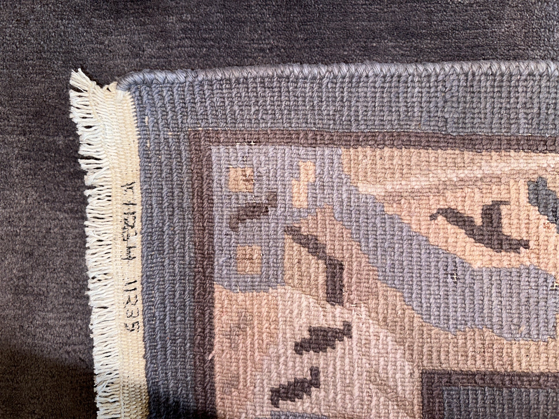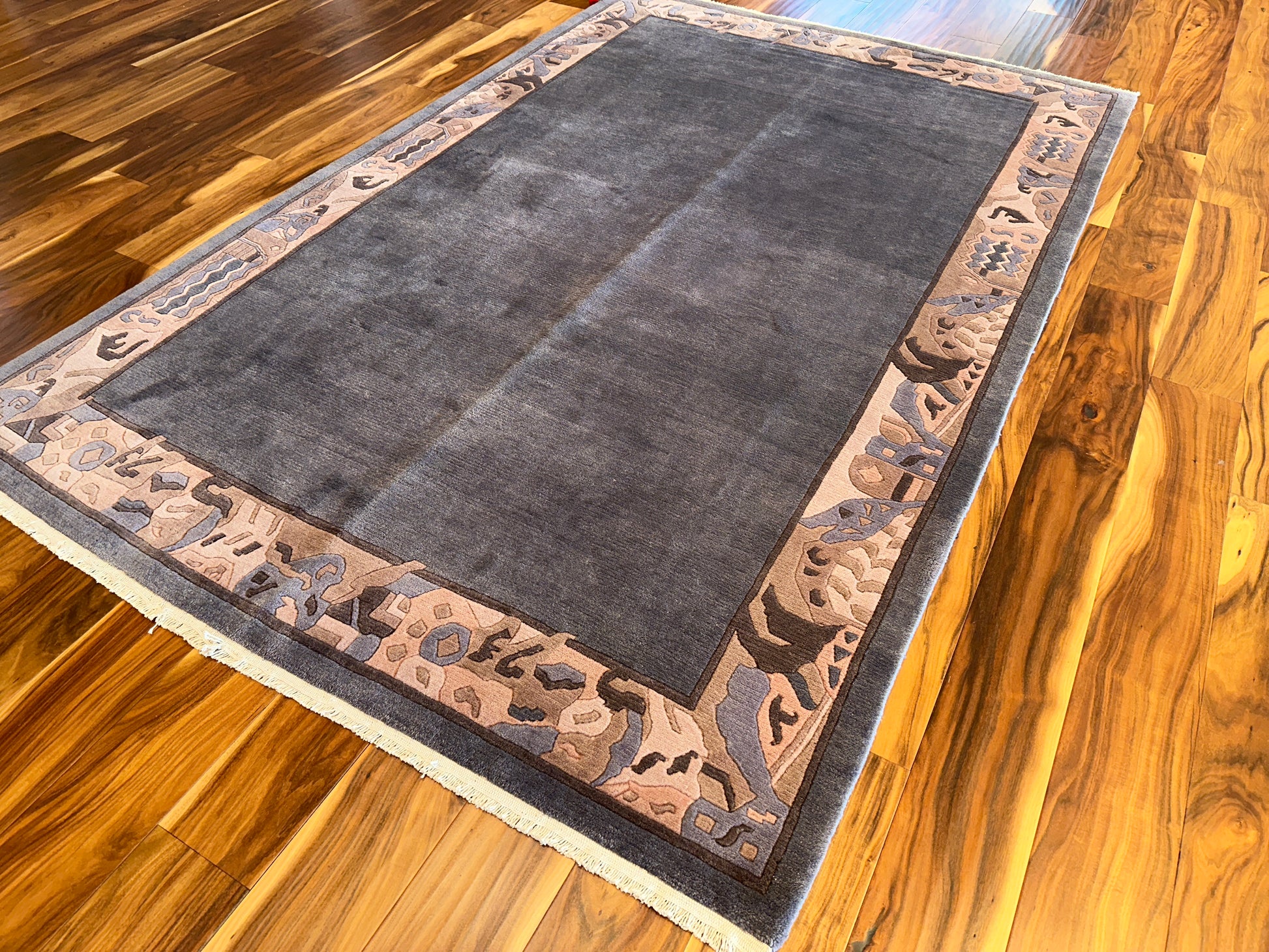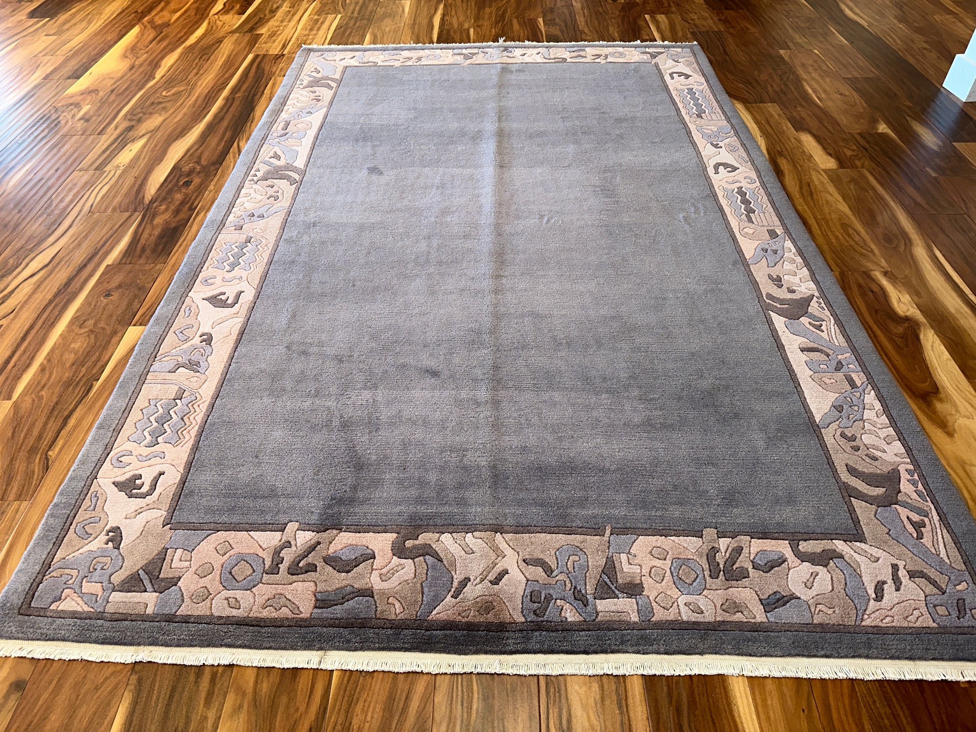 Soft and refined, this handwoven rug pairs a smoky gray field with a lively, decorative border in muted gold, mauve, and slate blue. The contrast between the understated center and the whimsical edge brings quiet sophistication, ideal for anchoring serene and stylish interiors.