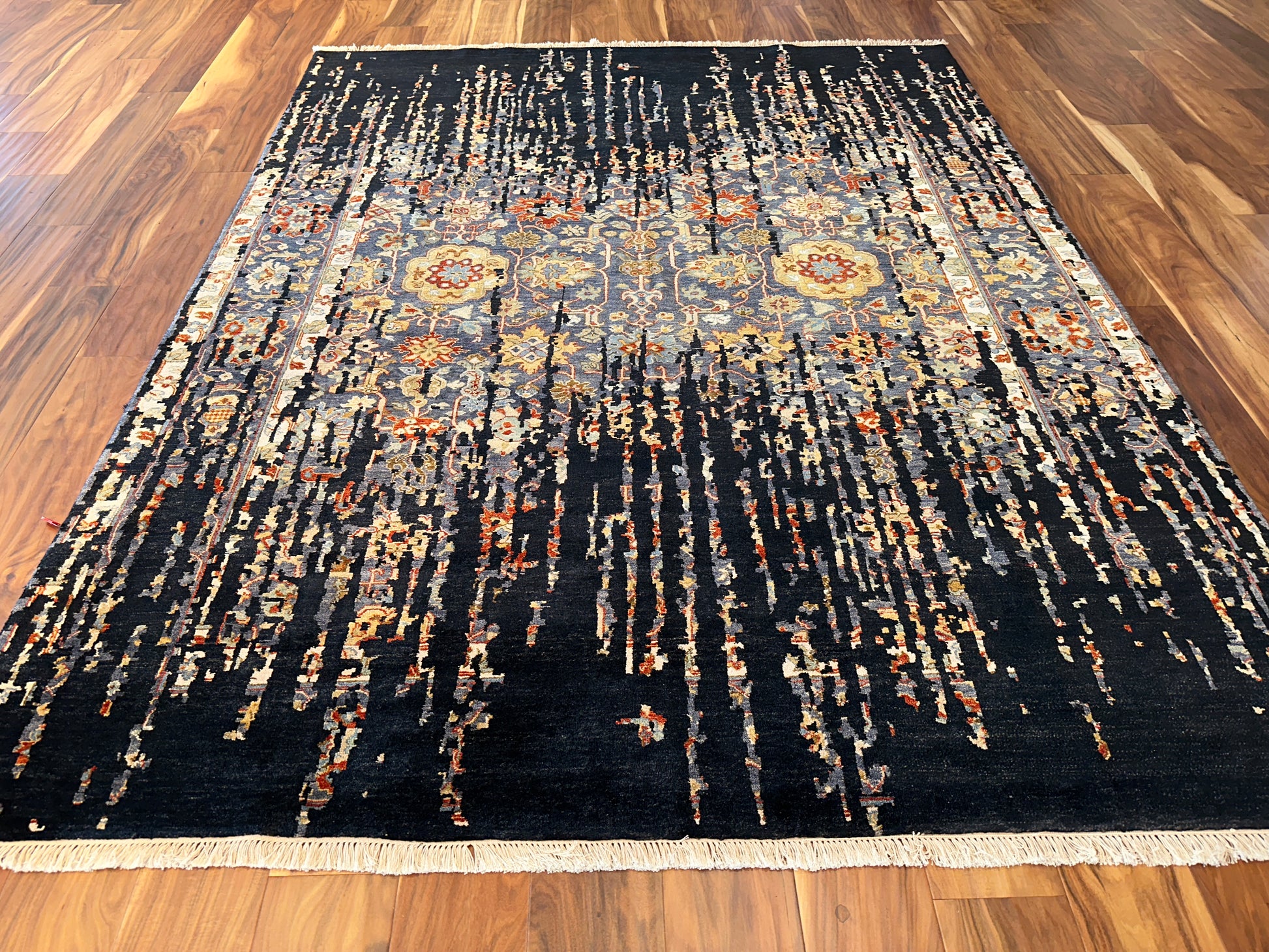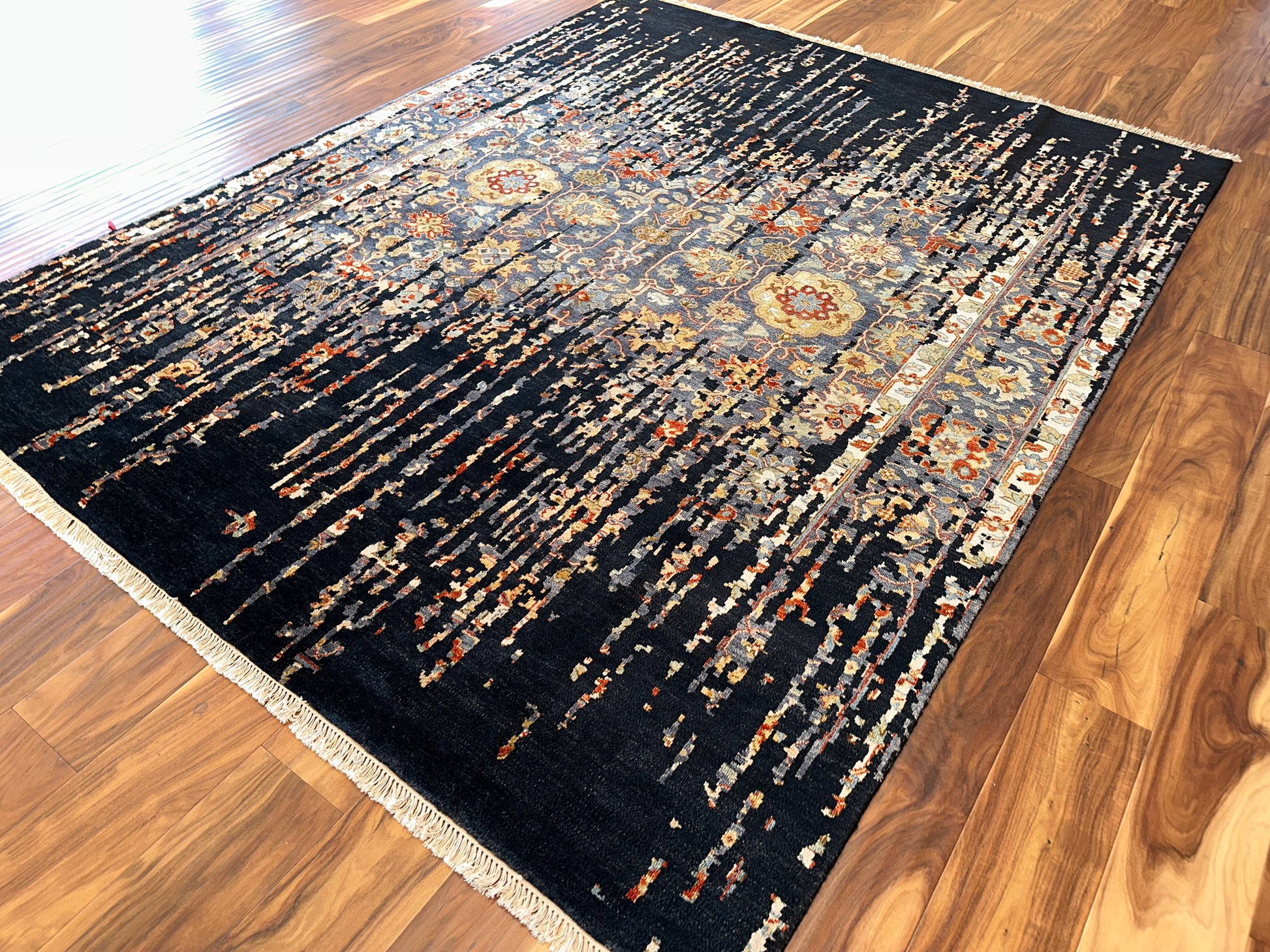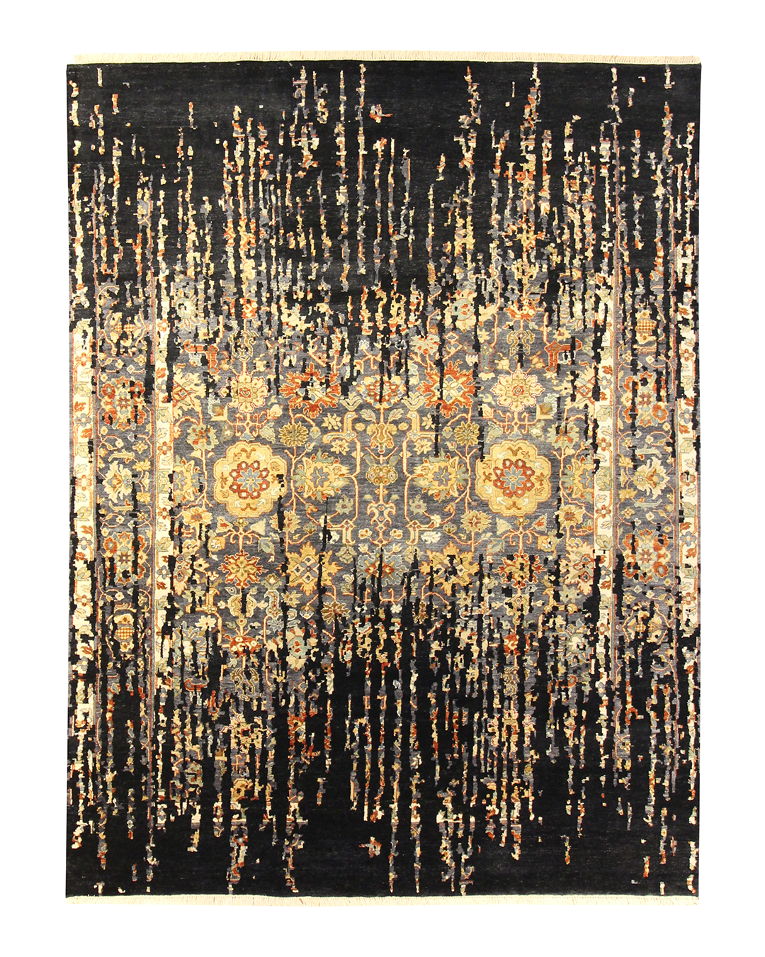 This handwoven rug brings together the elegance of tradition and the boldness of abstraction. At its heart lies a delicate floral pattern in warm gold, soft blue, and amber—partly obscured by cascading threads of deep black that seem to drip from the sky. The effect is both dramatic and poetic, like a memory surfacing through shadow.