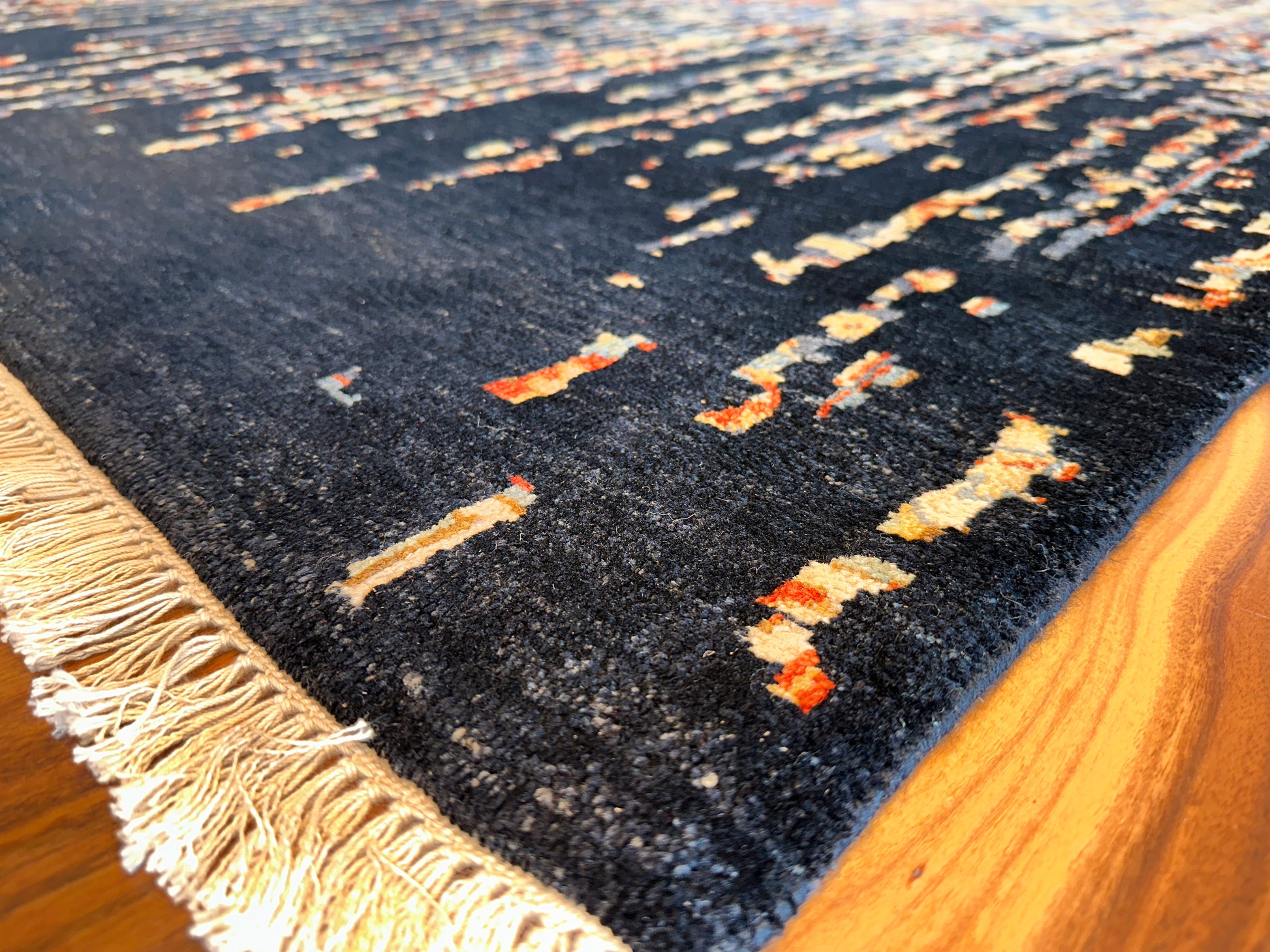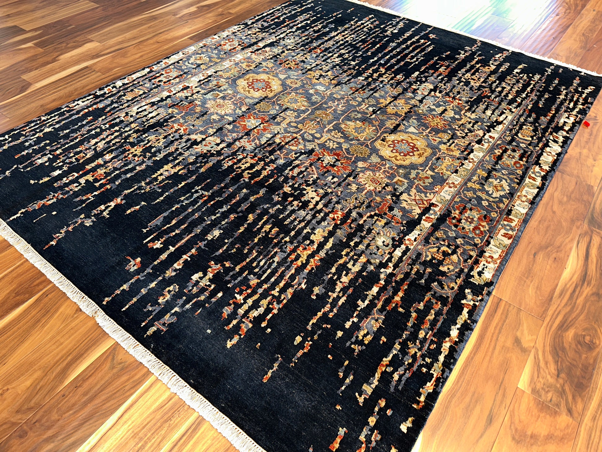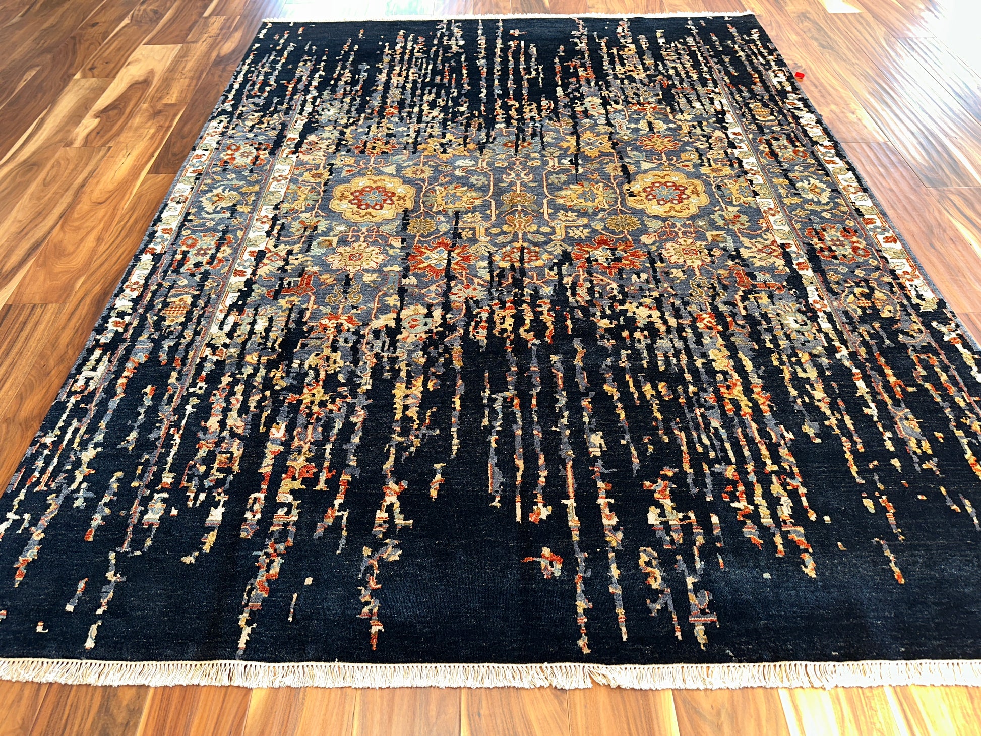 This handwoven rug brings together the elegance of tradition and the boldness of abstraction. At its heart lies a delicate floral pattern in warm gold, soft blue, and amber—partly obscured by cascading threads of deep black that seem to drip from the sky. The effect is both dramatic and poetic, like a memory surfacing through shadow.