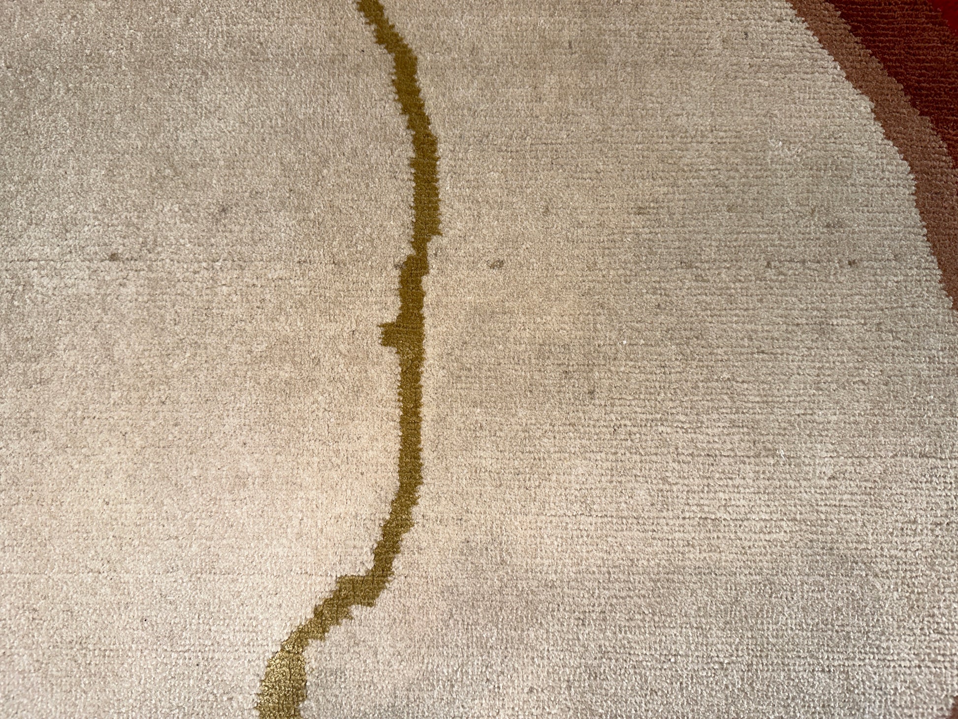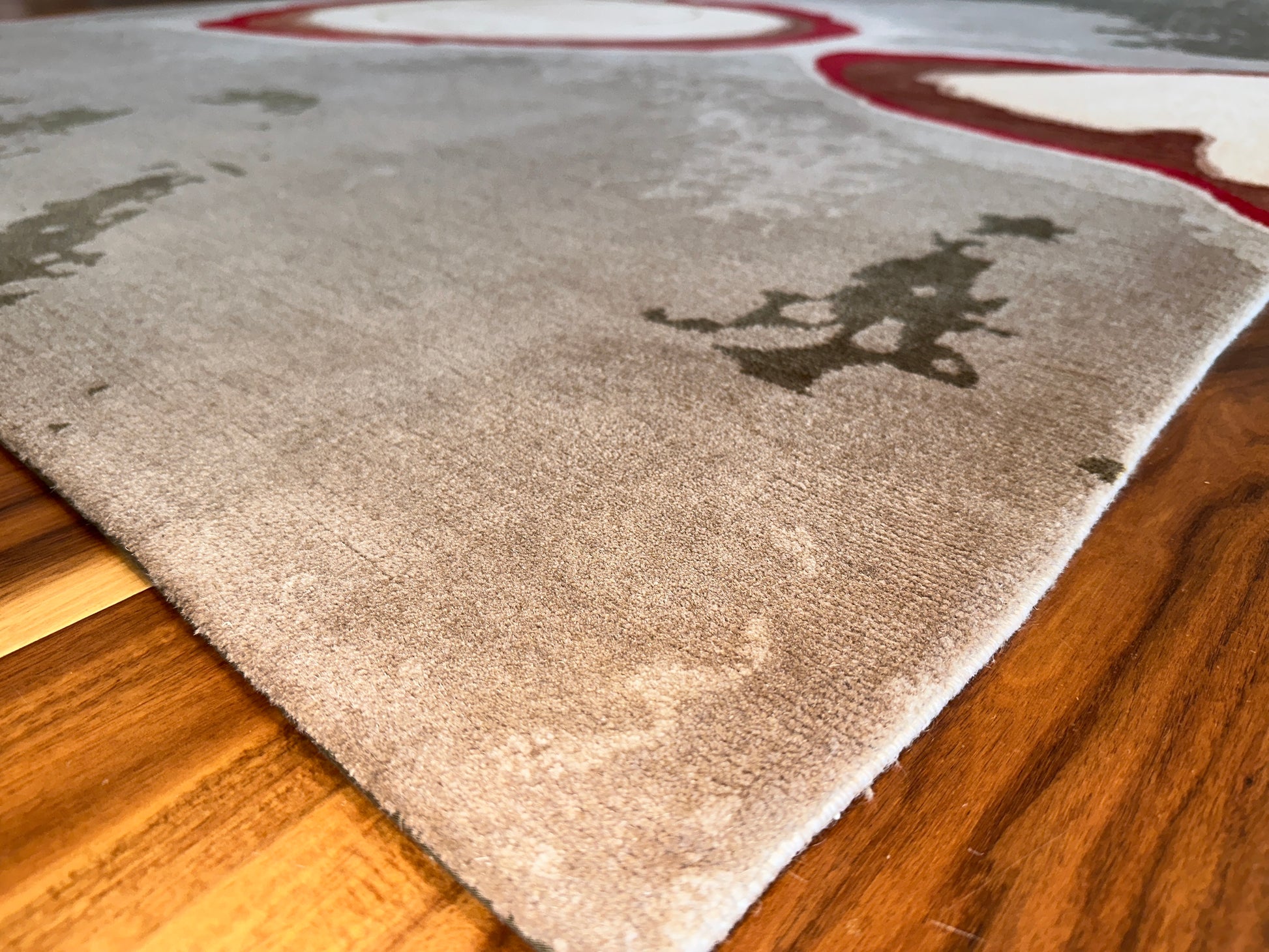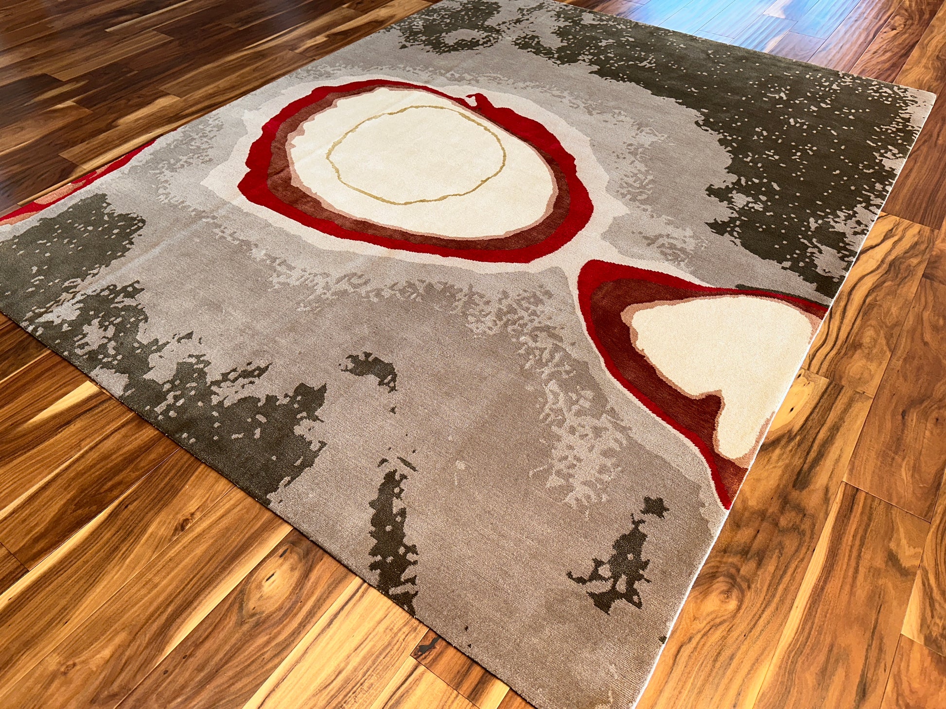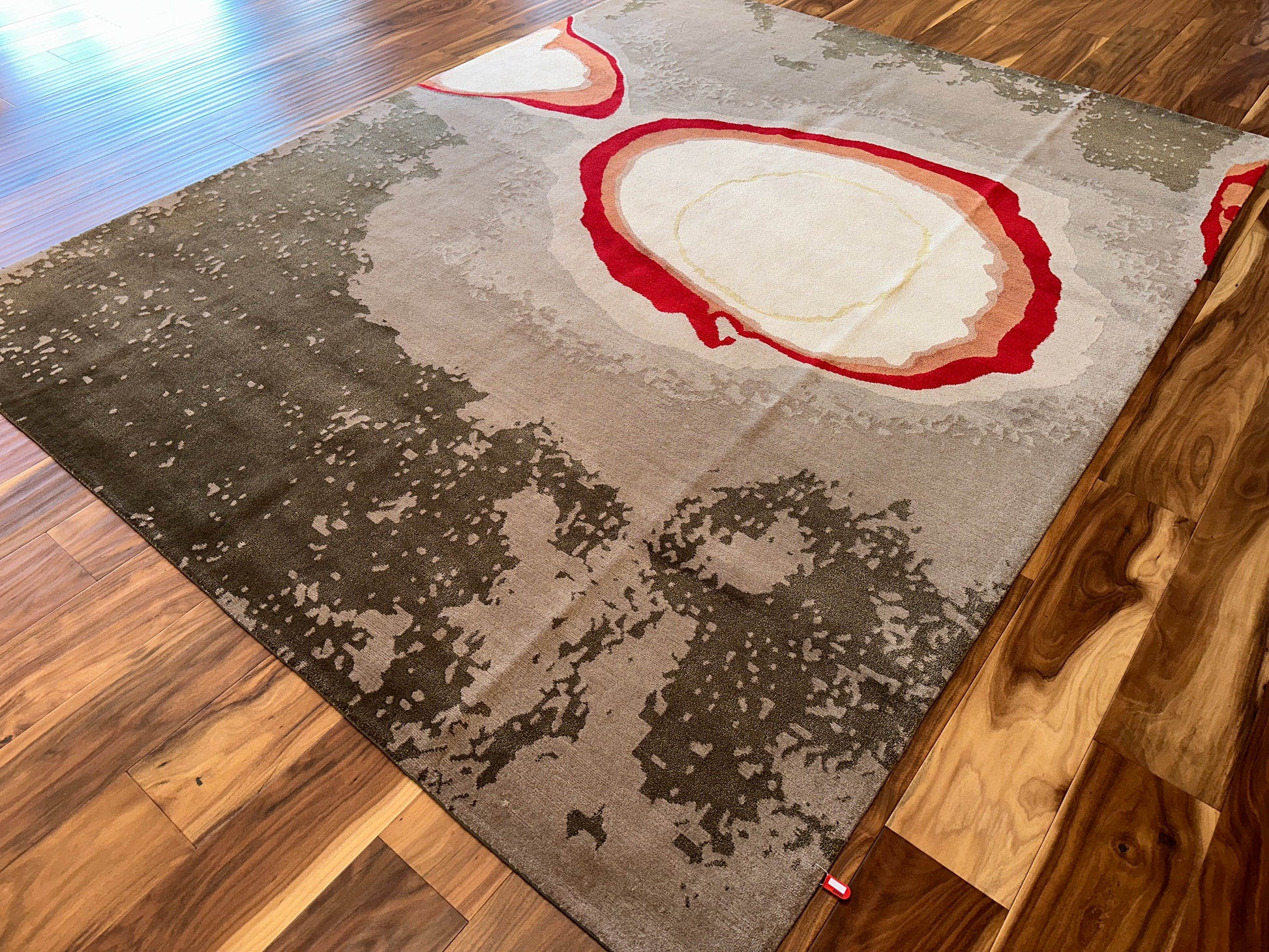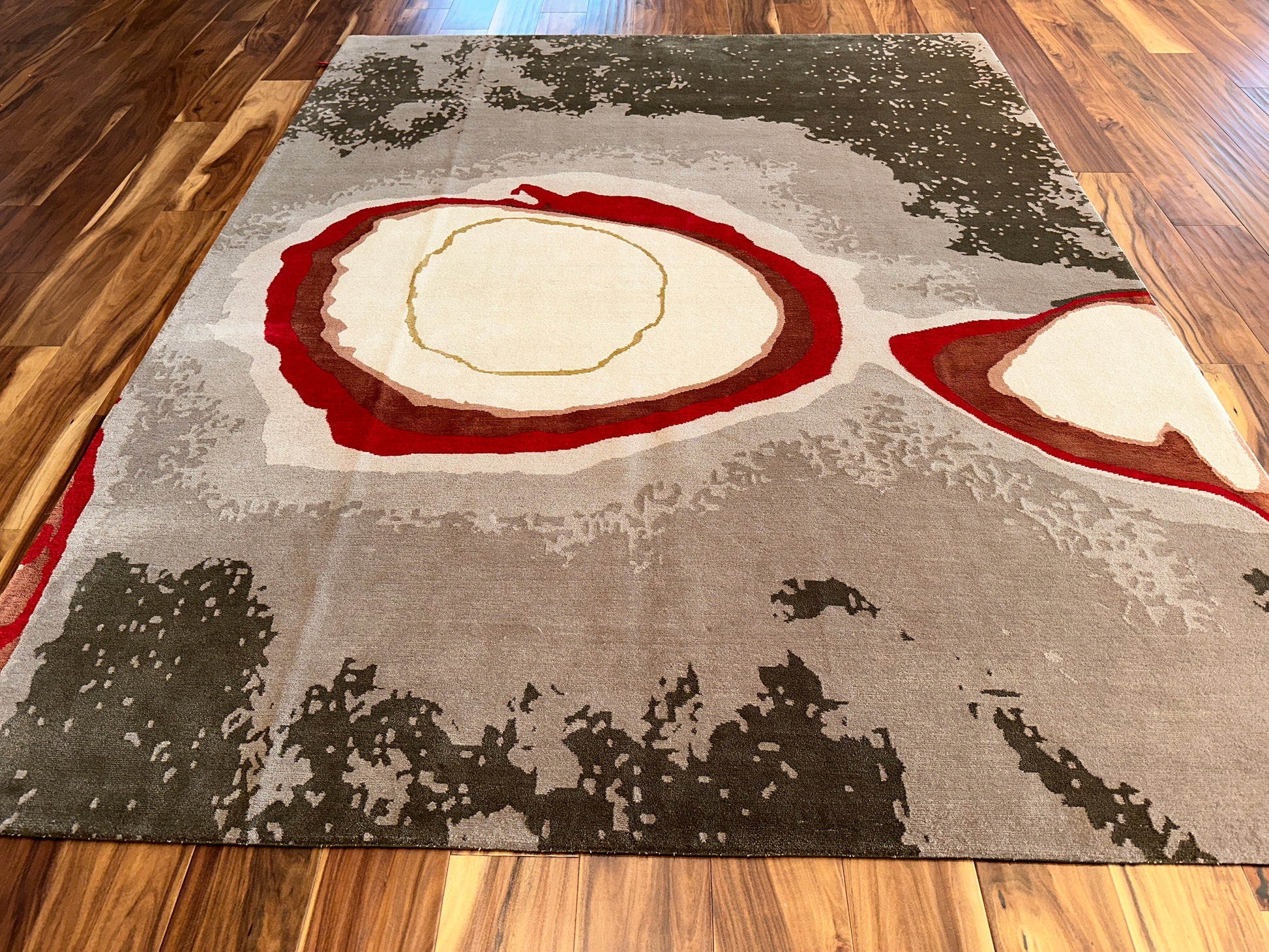 With the energy of modern art and the grounding tones of nature, this handwoven rug evokes the look of geological formations or abstract cosmic imagery. Bold circular motifs in cream and crimson pulse against a background of shifting earth tones, creating a compelling visual rhythm that adds intrigue and sophistication to any contemporary setting.