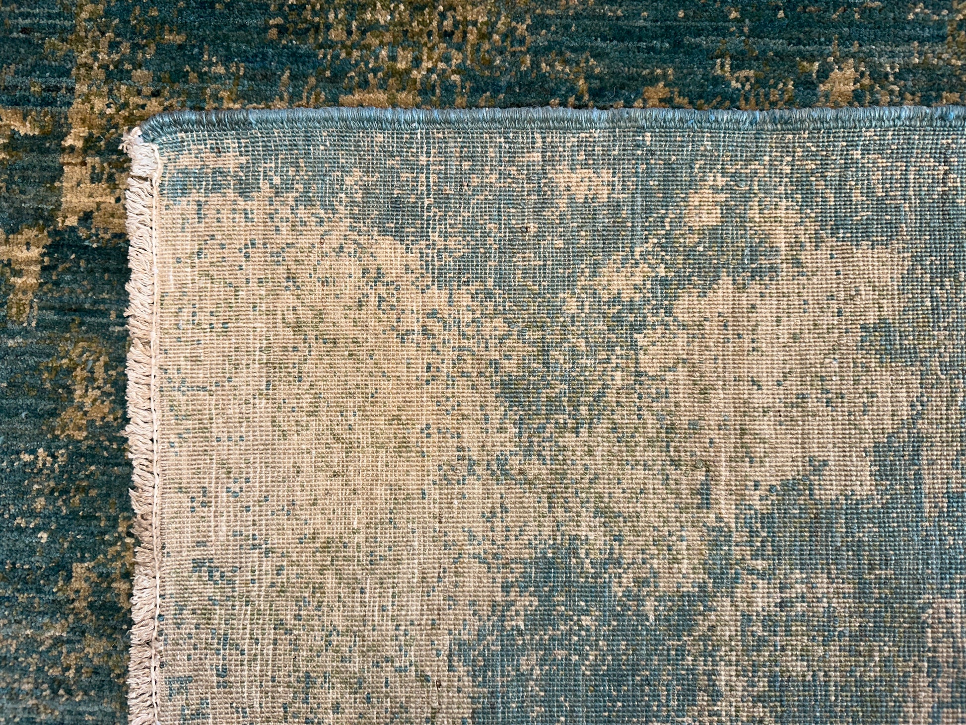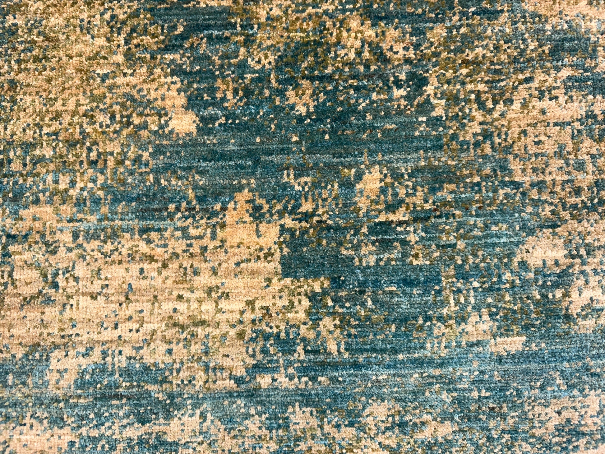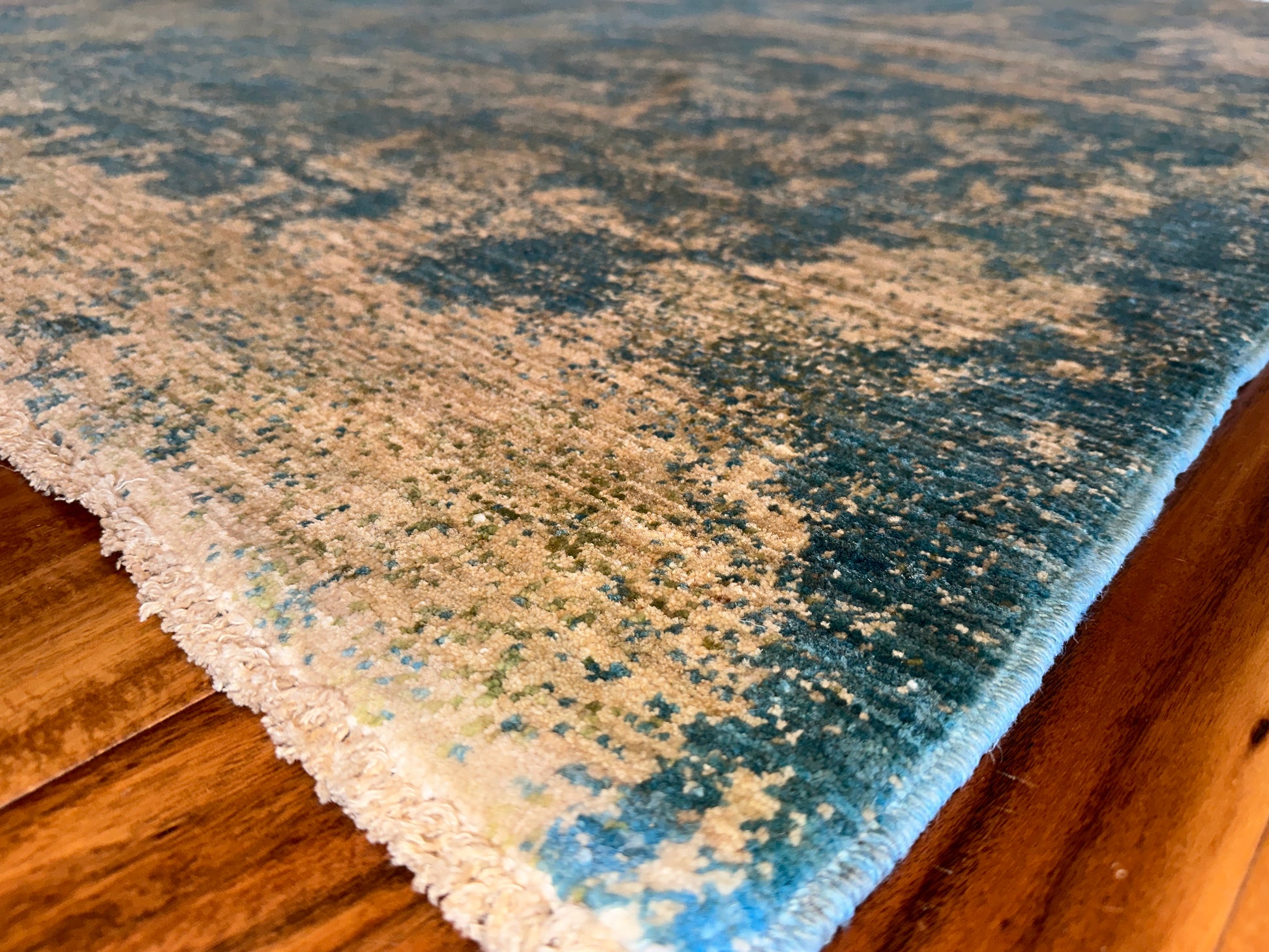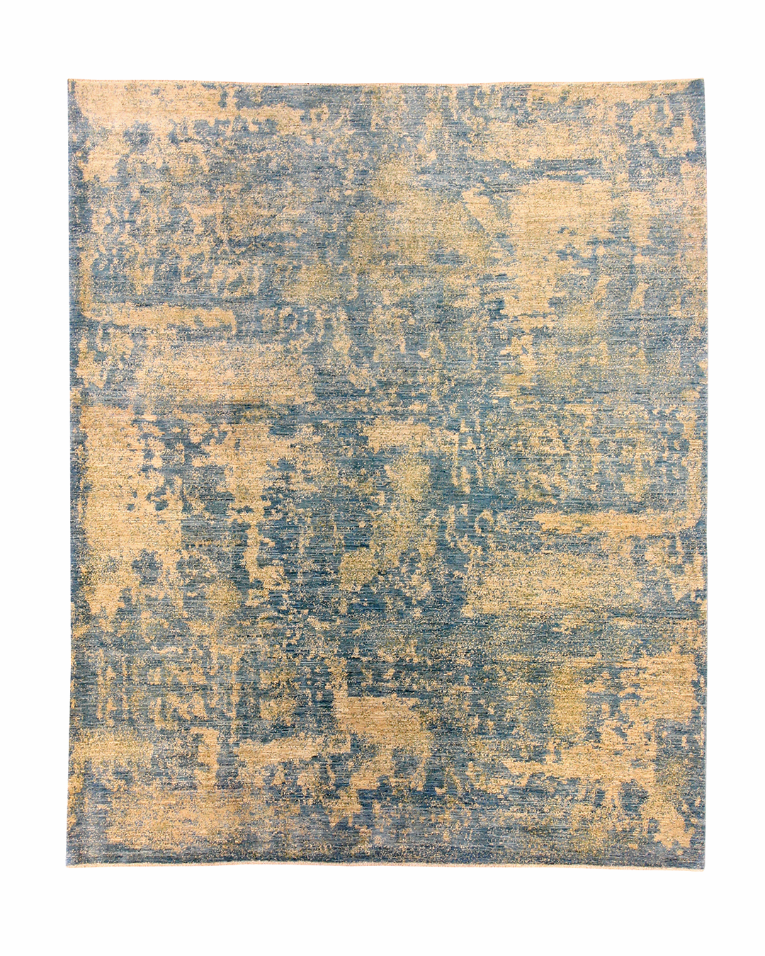 Soft and ethereal, this handwoven rug blends golden beige and muted teal in a beautifully faded, abstract pattern reminiscent of weathered frescoes. The design carries an organic, painterly quality, with diffused forms and layers of tone that evoke depth and gentle motion. Its serene palette and texture-rich surface bring a calming presence to any space.