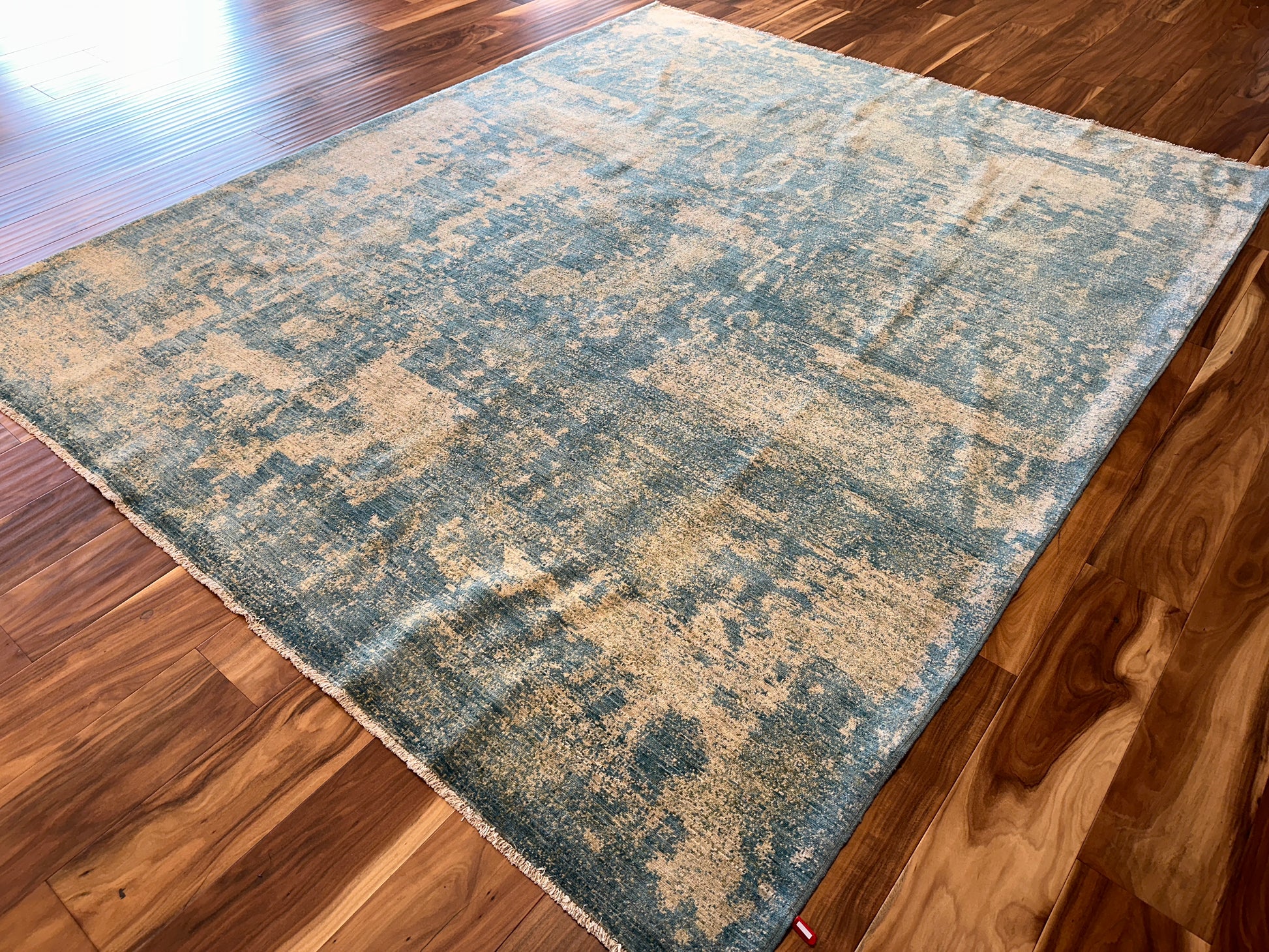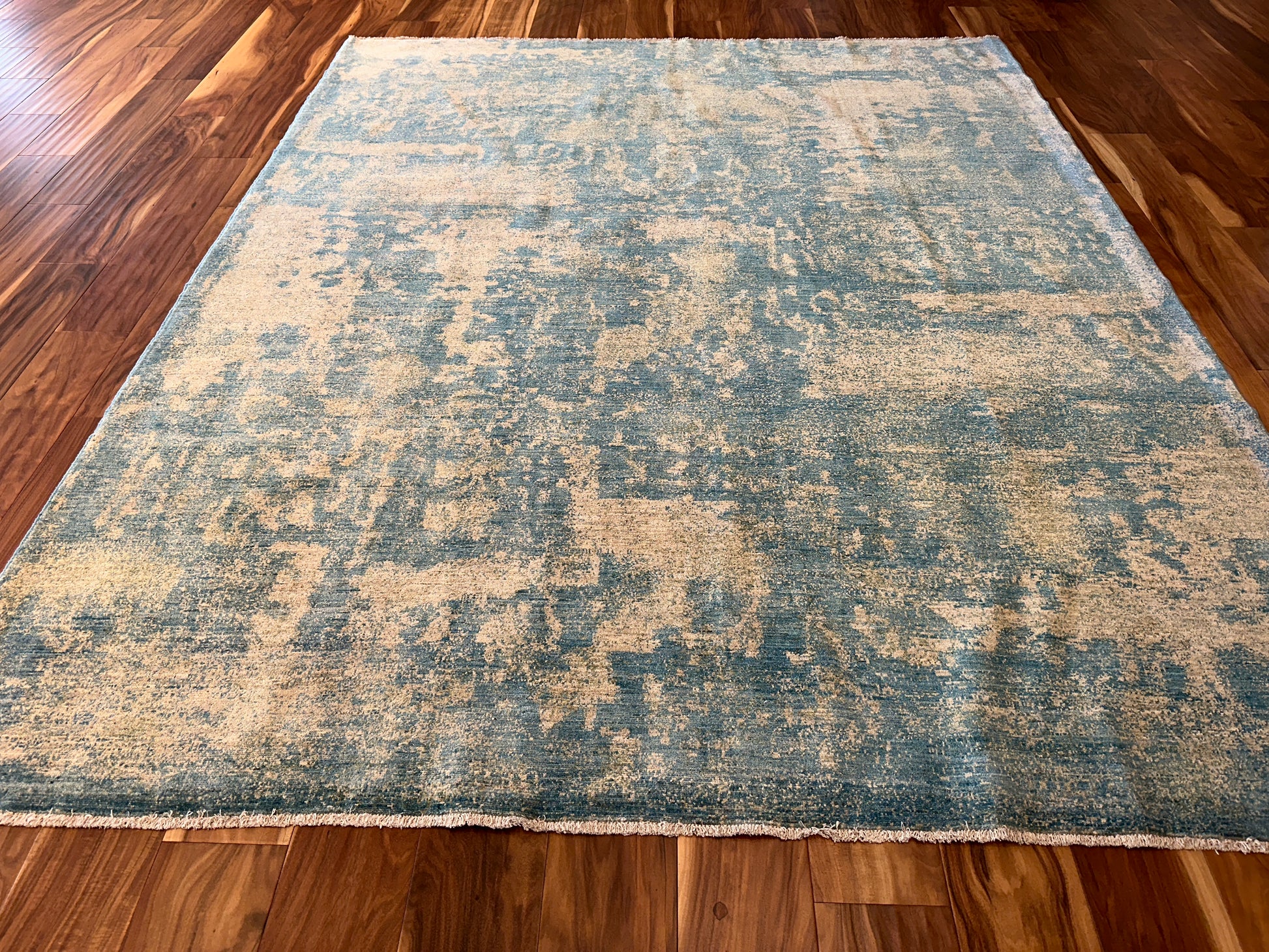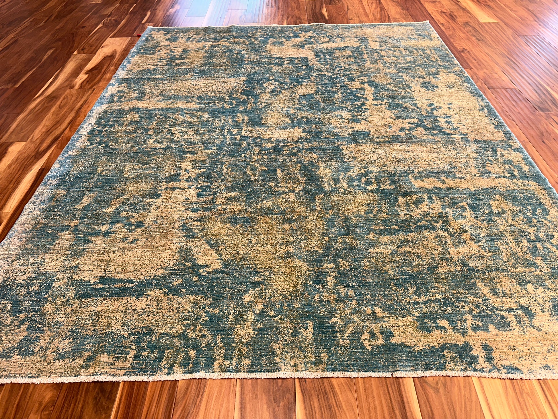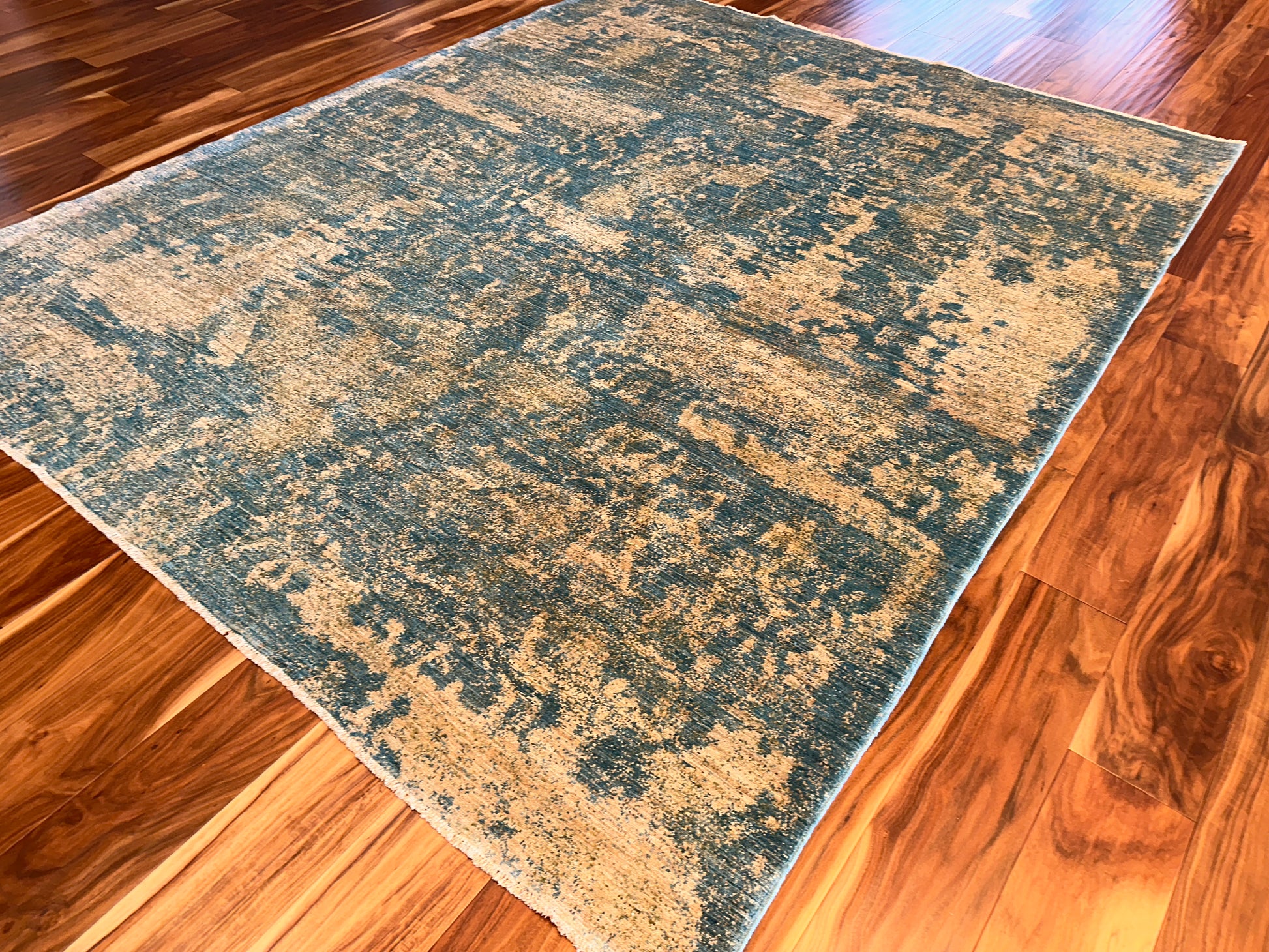 Soft and ethereal, this handwoven rug blends golden beige and muted teal in a beautifully faded, abstract pattern reminiscent of weathered frescoes. The design carries an organic, painterly quality, with diffused forms and layers of tone that evoke depth and gentle motion. Its serene palette and texture-rich surface bring a calming presence to any space.
