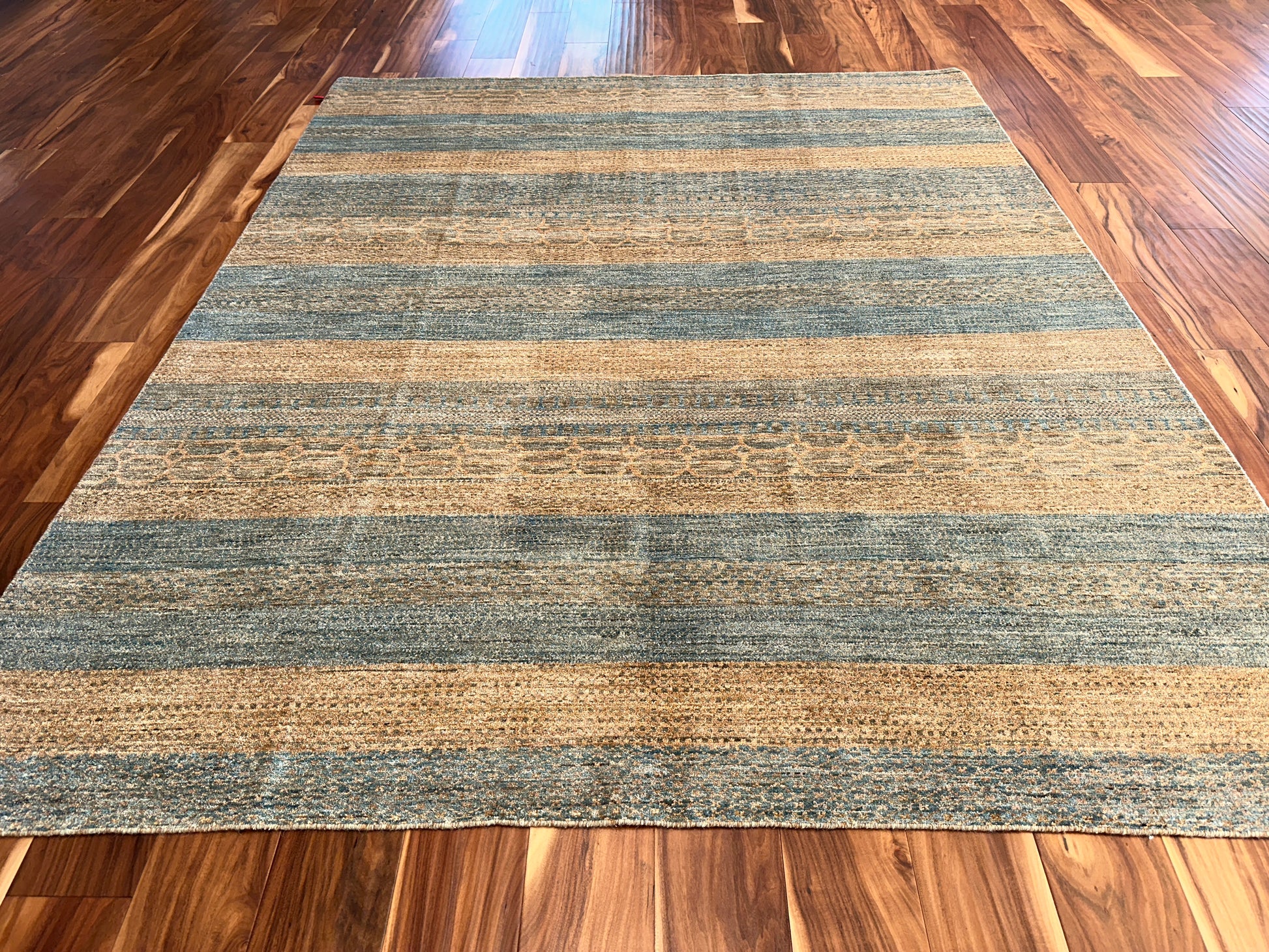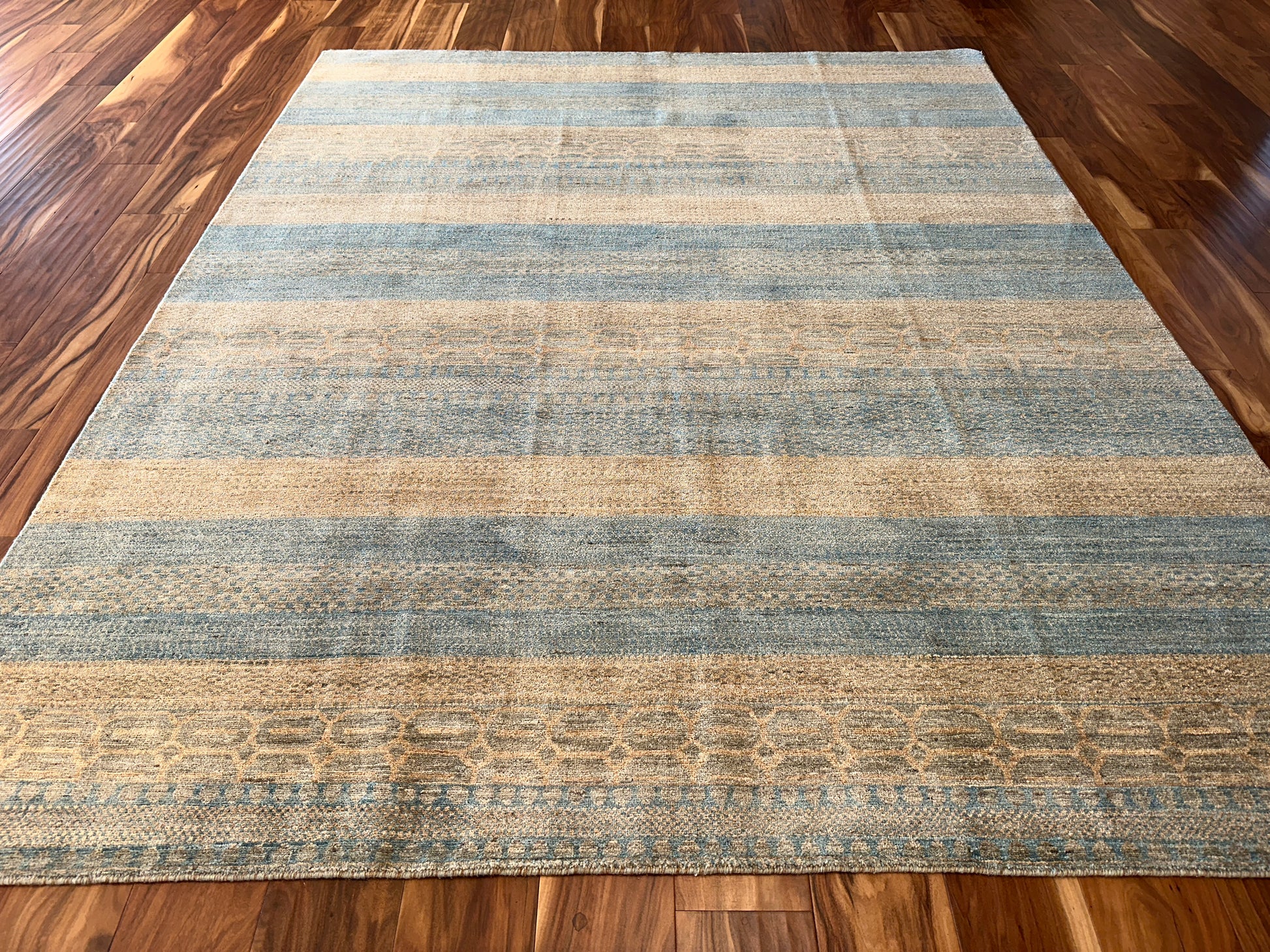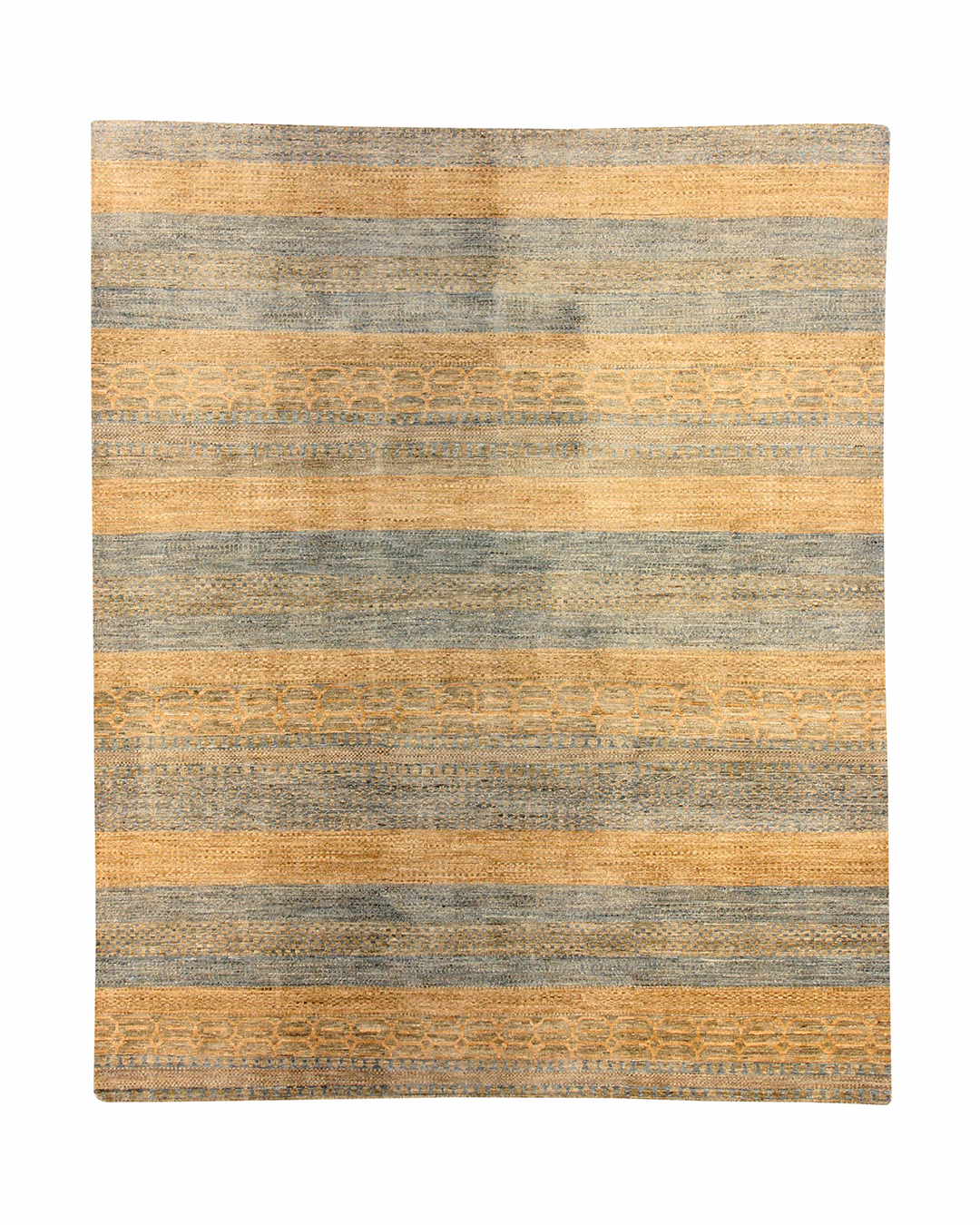 This handwoven rug features softly alternating bands of seafoam blue and sandy beige, creating a harmonious, earthy rhythm that evokes the natural beauty of coastal landscapes. Subtle tribal-inspired motifs are interwoven with textured horizontal stripes, adding depth and quiet sophistication without overwhelming the senses. Its serene palette and lightly distressed finish make it a grounding piece for relaxed interiors.