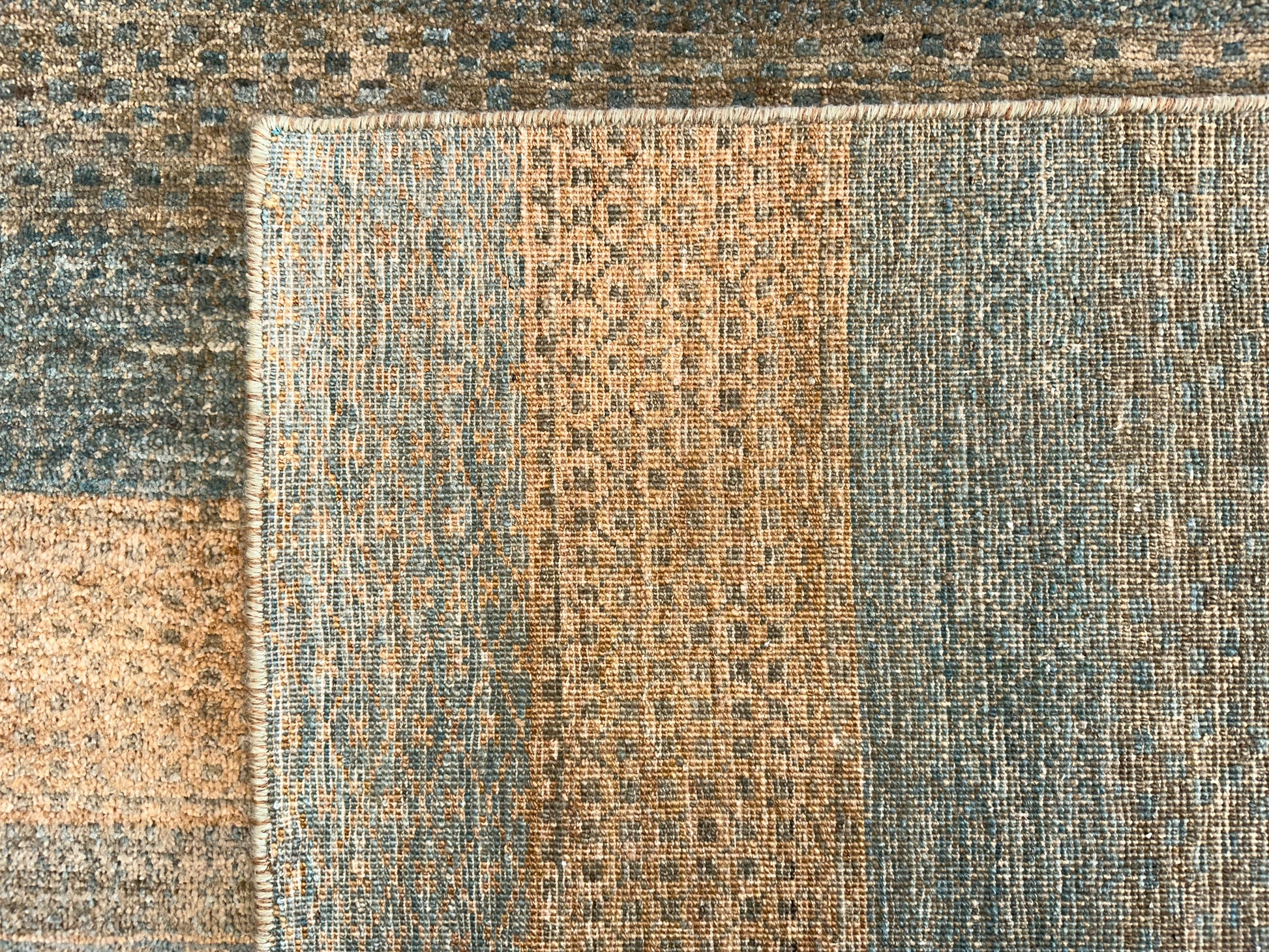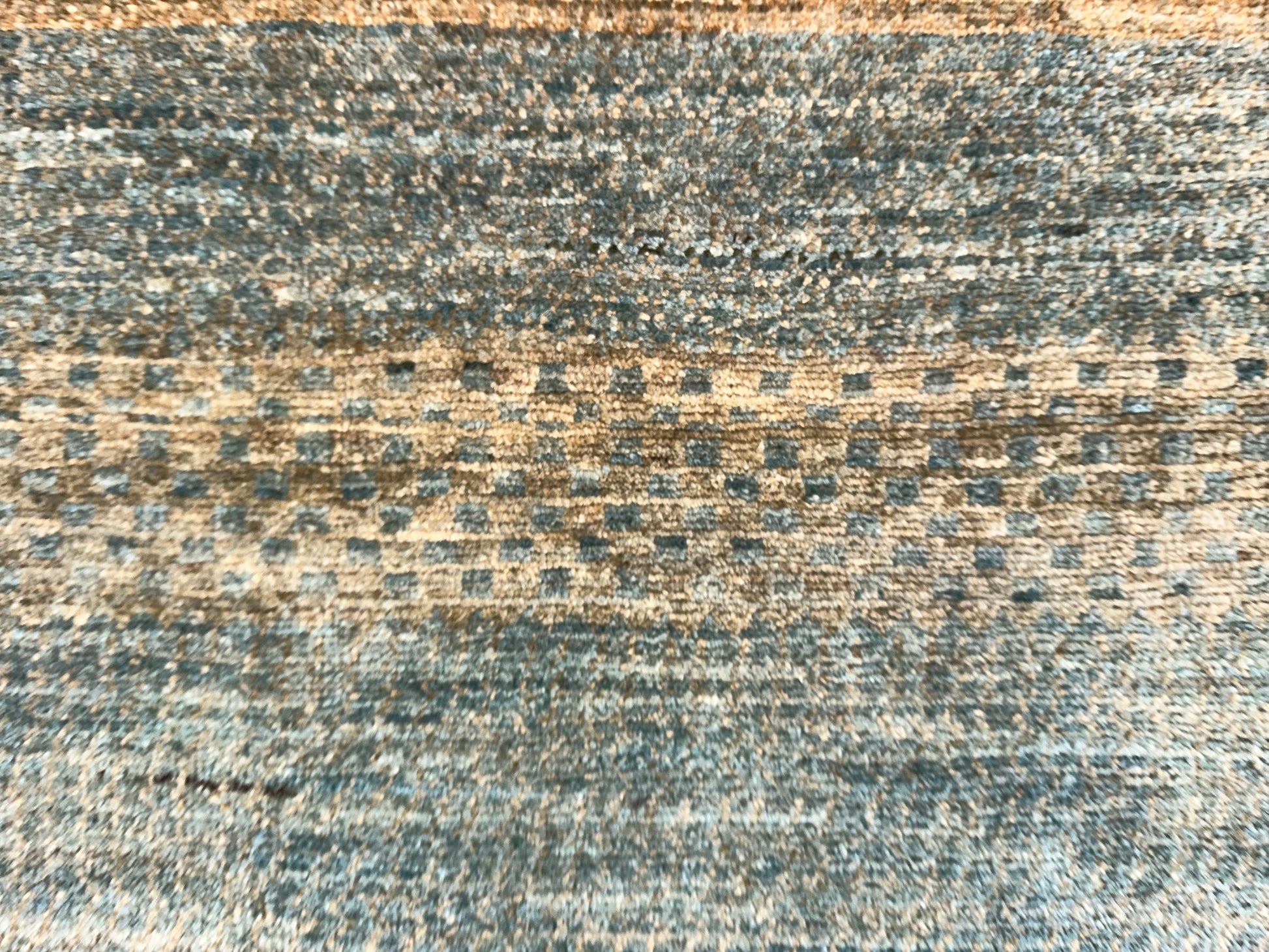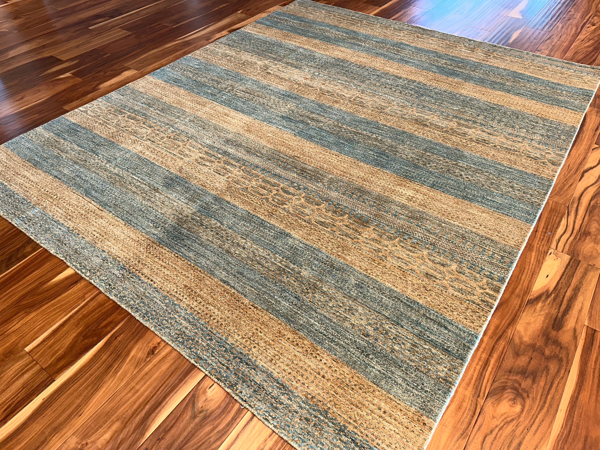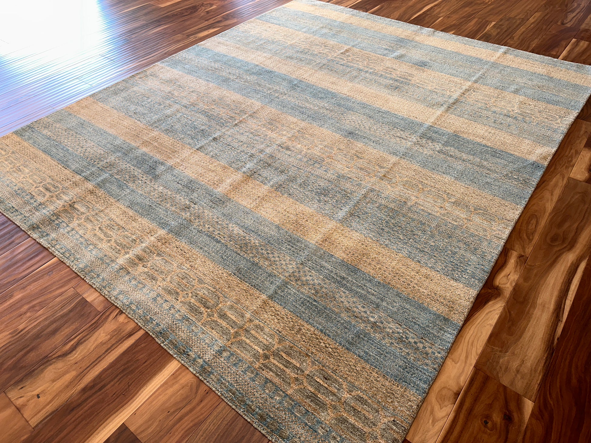 This handwoven rug features softly alternating bands of seafoam blue and sandy beige, creating a harmonious, earthy rhythm that evokes the natural beauty of coastal landscapes. Subtle tribal-inspired motifs are interwoven with textured horizontal stripes, adding depth and quiet sophistication without overwhelming the senses. Its serene palette and lightly distressed finish make it a grounding piece for relaxed interiors.