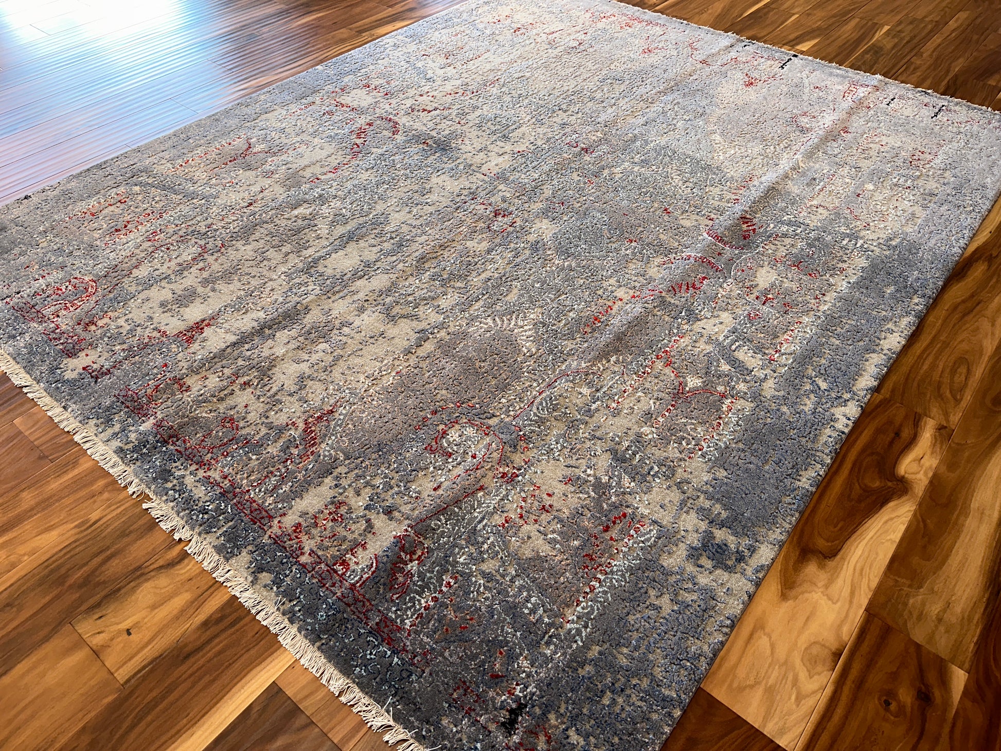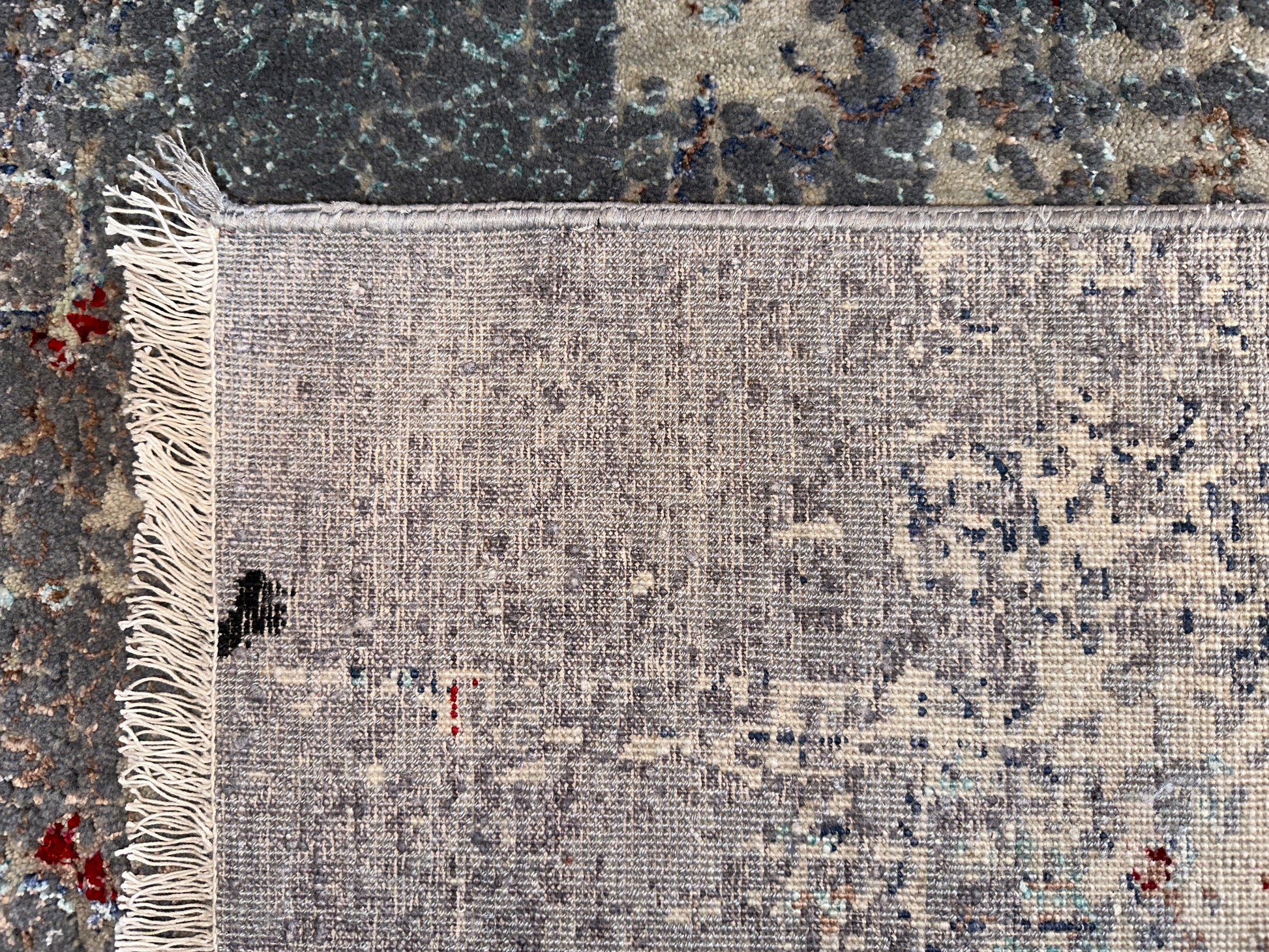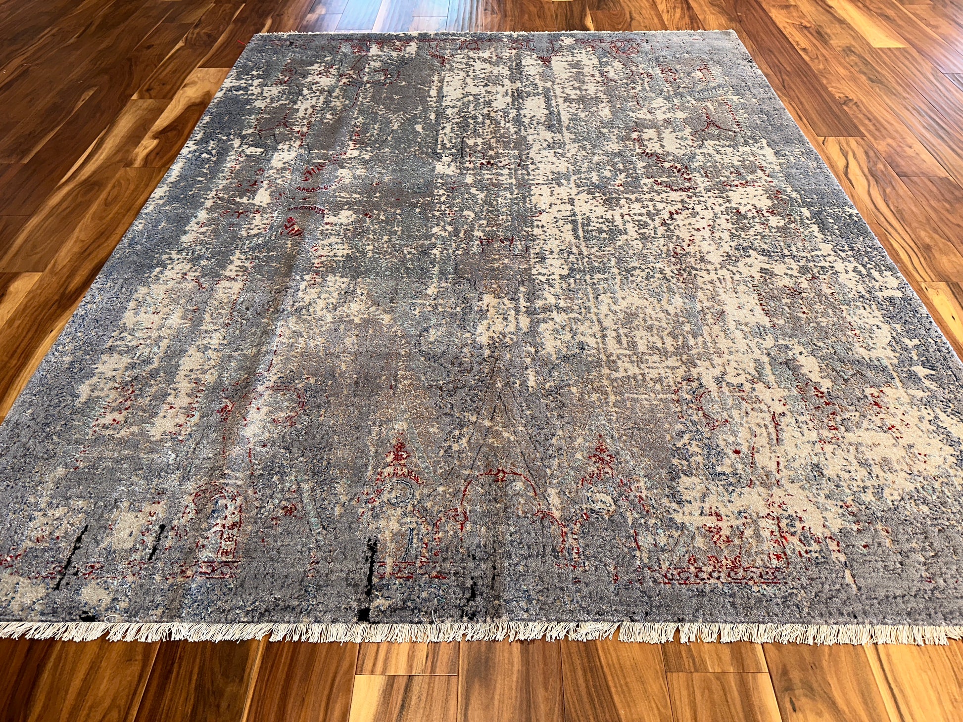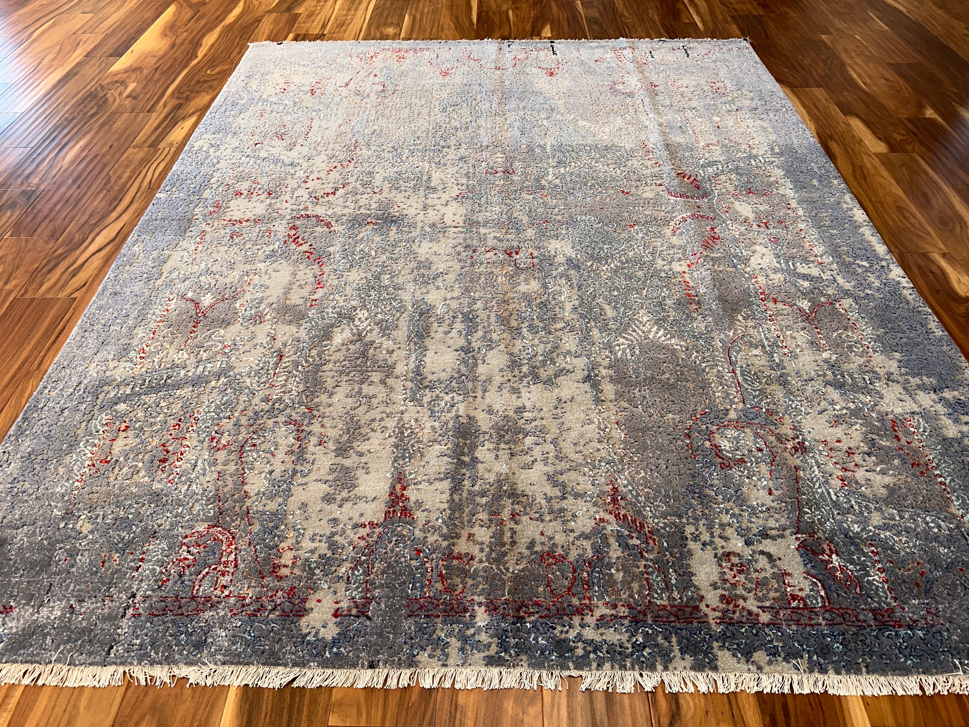 A moody blend of texture and tone, this rug evokes a sense of quiet history and modern artistry. Layers of gray and ivory are scattered with gentle flashes of crimson and charcoal, resembling an abstracted, time-worn fresco. The fringed edges lend a casual, organic finish, softening the overall contemporary impression. Perfect for grounding a space with depth and subtle drama.