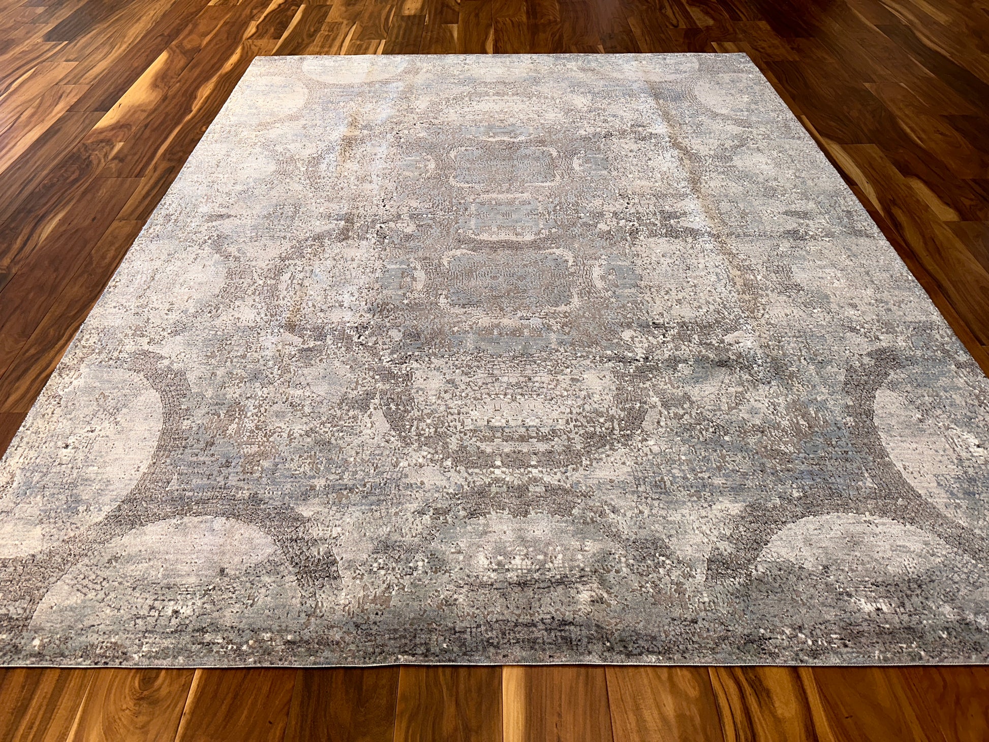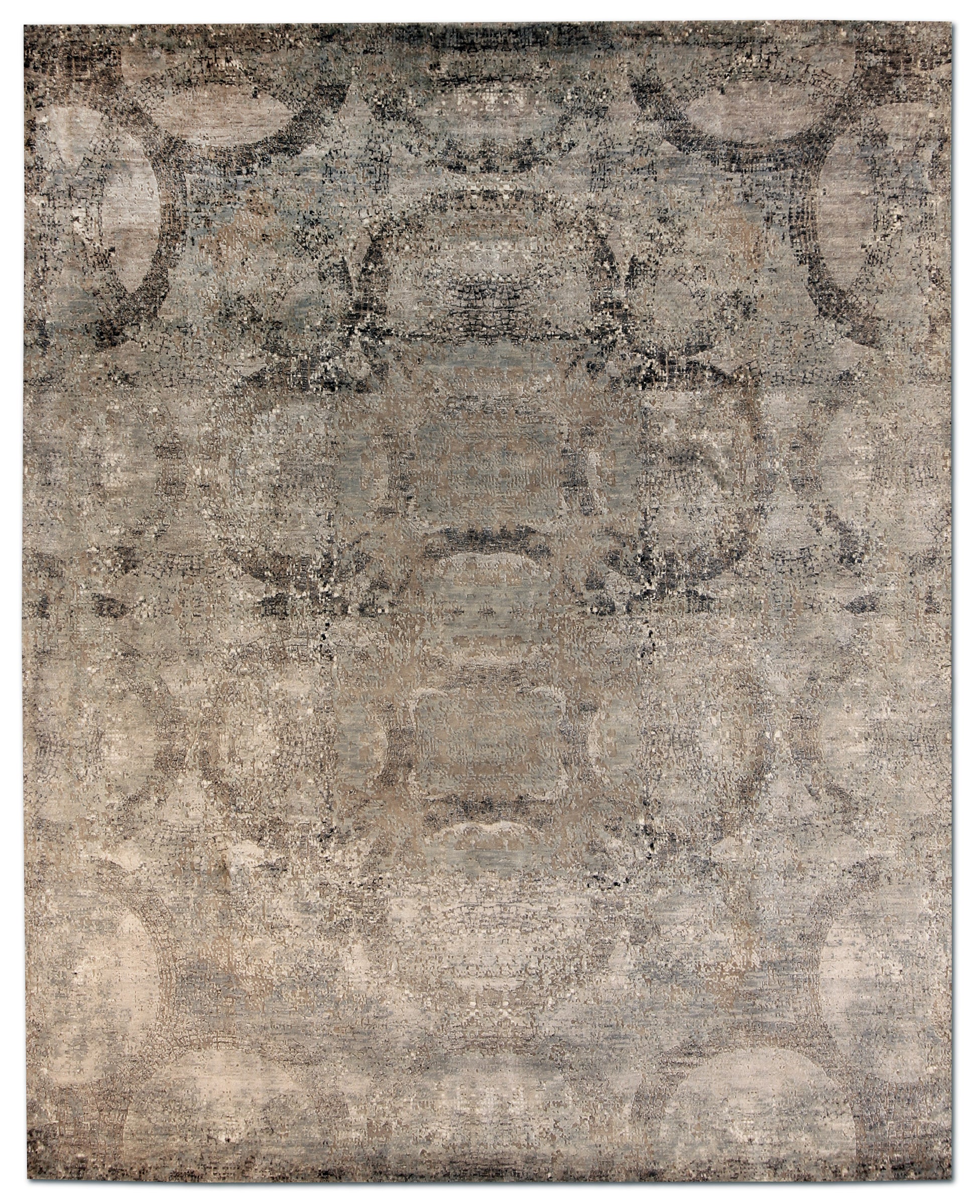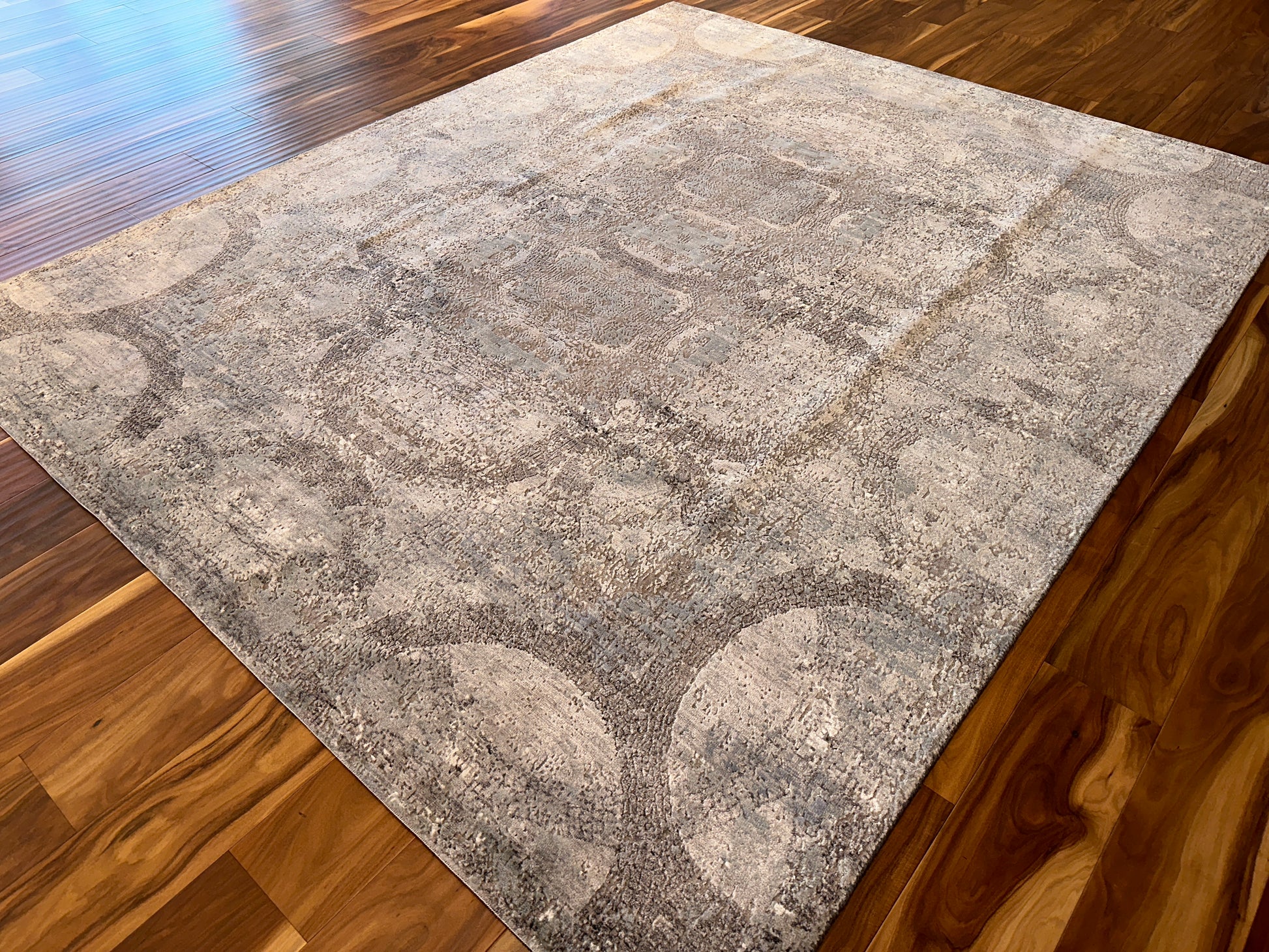 - Design: Subtle medallion pattern with distressed, arching elements