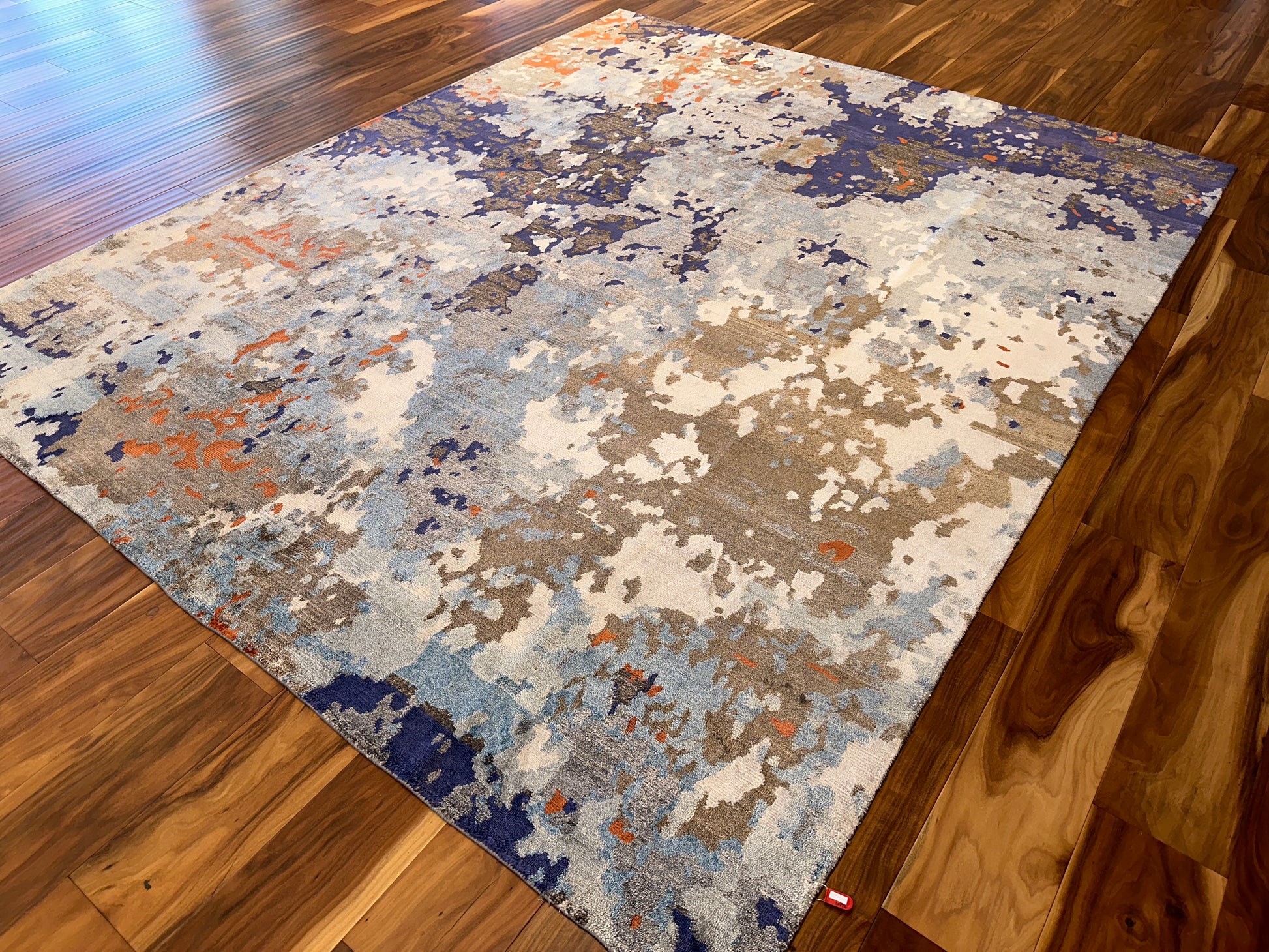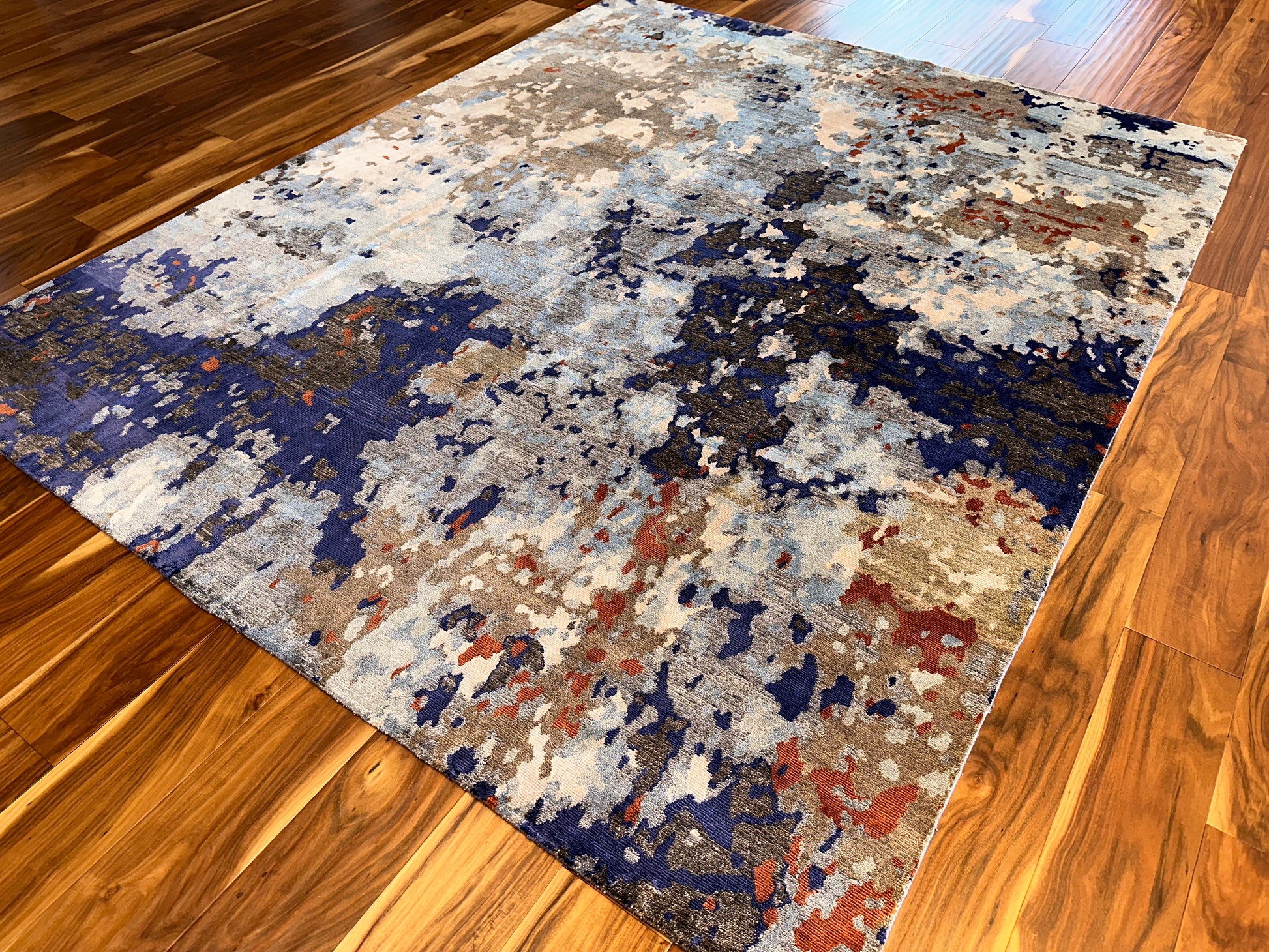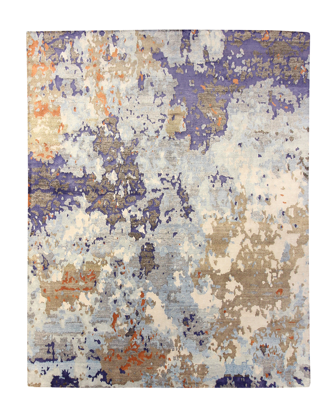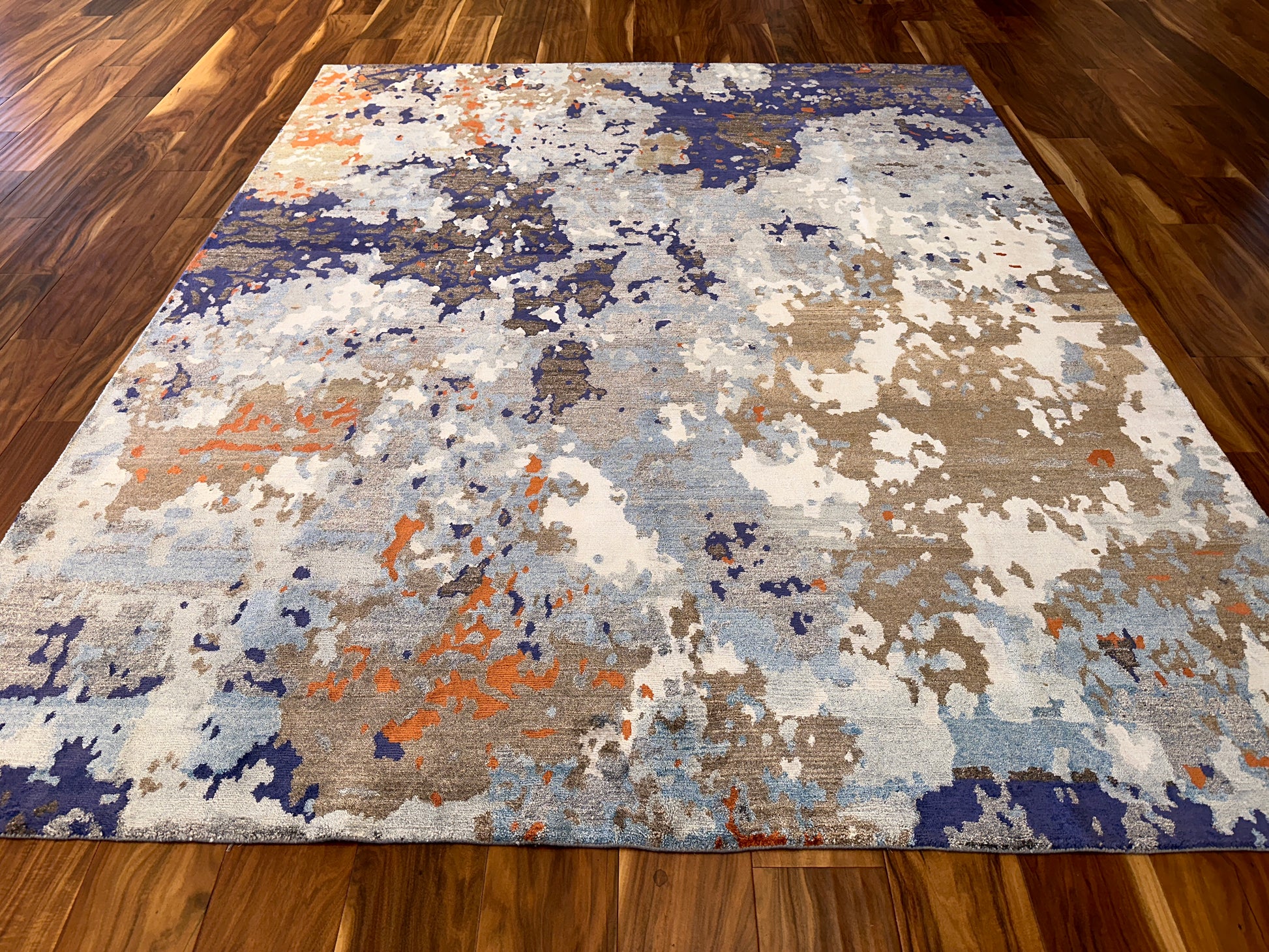 Vibrant and painterly, this rug blooms with color and movement, like a vivid landscape captured at golden hour. Its abstract design scatters earthy tan, soft sky blue, bright ivory, and bold dashes of orange and indigo across the surface, evoking light, shadow, and energy. A refreshing piece with warmth and rhythm, ideal for brightening up a contemporary room.