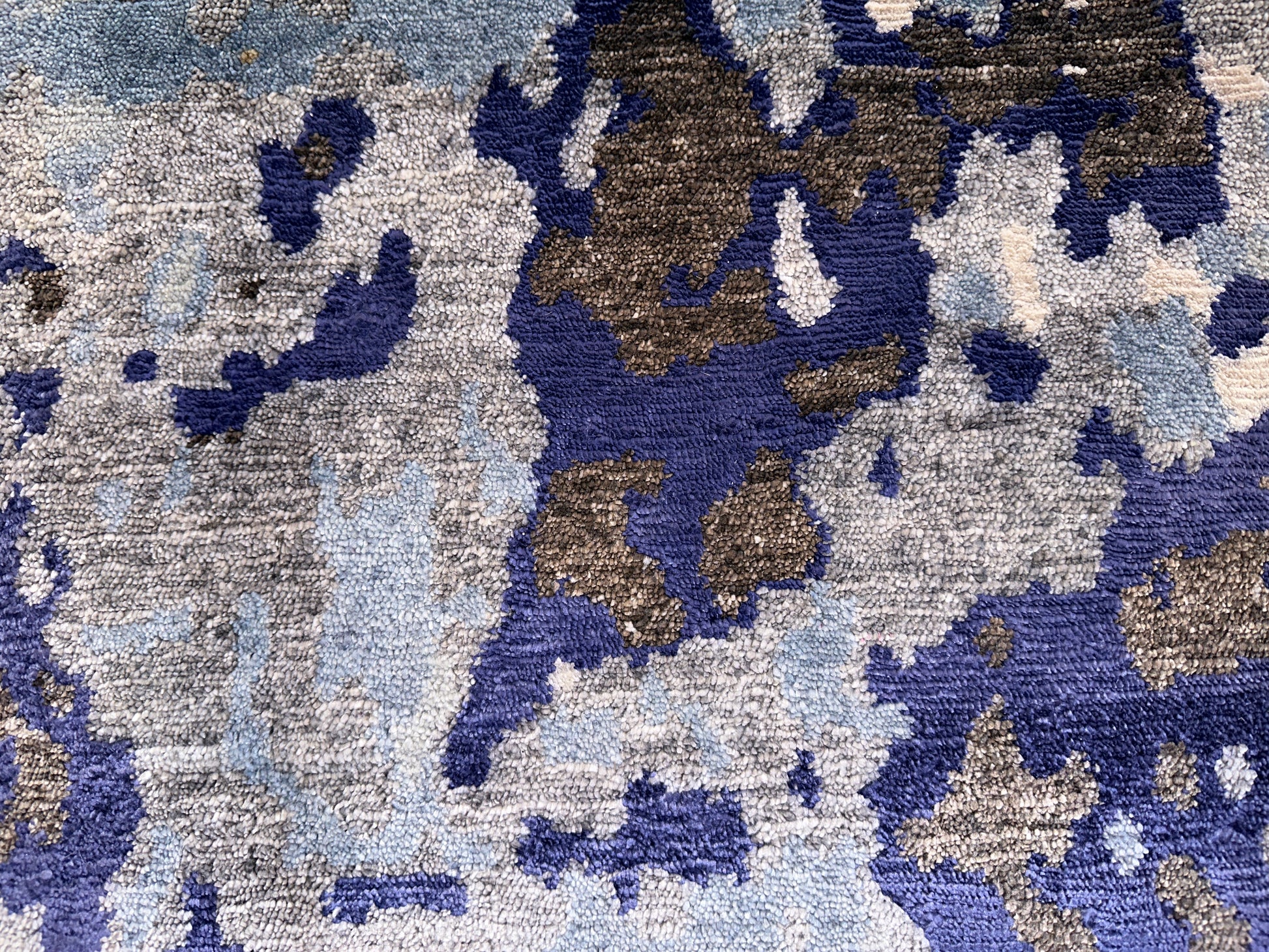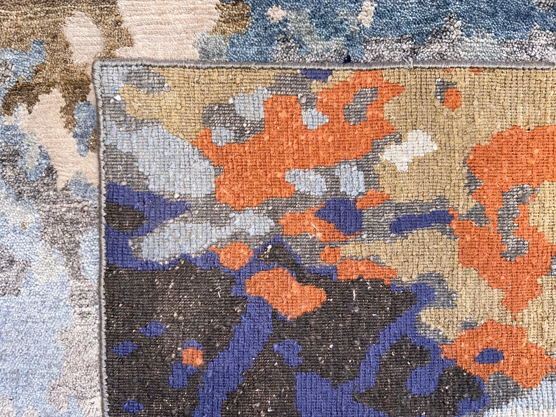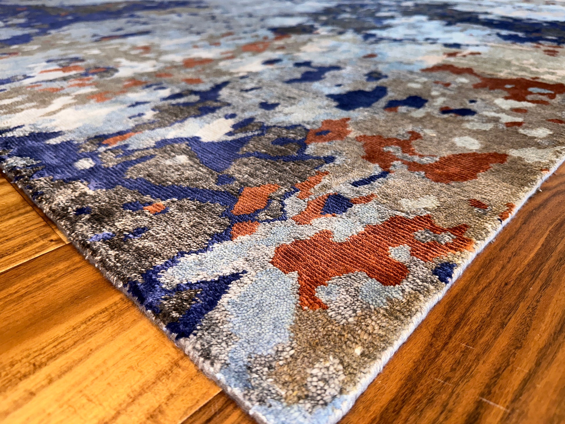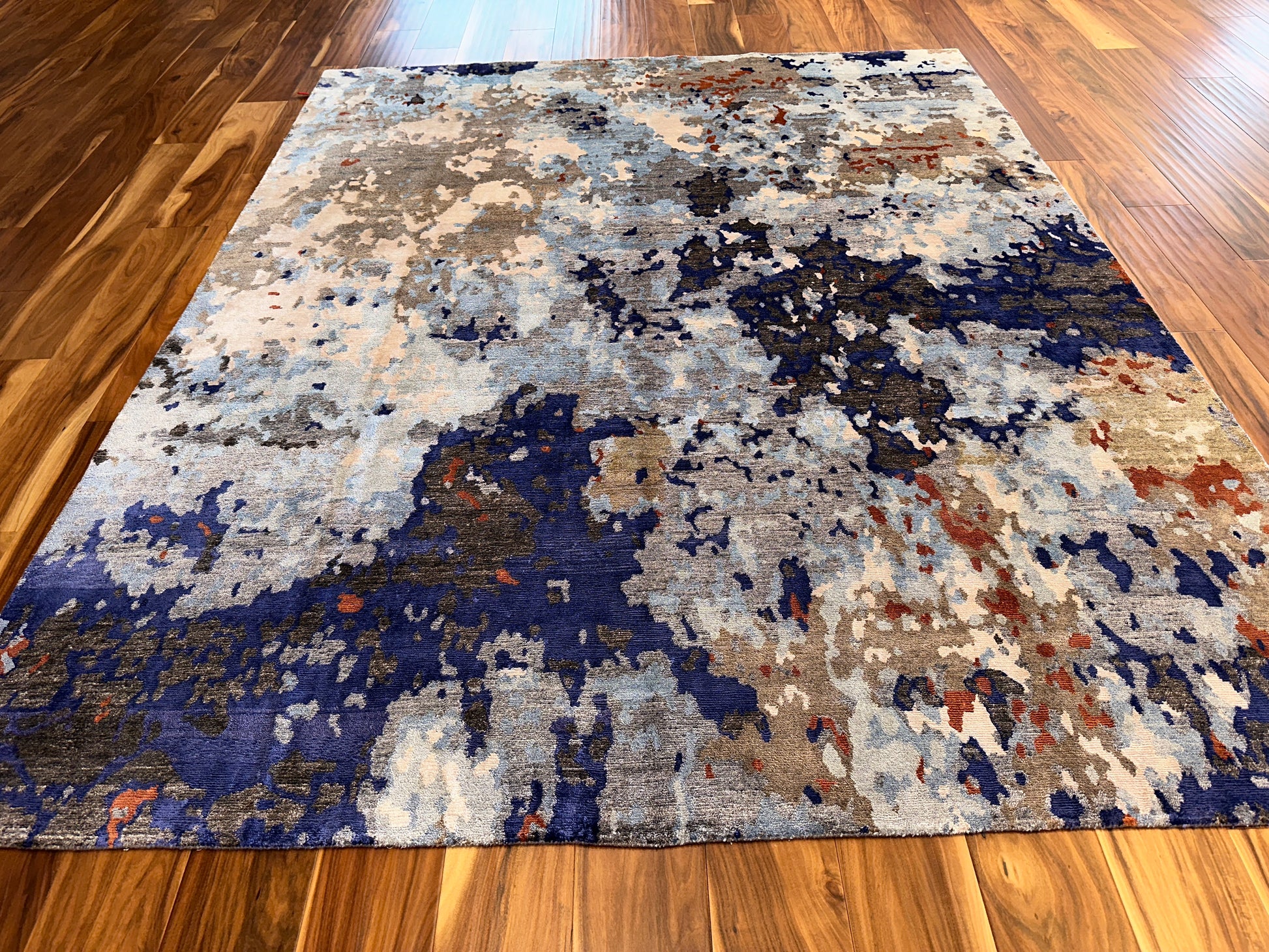 Vibrant and painterly, this rug blooms with color and movement, like a vivid landscape captured at golden hour. Its abstract design scatters earthy tan, soft sky blue, bright ivory, and bold dashes of orange and indigo across the surface, evoking light, shadow, and energy. A refreshing piece with warmth and rhythm, ideal for brightening up a contemporary room.