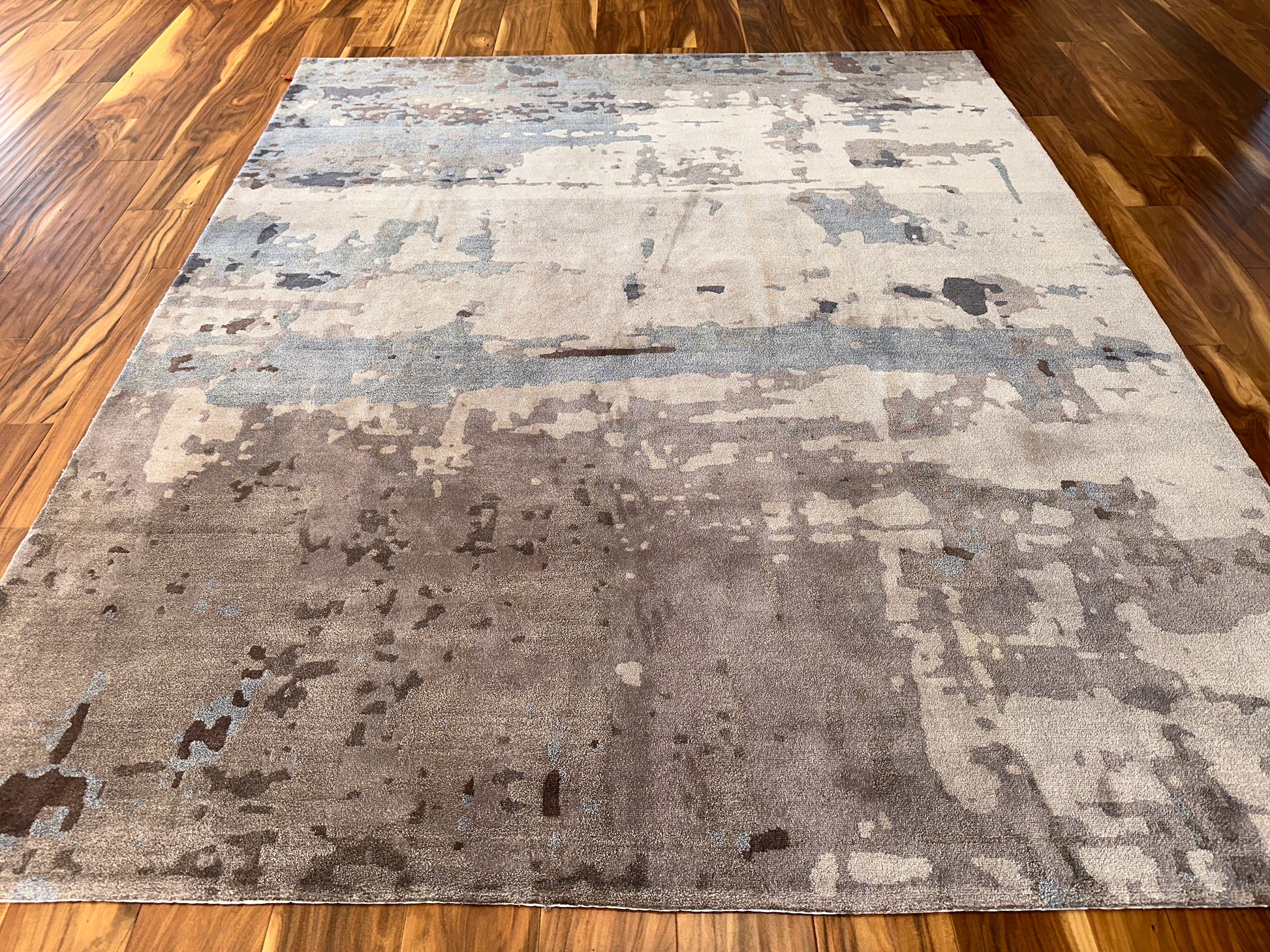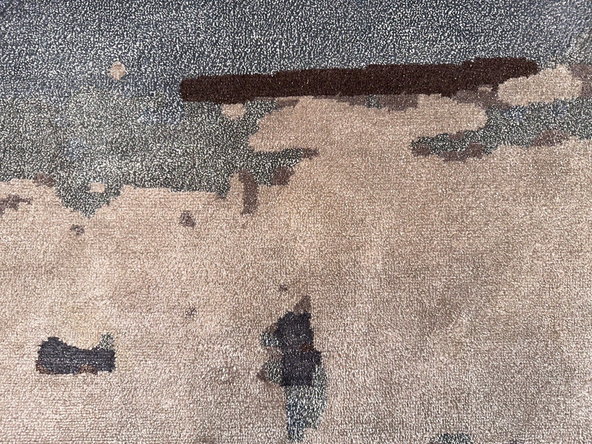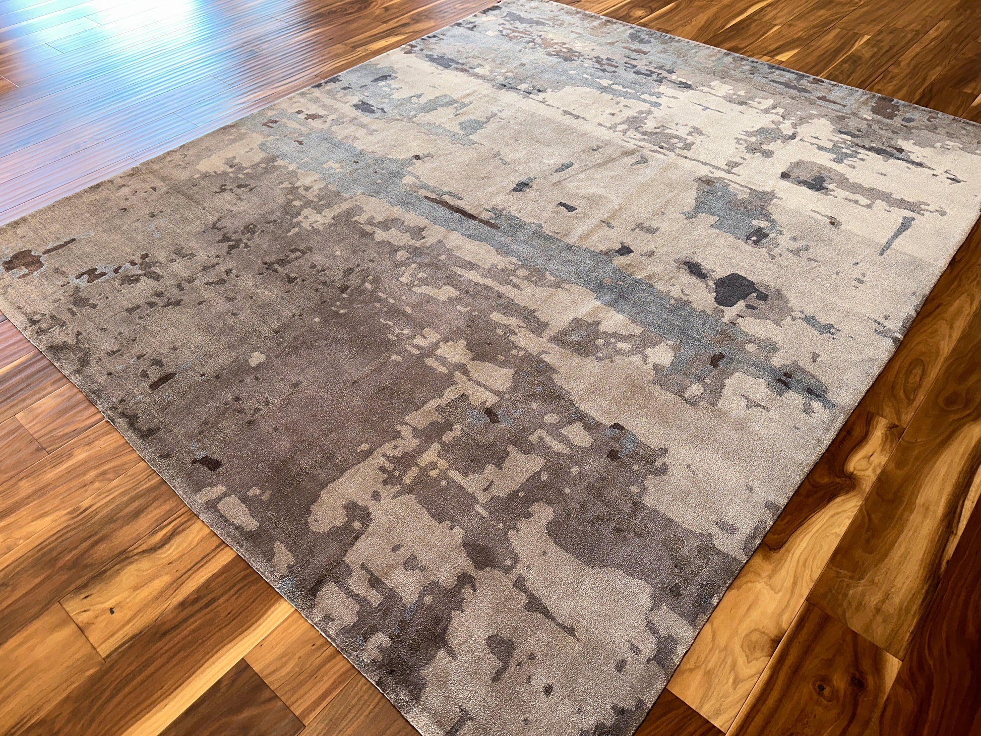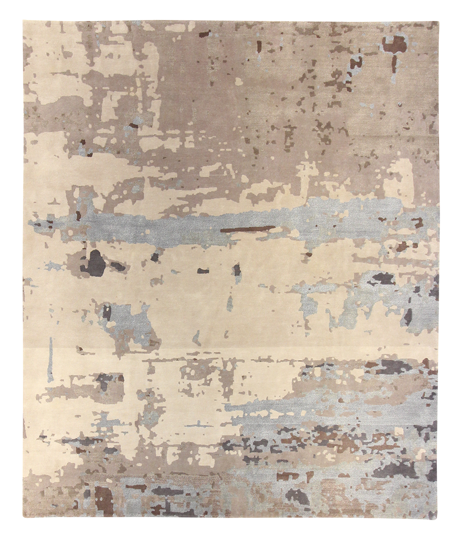 This rug has a serene, weathered elegance—like faded layers of sand, stone, and sky gently brushed across an ancient wall. Soft earthy tones shift subtly beneath pale blue-gray streaks, creating a peaceful, grounded atmosphere. The abstract pattern evokes both movement and stillness, making it an ideal foundation for a calm, sophisticated room.