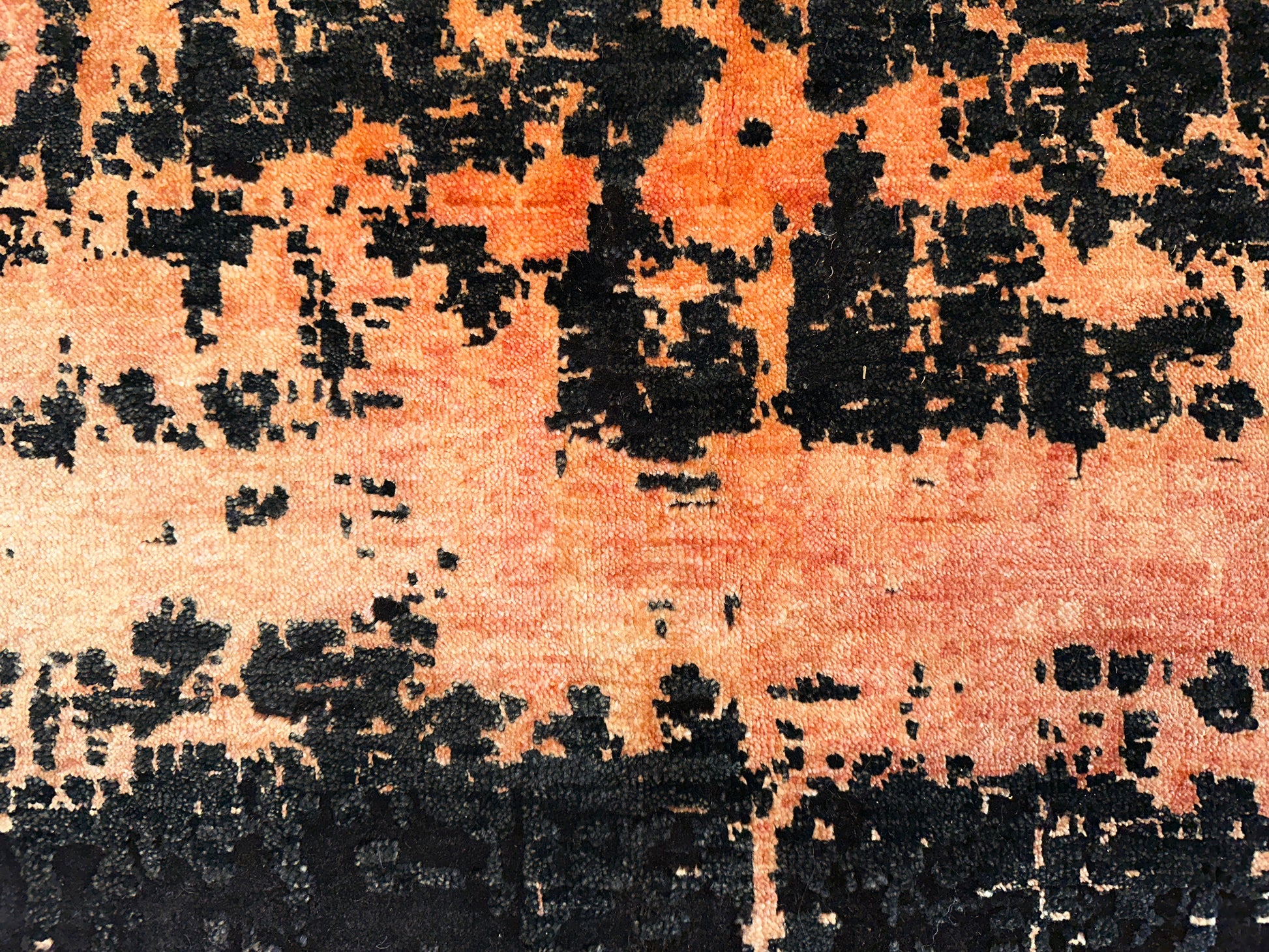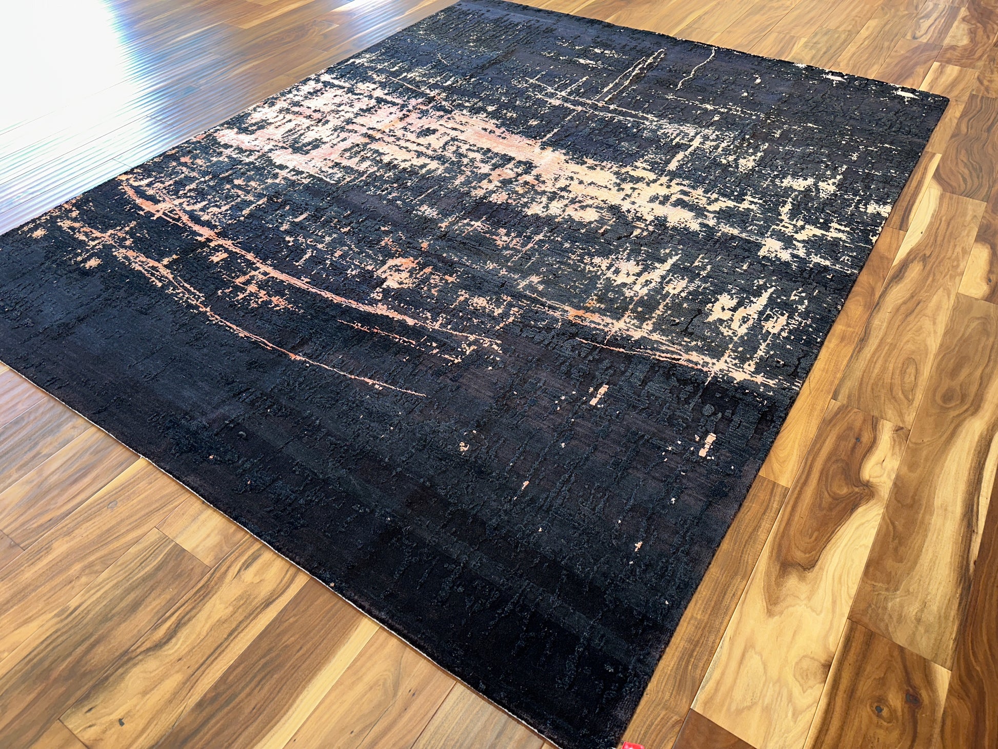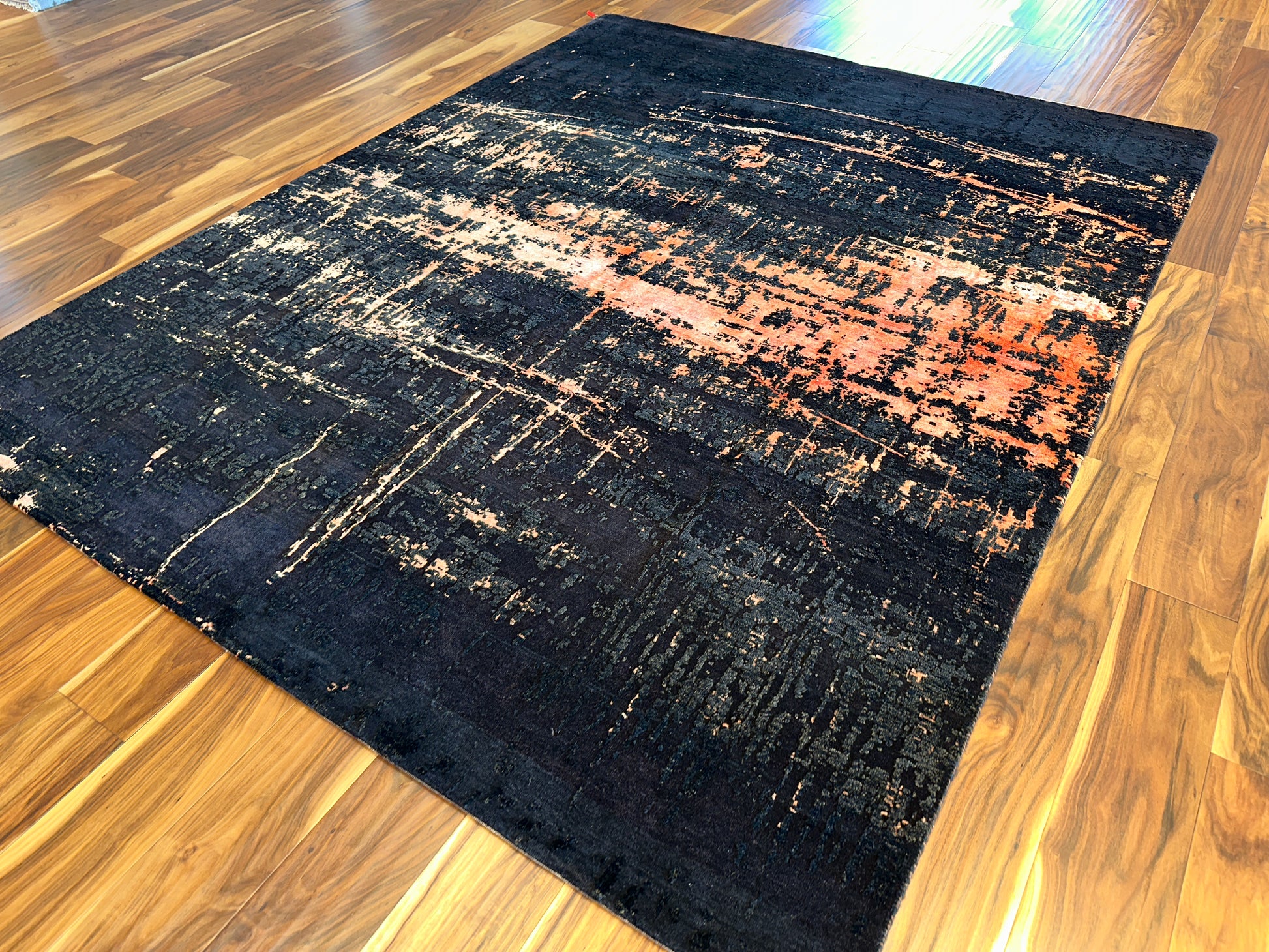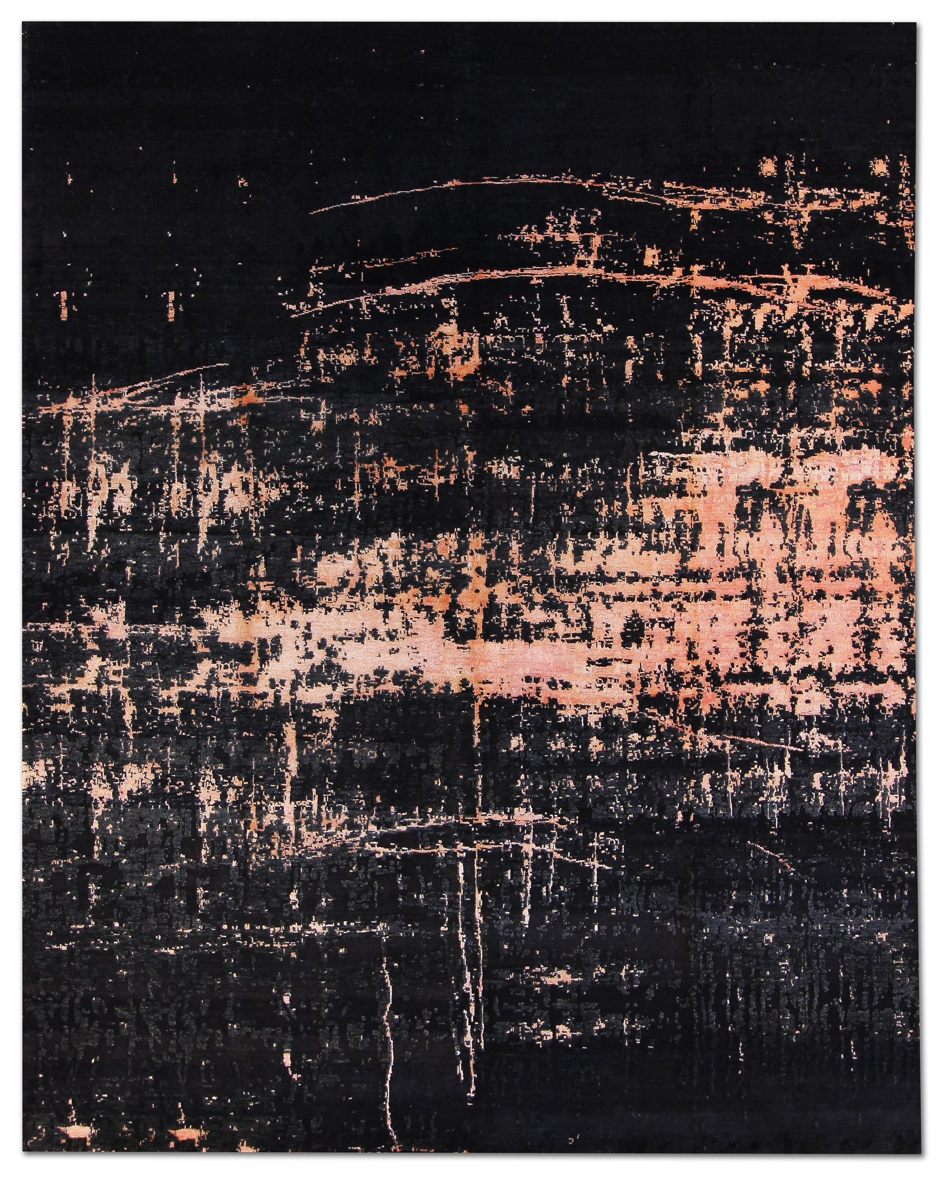 A bold interplay of darkness and light defines this striking rug, where inky blacks are illuminated by delicate streaks of blush and peach, like distant city lights cutting through a midnight skyline. Its abstract, atmospheric texture adds drama without overpowering, anchoring a space with confident sophistication.