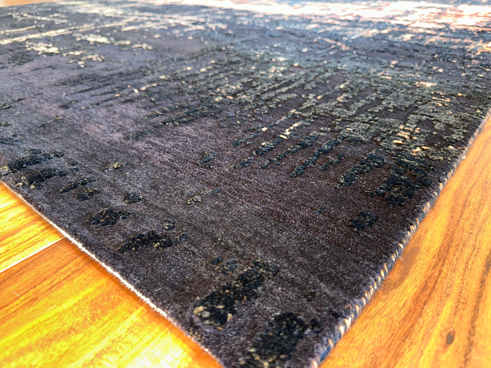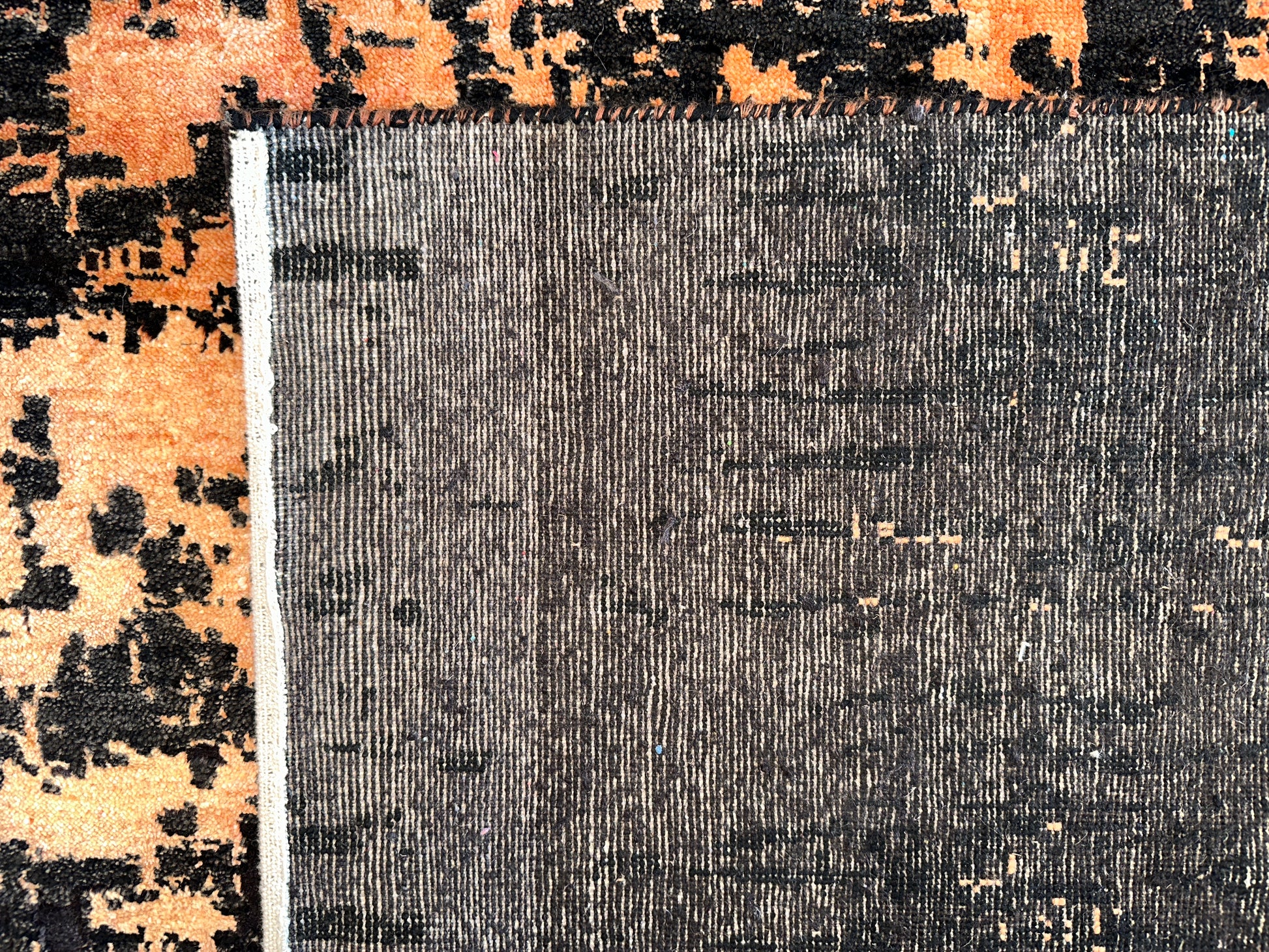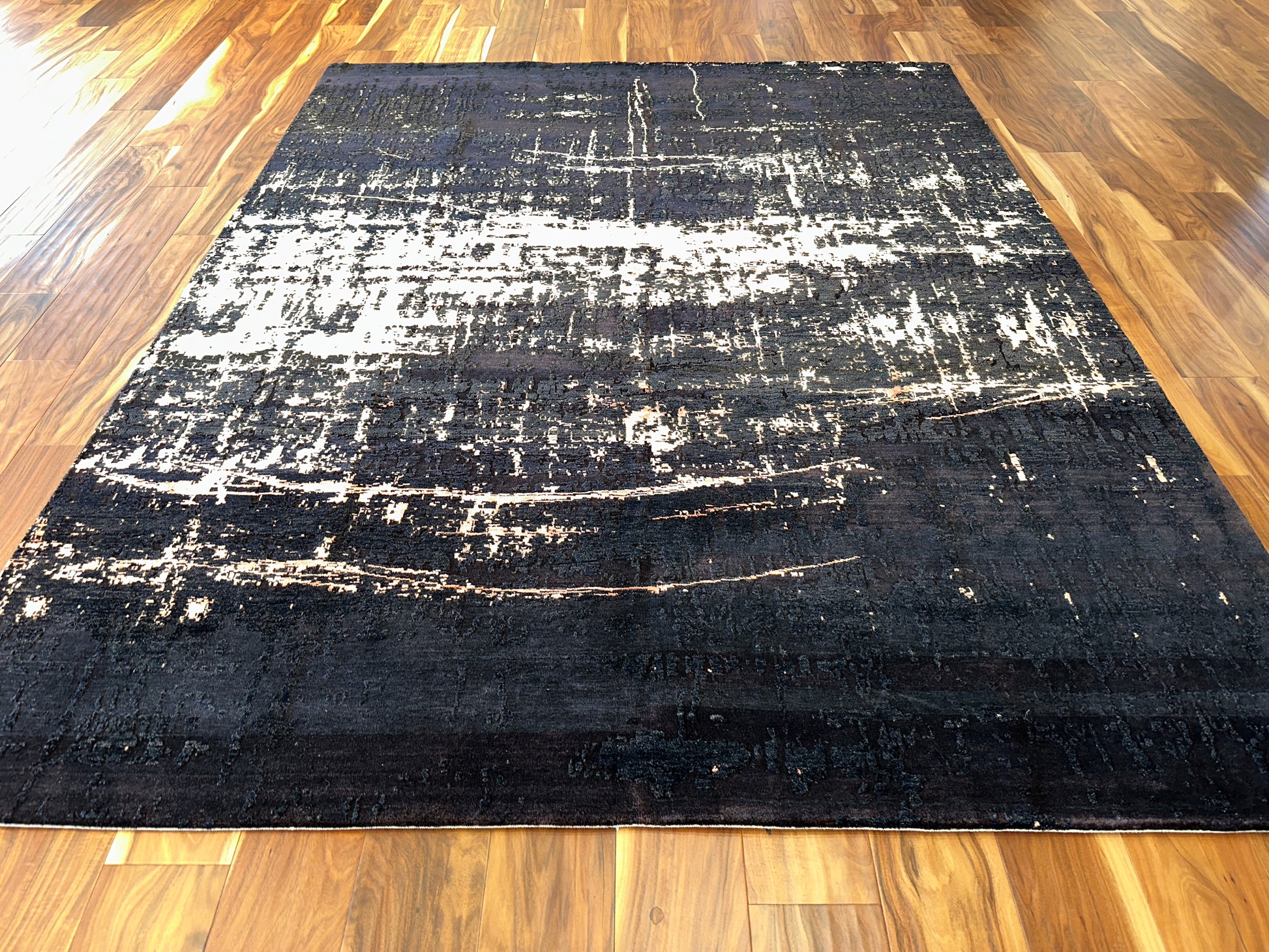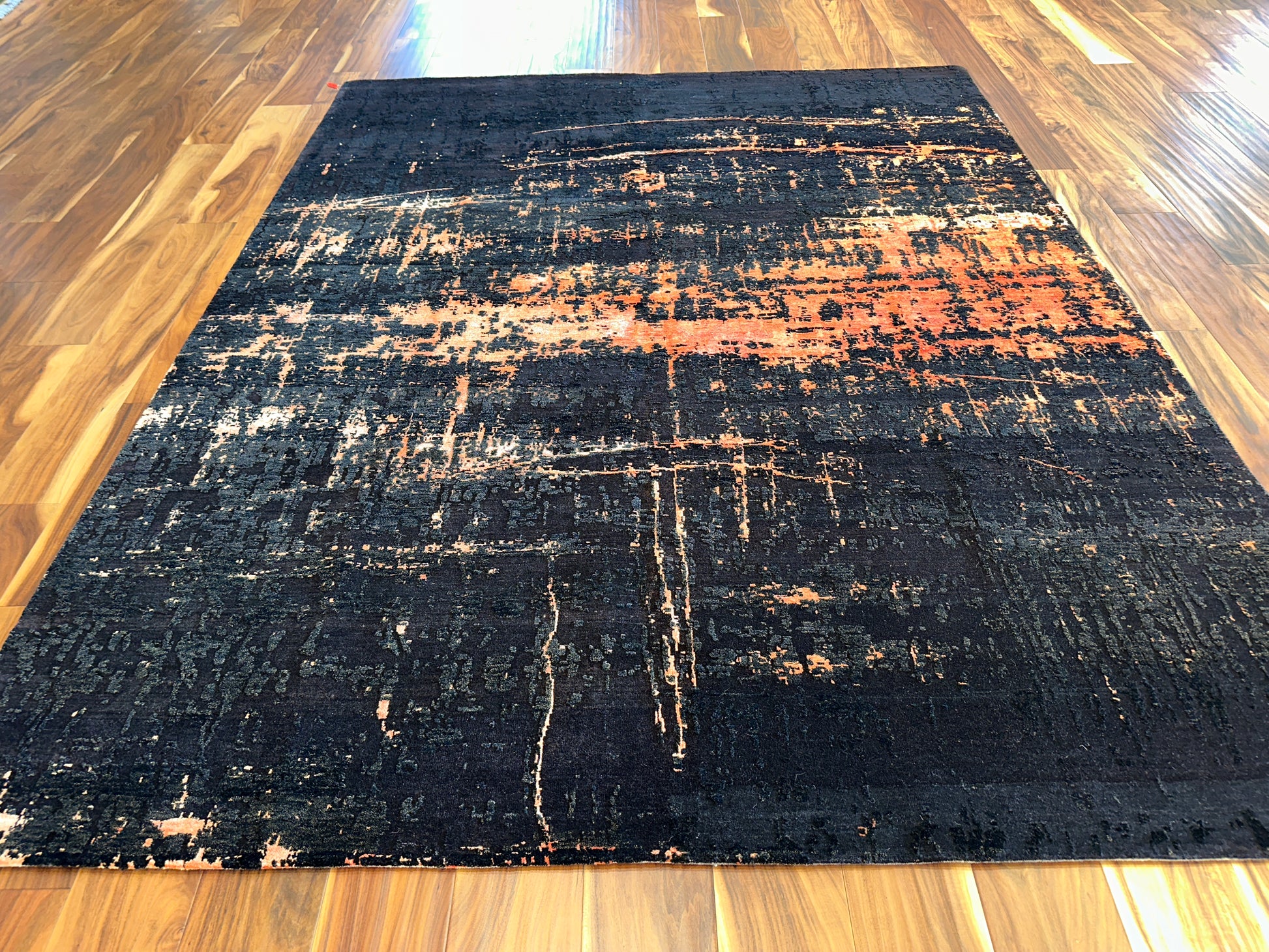 A bold interplay of darkness and light defines this striking rug, where inky blacks are illuminated by delicate streaks of blush and peach, like distant city lights cutting through a midnight skyline. Its abstract, atmospheric texture adds drama without overpowering, anchoring a space with confident sophistication.