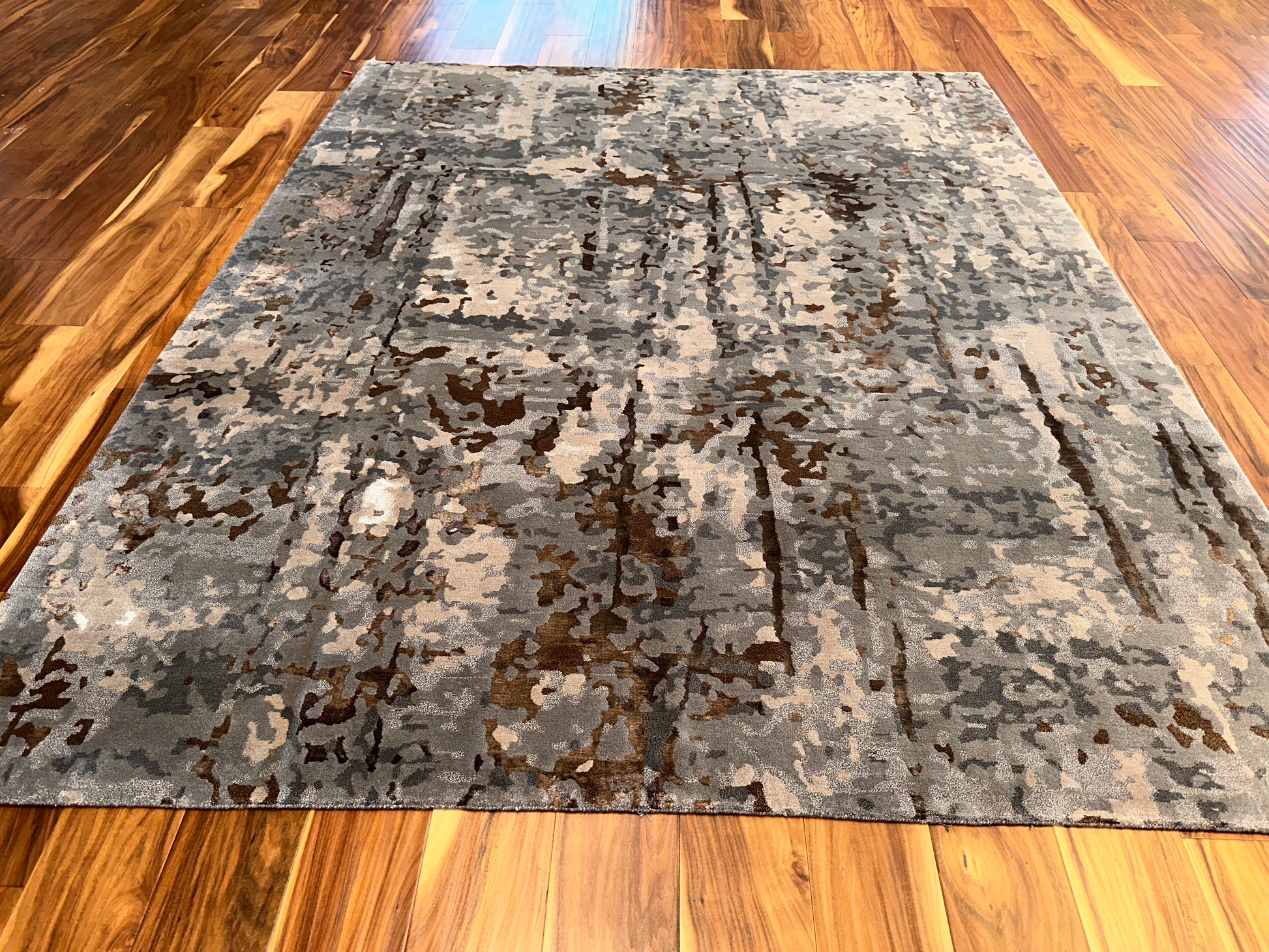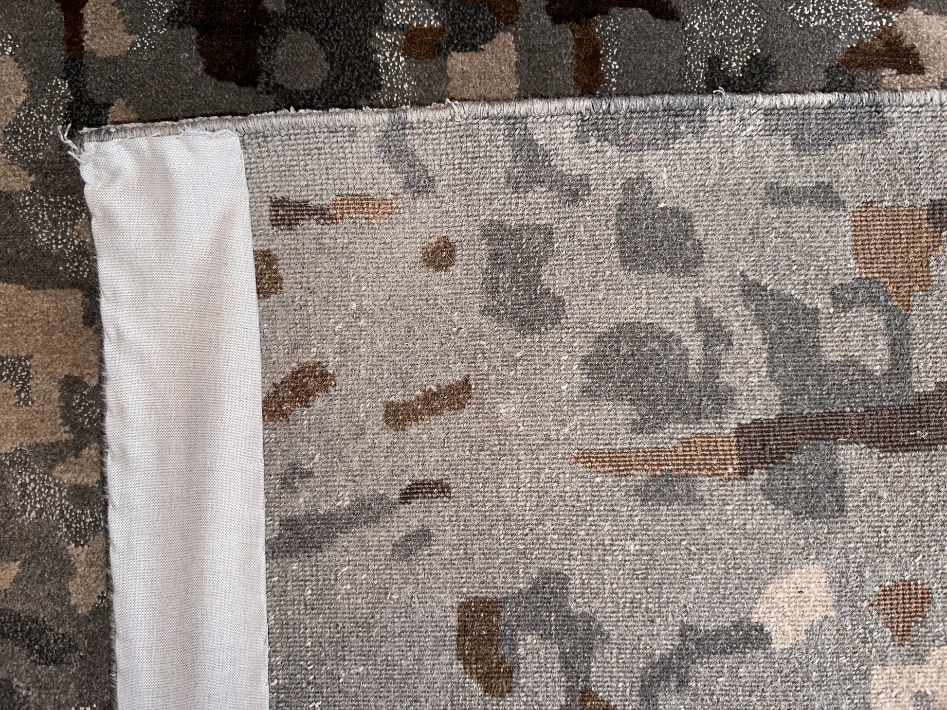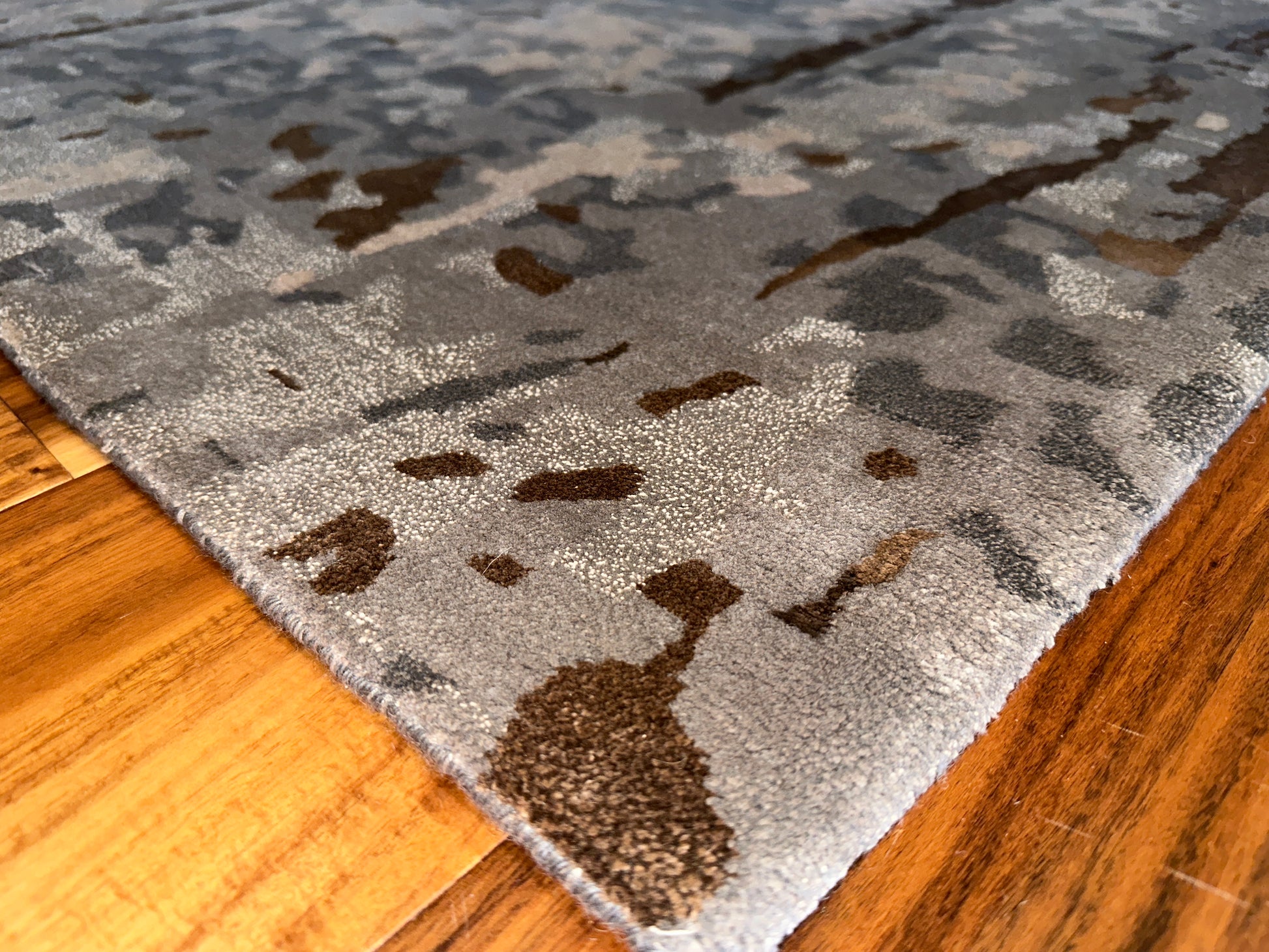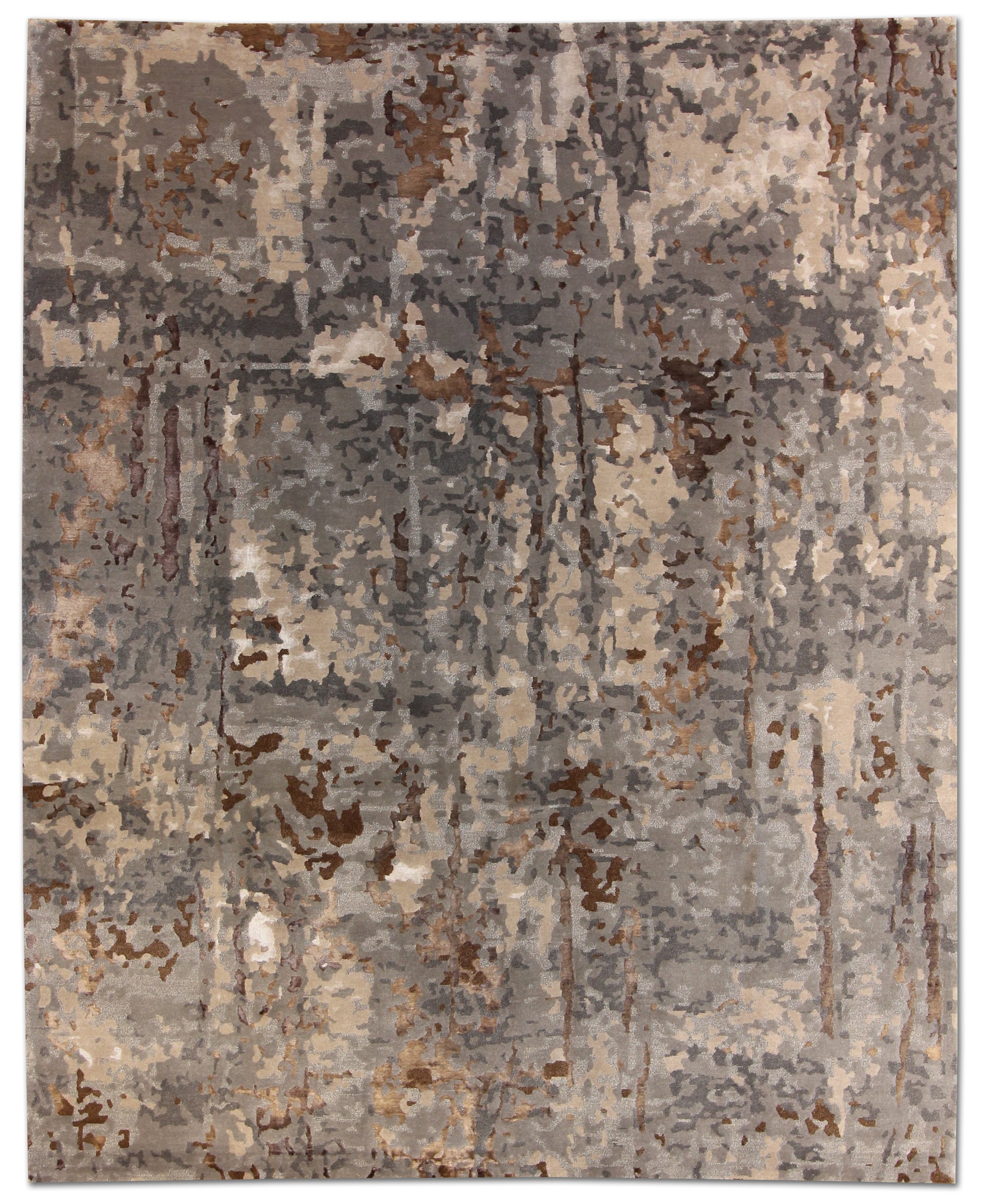 Softly textured and rich in depth, this rug evokes the feel of worn stone and weathered earth. Its abstract composition blends earthy browns, gentle grays, and hints of ivory, creating a grounded, organic presence that warms a space with understated elegance.