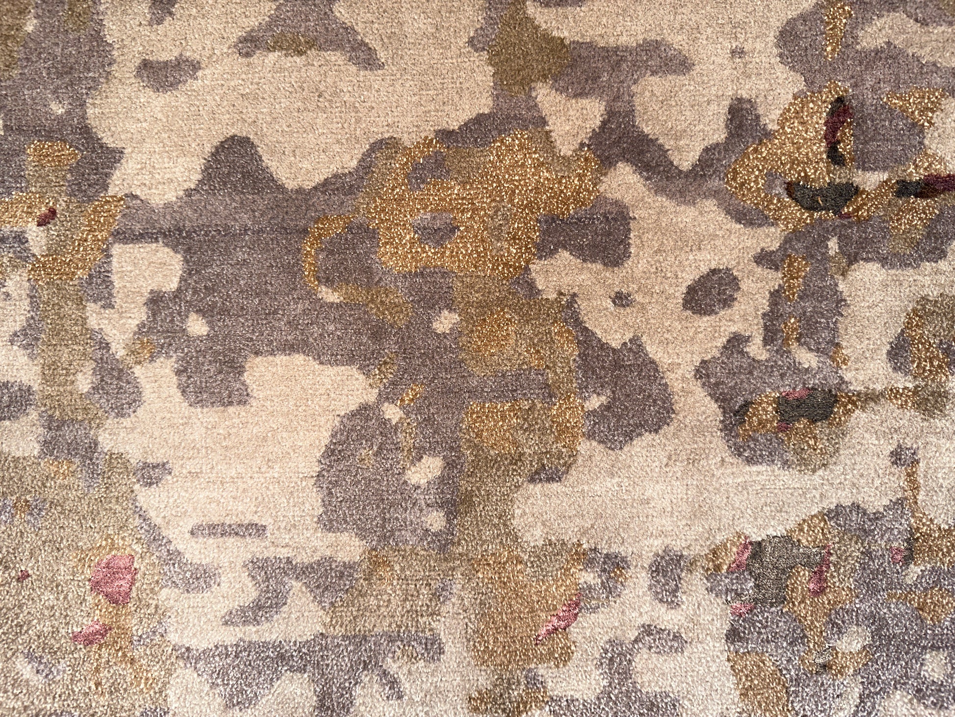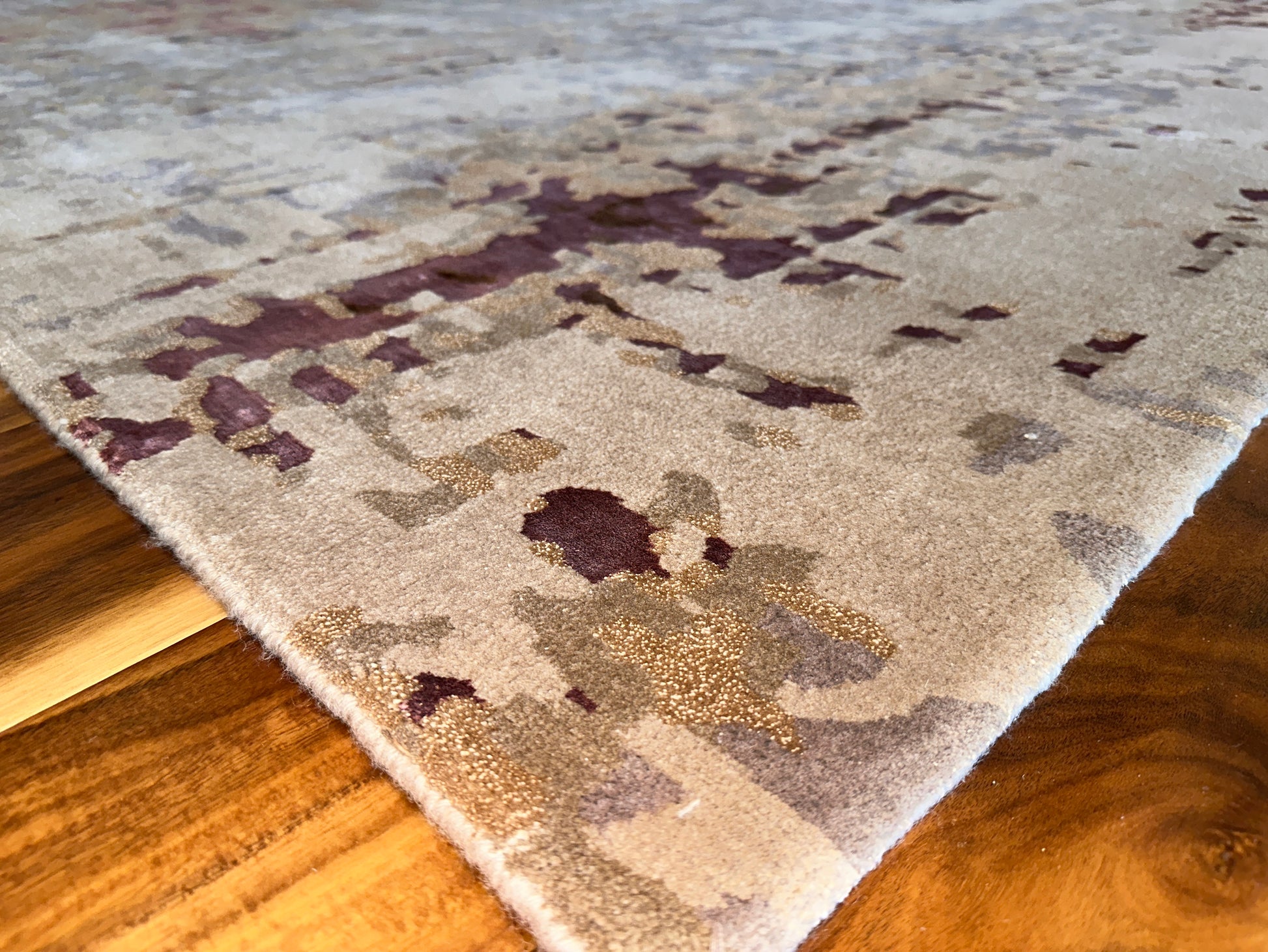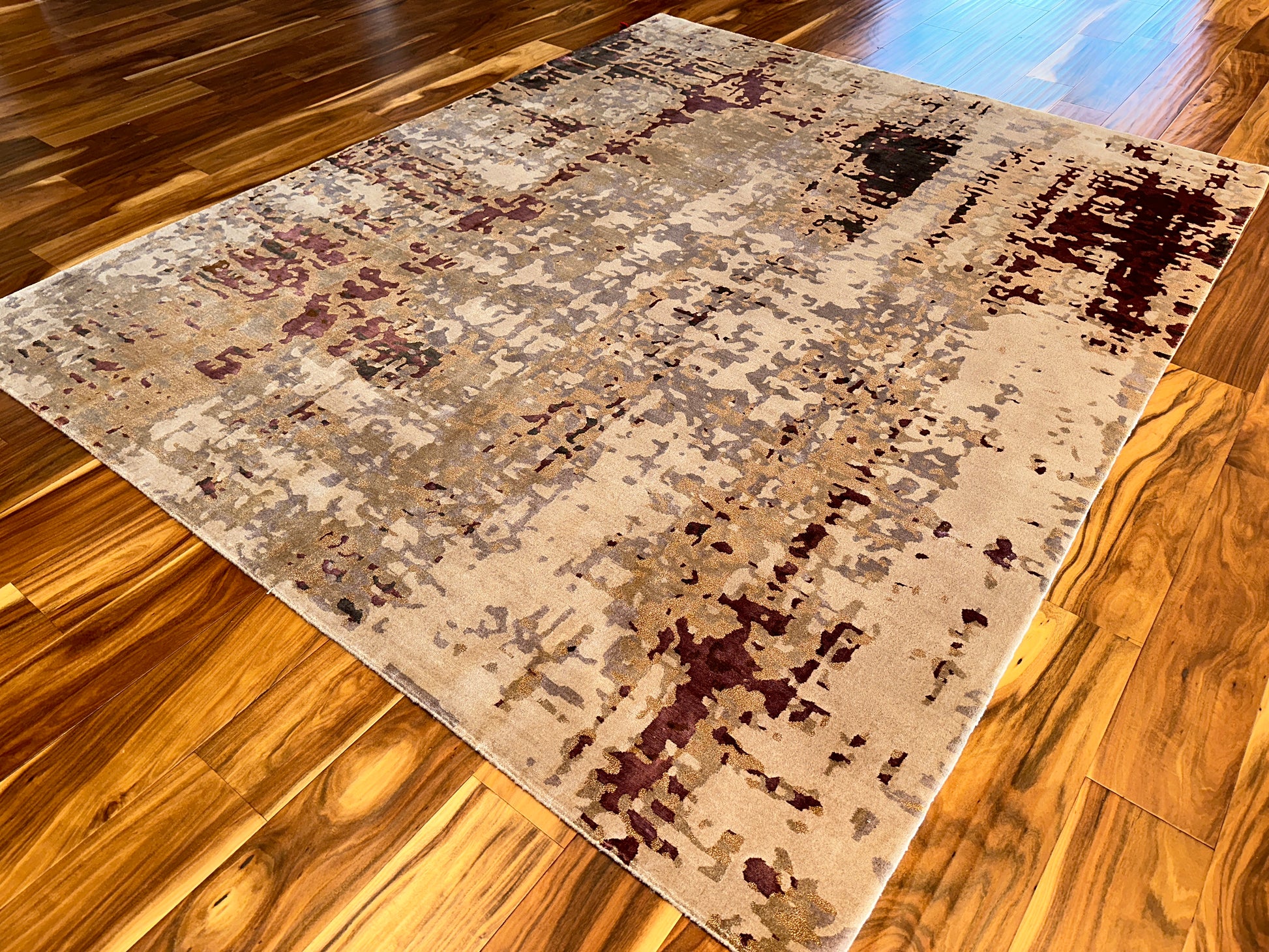 Rich with texture and subtle complexity, this hand-knotted rug features an abstract design that feels both organic and architectural. Soft tones of stone and ivory are layered with deep wine, espresso, and hints of golden earth, creating a composition that shifts beautifully in the light and draws the eye without overwhelming the space.