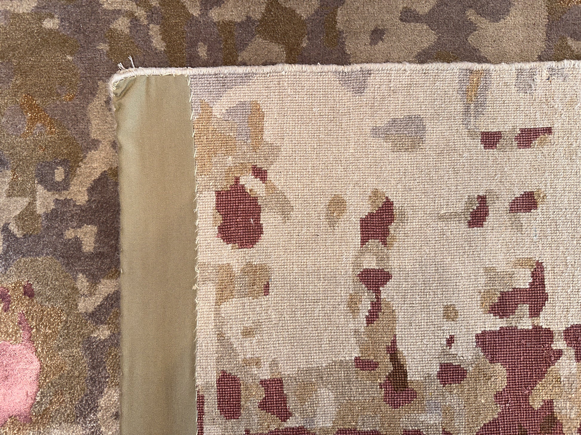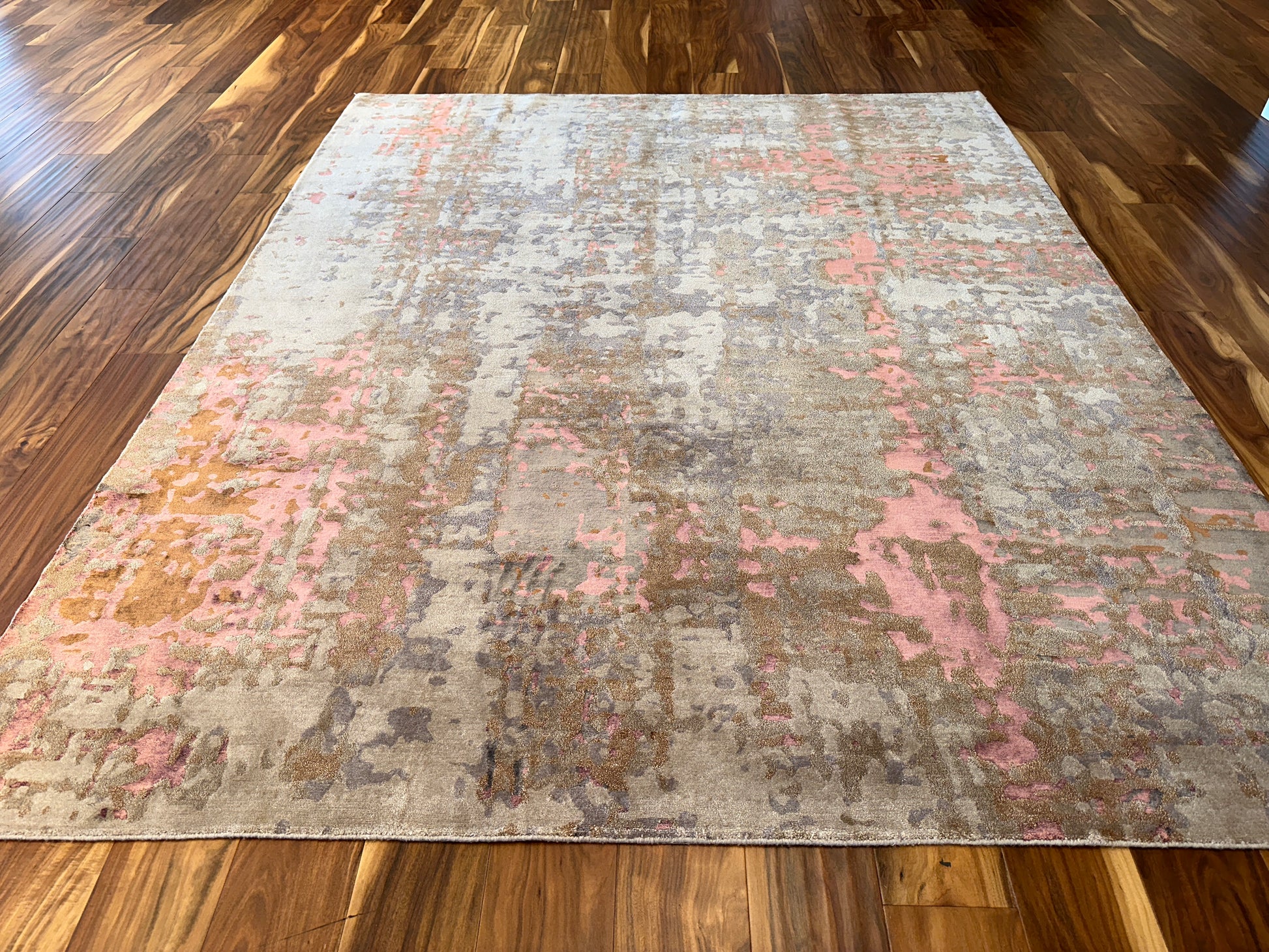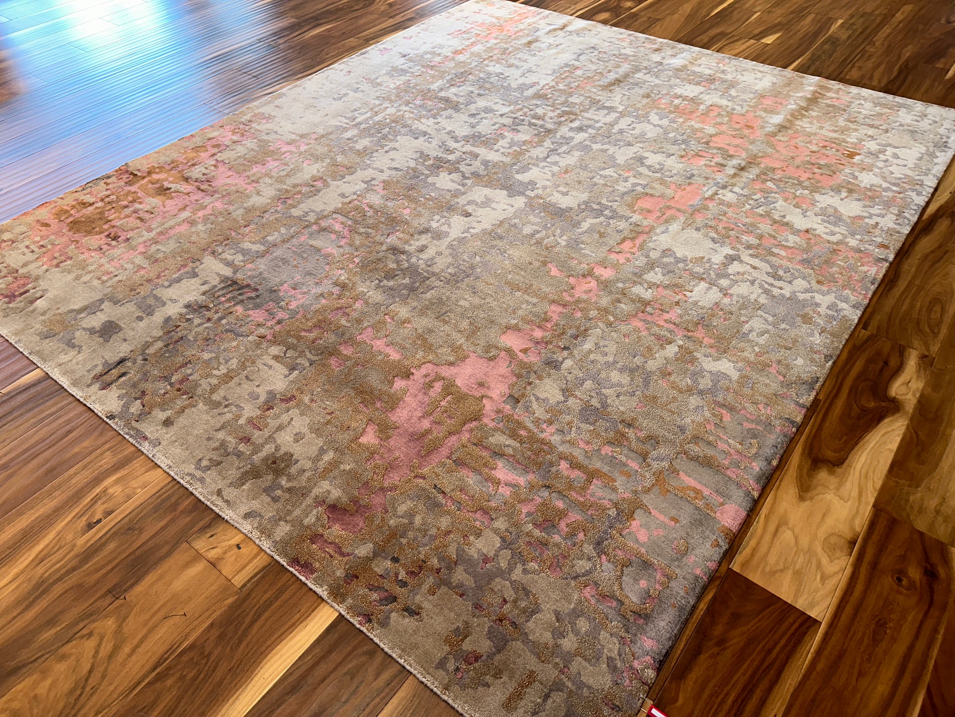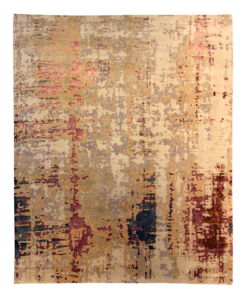 Rich with texture and subtle complexity, this hand-knotted rug features an abstract design that feels both organic and architectural. Soft tones of stone and ivory are layered with deep wine, espresso, and hints of golden earth, creating a composition that shifts beautifully in the light and draws the eye without overwhelming the space.