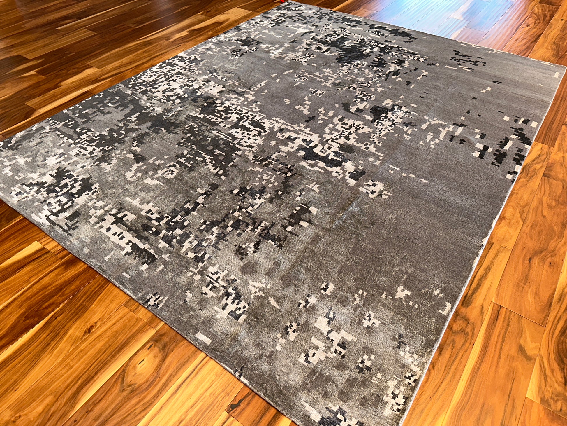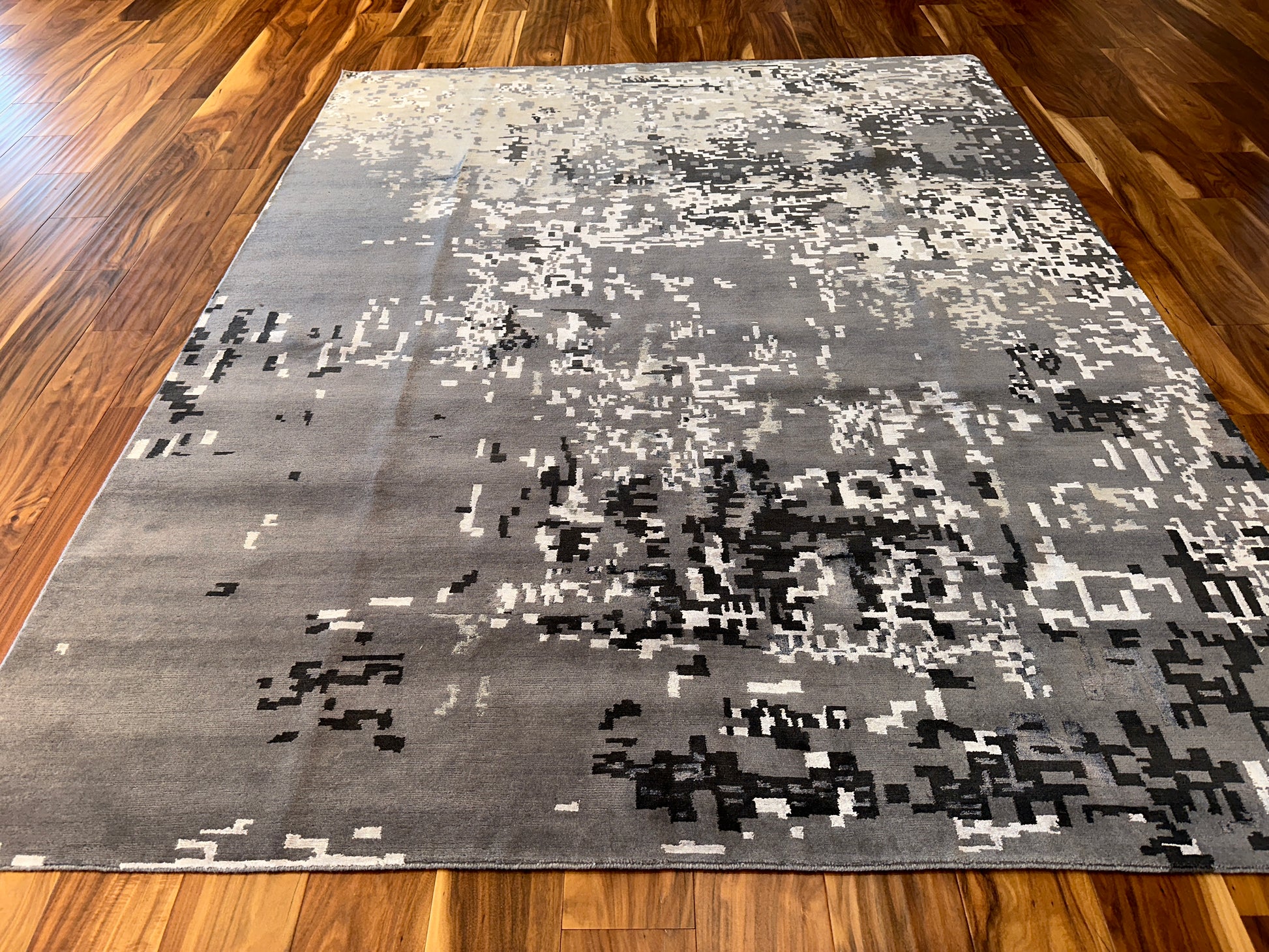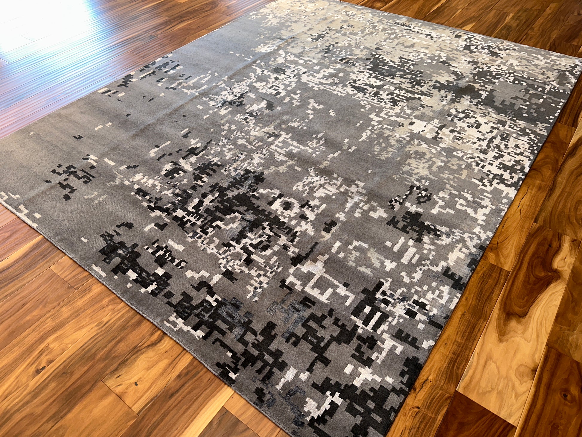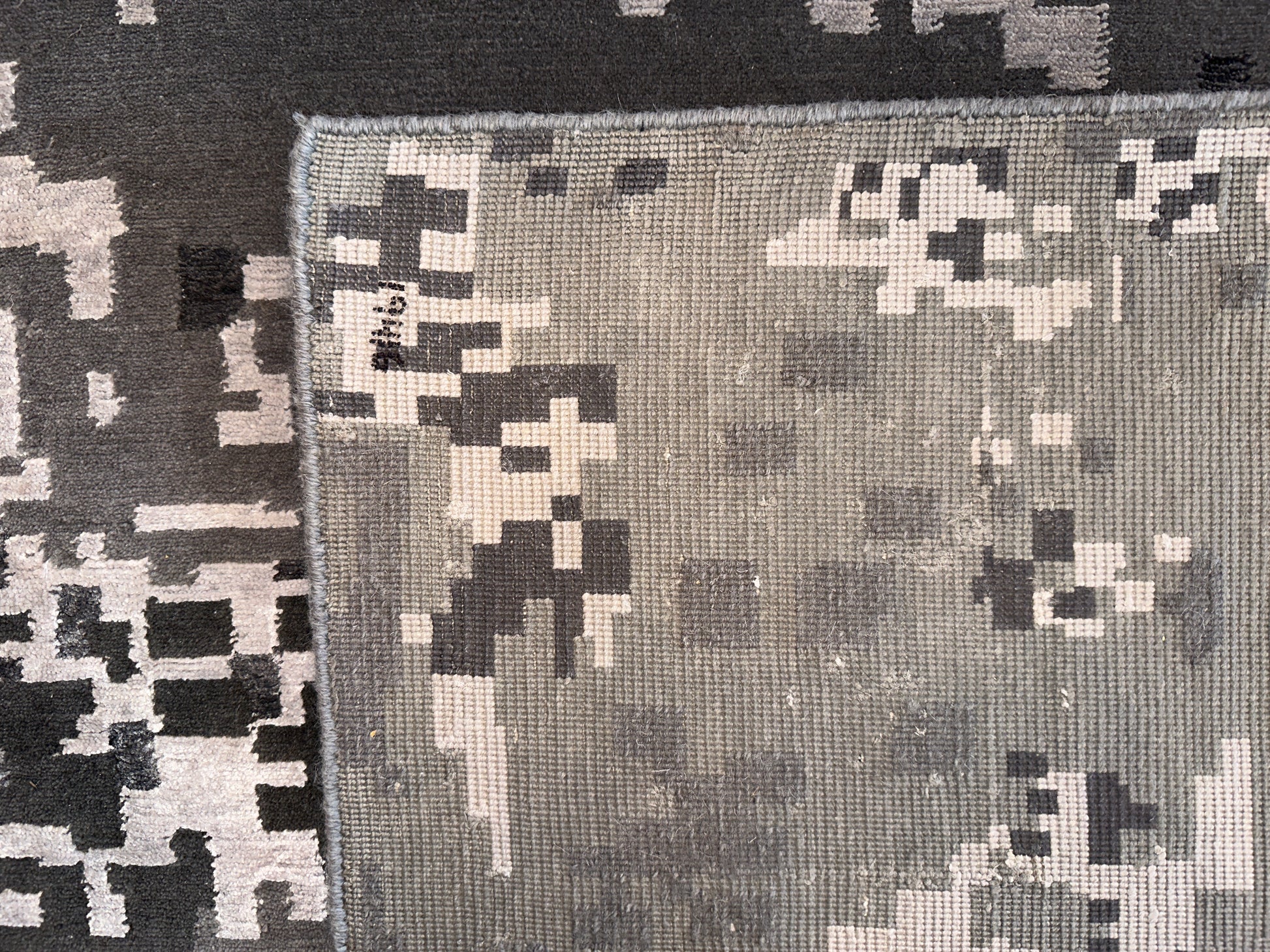 With its striking pixelated composition and cool, smoky palette, this hand-knotted rug feels like a digital landscape suspended in motion. Shades of charcoal, gray, and soft ivory break apart and reassemble across the surface, offering a modern visual texture that feels both edgy and serene. A compelling addition to sleek, contemporary interiors.