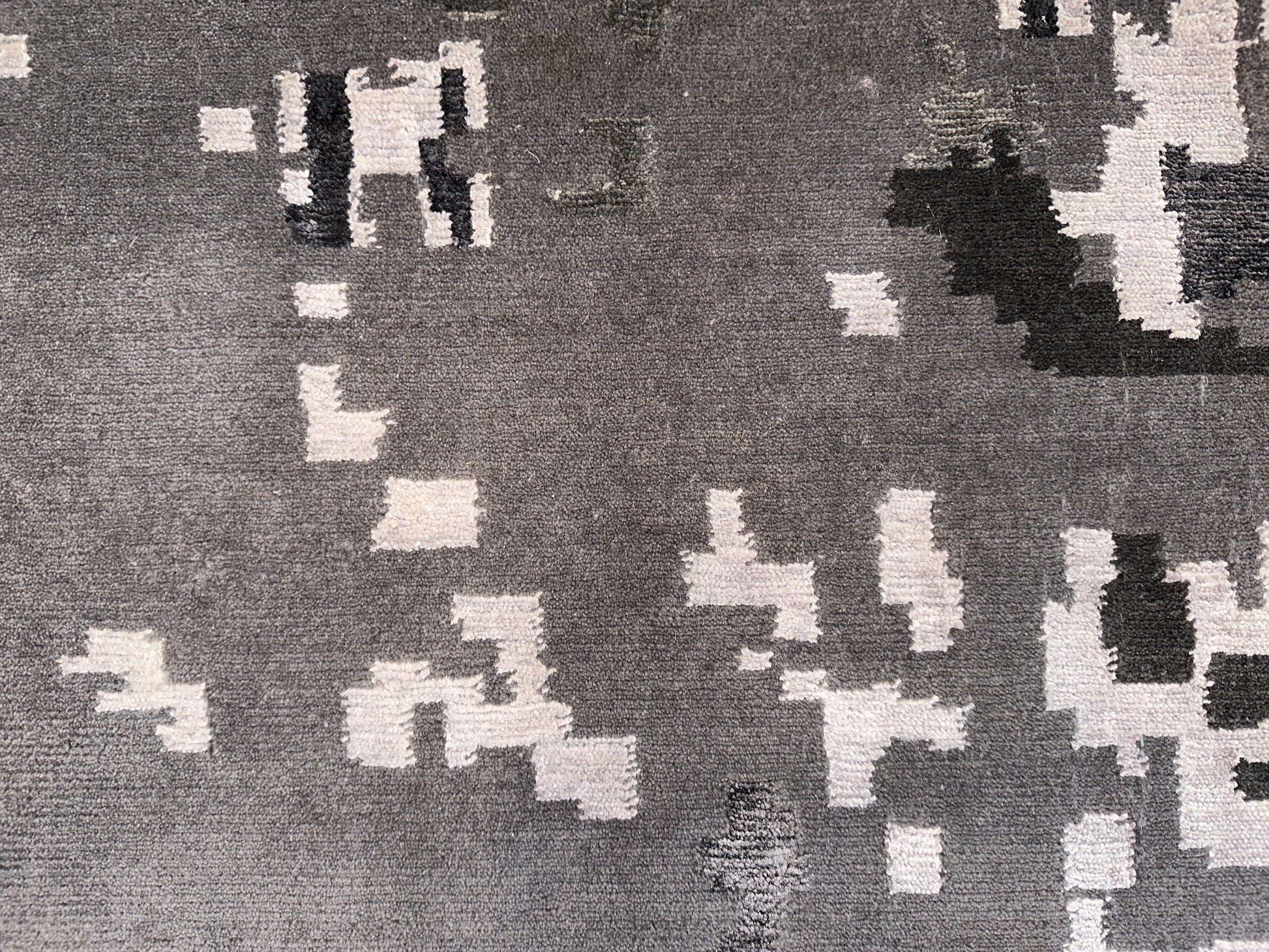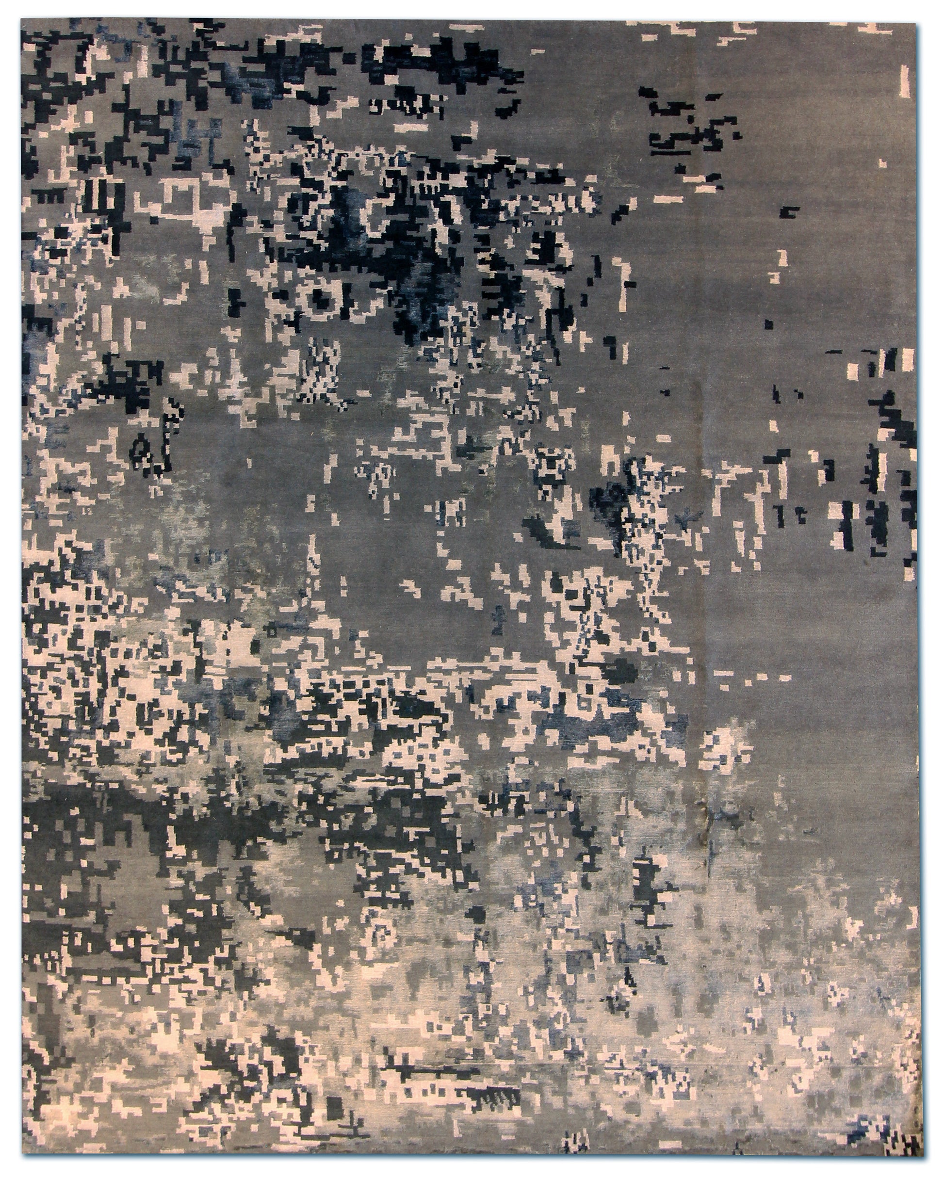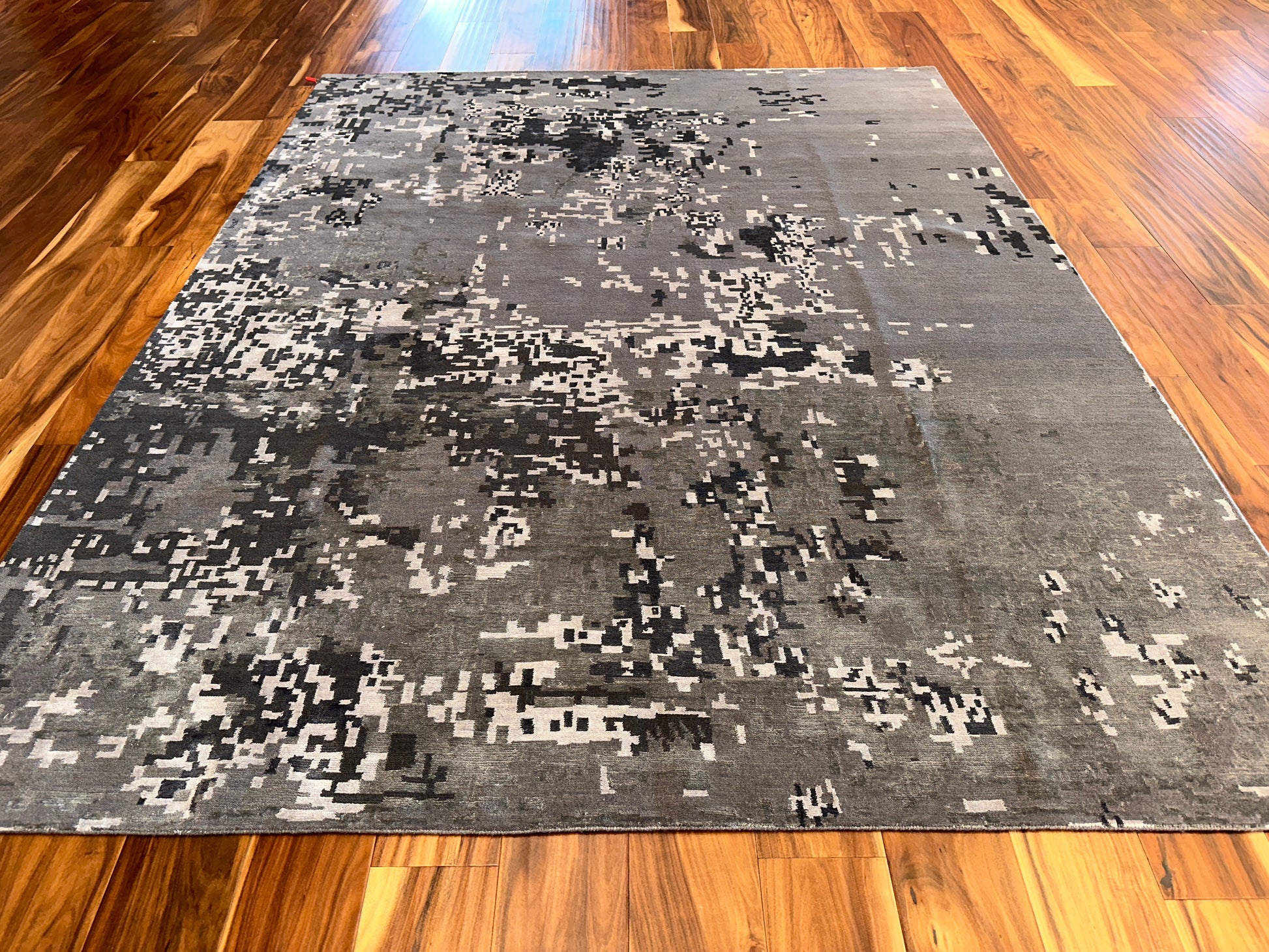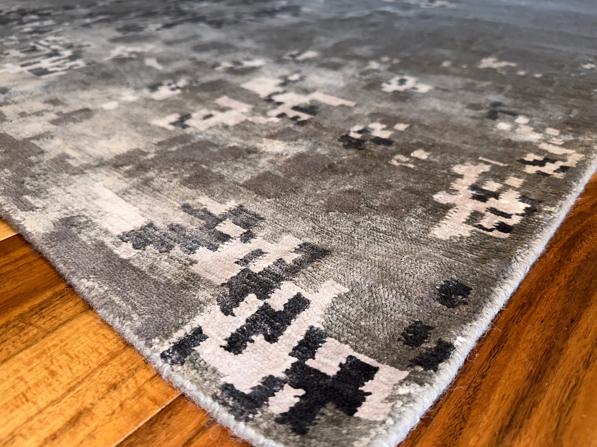 With its striking pixelated composition and cool, smoky palette, this hand-knotted rug feels like a digital landscape suspended in motion. Shades of charcoal, gray, and soft ivory break apart and reassemble across the surface, offering a modern visual texture that feels both edgy and serene. A compelling addition to sleek, contemporary interiors.