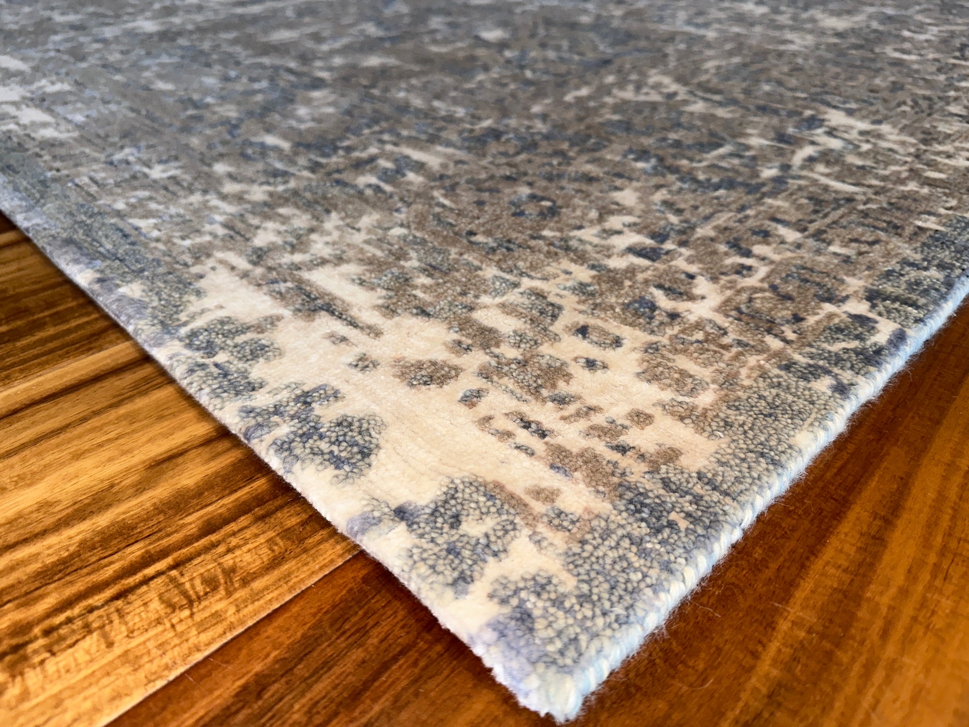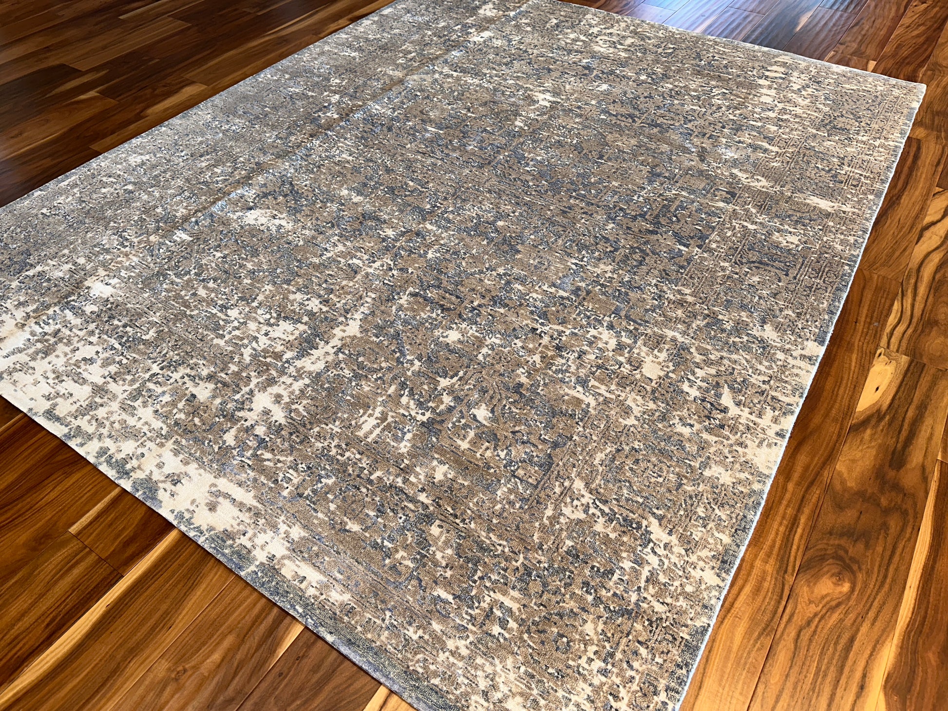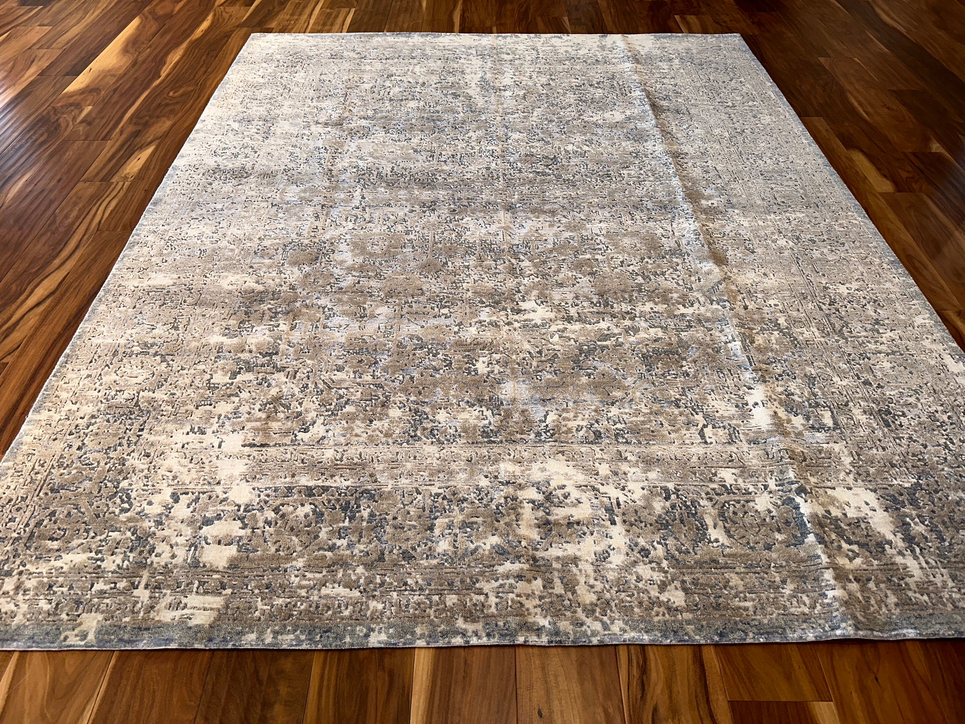 Delicately distressed and softly faded, this hand-knotted rug evokes the timeless beauty of antique textiles while maintaining a gentle, modern elegance. The intricate patterning, woven in quiet layers of ivory, beige, and slate, creates a subdued yet richly textured surface that pairs effortlessly with both classic and contemporary spaces.