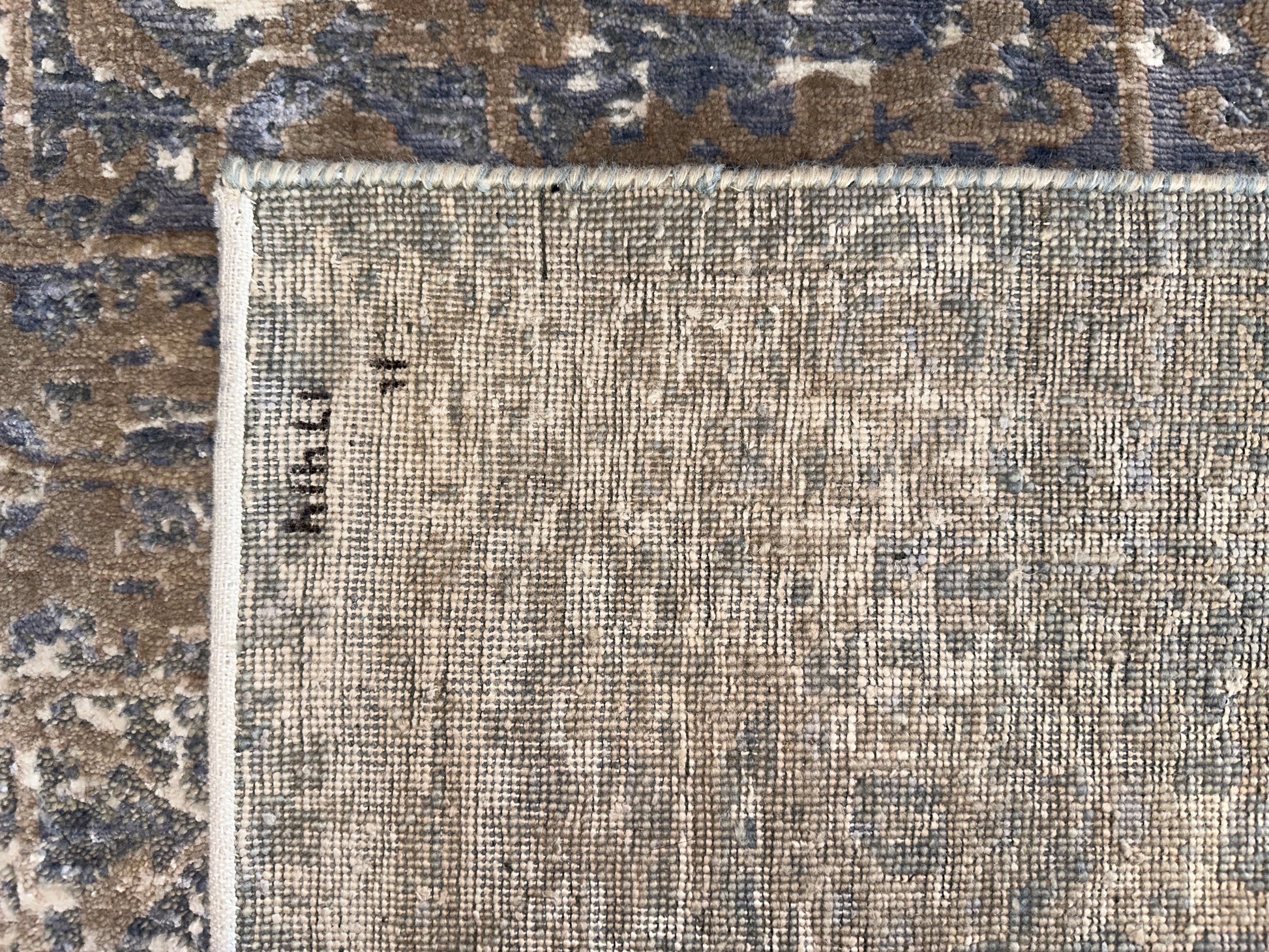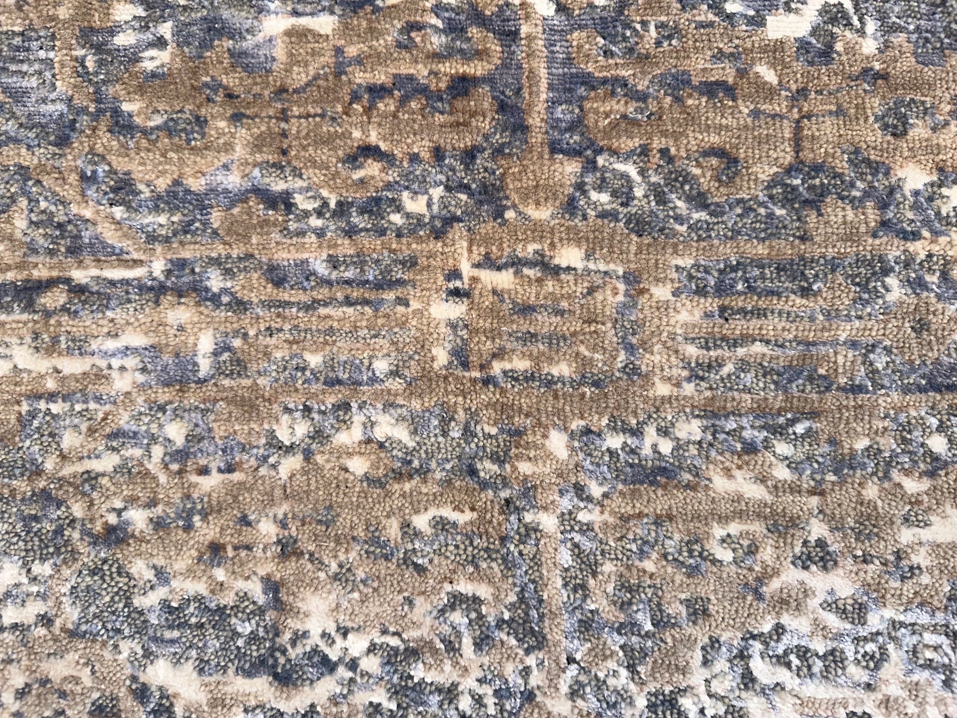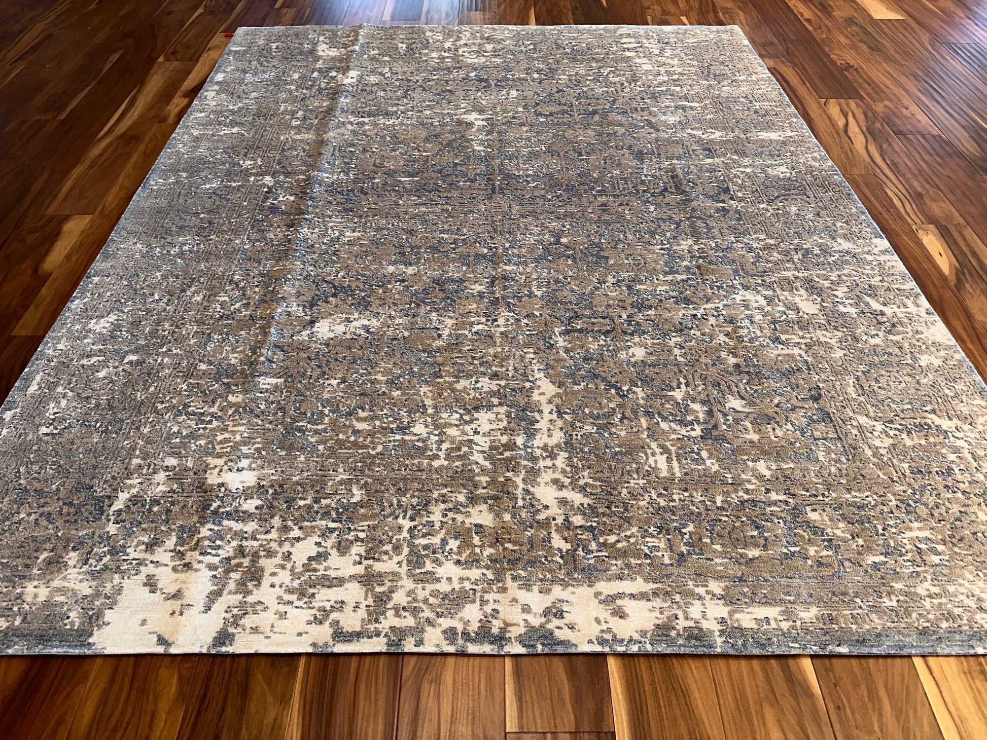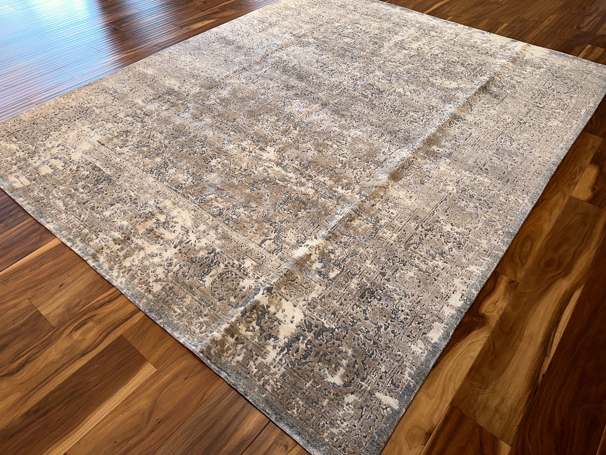 Delicately distressed and softly faded, this hand-knotted rug evokes the timeless beauty of antique textiles while maintaining a gentle, modern elegance. The intricate patterning, woven in quiet layers of ivory, beige, and slate, creates a subdued yet richly textured surface that pairs effortlessly with both classic and contemporary spaces.