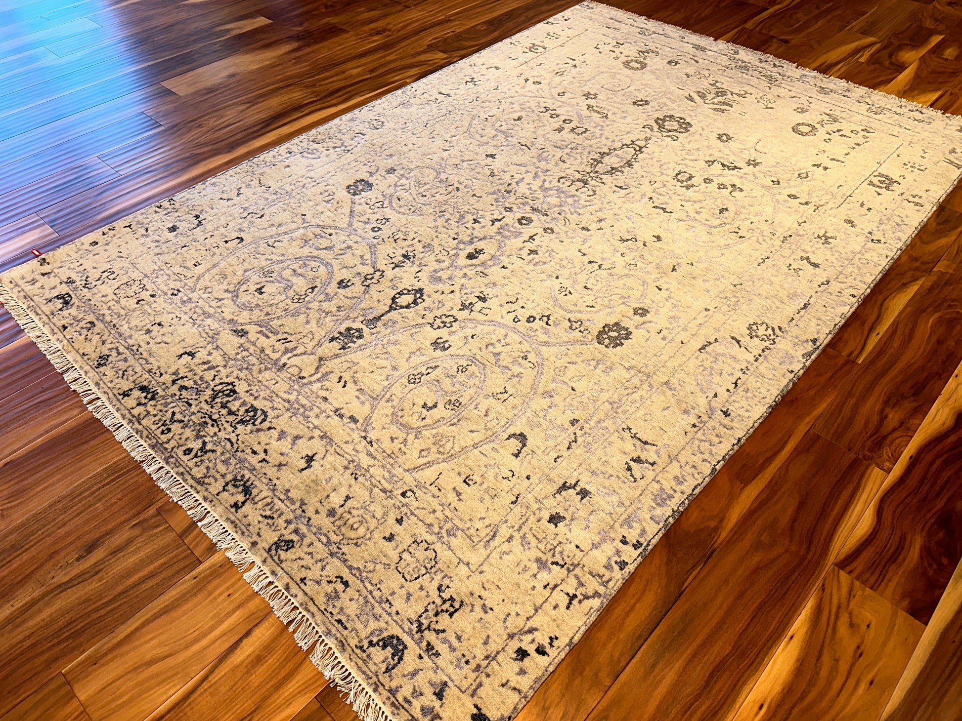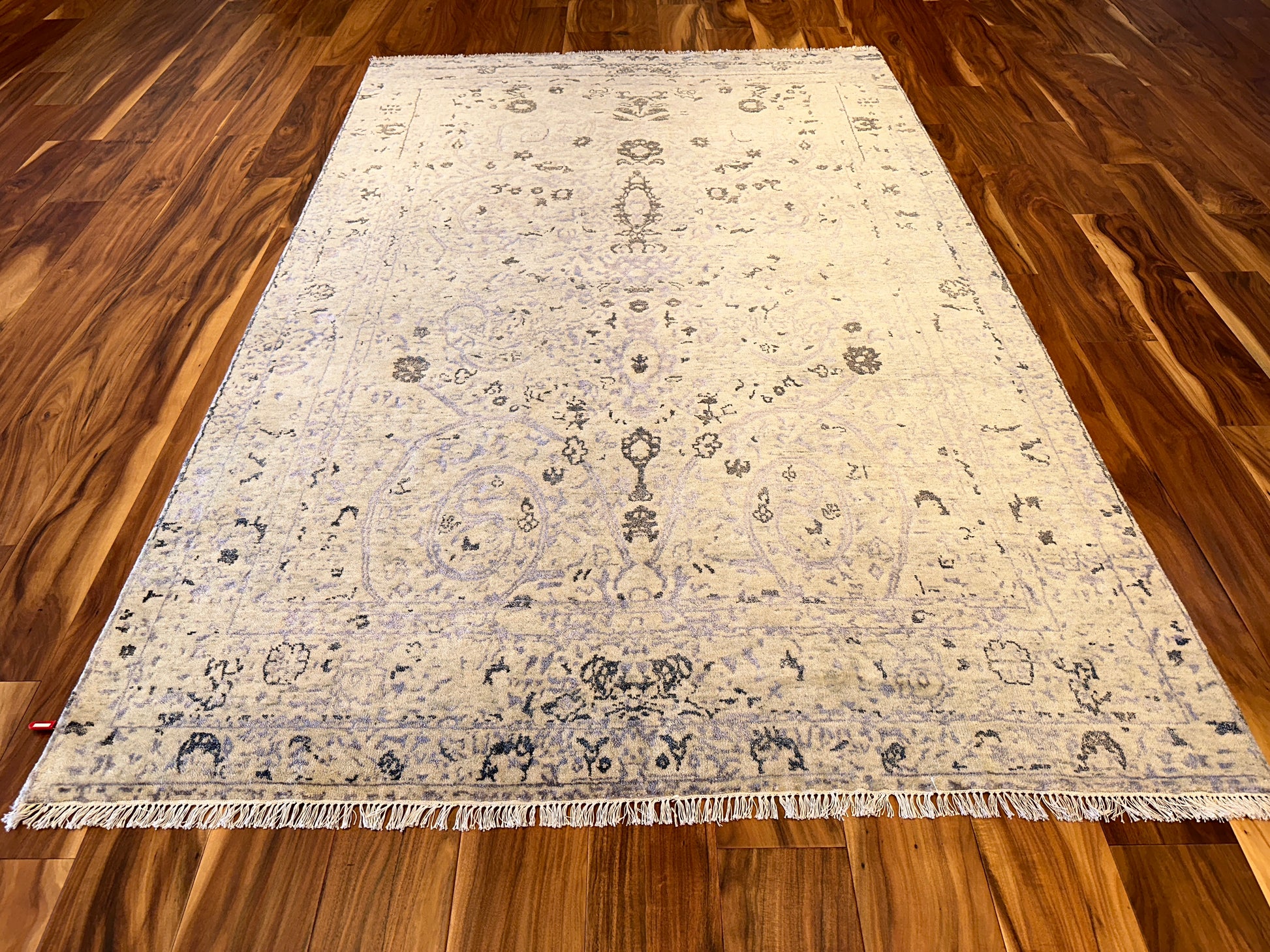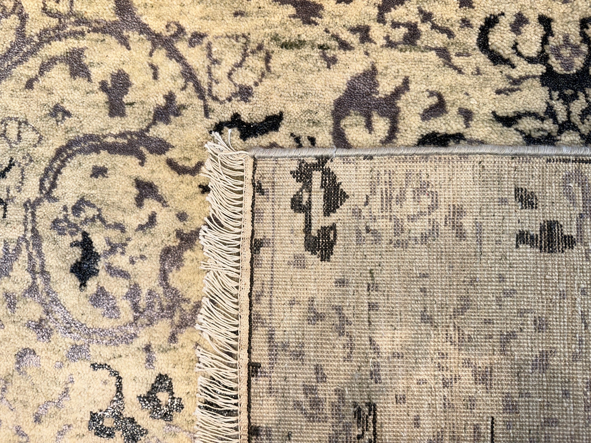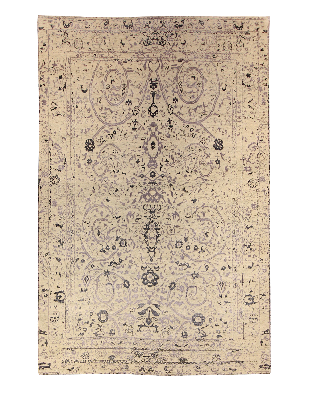 Soft and understated, this handmade rug presents a refined medallion-and-vine pattern that gently emerges from its pale beige ground in soft shades of lavender and charcoal. The distressed finish and delicate color transitions lend the piece a washed, antique effect, enhancing its sense of age and quiet elegance. It offers a subtle yet sophisticated foundation for serene, light-filled spaces.