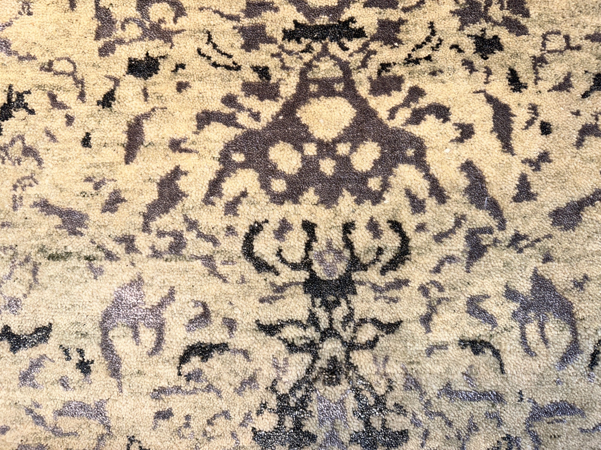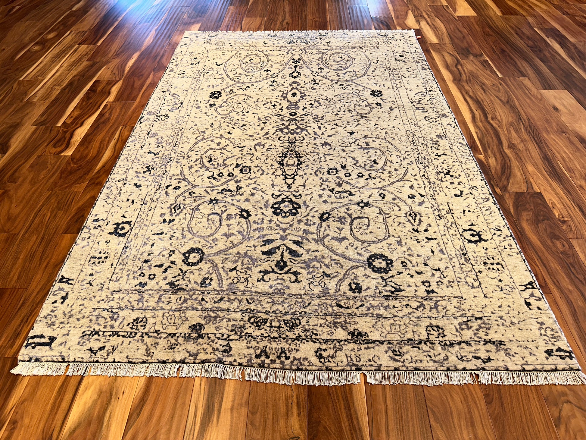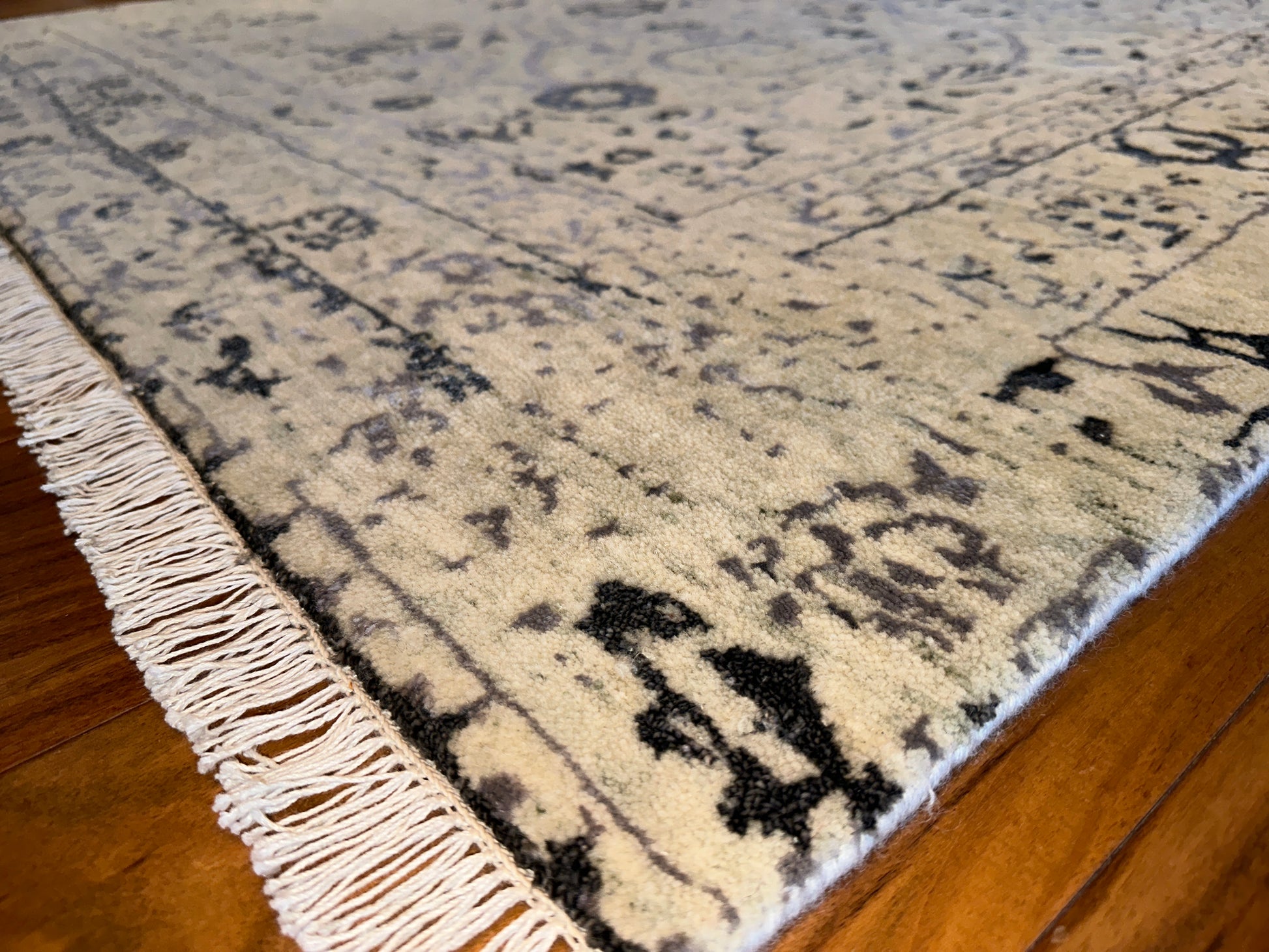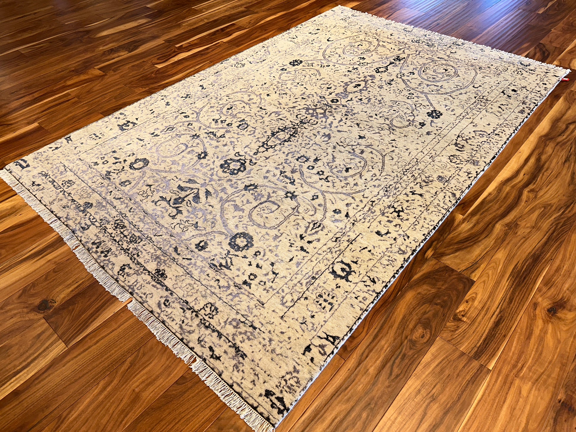 Soft and understated, this handmade rug presents a refined medallion-and-vine pattern that gently emerges from its pale beige ground in soft shades of lavender and charcoal. The distressed finish and delicate color transitions lend the piece a washed, antique effect, enhancing its sense of age and quiet elegance. It offers a subtle yet sophisticated foundation for serene, light-filled spaces.